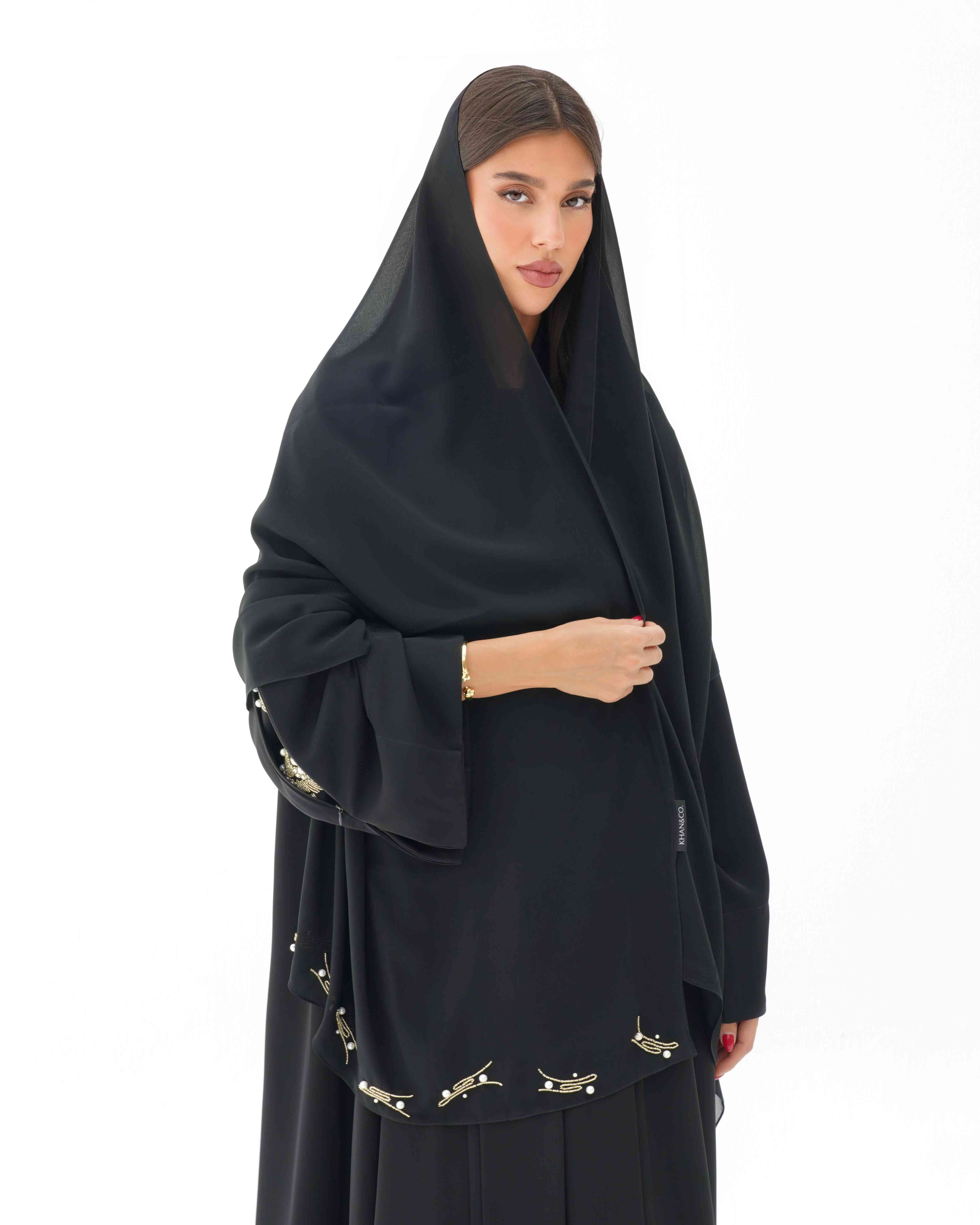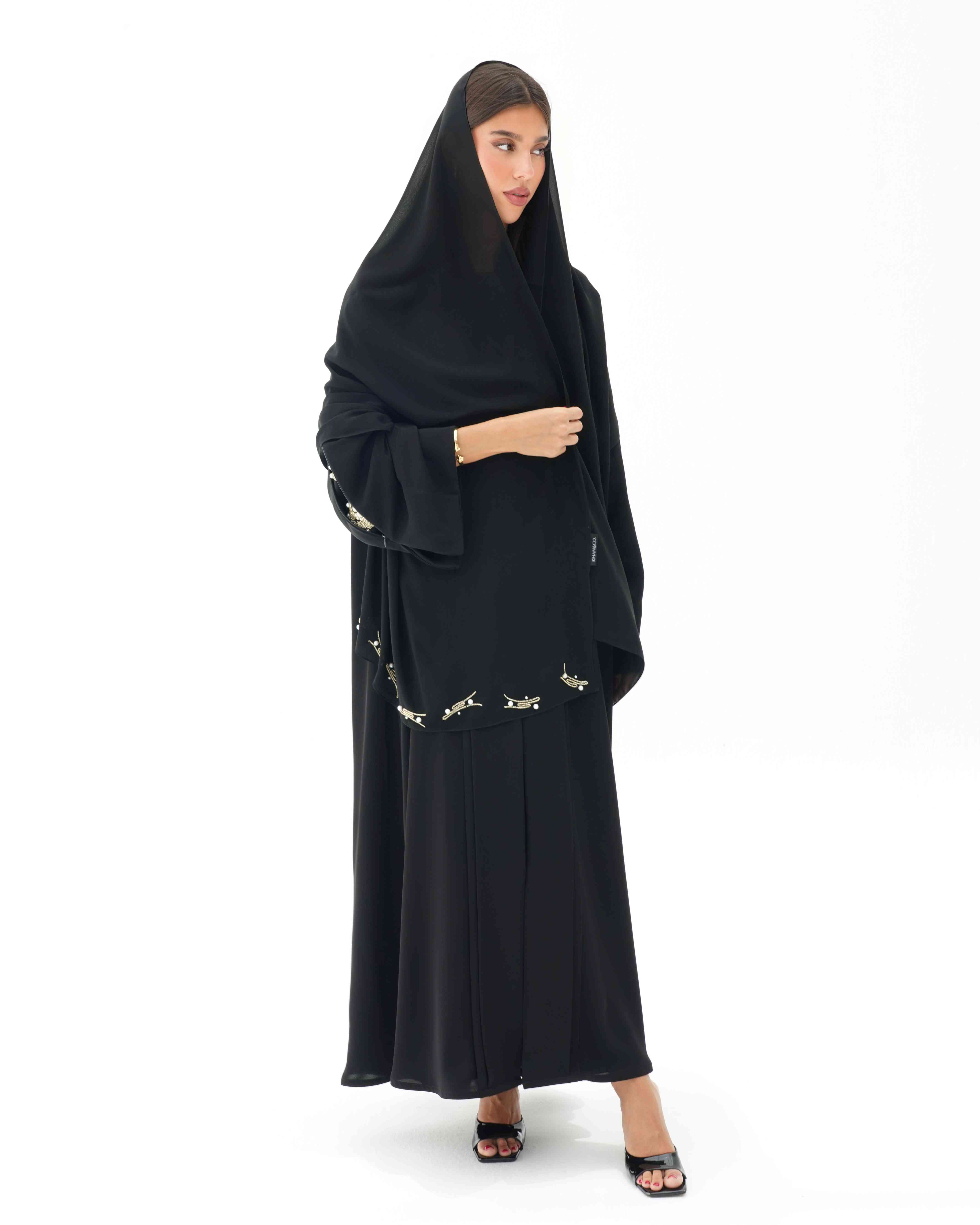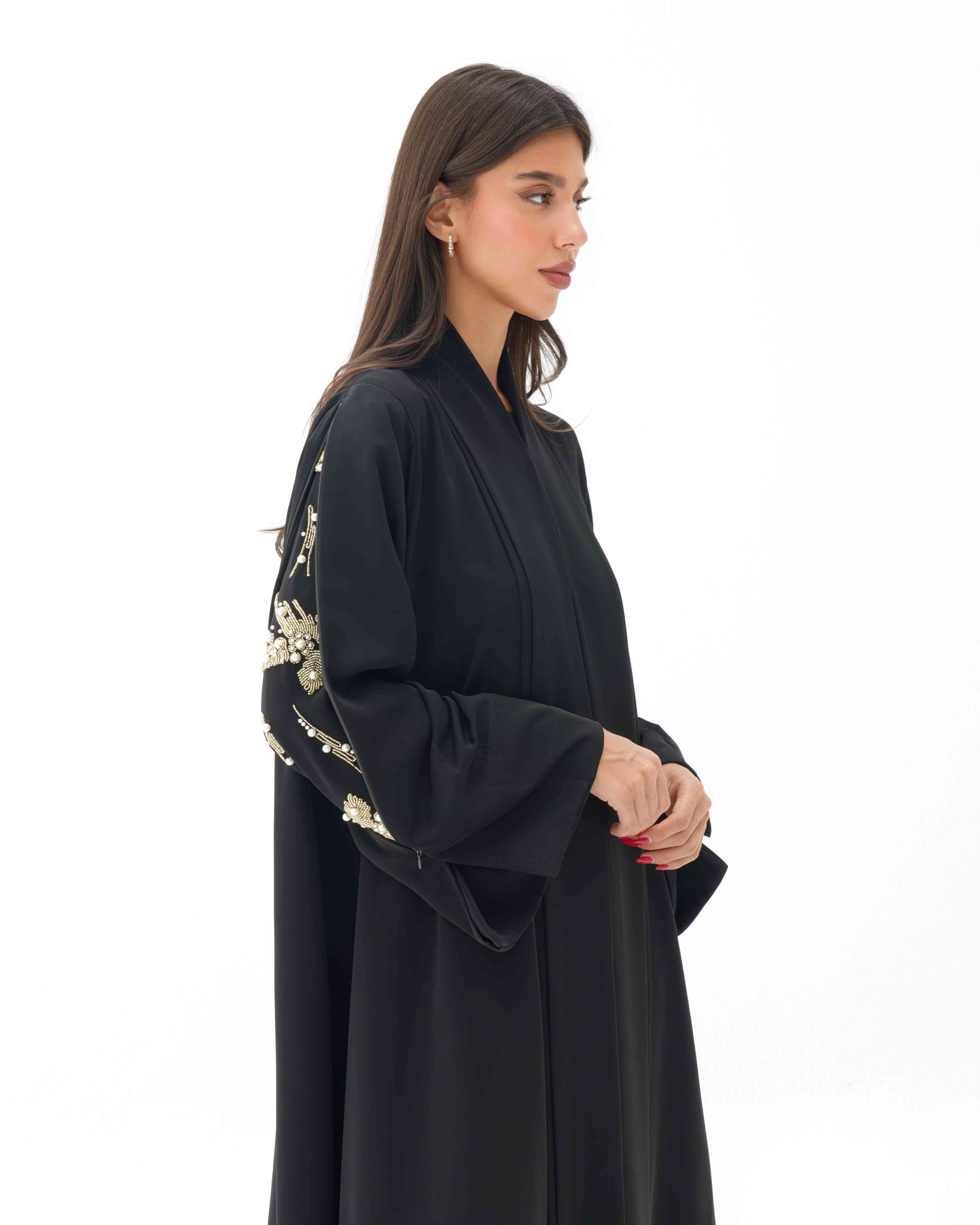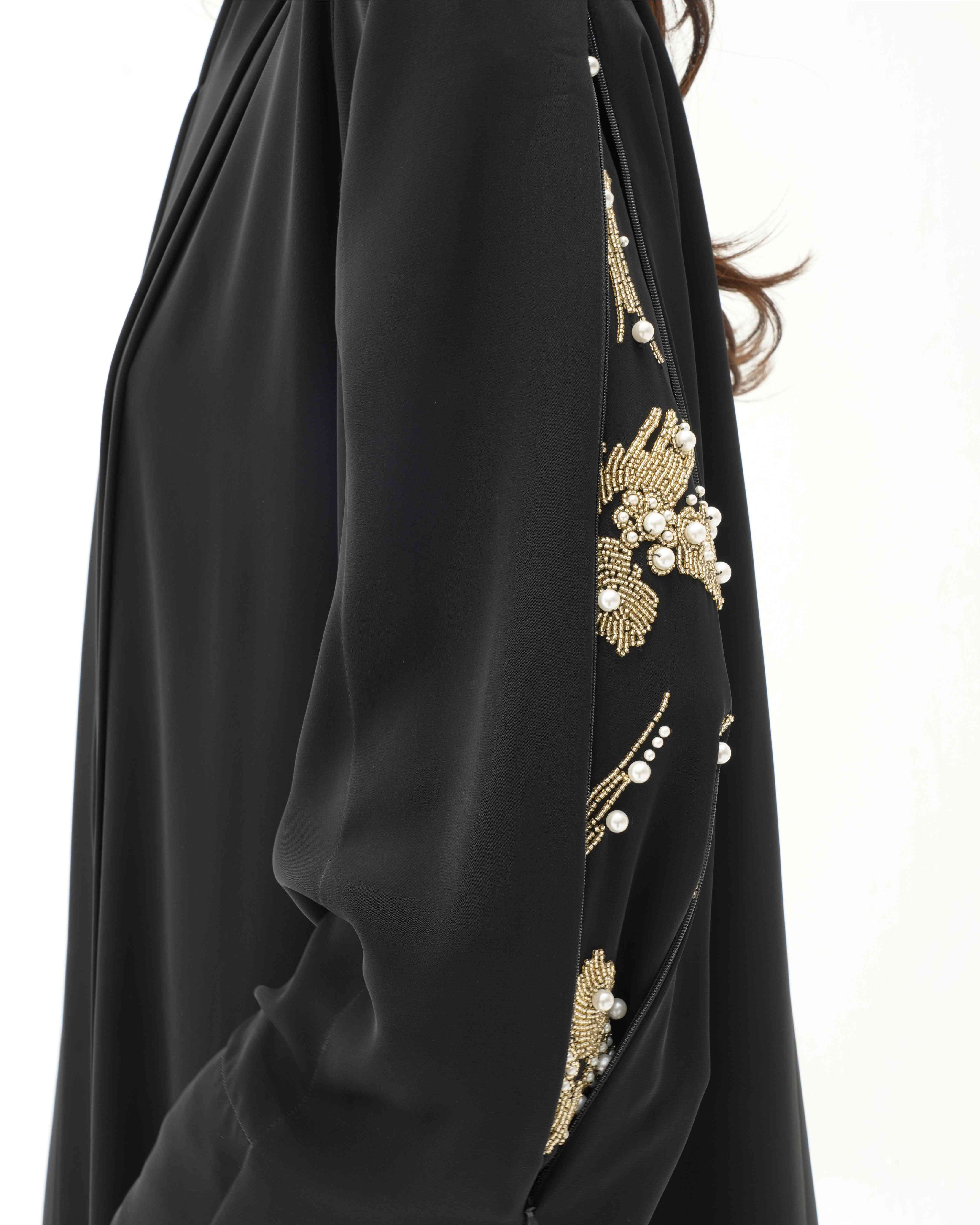 • عباية مشتغلة يدويا بالخرز الذهبي واللؤلؤ عند فتح السحاب من الاكتاف الى نهاية الاكمام.