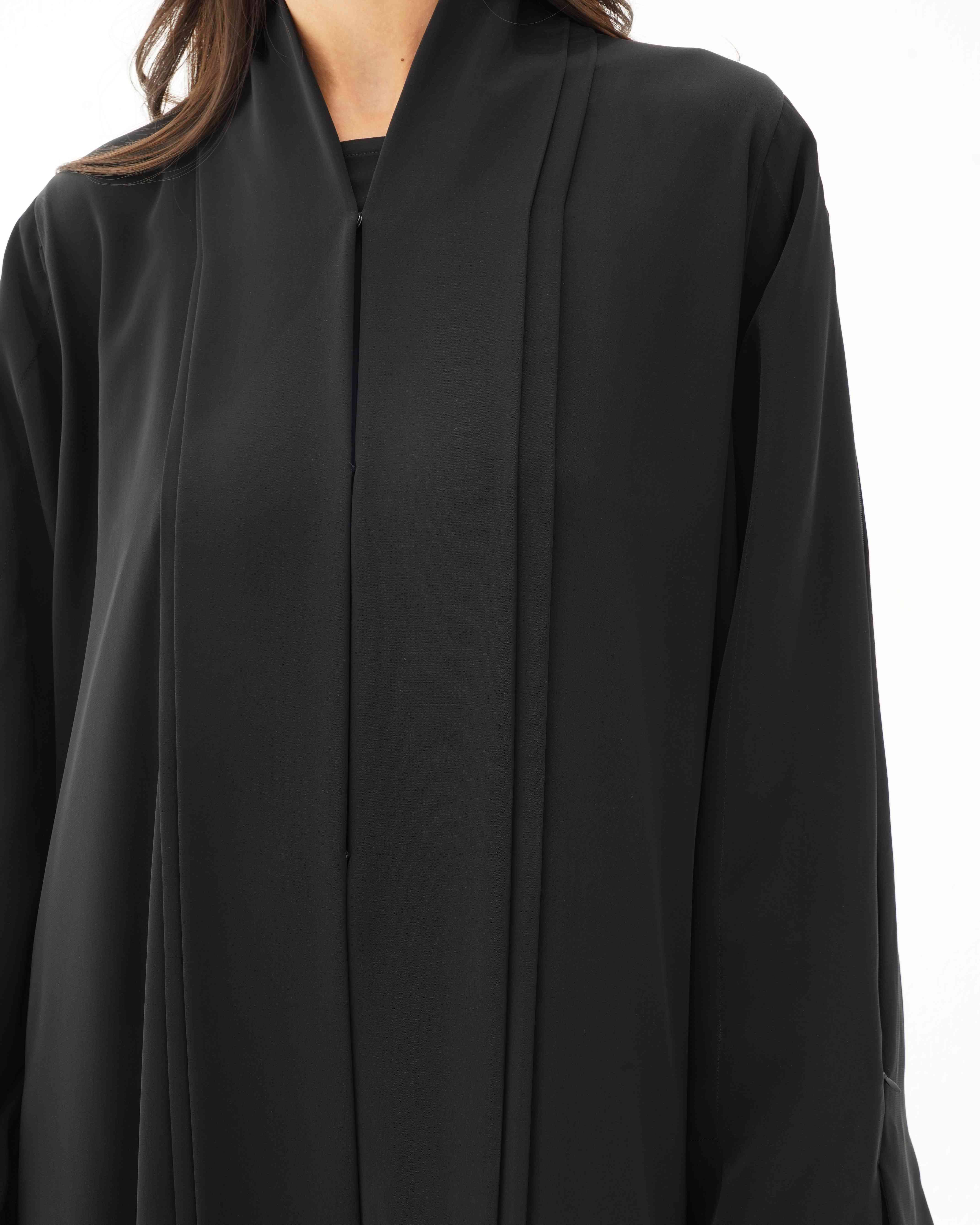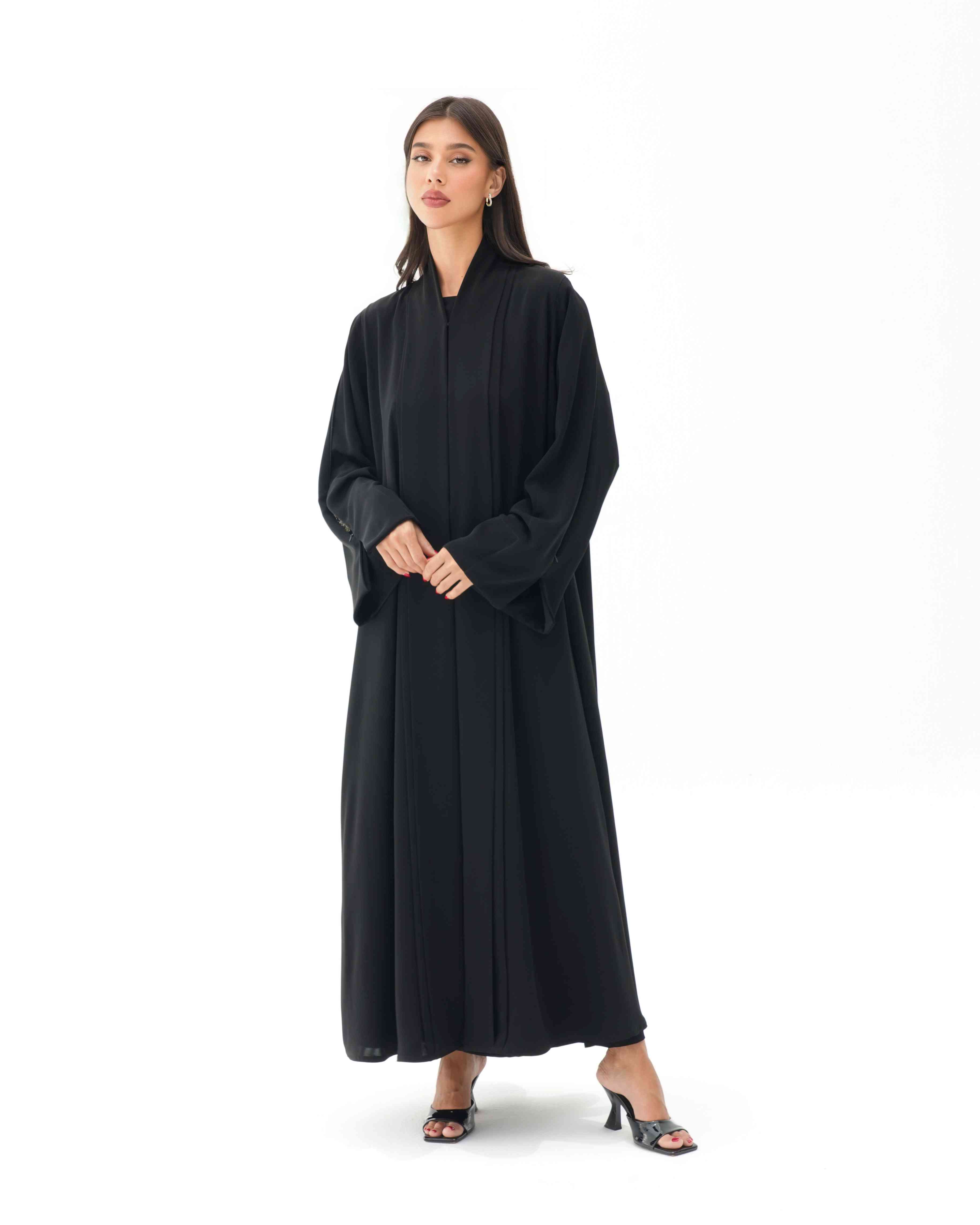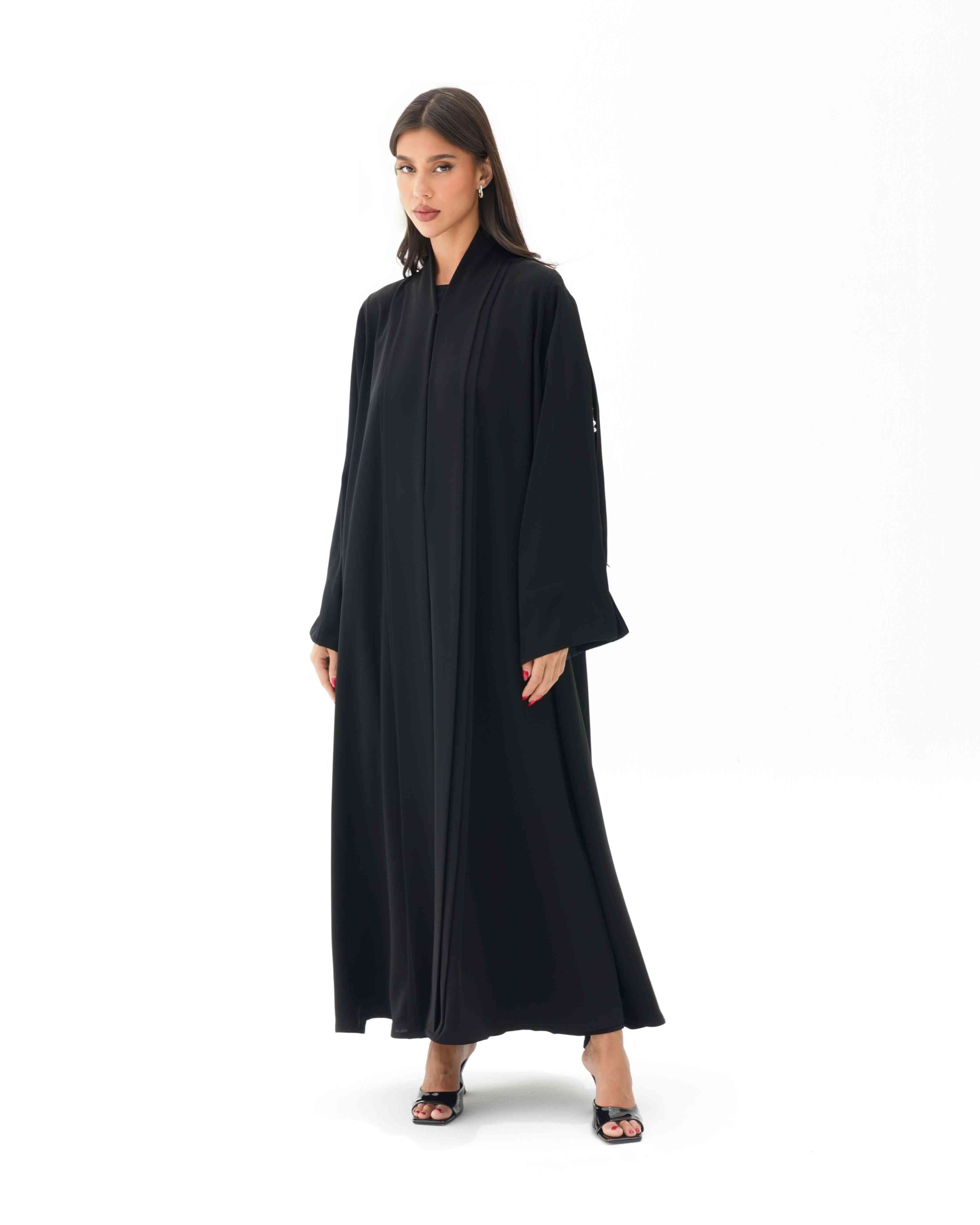 ستجذب هذه العباية الأنظار بفضل خامتها الفاخرة المصنوعة من نسيج الكريب الناعم والمنسدل، والذي جاء مصمما بطيات مزدوجة في شريط القماش الملتف من خلف الرقبة الى اسفل ذيل العباية، وصُنع الجزء الخاص بالكم بطيات طولية في تصميم غرافيكي بداخلها تطريز بالخرز الذهبي مدموج بشكل منثور وعشوائي بحبات من اللؤلؤ الابيض وسحاب لمظهر مزدوج لعباية سادة وانيقة لاطلالة يومية عند اغلاق السحاب ومظهر مسائي اخر انيق عند فتح السحاب.
