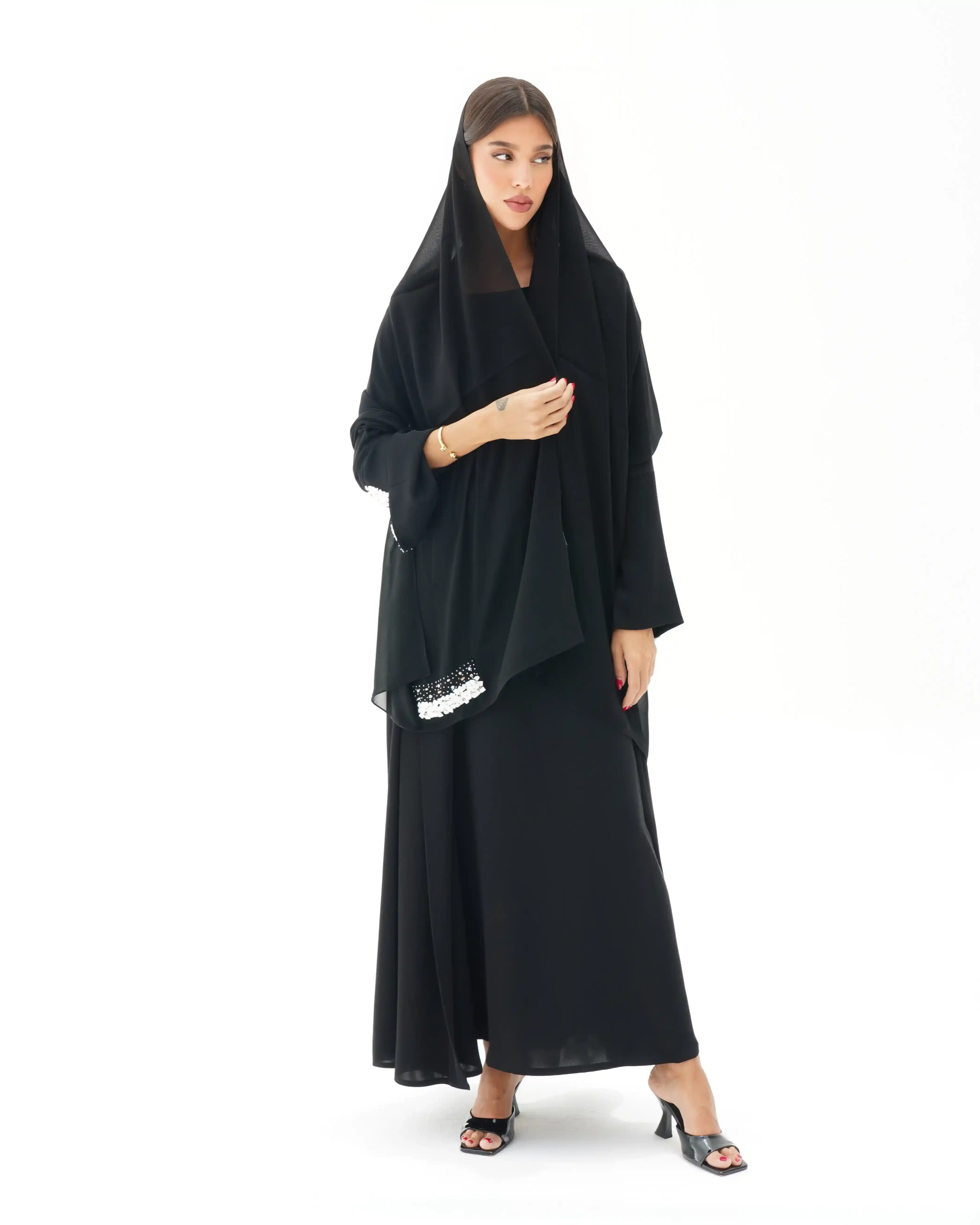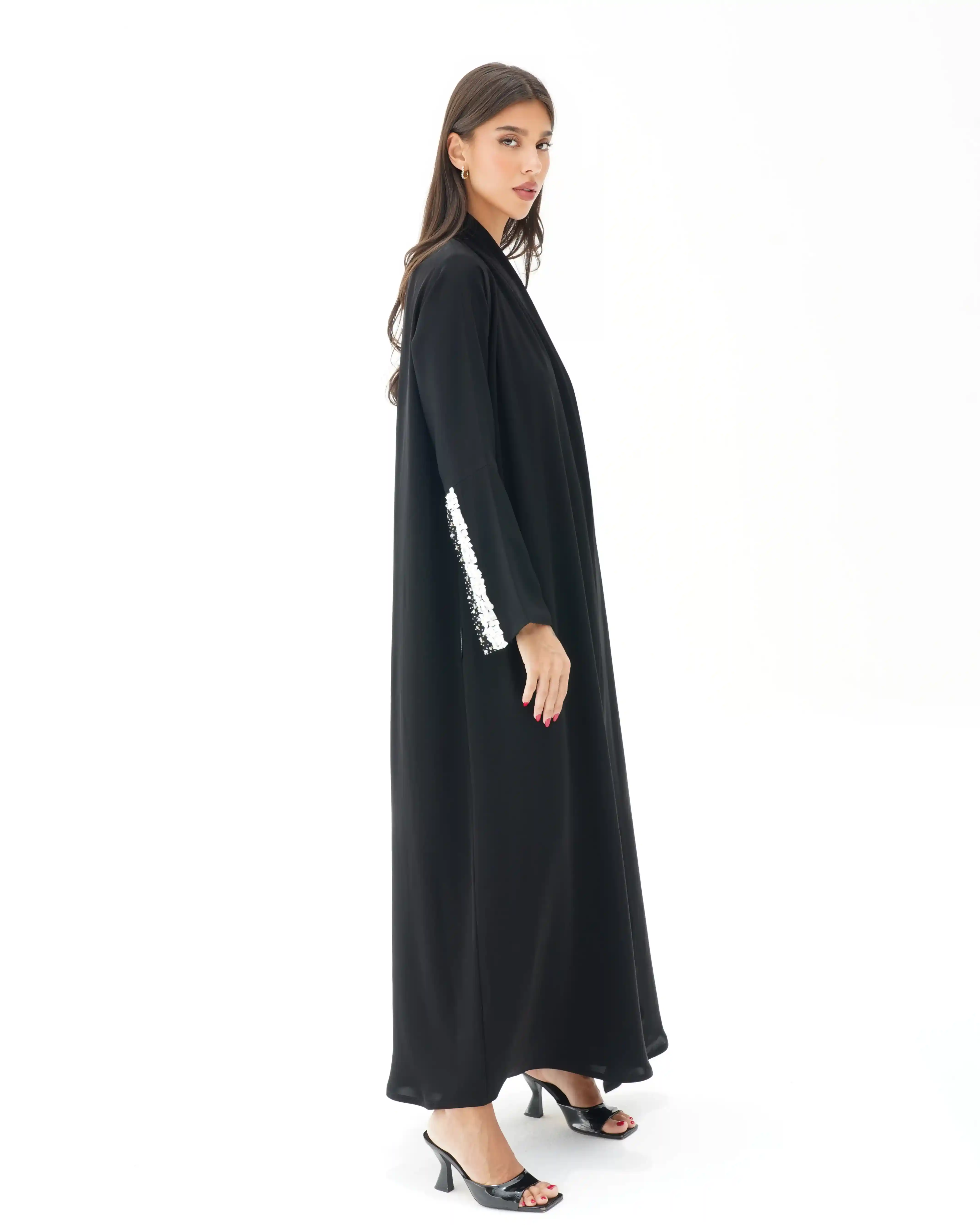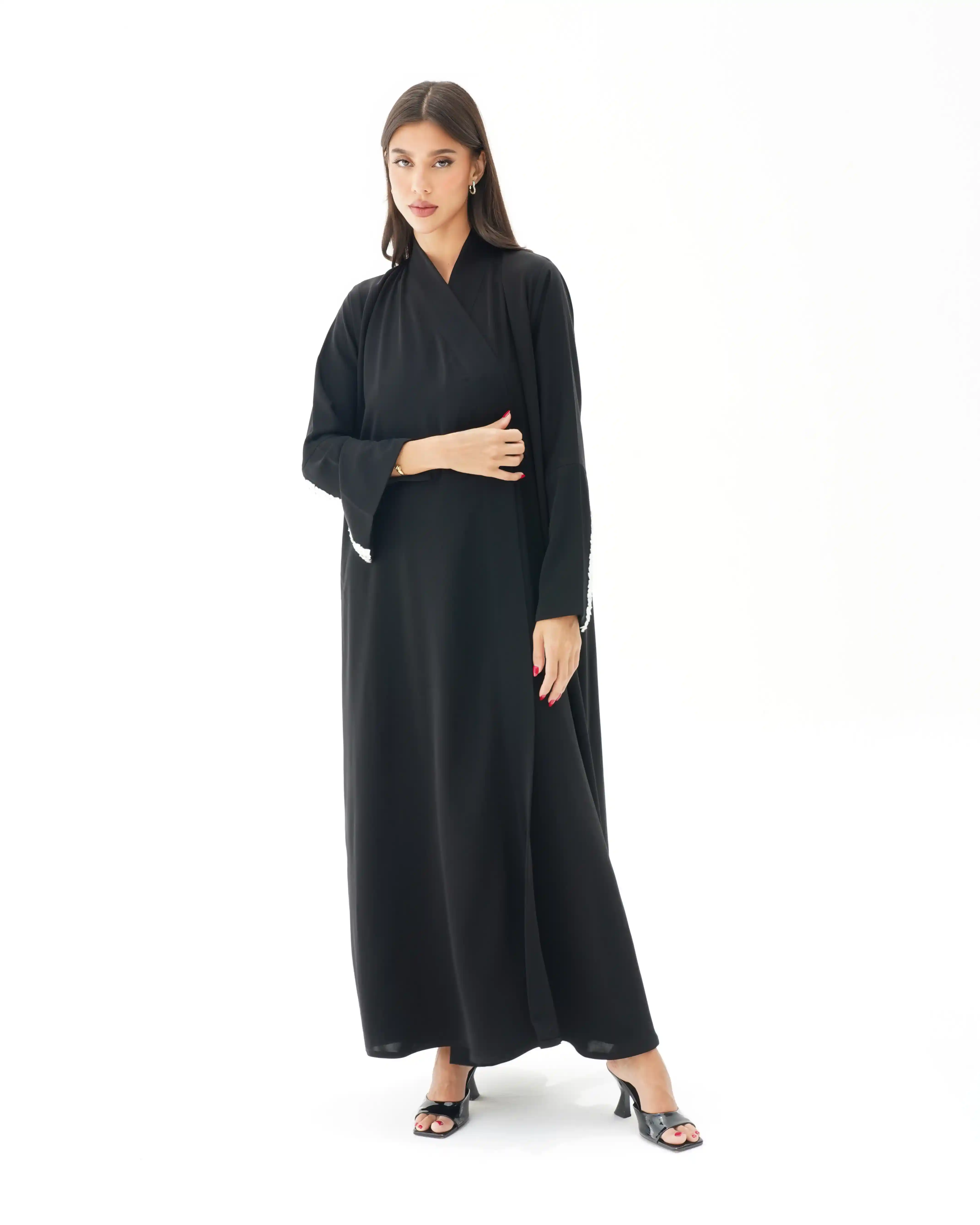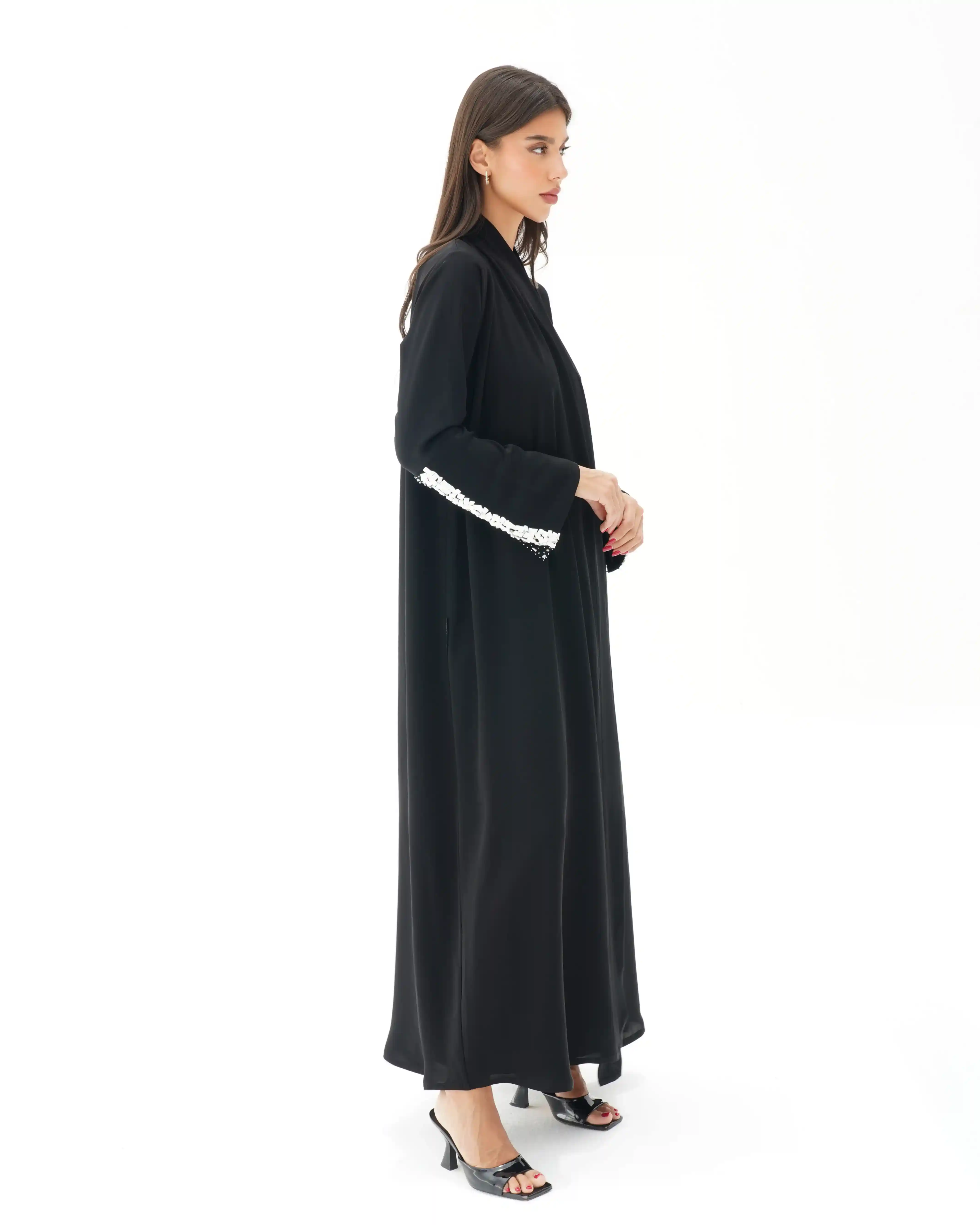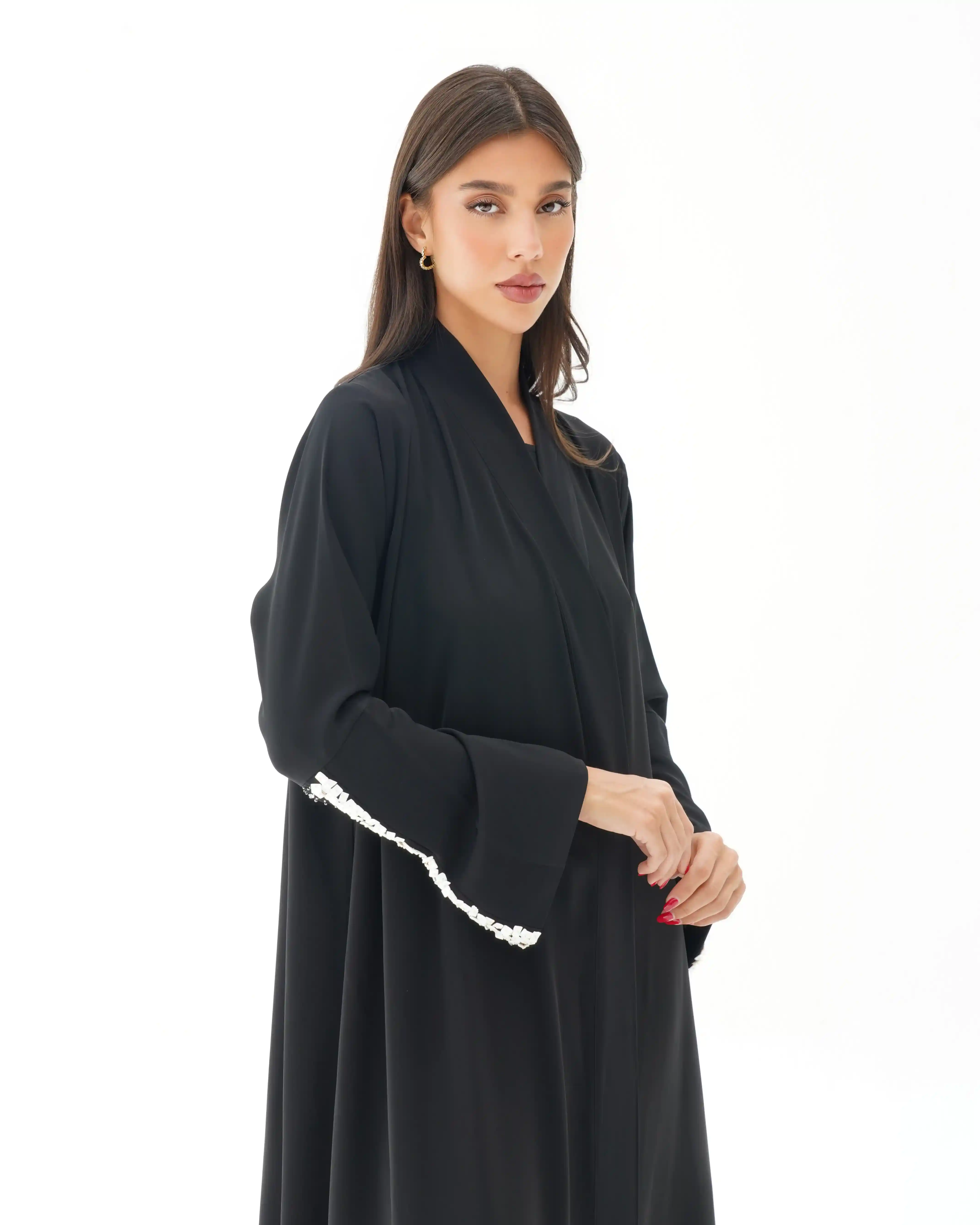 اطلالة انيقة بدون عناء لوجود قطعة فستان داخلي معها، فهذه العباية بالقصة اللف المبتكرة تأتي بنمط متداخل على شكل حرف x تلتف من خلف الرقبة بشريط ياقة الى اخر ذيل العباية وتزدان الاكمام بصدف طبيعي بلون ابيض مشتغلة يدويا ومدموجدة مع كريستال وخرز لتضفي لمسة اهتمامنا بالتفاصيل الدقيقة التي من خلالها اكتسبت العلامة شهرتها الواسعة في المملكة العربية السعودية كما تتميز العباية بقماش خفيف الوزن منسدل يضفي الانسيابية المطلوبة للتصميم. ويمكن ارتداؤها مفتوحة مع الفستان الداخلي او بطريقة اللف.
