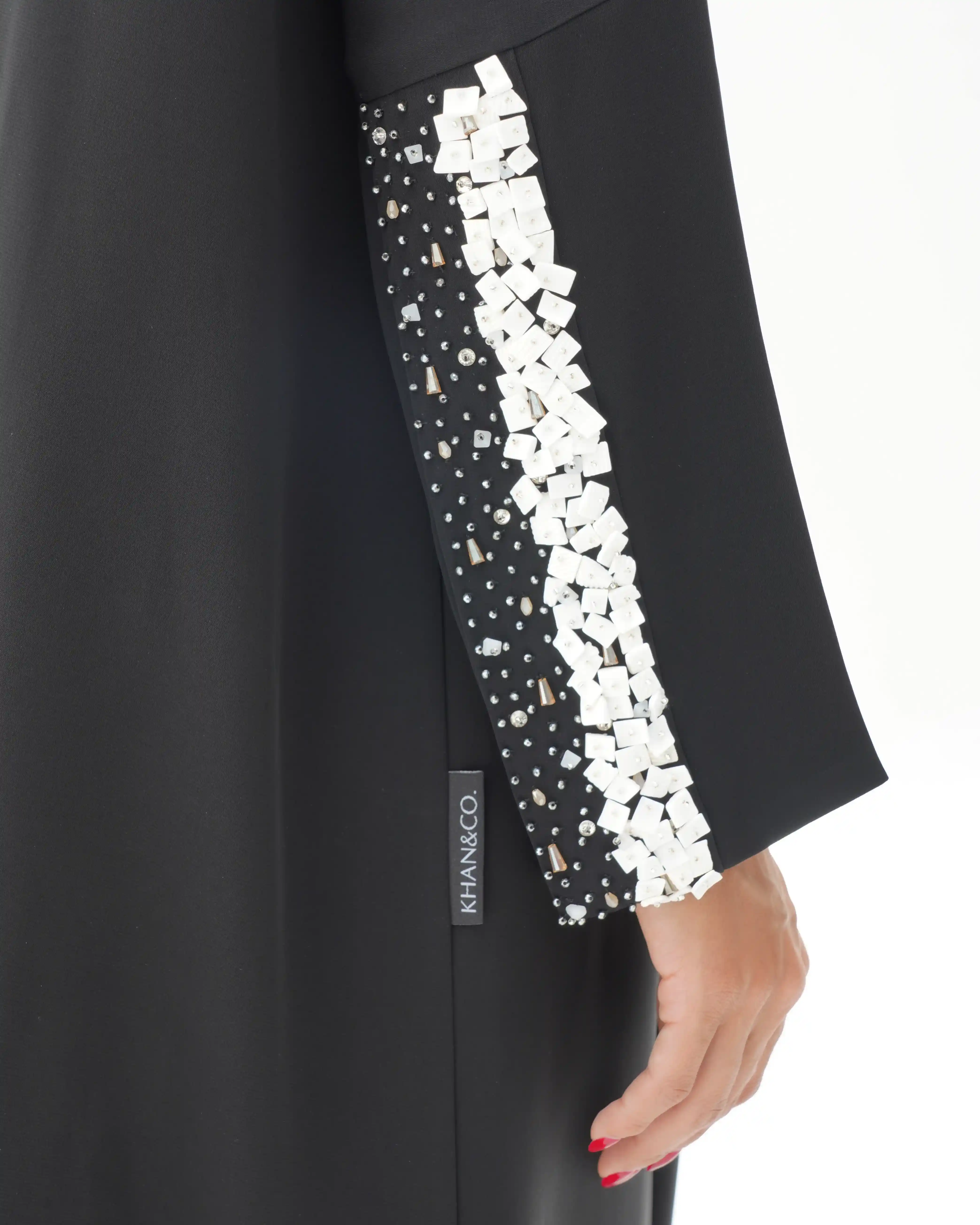 • تطريز بالصدف الابيض الطبيعي بلون ابيض مدموج بالكريستال بشكل يبدأ مصفوف ويتناثر تدريجيا في طرف الكم.