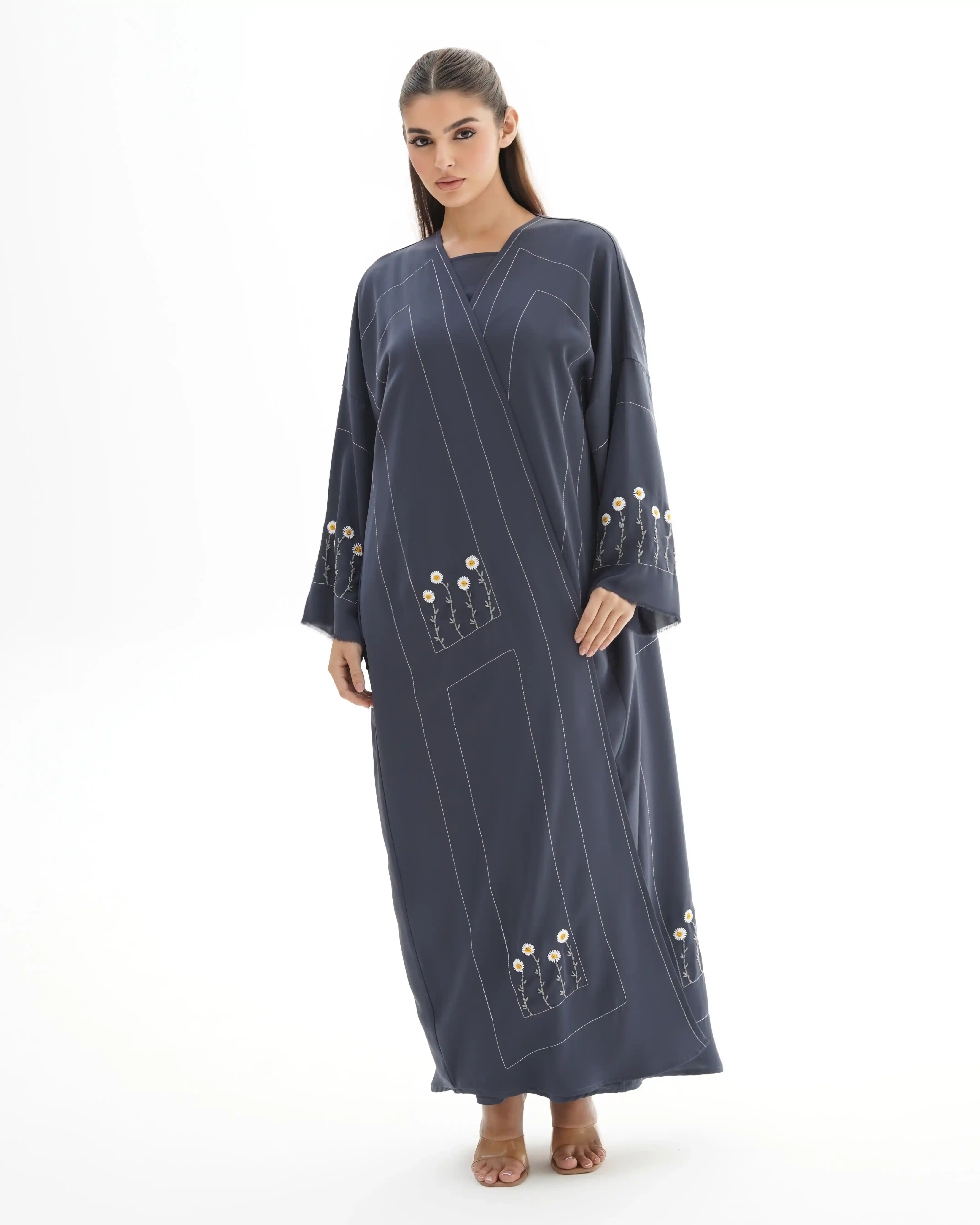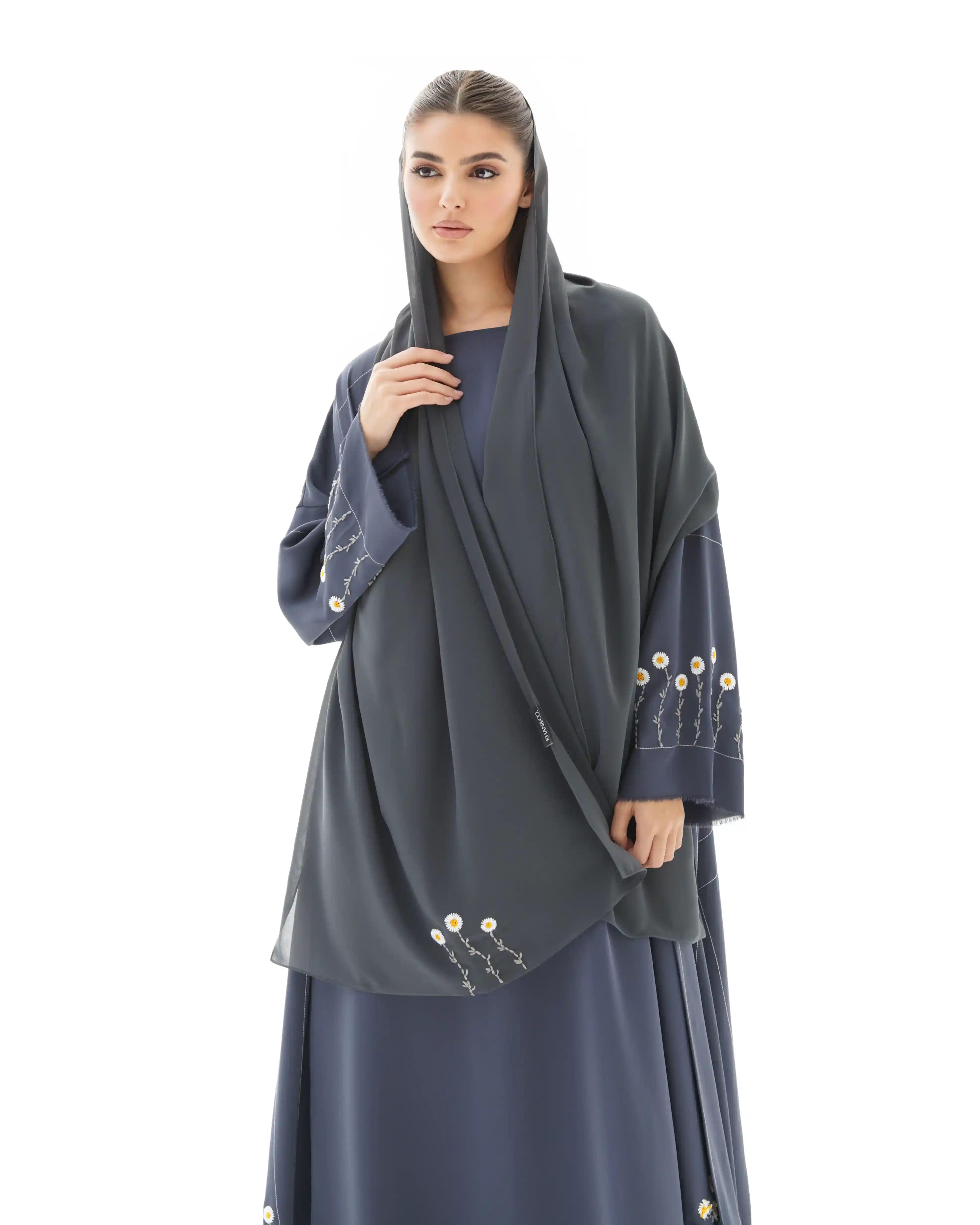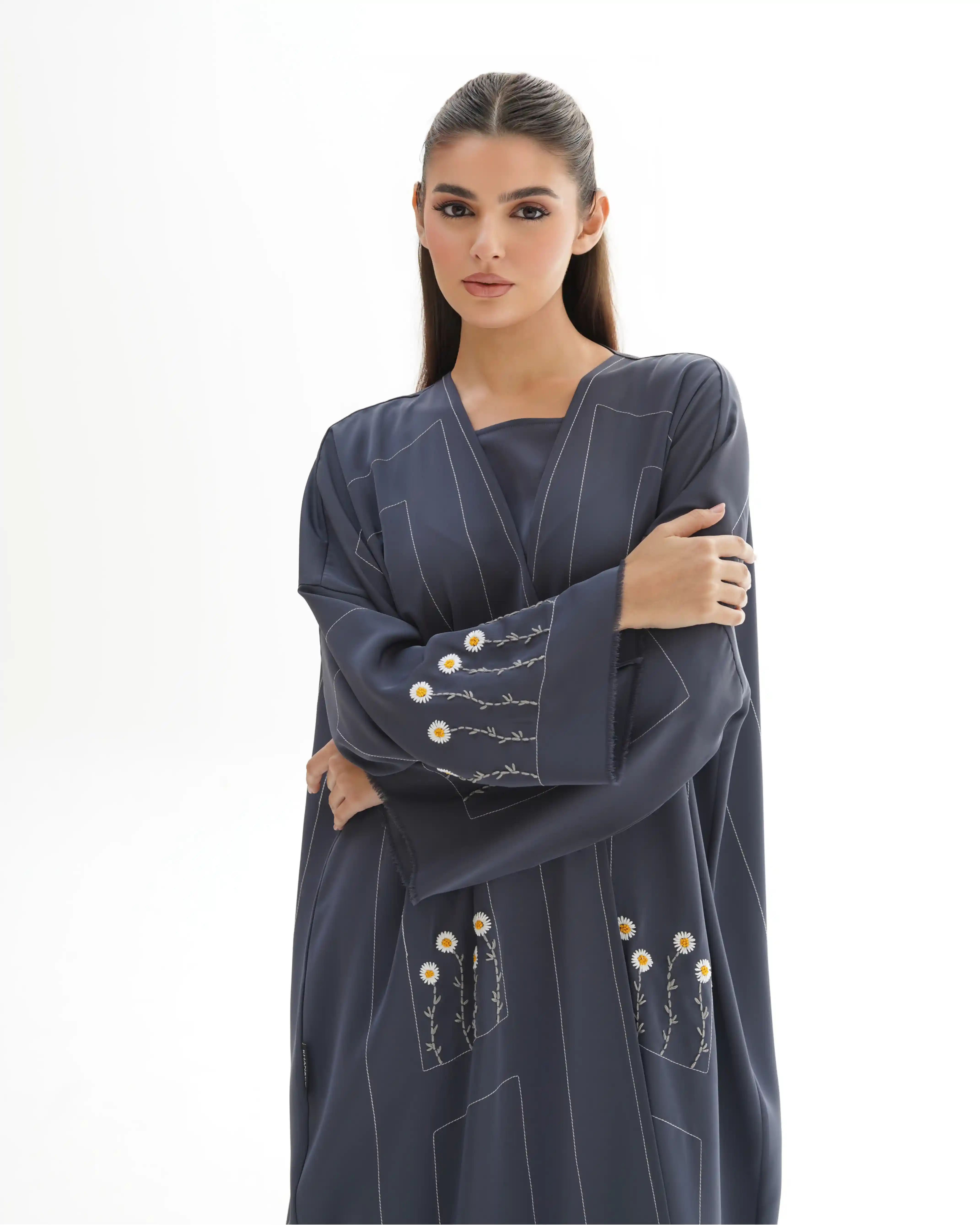 صممت هذه العباية من قماش الكريب الناعم للتمتع بإطلالة مريحة وخفيفة ولتنسجم مع تصميم ازهار الكاموميل الناعمة والمطرزة داخل مربعات هندسية مدروزة بخيط باللون الابيض لتضفي على التصميم دمج بين التصاميم الهندسية  وتصاميم الازهار والتصاميم المشجرة في تصميم واحد.. اما القصة فقد تم تصميمها  بدون طقطق وواسعة عند الصدر لتعطي مساحة قماش كافية ليتم لفها بشكل ساتر وانيق وام اضافة فستان داخلي هدية.