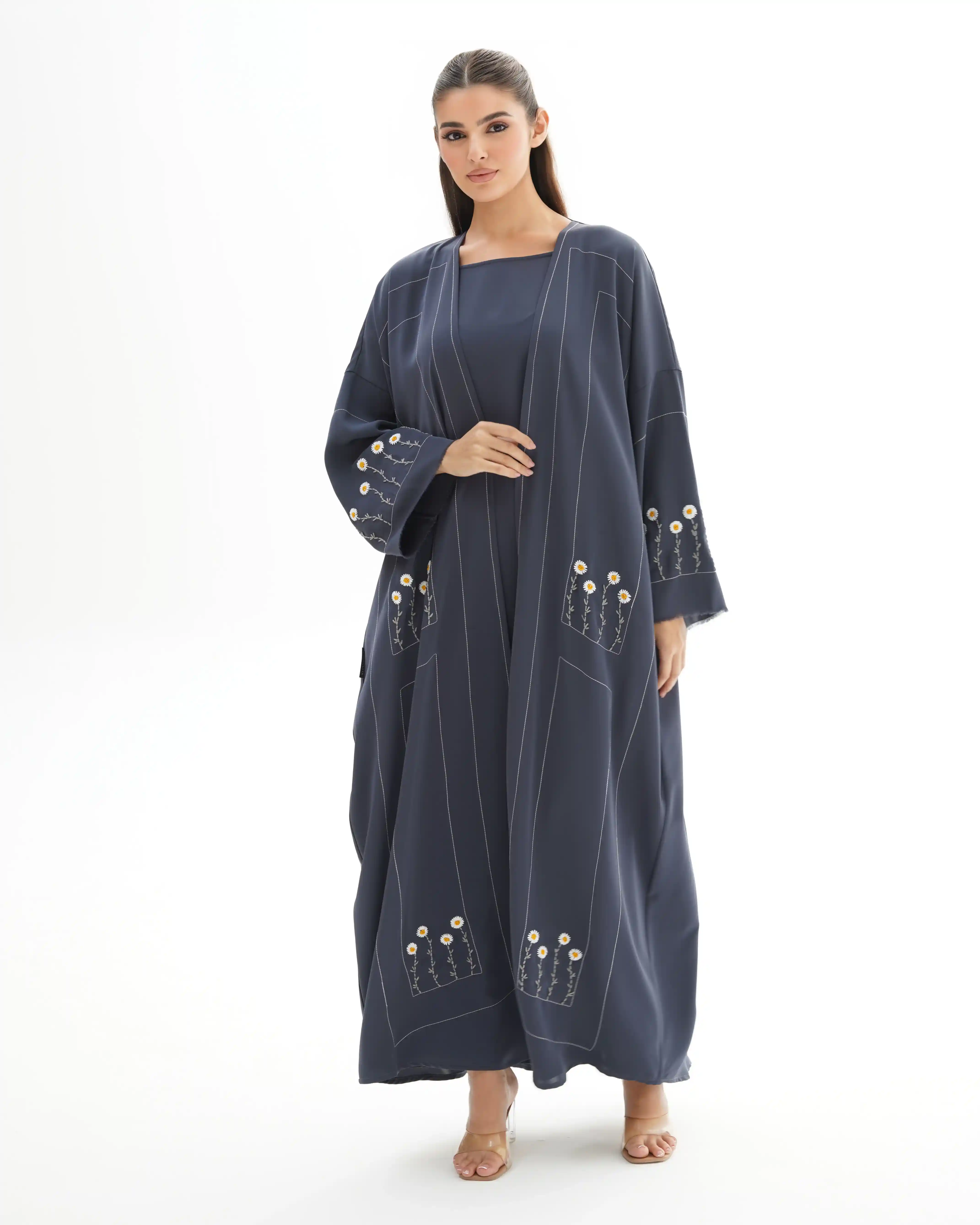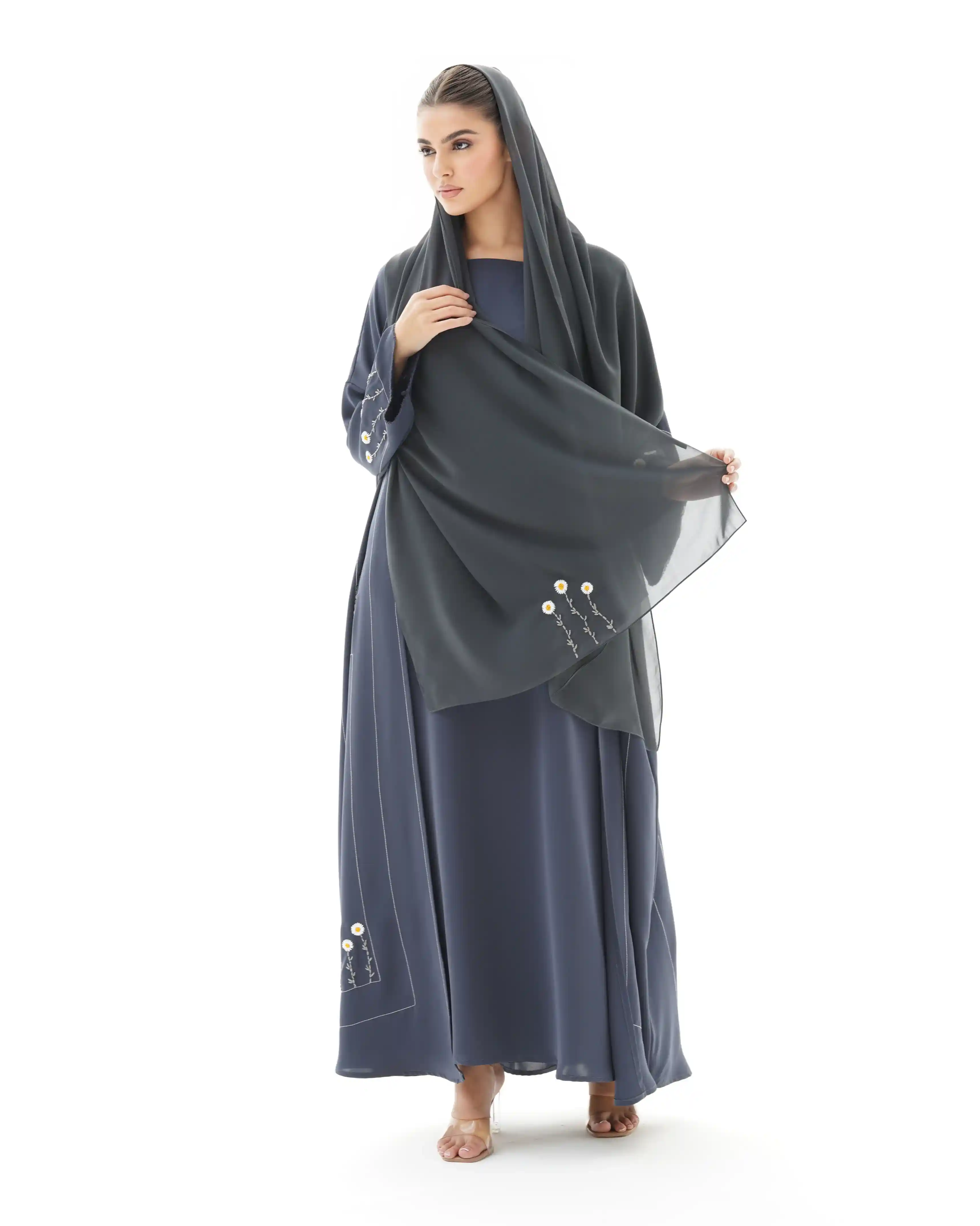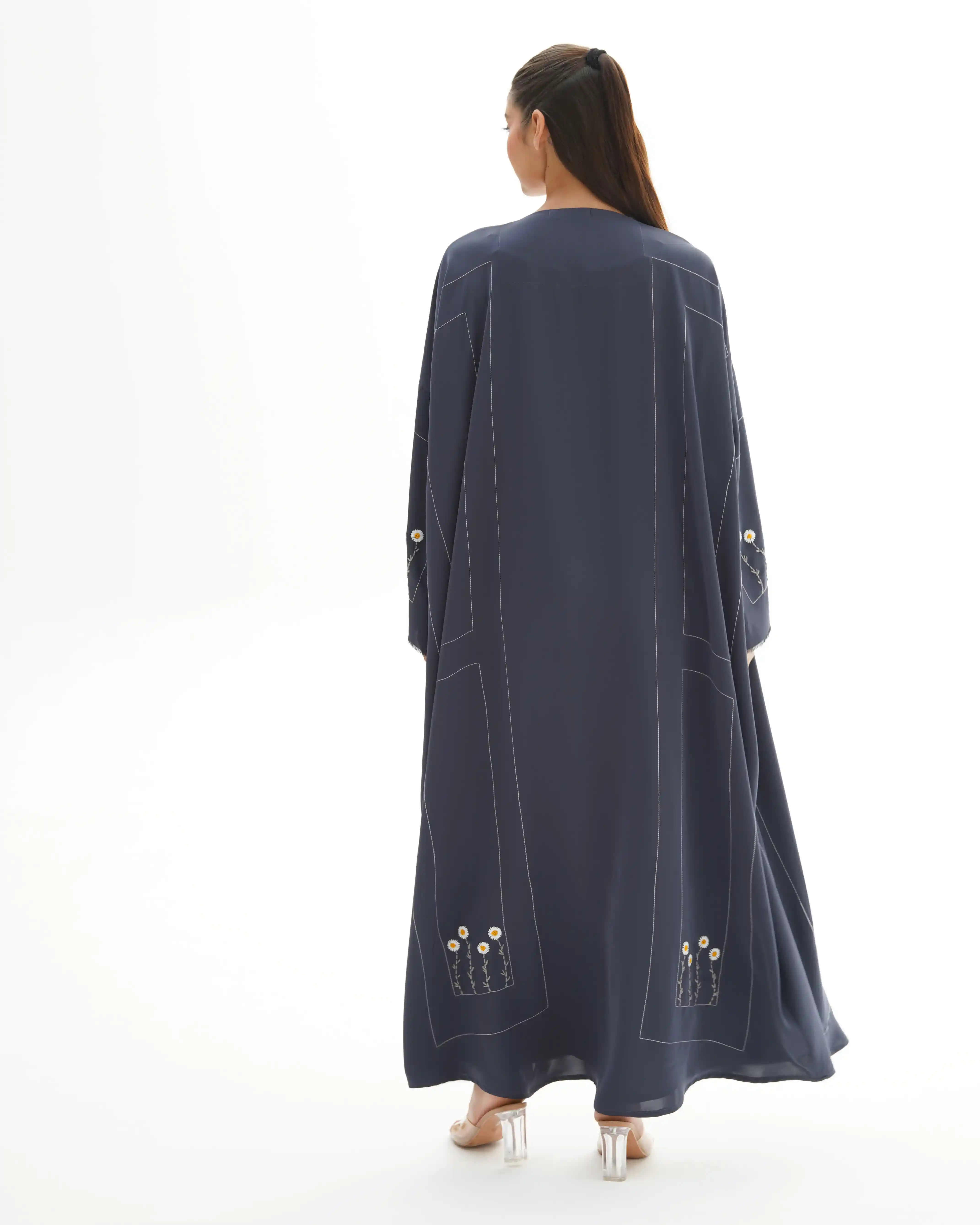 صممت هذه العباية من قماش الكريب الناعم للتمتع بإطلالة مريحة وخفيفة ولتنسجم مع تصميم ازهار الكاموميل الناعمة والمطرزة داخل مربعات هندسية مدروزة بخيط باللون الابيض لتضفي على التصميم دمج بين التصاميم الهندسية  وتصاميم الازهار والتصاميم المشجرة في تصميم واحد.. اما القصة فقد تم تصميمها  بدون طقطق وواسعة عند الصدر لتعطي مساحة قماش كافية ليتم لفها بشكل ساتر وانيق وام اضافة فستان داخلي هدية.