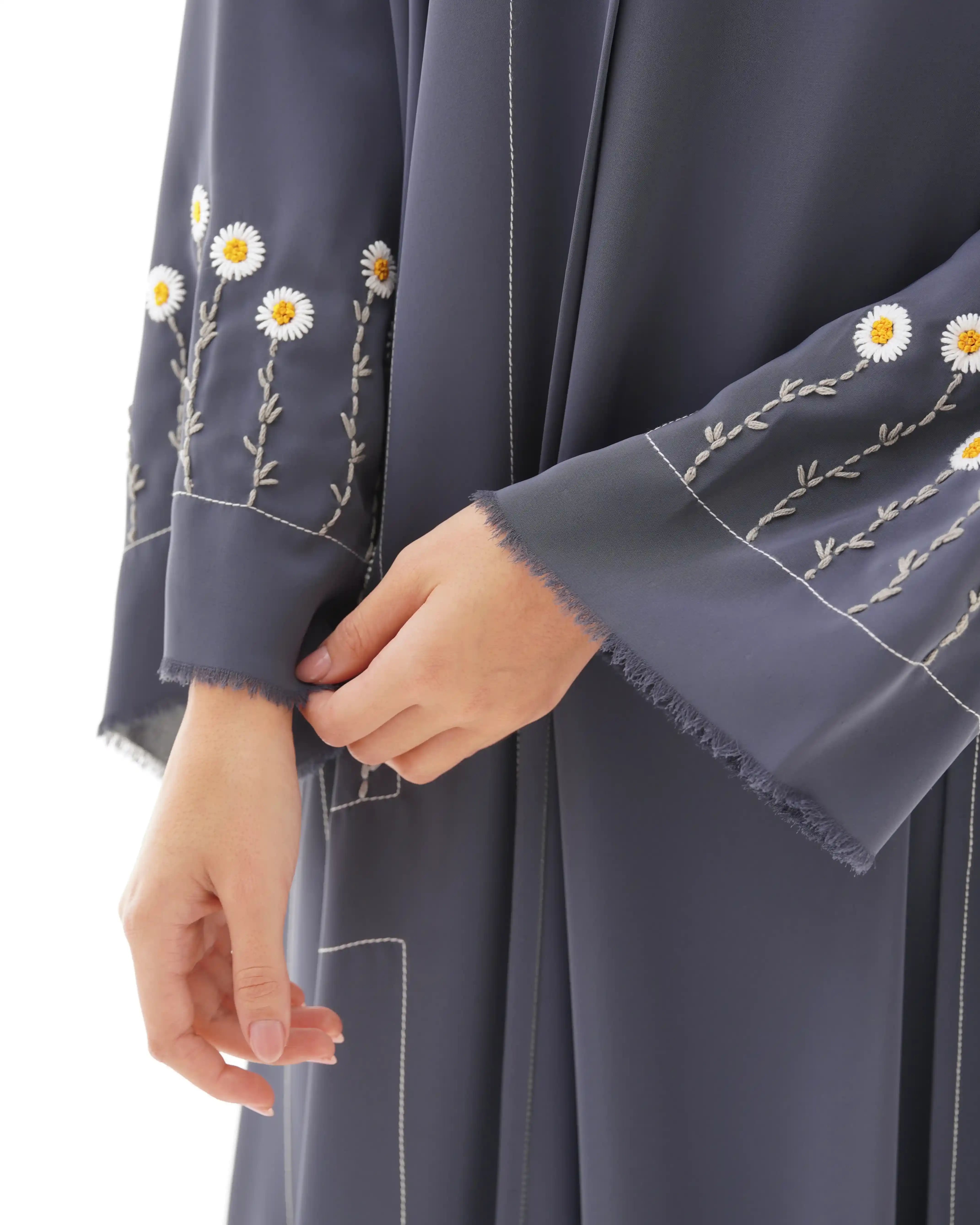 • أكمام واسعة، نبنهاية مزوّدة بحافة مشذبة خفيفة وتطريز ازهار الكاموميل في كامل العباية.