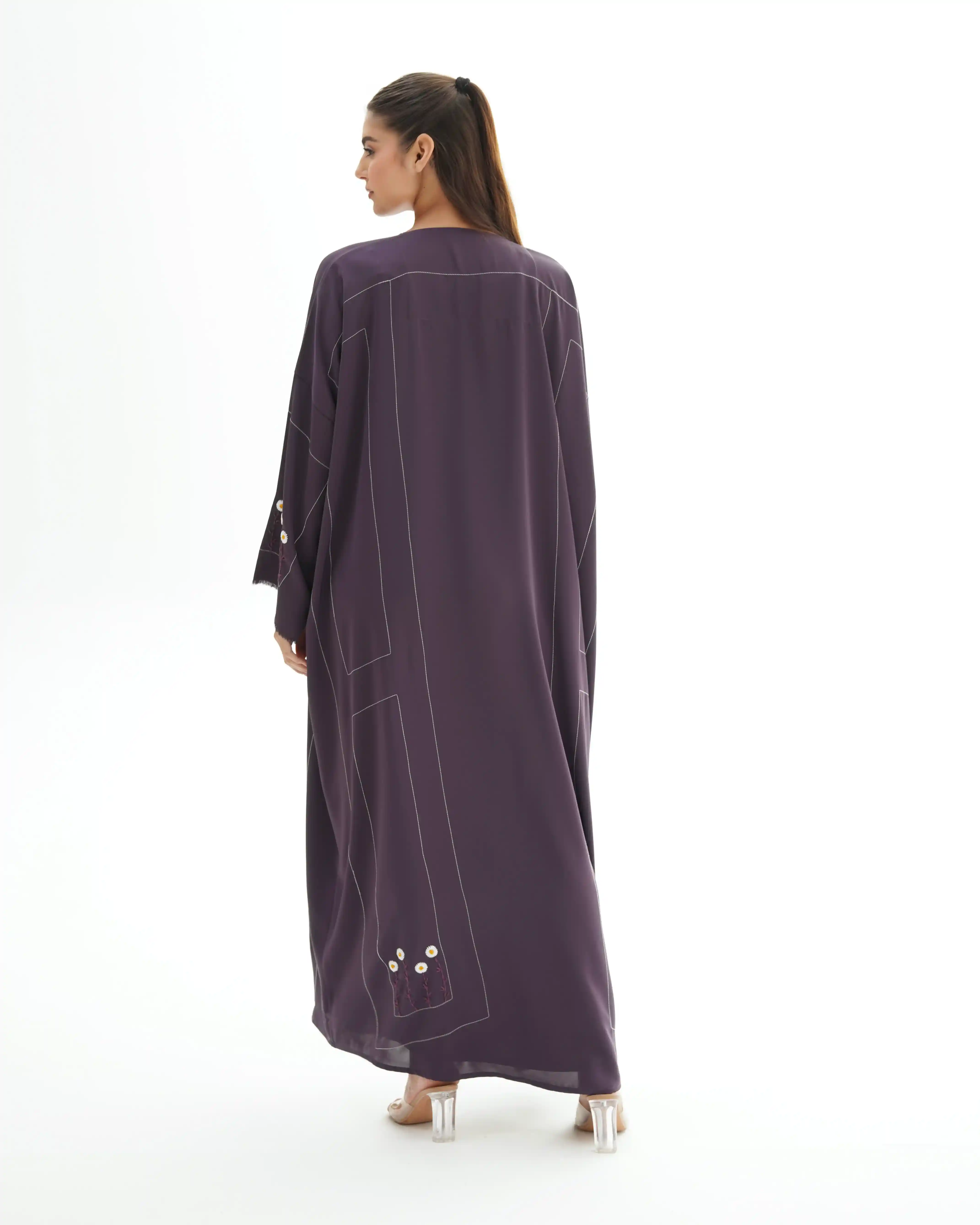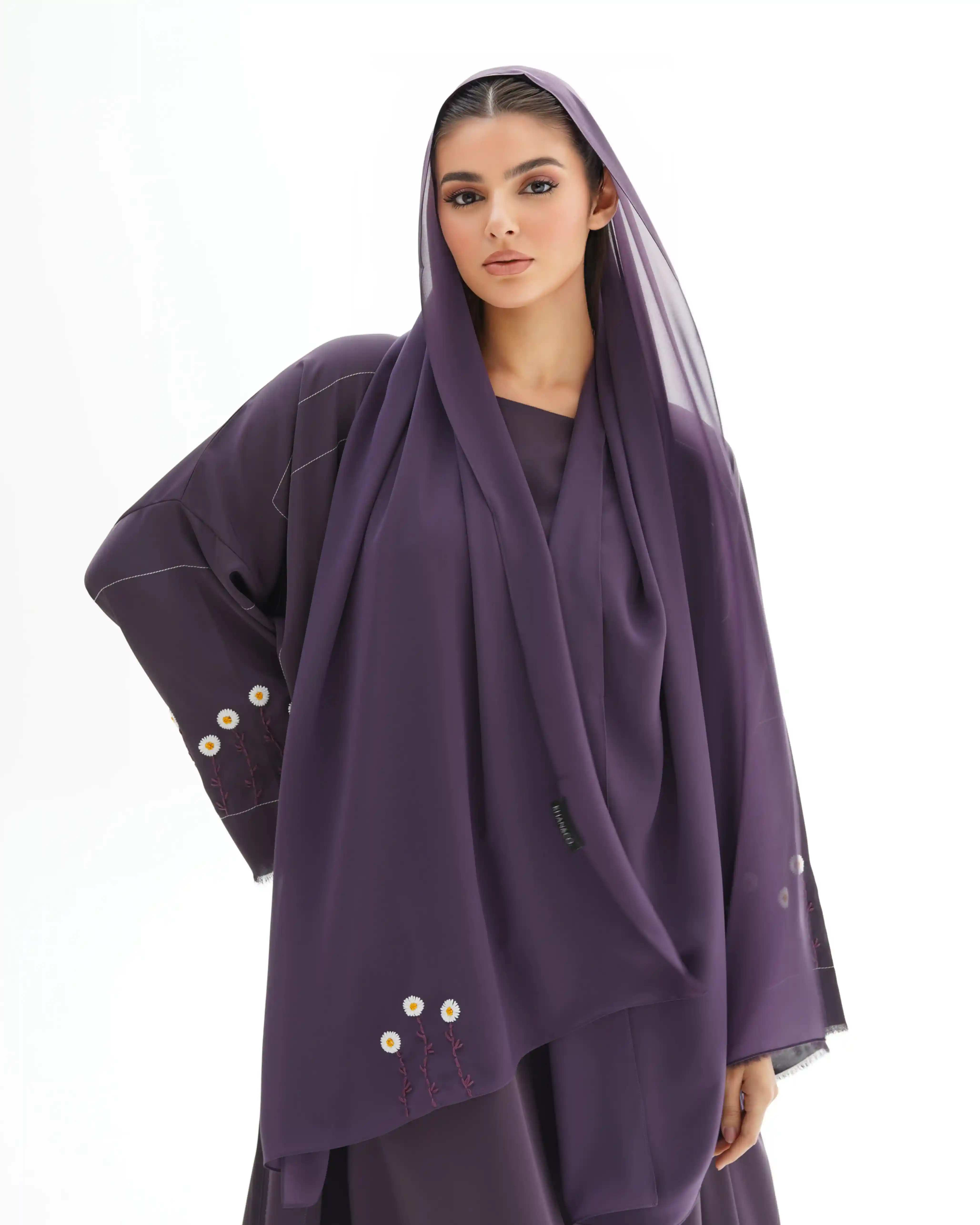 صممت هذه العباية من قماش الكريب الناعم للتمتع بإطلالة مريحة وخفيفة ولتنسجم مع تصميم ازهار الكاموميل الناعمة والمطرزة داخل مربعات هندسية مدروزة بخيط باللون الابيض لتضفي على التصميم دمج بين التصاميم الهندسية  وتصاميم الازهار والتصاميم المشجرة في تصميم واحد.. اما القصة فقد تم تصميمها  بدون طقطق وواسعة عند الصدر لتعطي مساحة قماش كافية ليتم لفها بشكل ساتر وانيق وام اضافة فستان داخلي هدية.