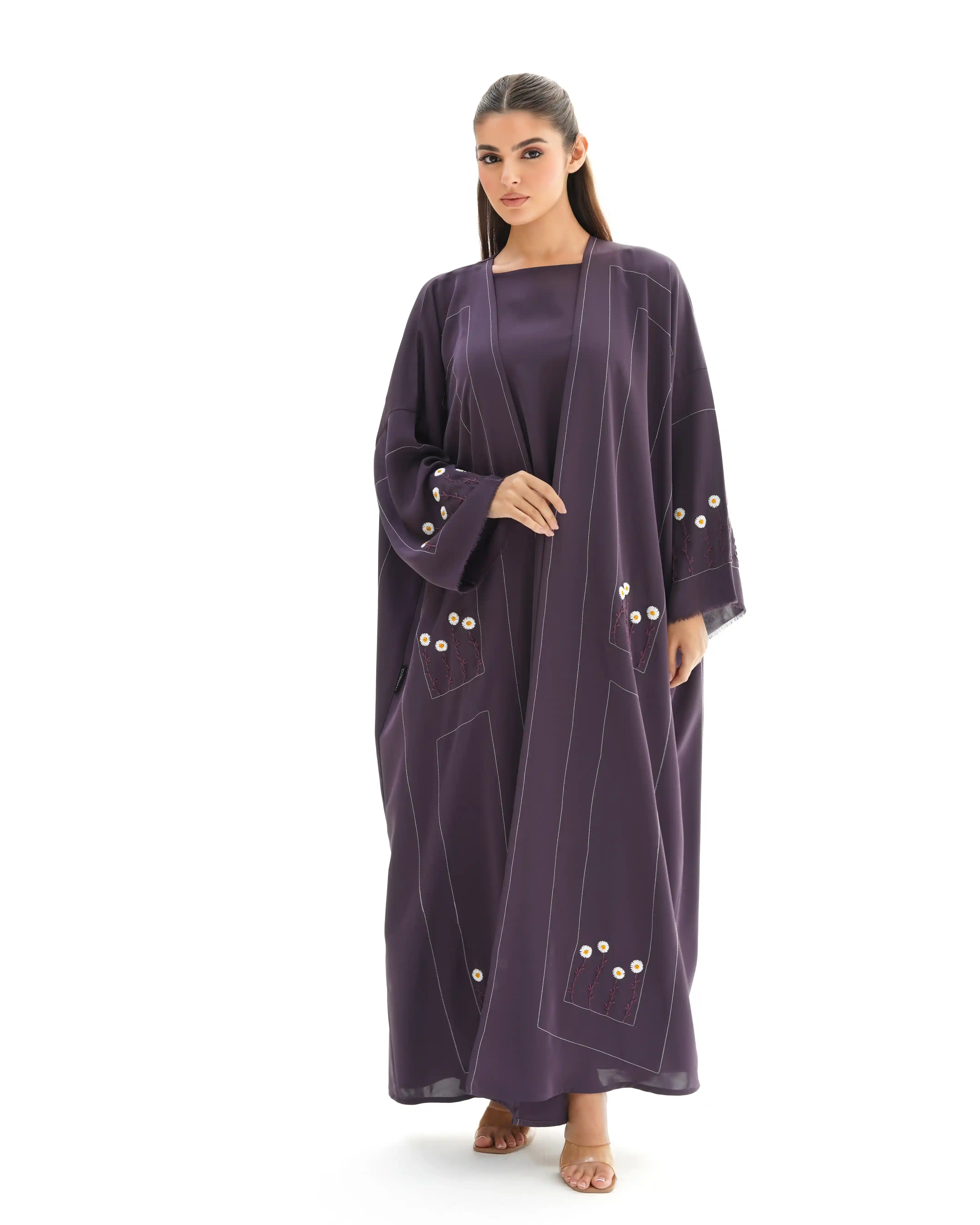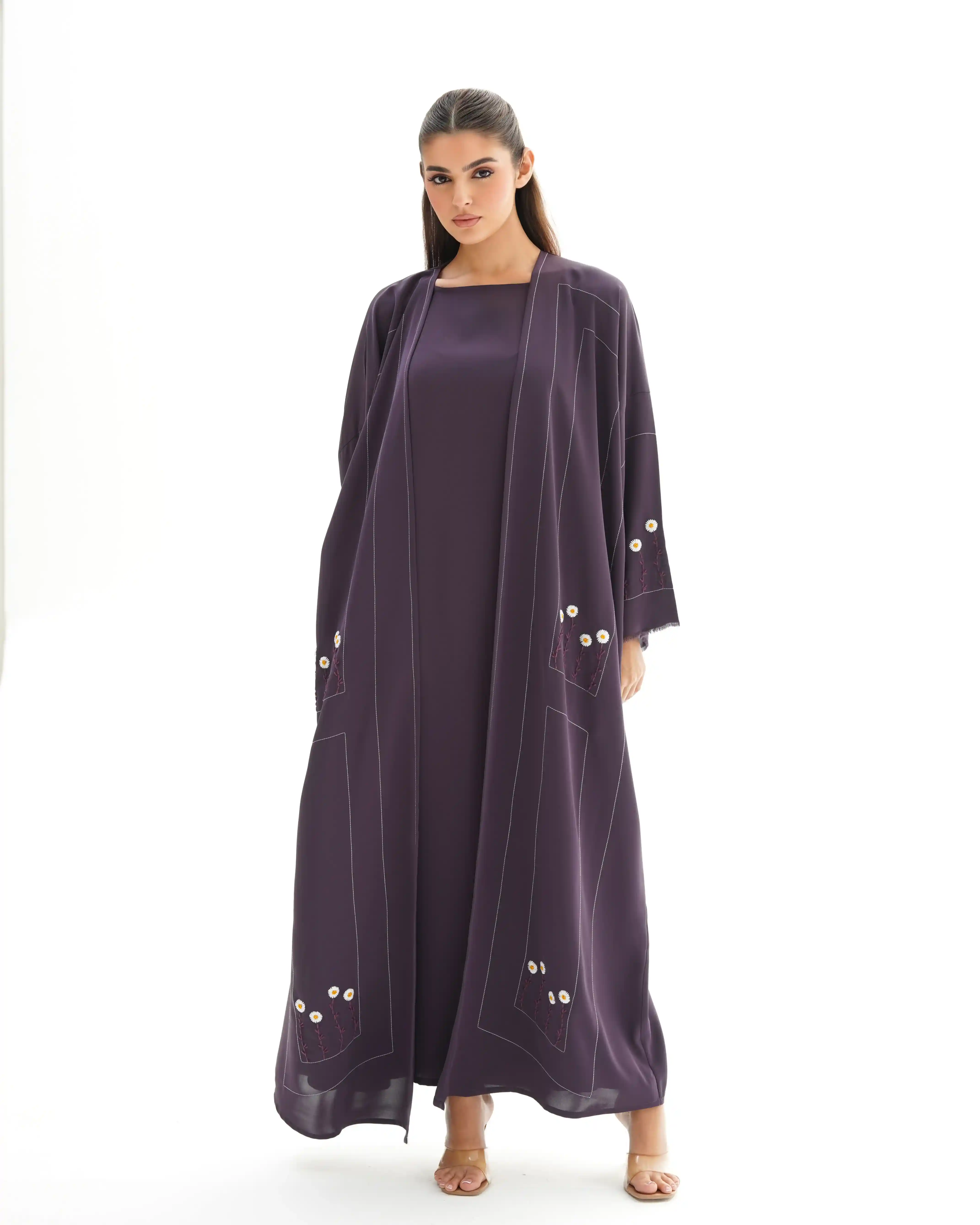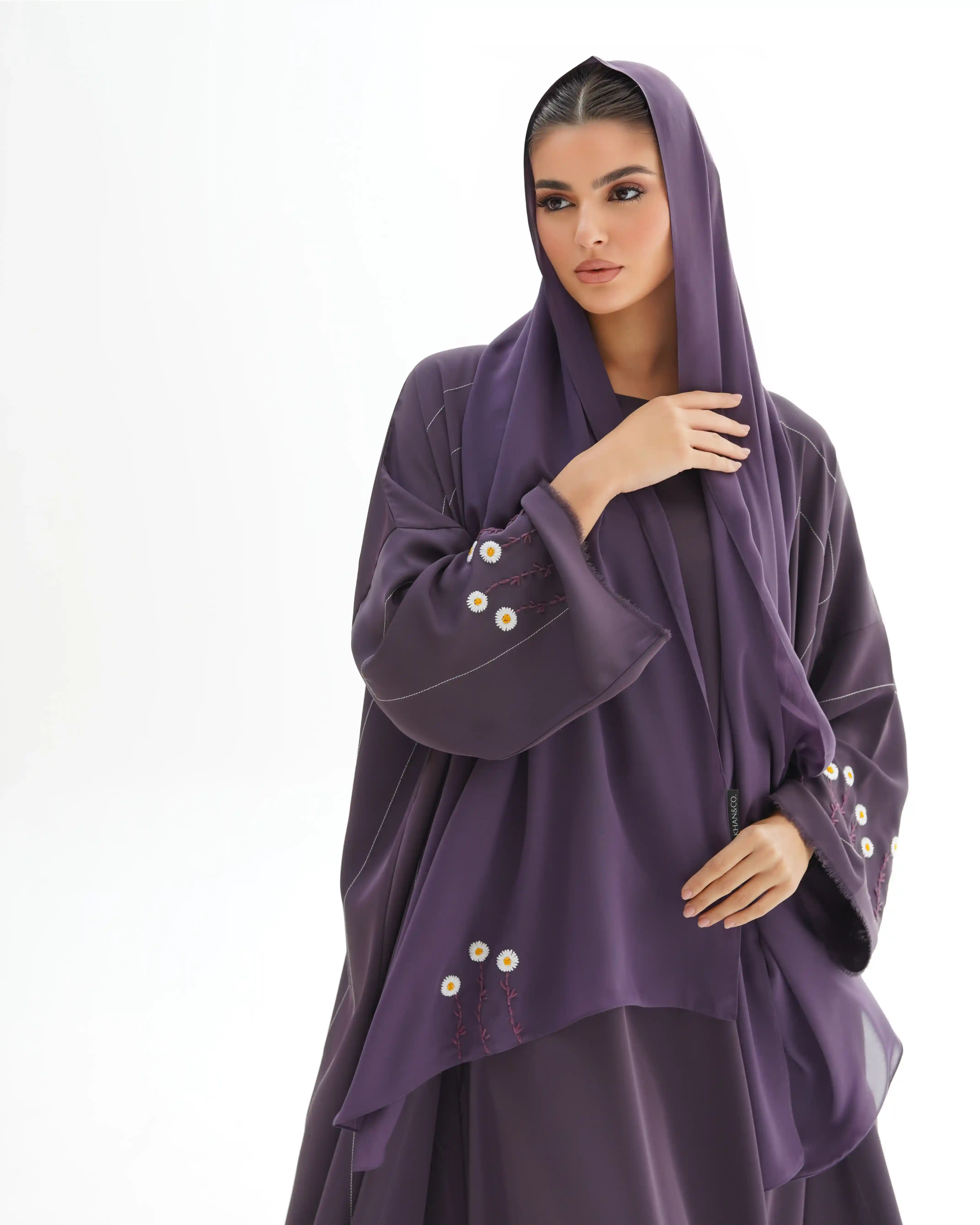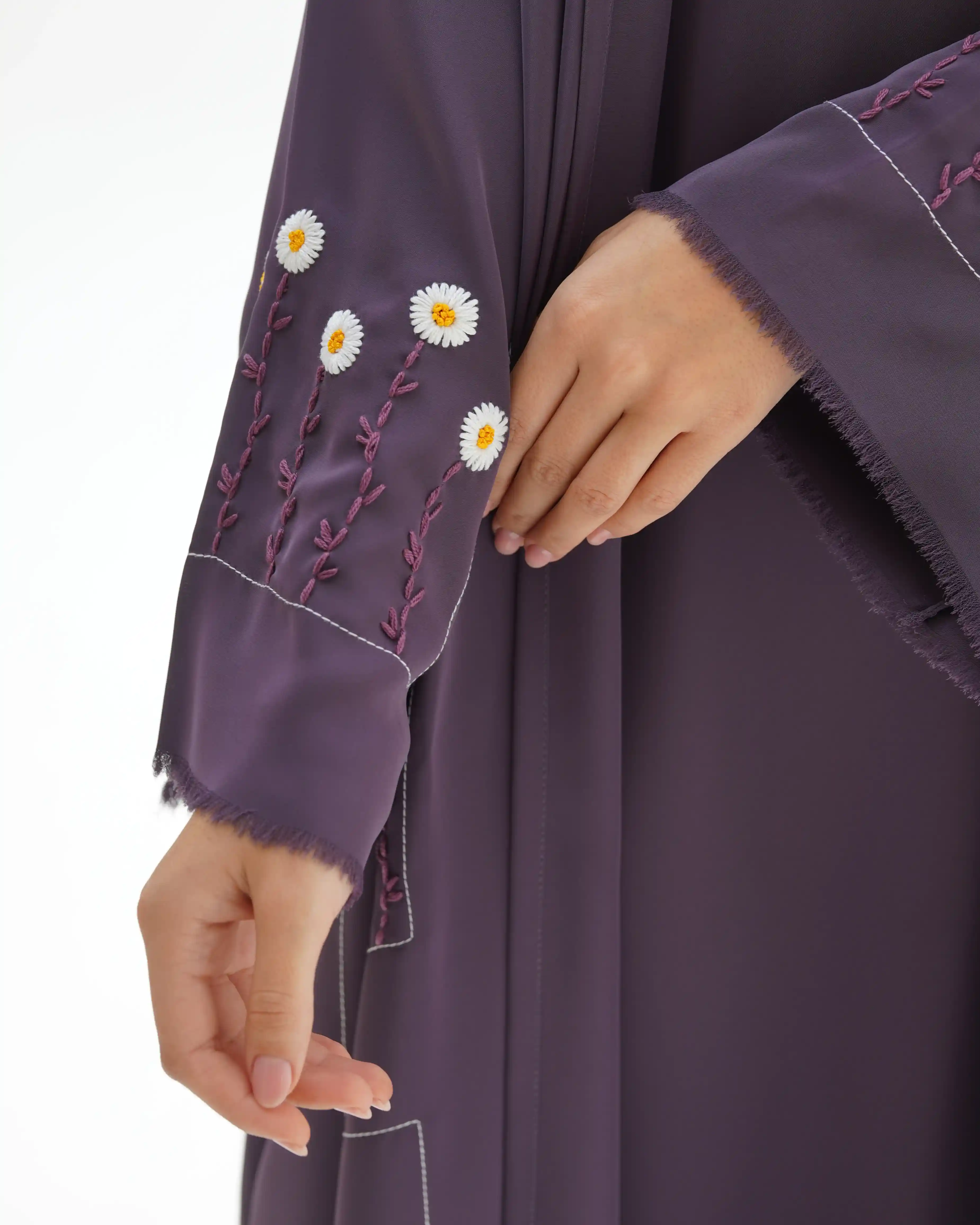 • أكمام واسعة، نبنهاية مزوّدة بحافة مشذبة خفيفة وتطريز ازهار الكاموميل في كامل العباية.
