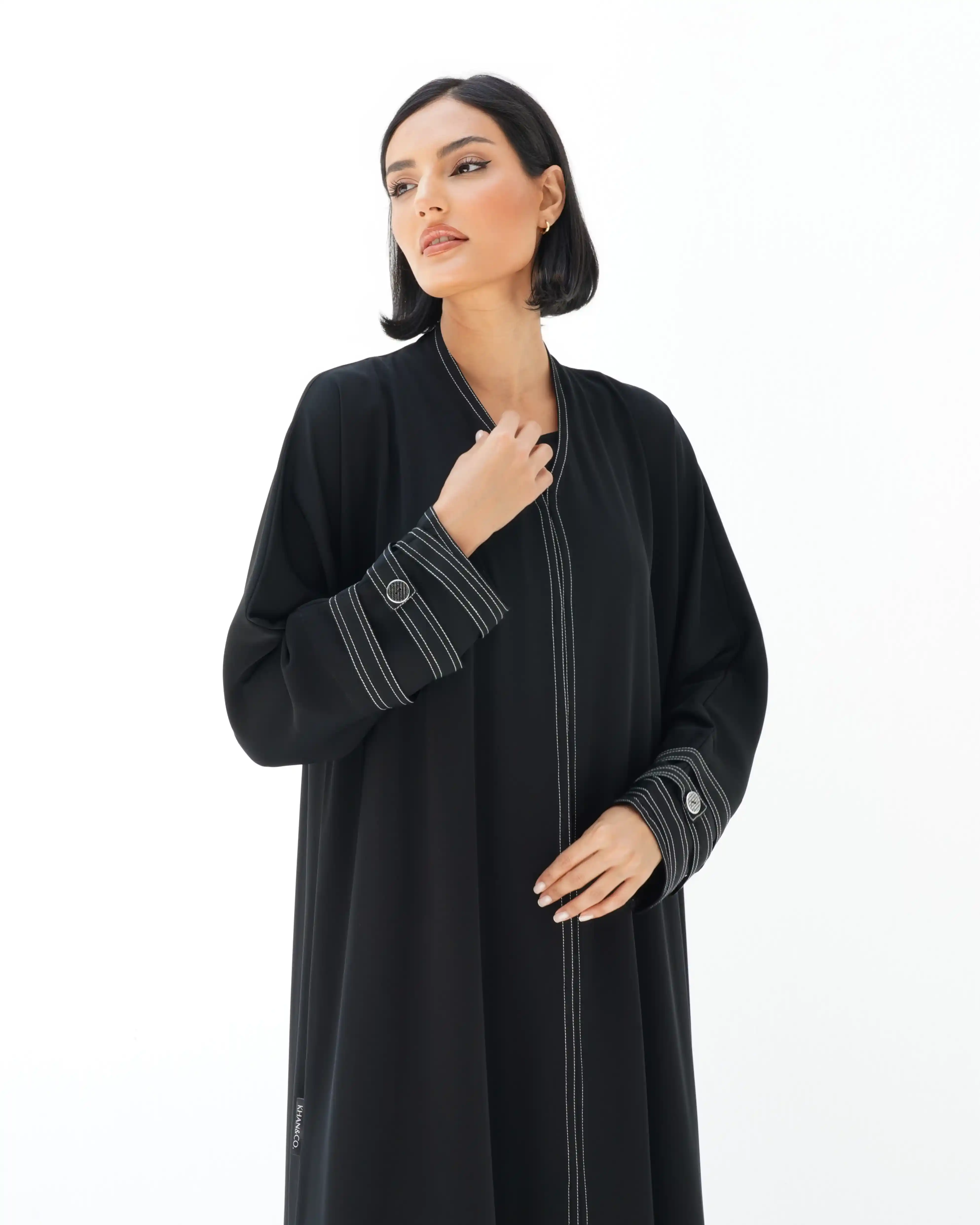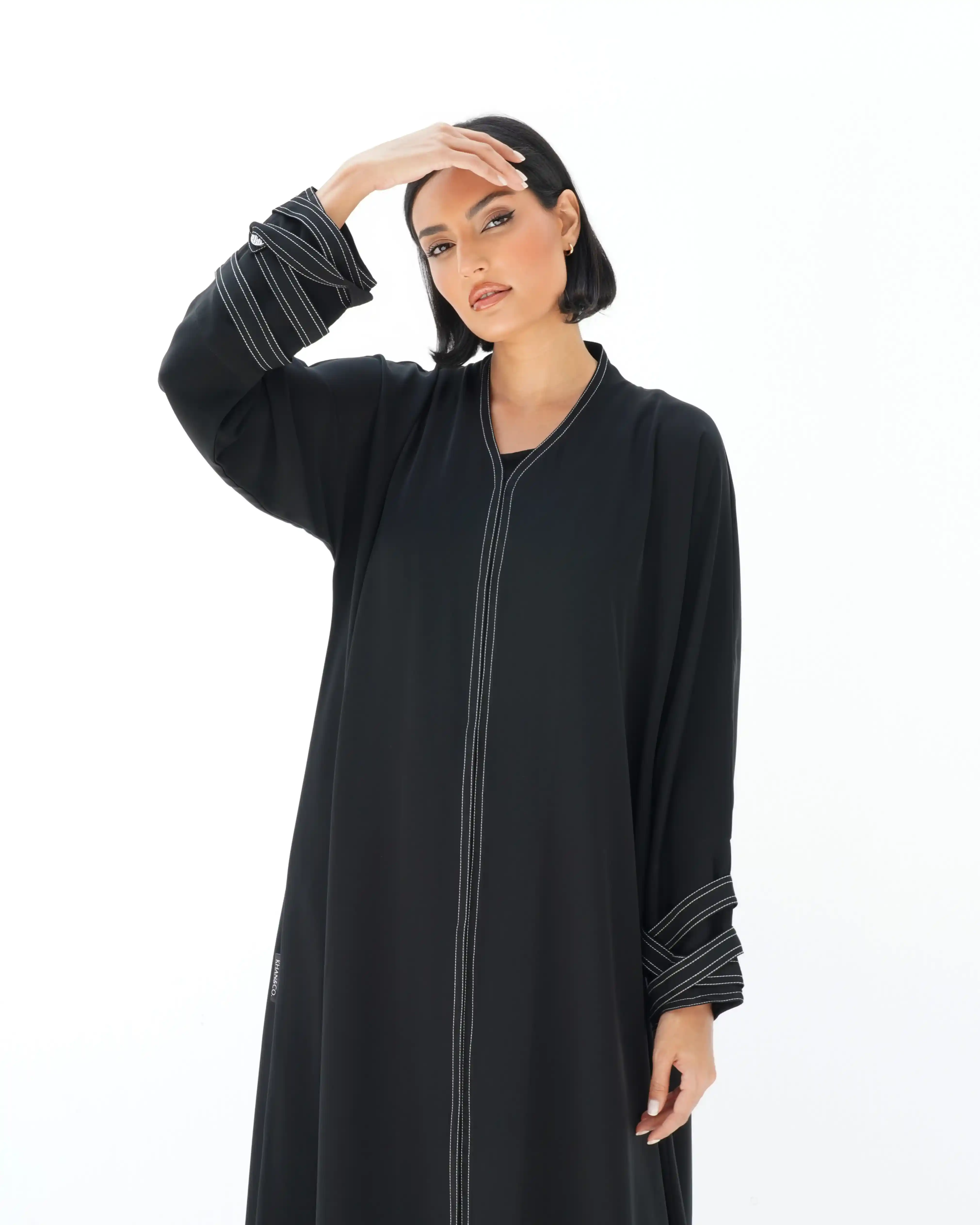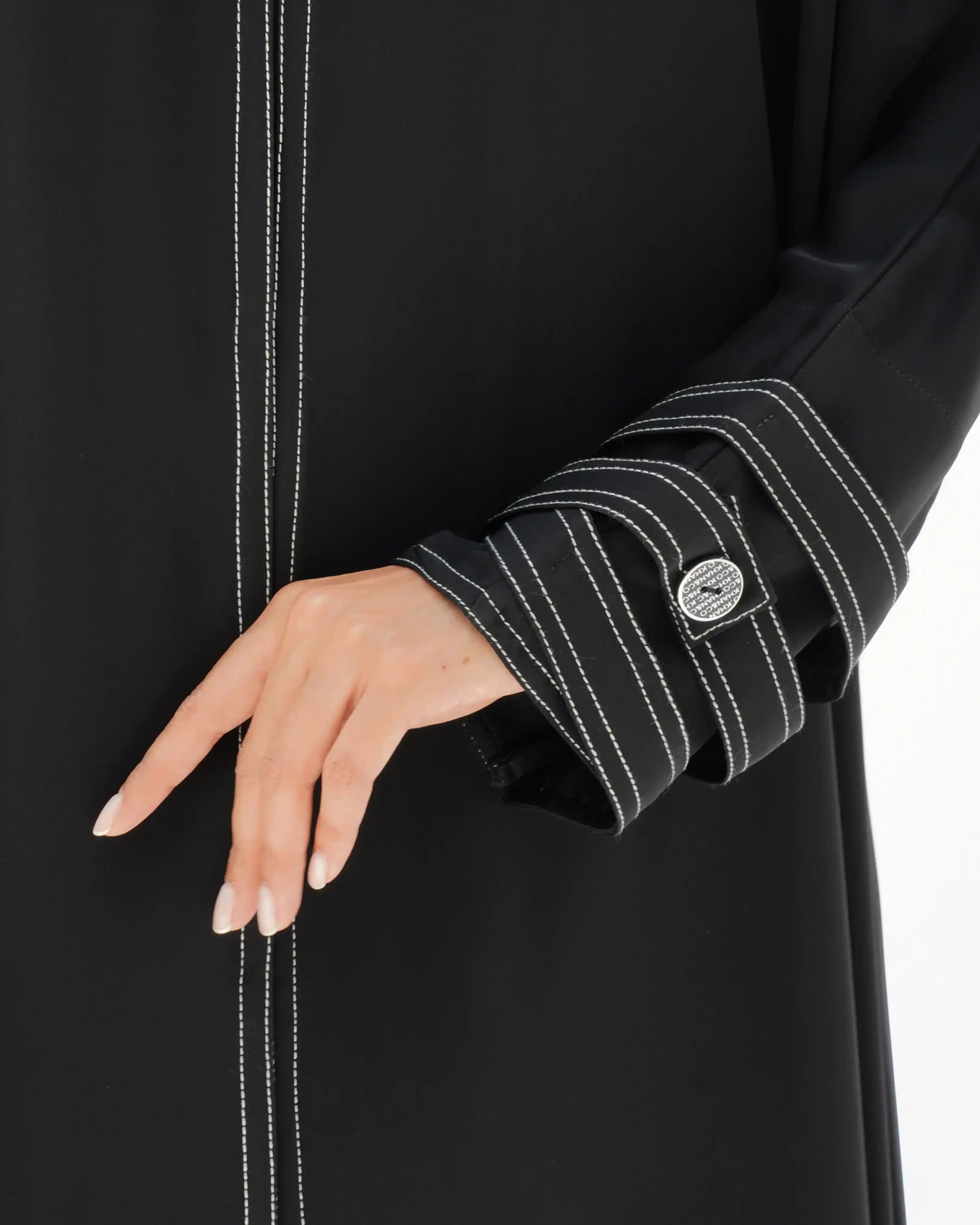 • لون اسود كامل العباية بخياطة ظاهرة في شرائط الاكمام باللون الرمادي