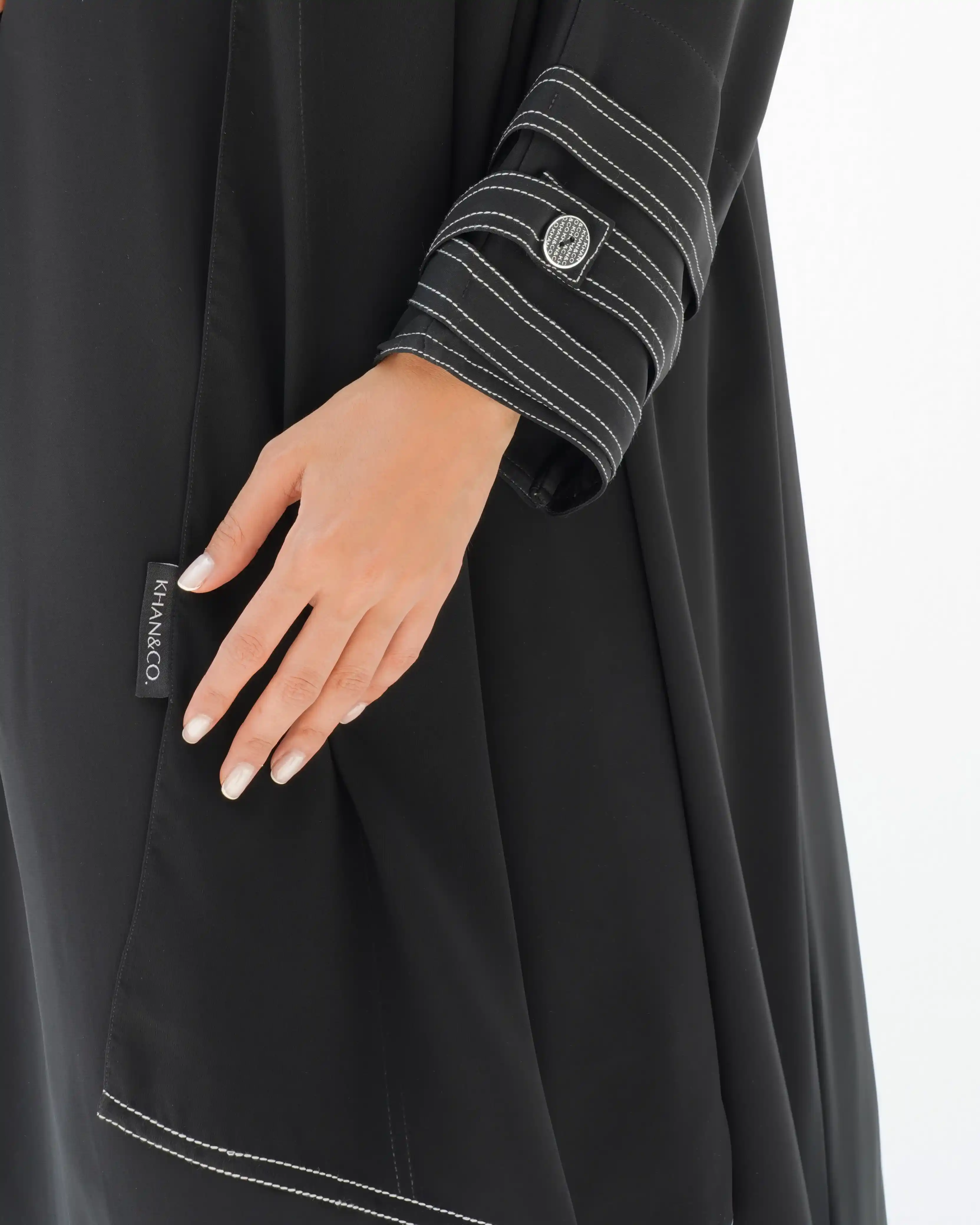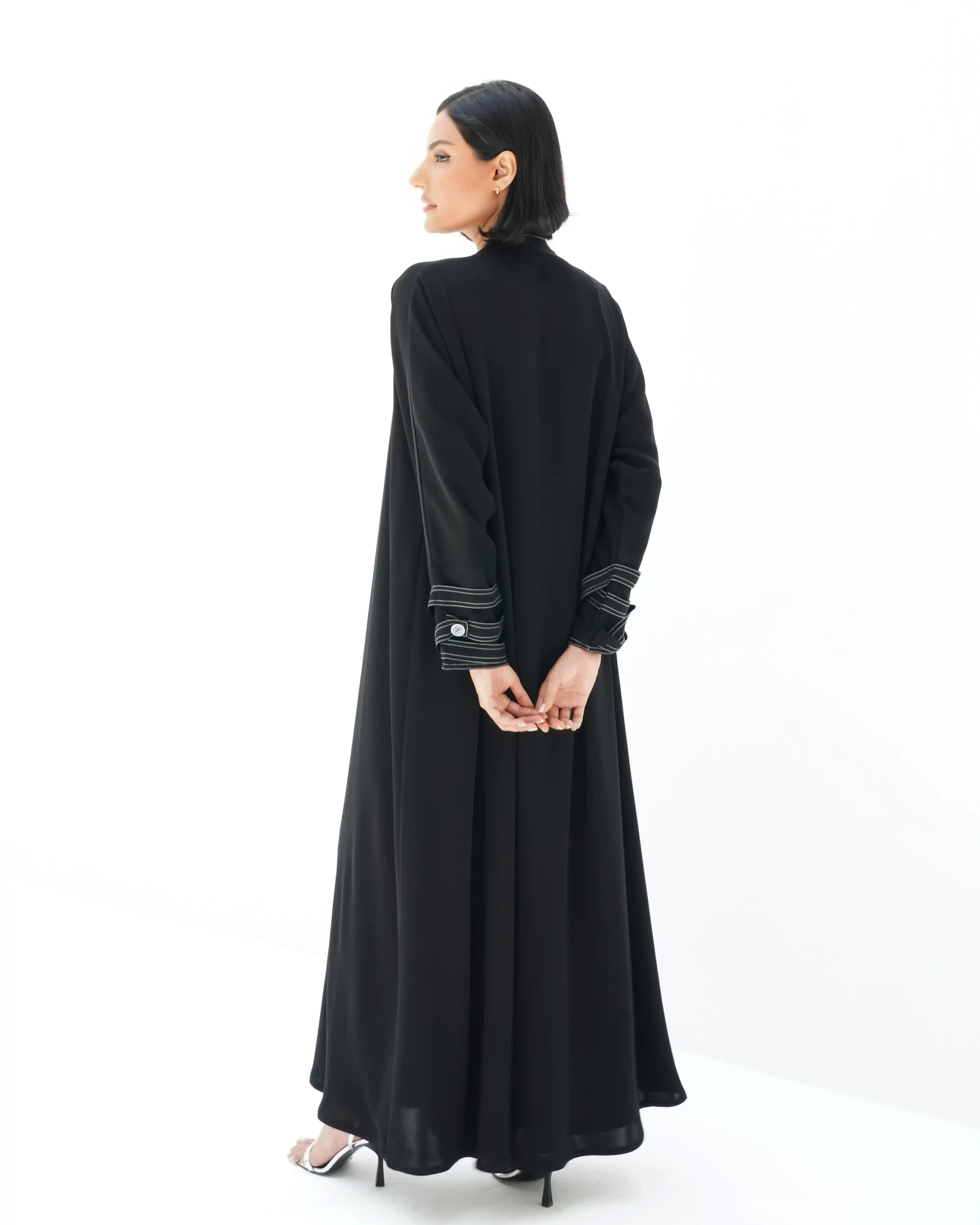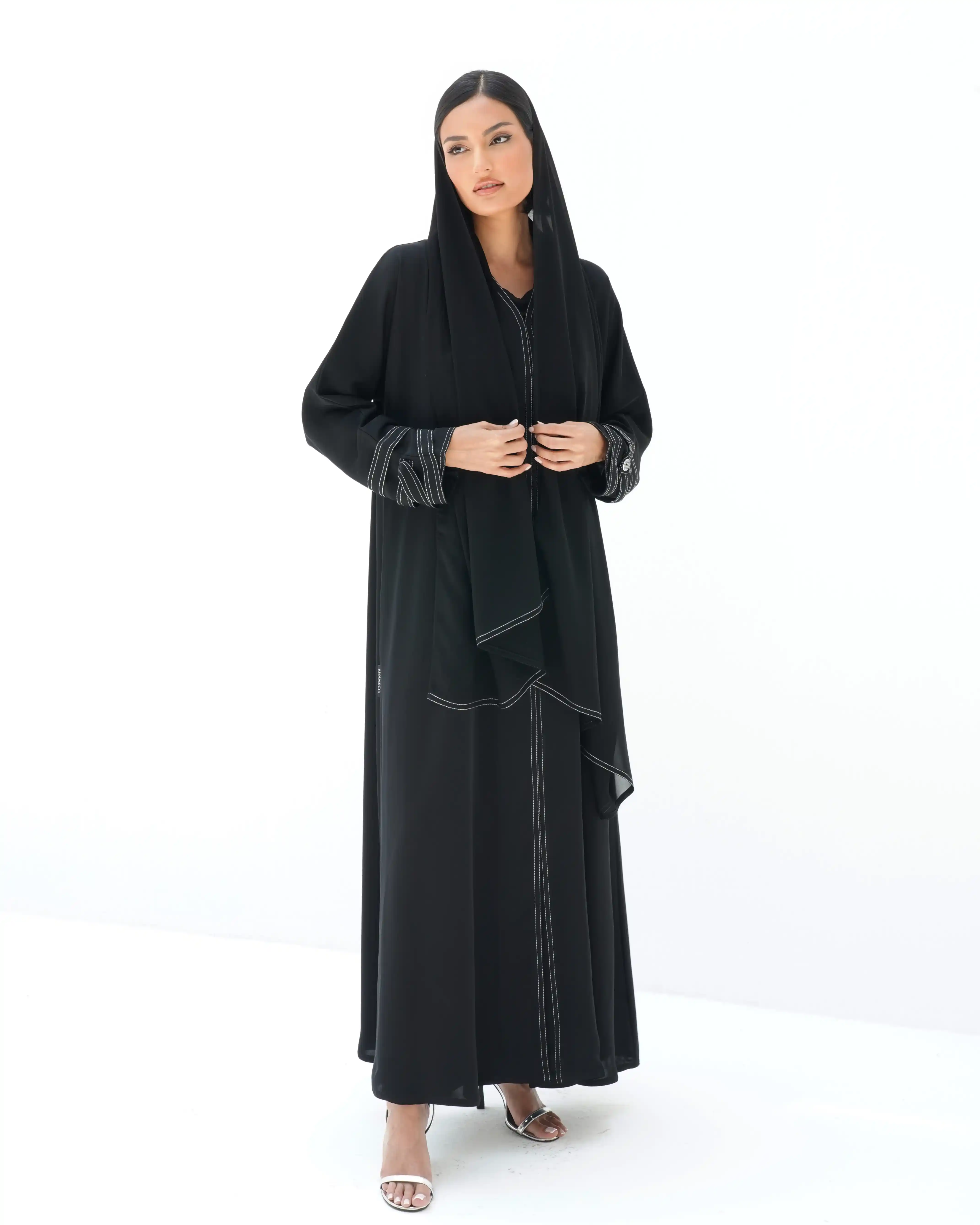 • لون اسود كامل العباية بخياطة ظاهرة في شرائط الاكمام باللون الرمادي