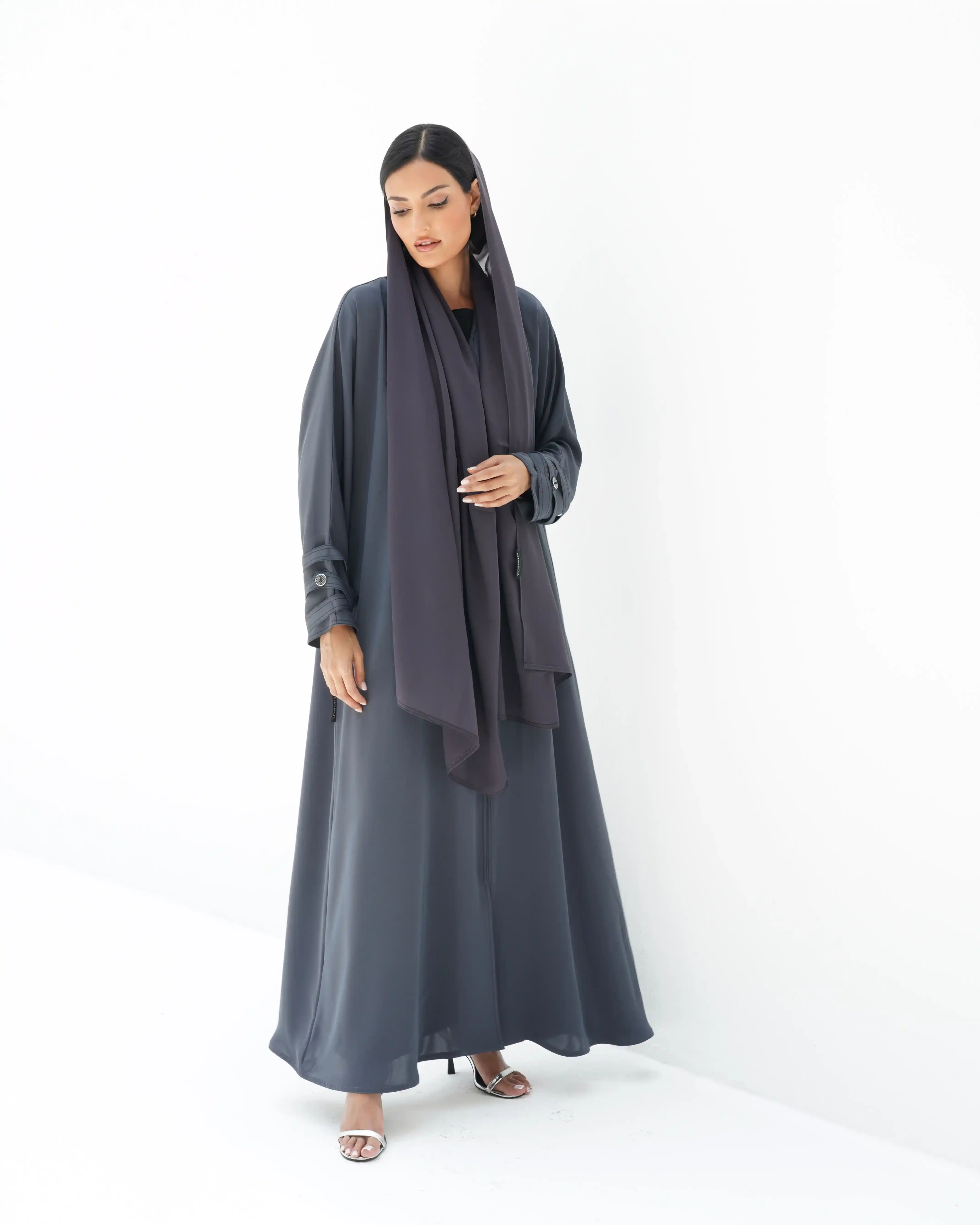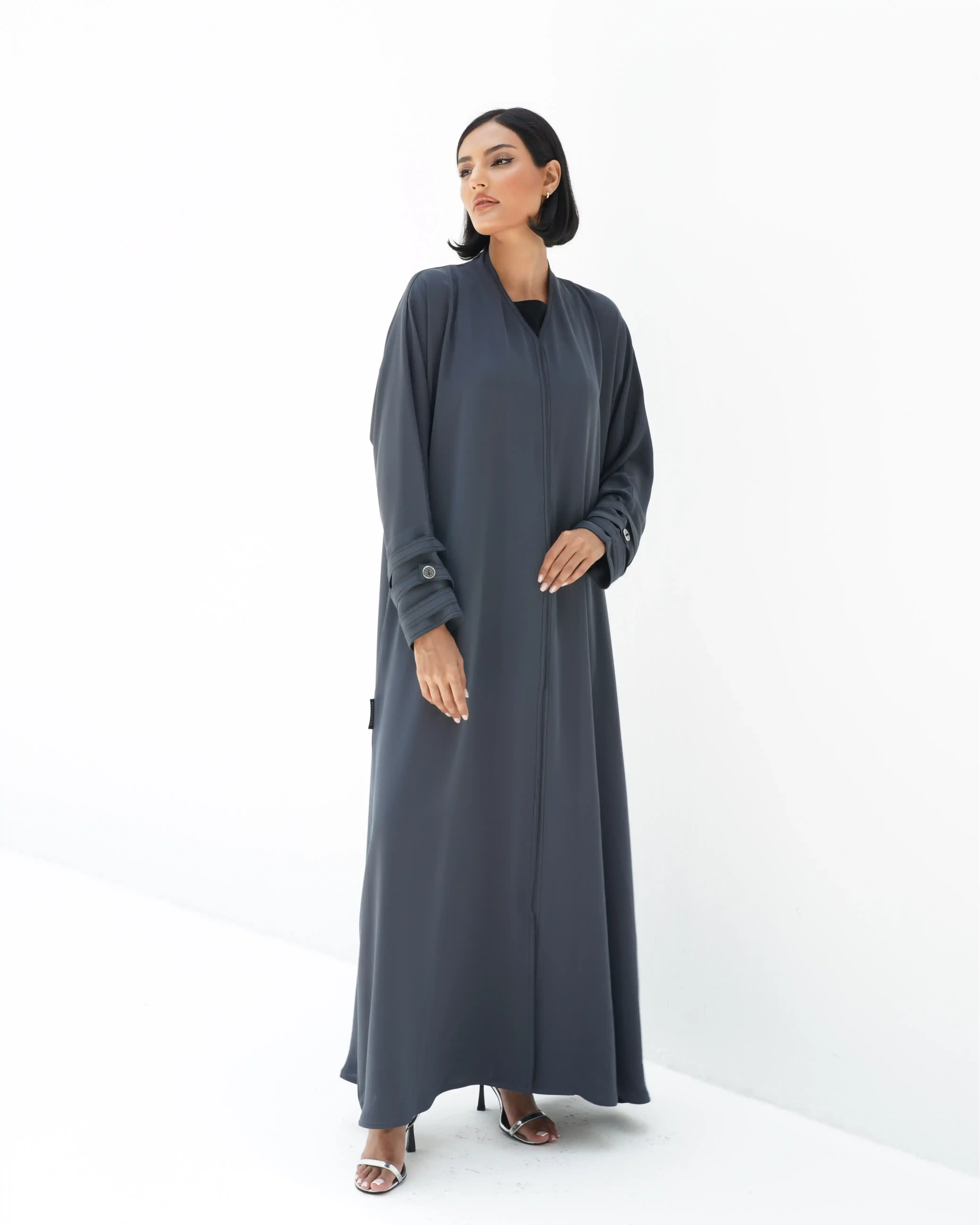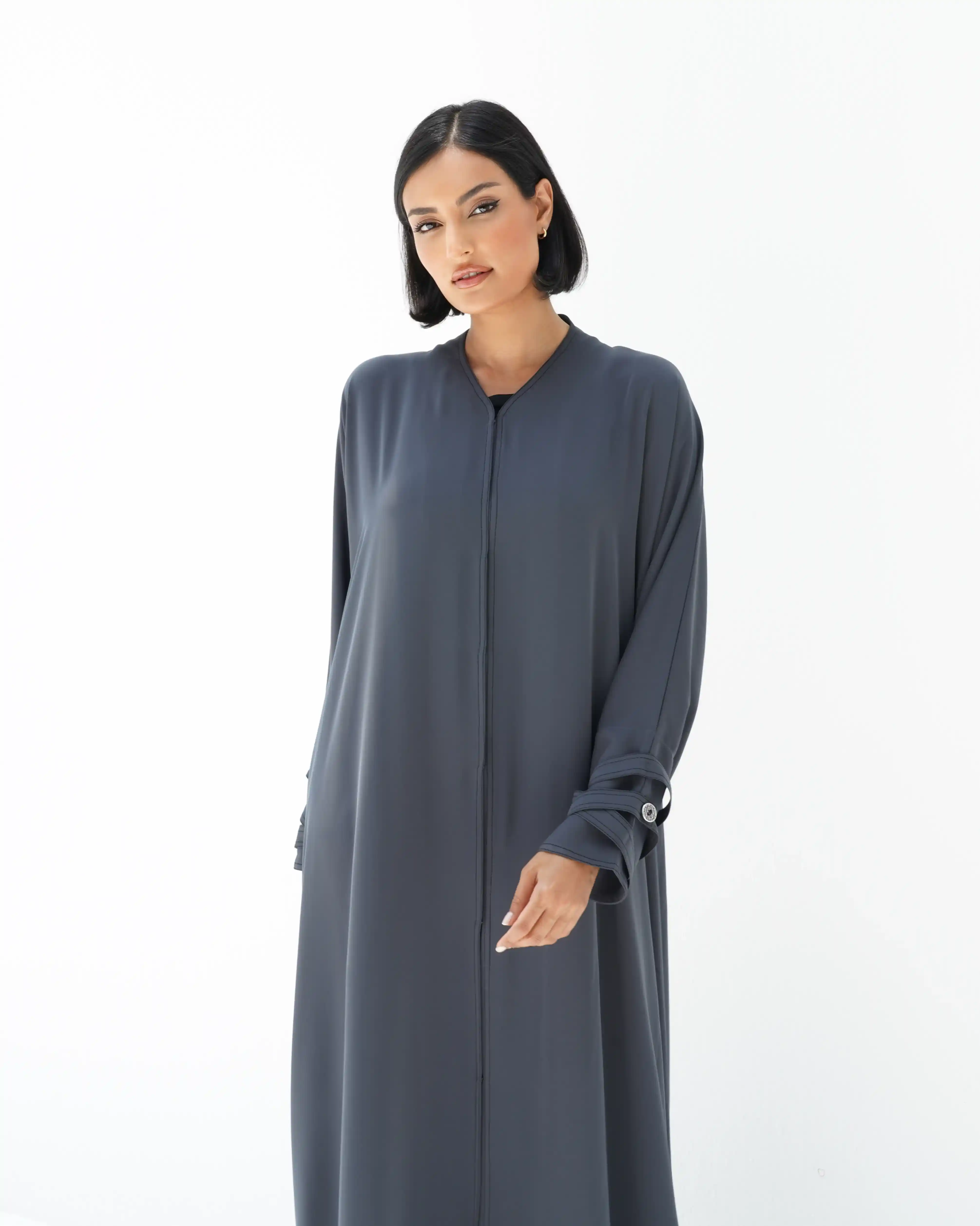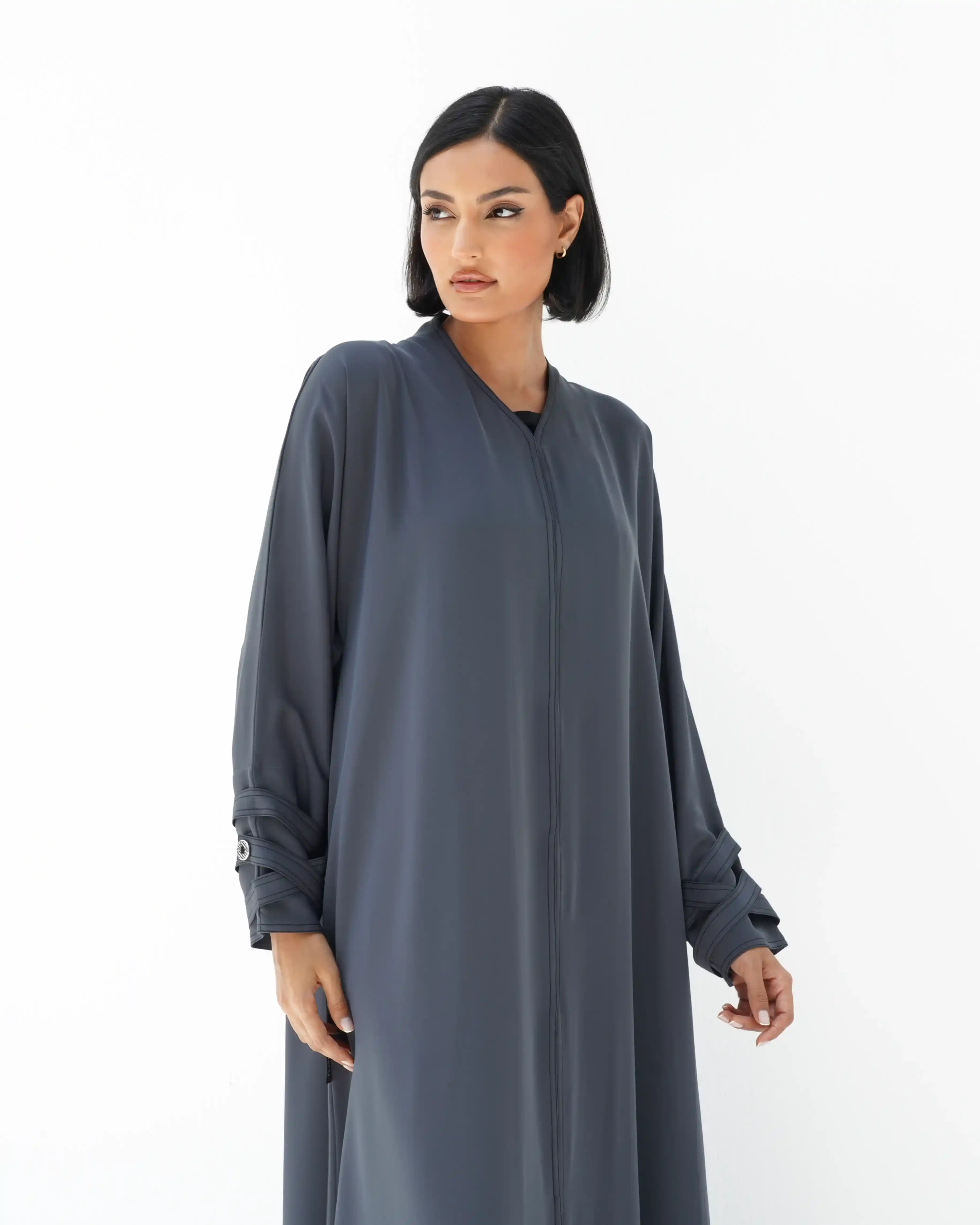 • لون رمادي داكن كامل العباية بخياطة ظاهرة في شرائط الاكمام باللون اسود.