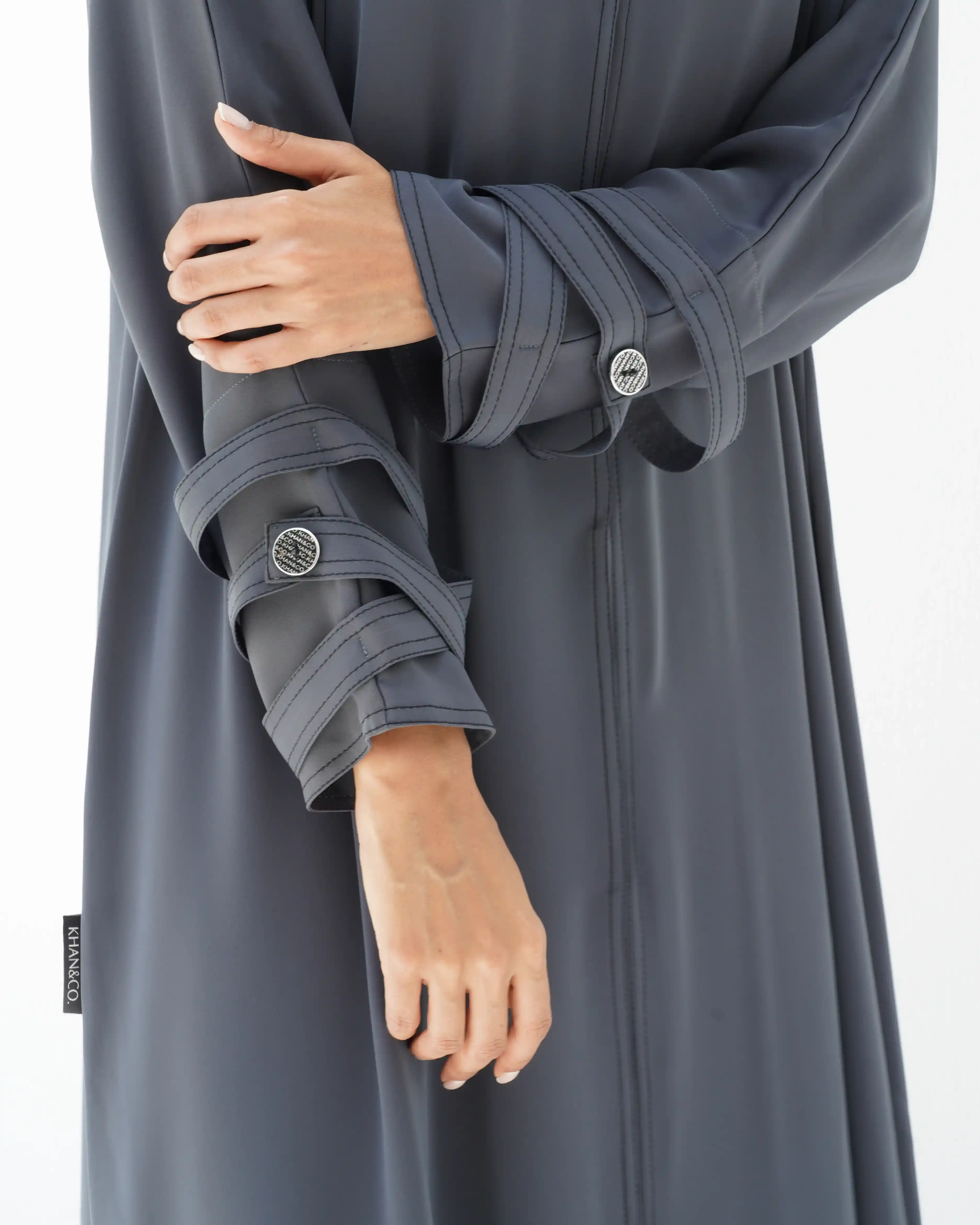 هذه العباية تمثّل انعكاسًا لروح امرأة عصرية تعشق التفرّد، بفضل تصميمها البسيط مصنوعة من قماش الكريب الناعم المنسدل والخفيف الوزن الذي جاء ليعطي كامل القطعة لمسة نعومة. يتميز التصميم بأناقة بدون عناء ويبعث على الهدوء، بينما تمنح الأكمام المزينة بالأشرطة وأزرار بعلامة .KHAN&CO الأيقونية المخصصة طابعًا استثنائيًا. تصميم يعبّر عن التوازن ما بين الأناقة الفائقة والبساطة المطلوبة سواء كنت محجبة او منقبة.
