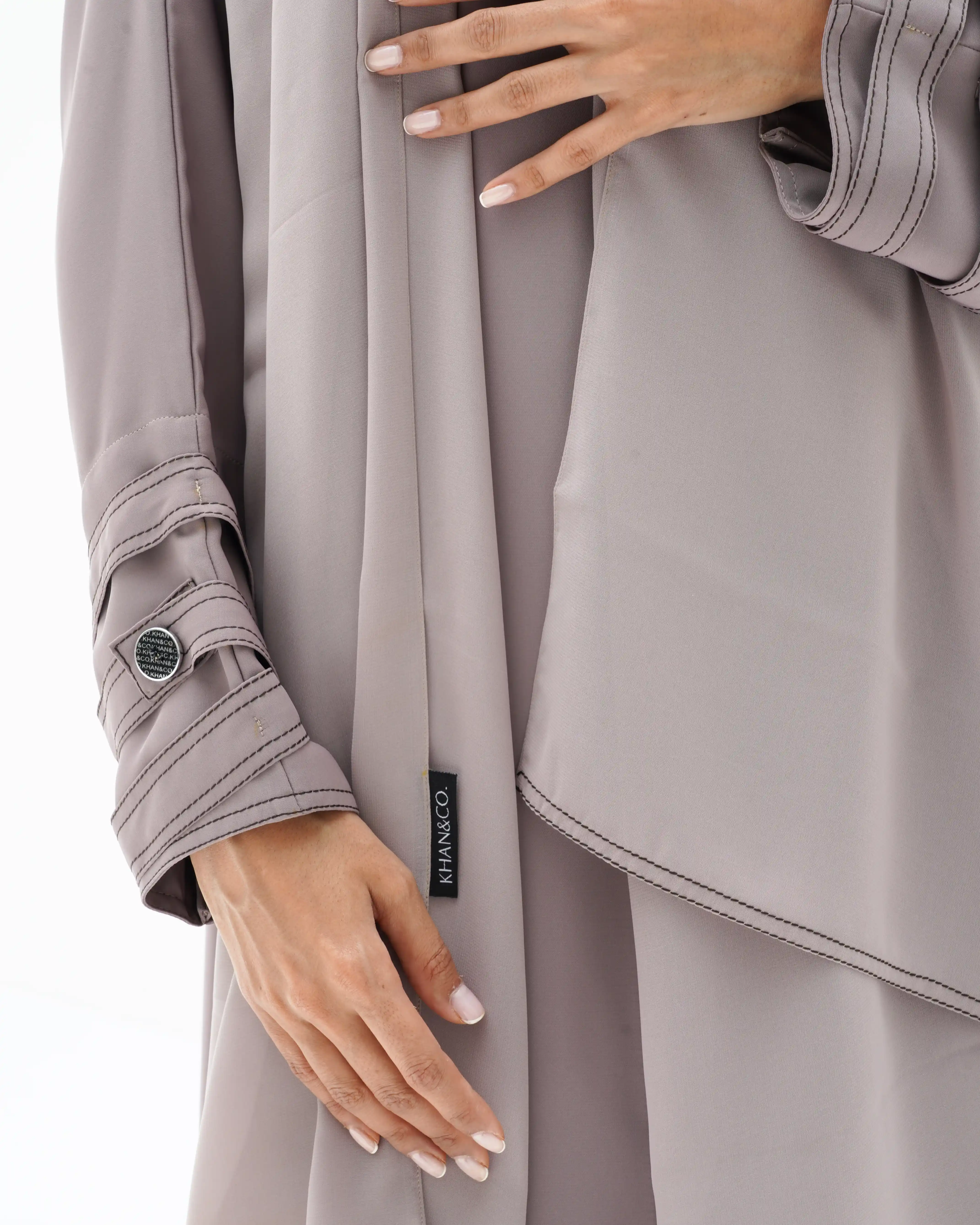 هذه العباية تمثّل انعكاسًا لروح امرأة عصرية تعشق التفرّد، بفضل تصميمها البسيط مصنوعة من قماش الكريب الناعم المنسدل والخفيف الوزن الذي جاء ليعطي كامل القطعة لمسة نعومة. يتميز التصميم بأناقة بدون عناء ويبعث على الهدوء، بينما تمنح الأكمام المزينة بالأشرطة وأزرار بعلامة .KHAN&CO الأيقونية المخصصة طابعًا استثنائيًا. تصميم يعبّر عن التوازن ما بين الأناقة الفائقة والبساطة المطلوبة سواء كنت محجبة او منقبة.