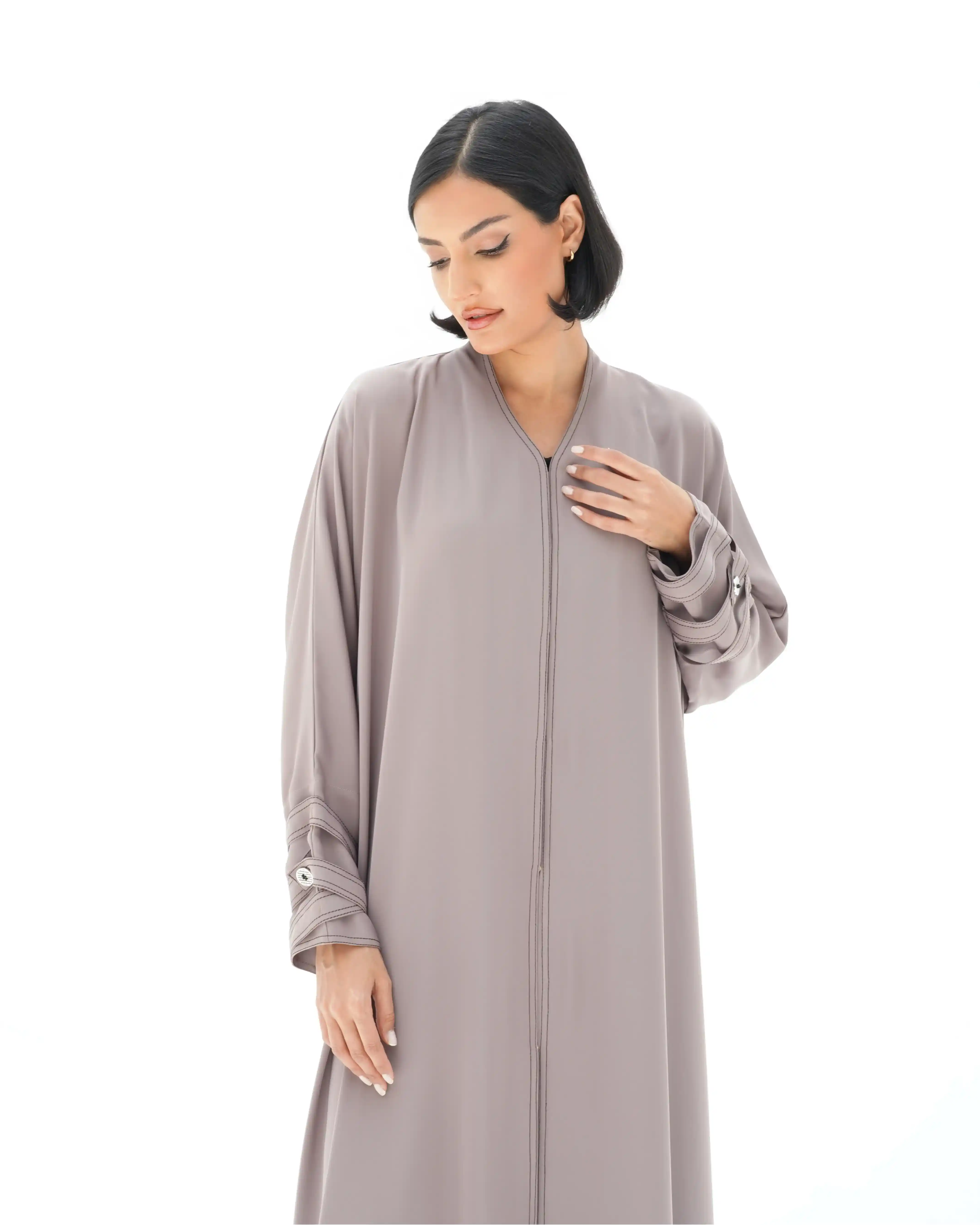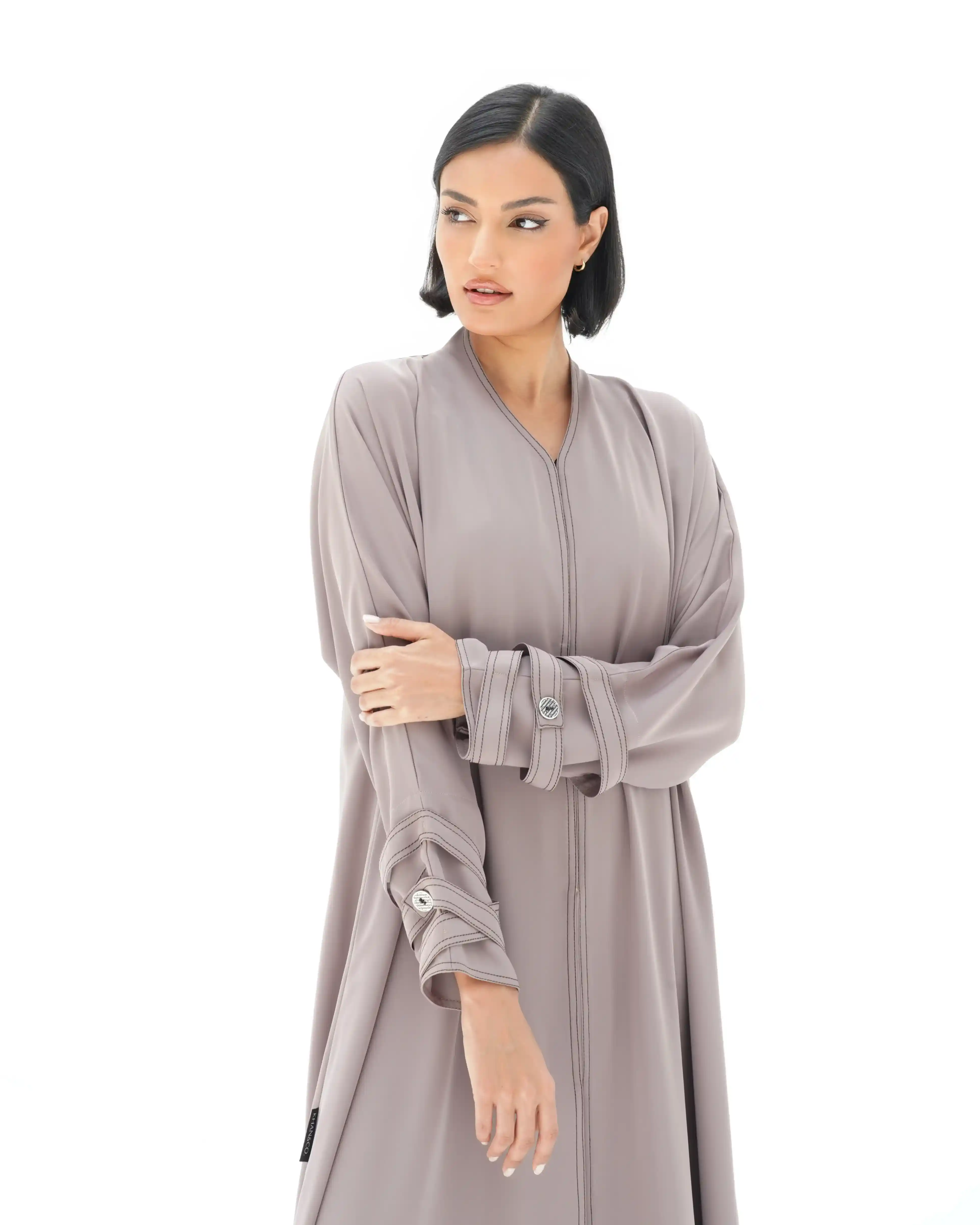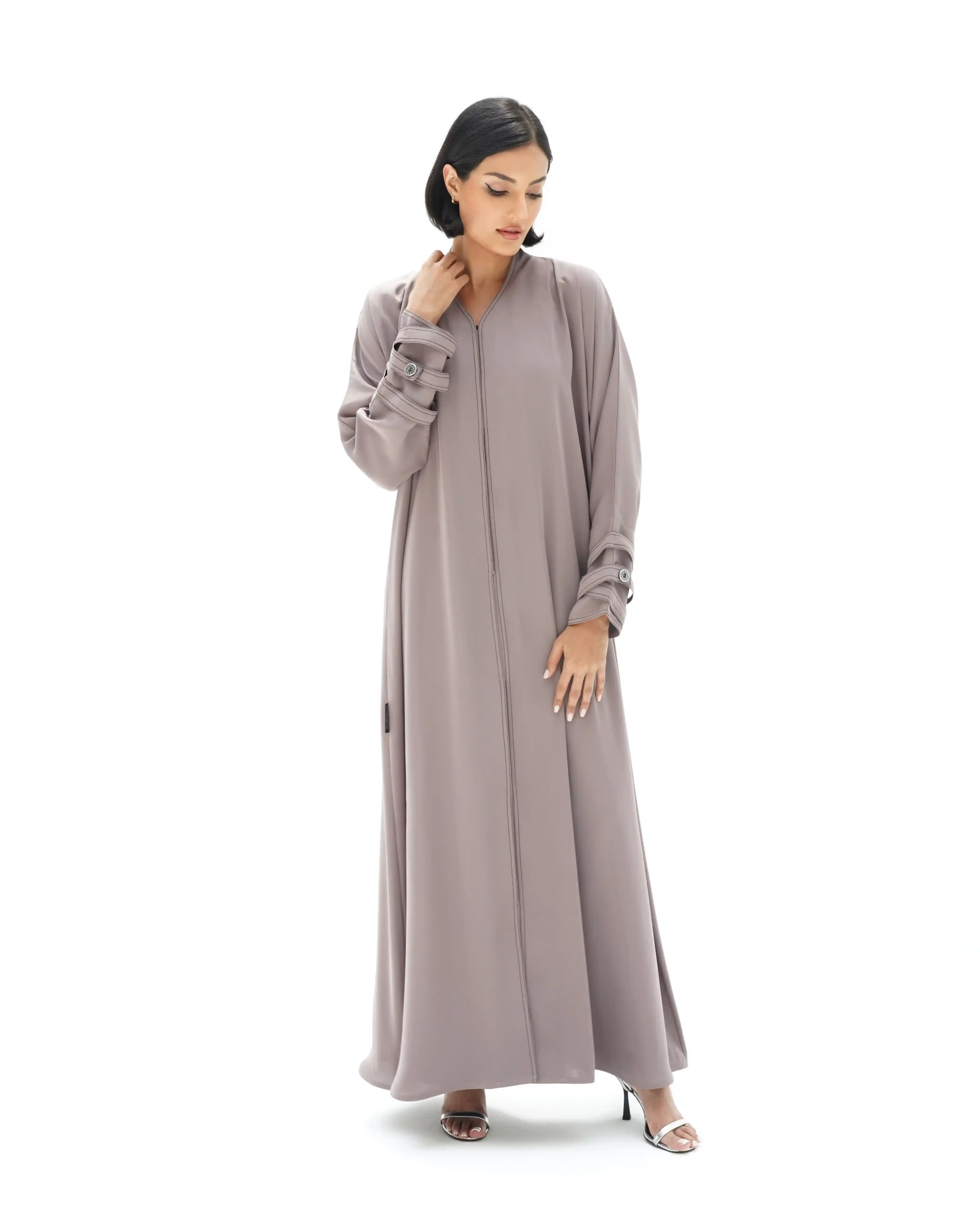 • لون نيود براون كامل العباية بخياطة ظاهرة في شرائط الاكمام باللون البني.
