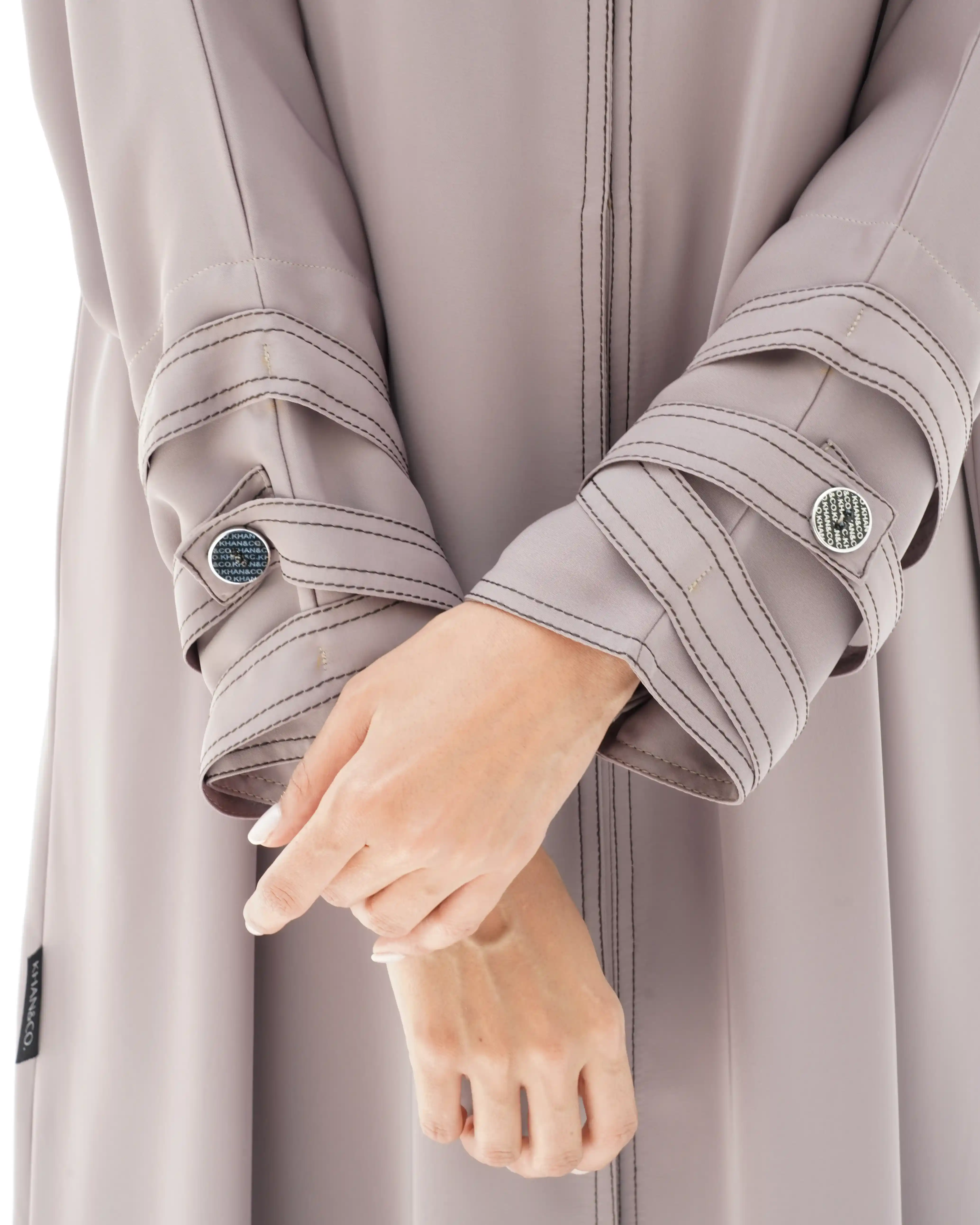 • الأكمام: مزينة بثلاثة أشرطة متتالية، كل شريط مزود بزر معدني دائري يحمل شعار KHAN&CO.، مع تحديد بخياطة بلون البني بارزة.