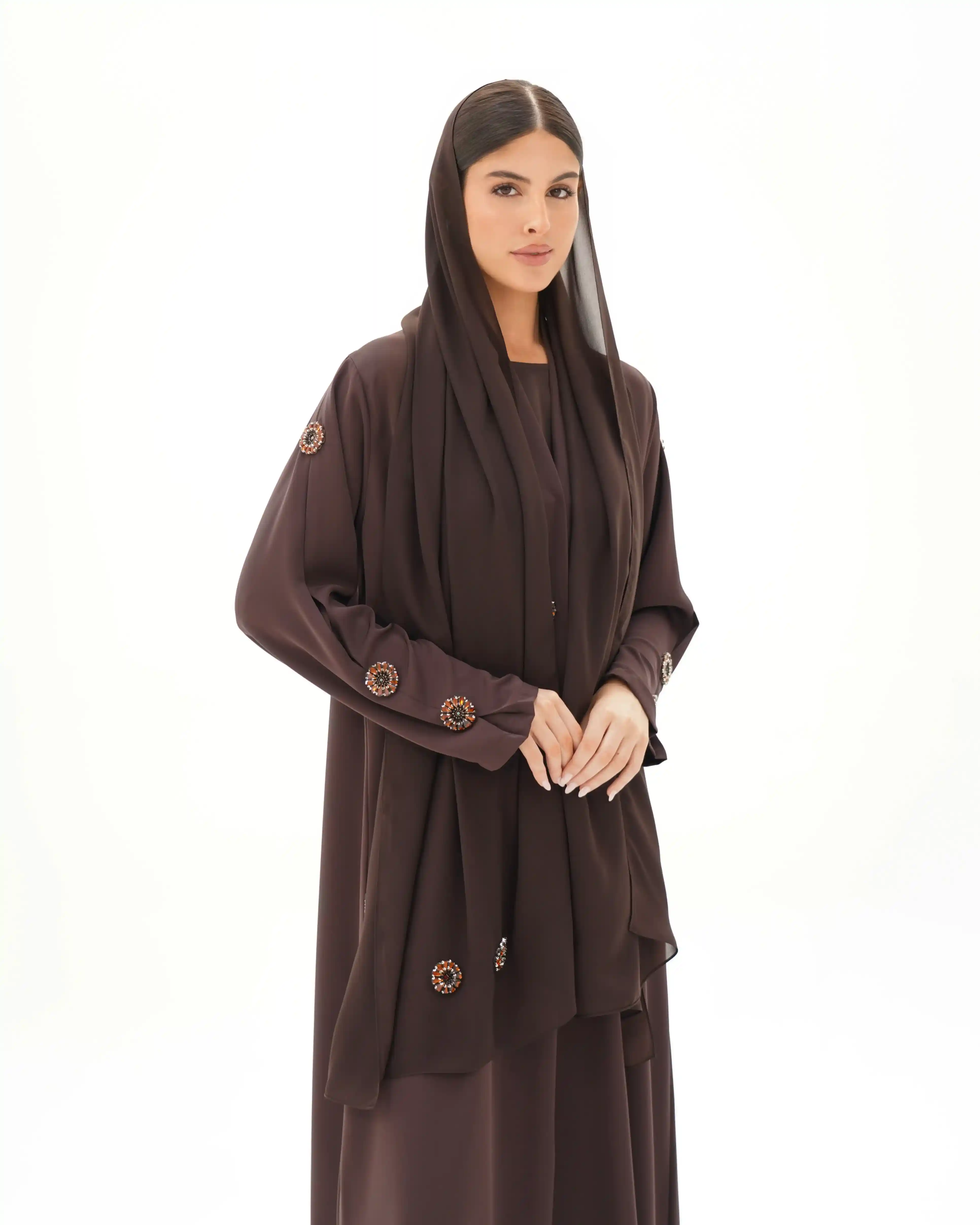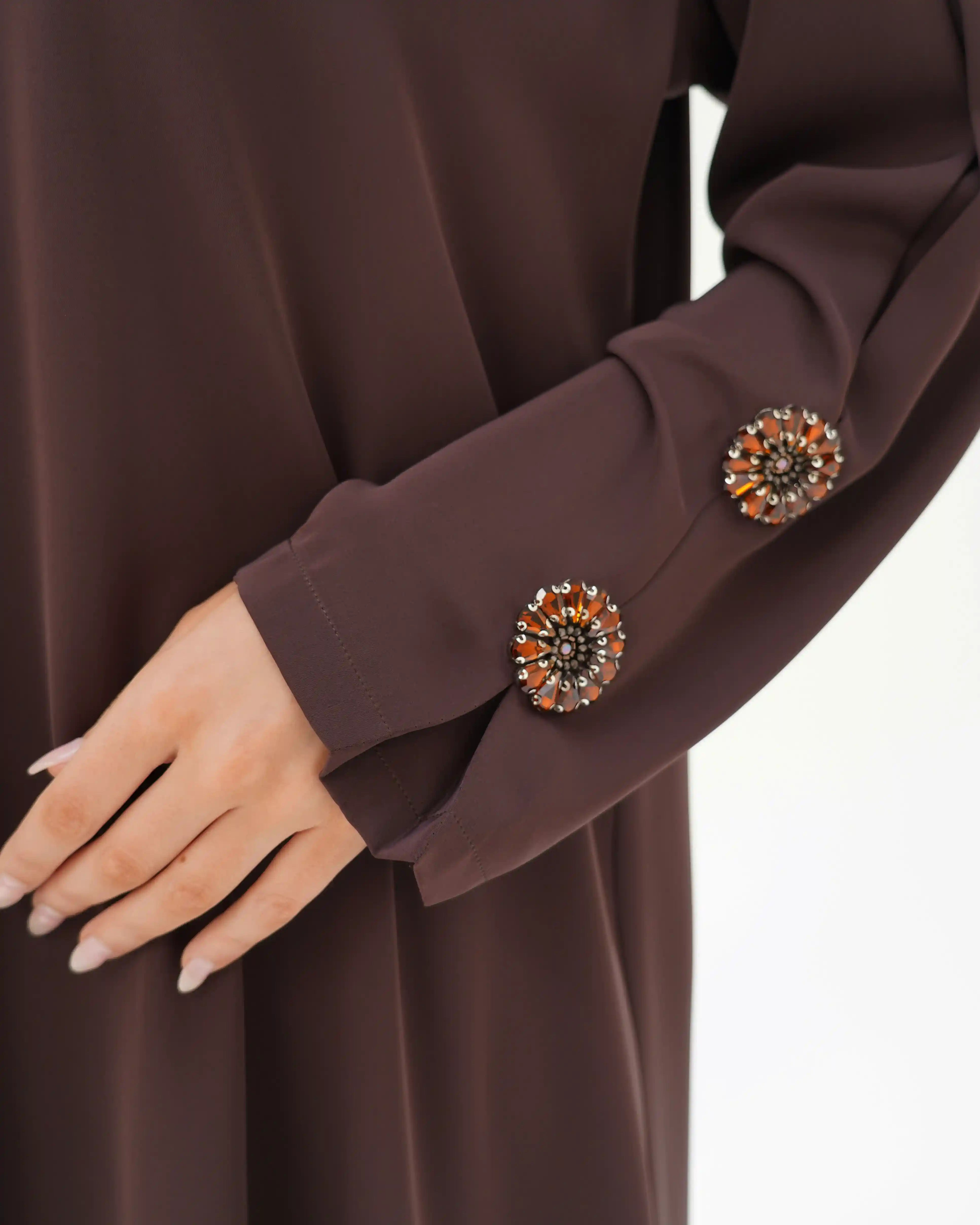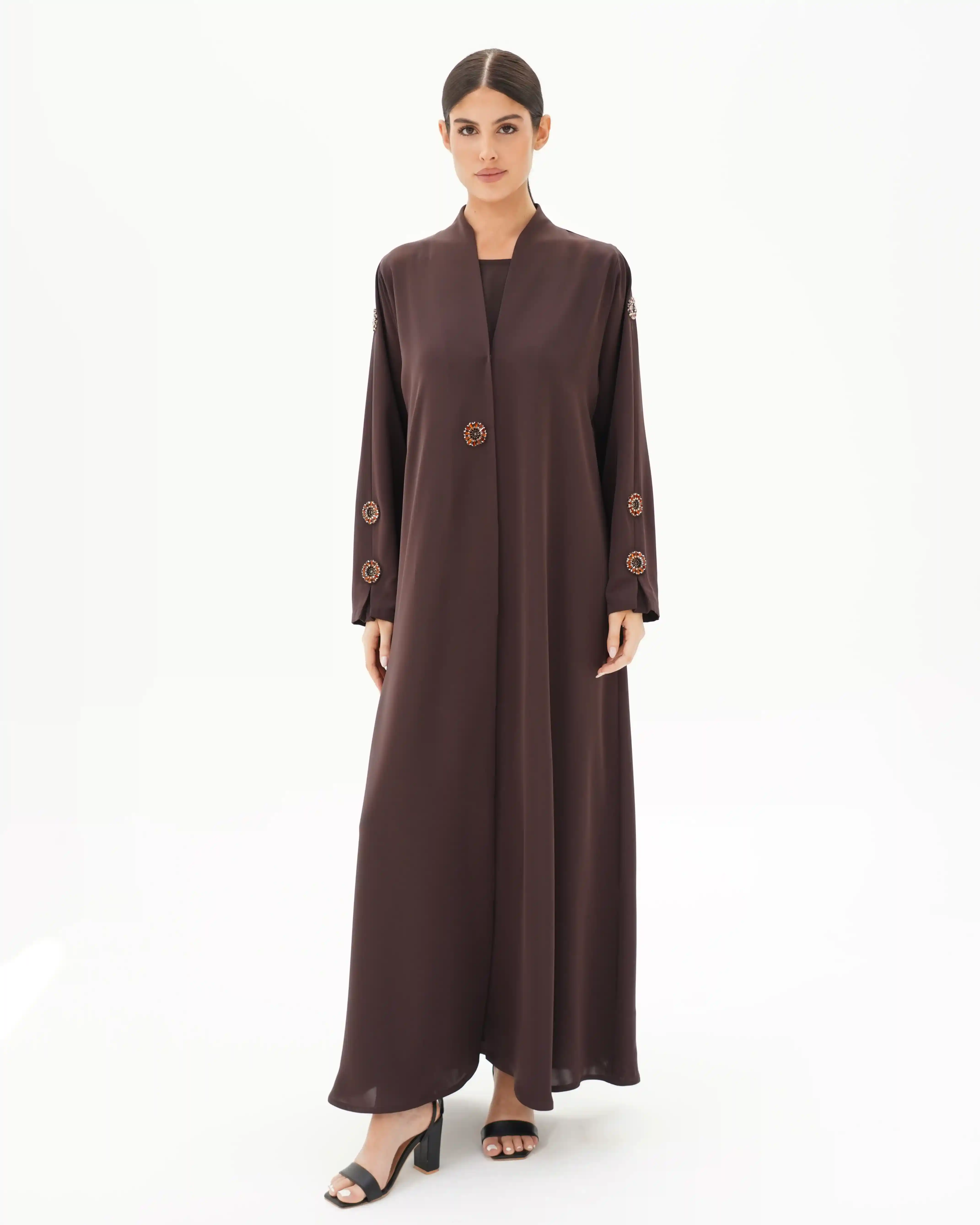 تصميم العباية يرتكز على البساطة الفاخرة بخطوط انسيابية وتفاصيل معدنية/كريستالية تضيف قيمة بصرية راقية دون مبالغة. صُنعت من قماش بريميوم كريب الذي ينسدل بخفة ويعزز نقاء الخطوط وانسيابية القَصّة. الأكمام تأتي بخط مستقيم ناعم يتزيّن بكريستالات دائرية موزعة بدقة لتمنح توازناً بصرياً وتحوّلها إلى عنصر جمالي بارز. الكريستالات المعدنية الداكنة بلمعتها الراقية تشبه نجمة أو زهرة صغيرة، فتمنح التصميم لمسة أشبه بالمجوهرات وتعكس هوية واضحة للعباية. أما الياقة المستقيمة البسيطة فتضفي مظهراً أنيقاً وتوجّه التركيز نحو تفاصيل الأكمام.