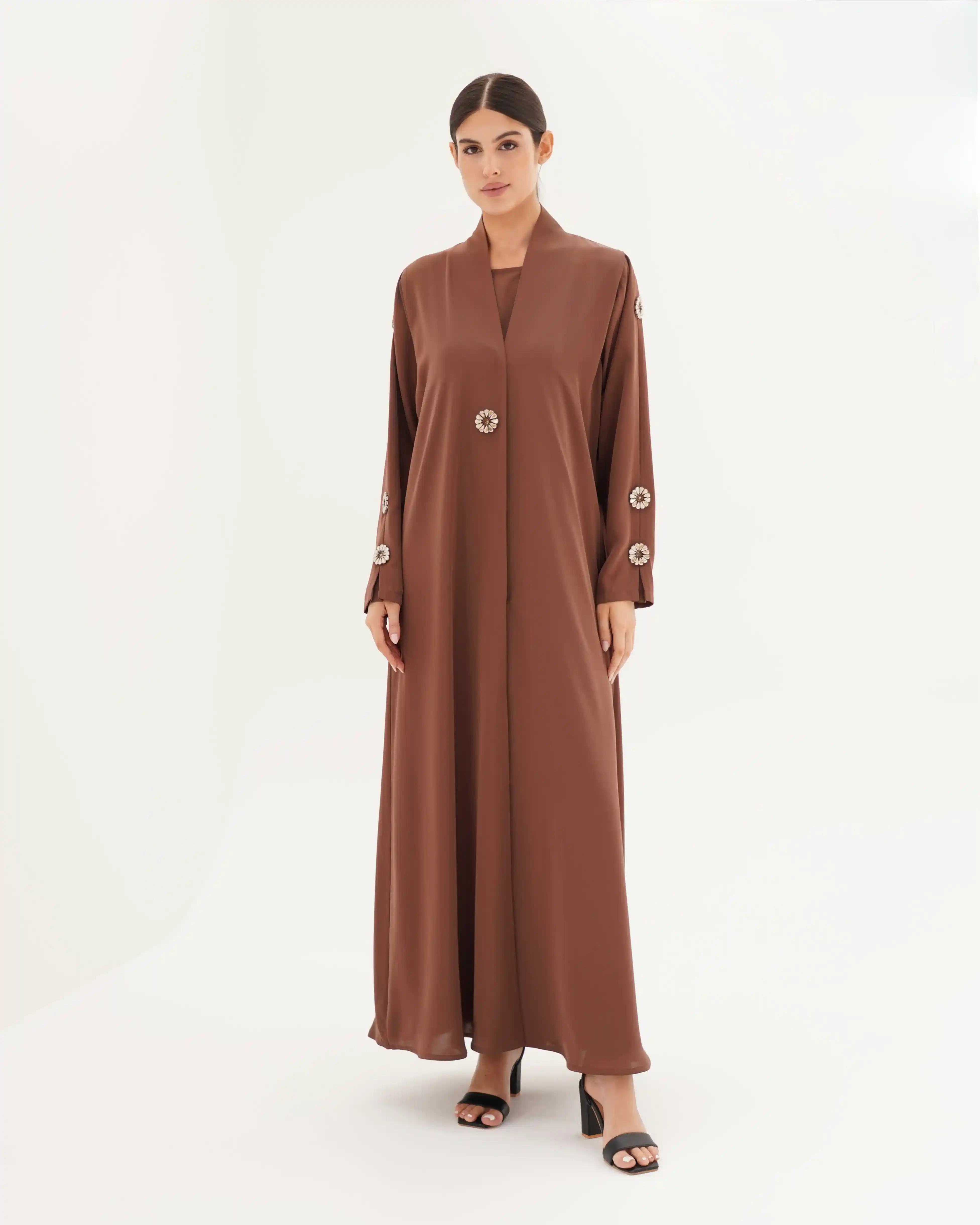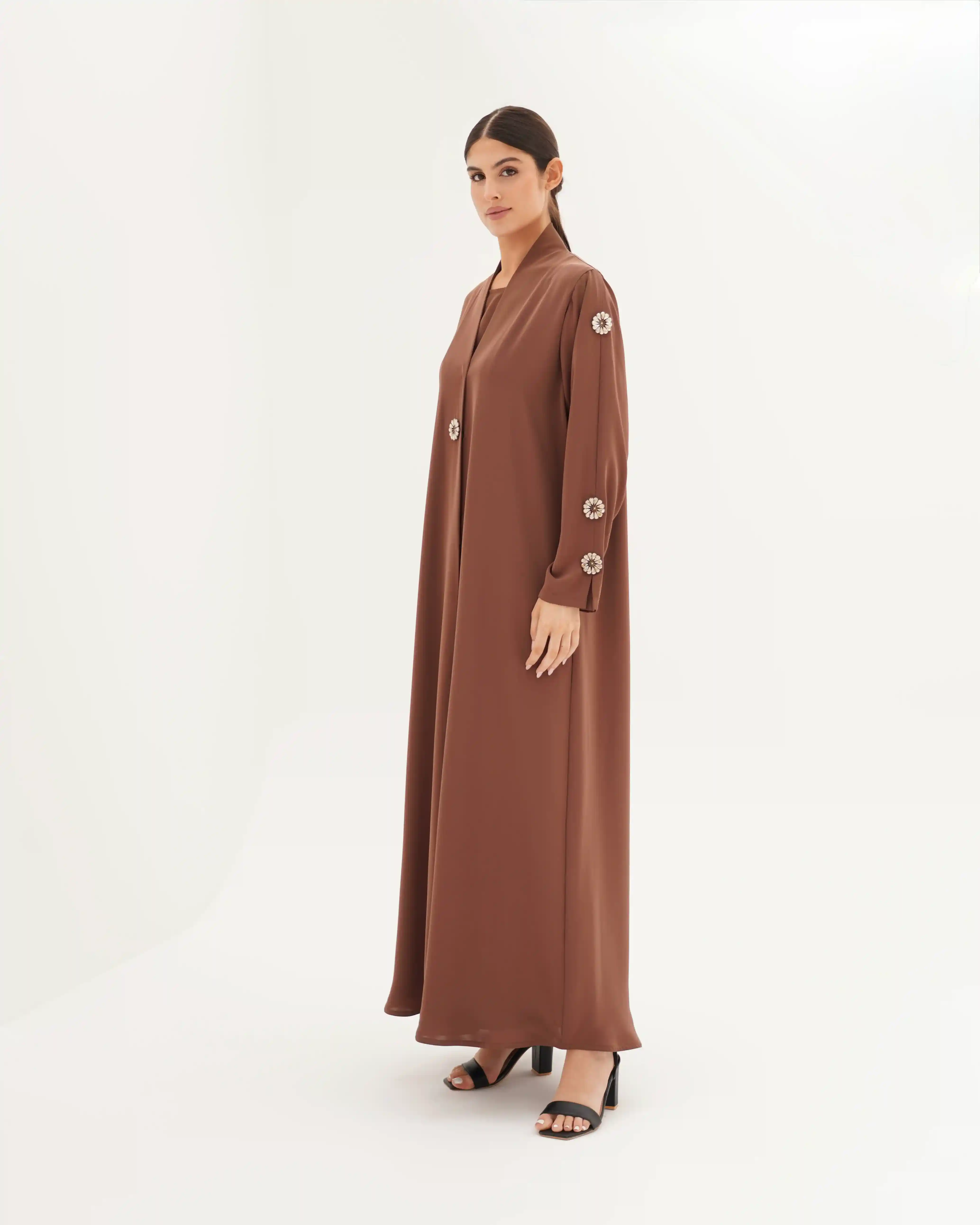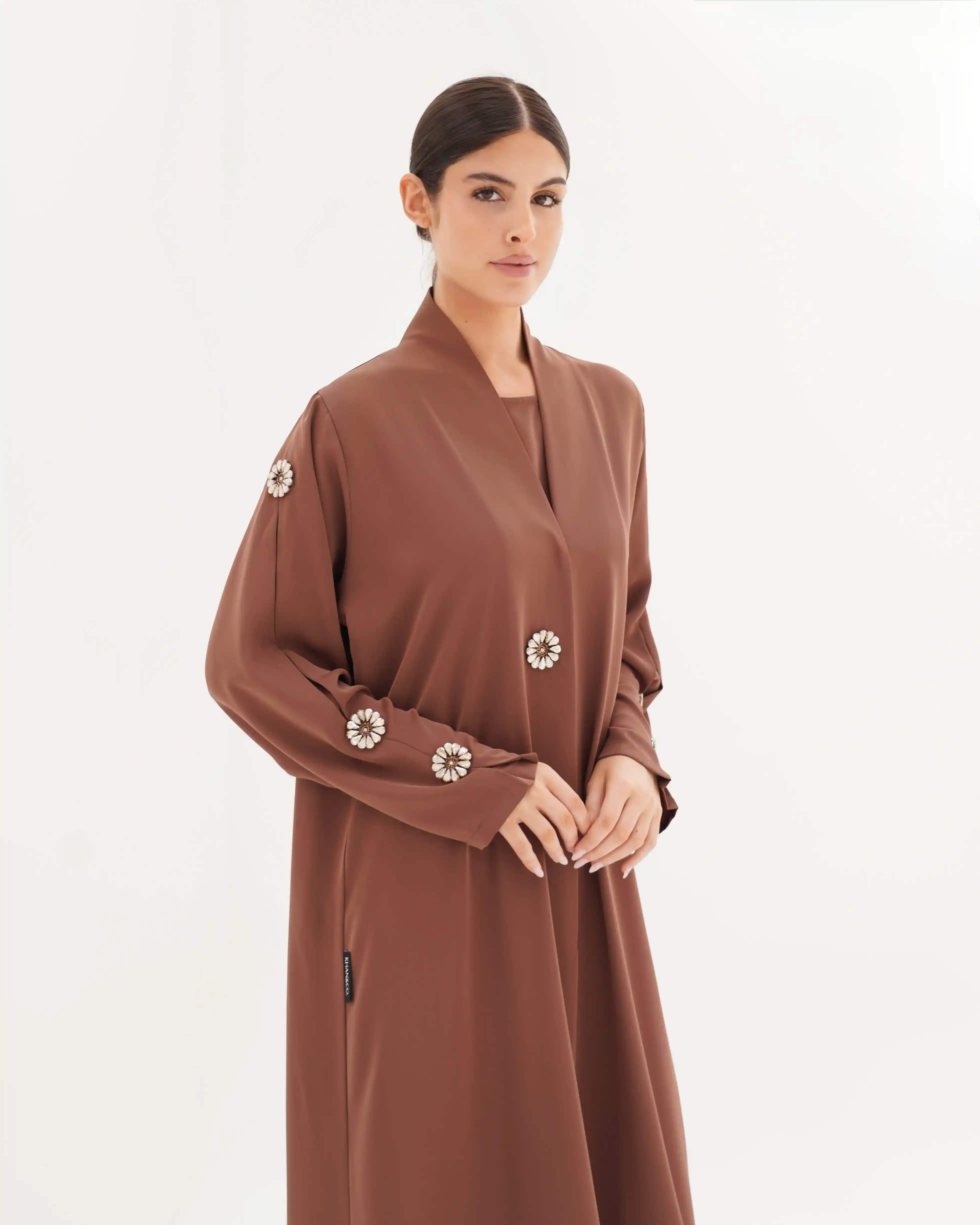 تصميم العباية يرتكز على البساطة الفاخرة بخطوط انسيابية وتفاصيل معدنية/كريستالية تضيف قيمة بصرية راقية دون مبالغة. صُنعت من قماش بريميوم كريب الذي ينسدل بخفة ويعزز نقاء الخطوط وانسيابية القَصّة. الأكمام تأتي بخط مستقيم ناعم يتزيّن بكريستالات دائرية موزعة بدقة لتمنح توازناً بصرياً وتحوّلها إلى عنصر جمالي بارز. الكريستالات المعدنية الداكنة بلمعتها الراقية تشبه نجمة أو زهرة صغيرة، فتمنح التصميم لمسة أشبه بالمجوهرات وتعكس هوية واضحة للعباية. أما الياقة المستقيمة البسيطة فتضفي مظهراً أنيقاً وتوجّه التركيز نحو تفاصيل الأكمام.