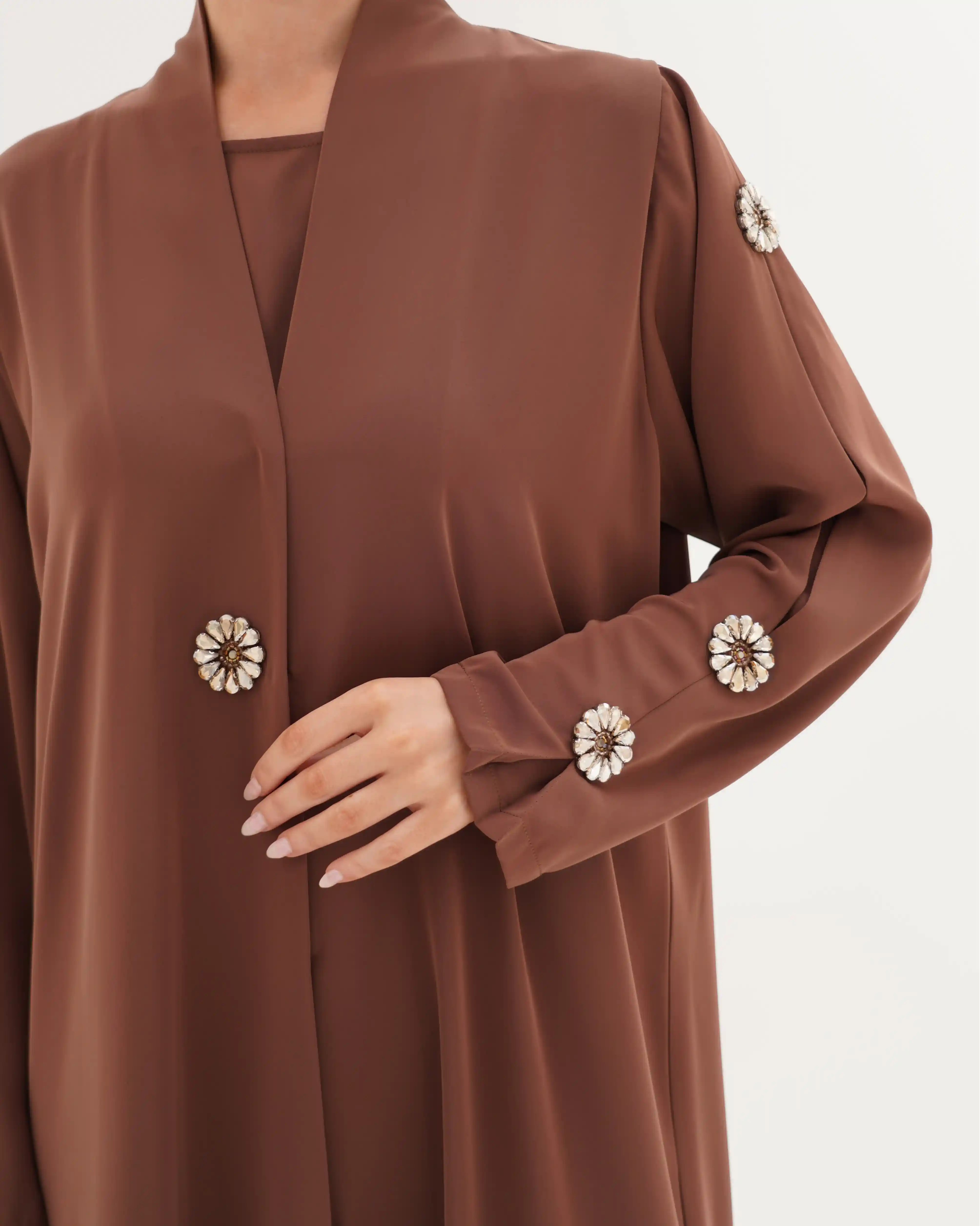 • الأكمام مزينة بكرستال معدني دائري بتصميم زهري أنيق، باللون كراميل موزع بتناسق على الأكمام والصدر.