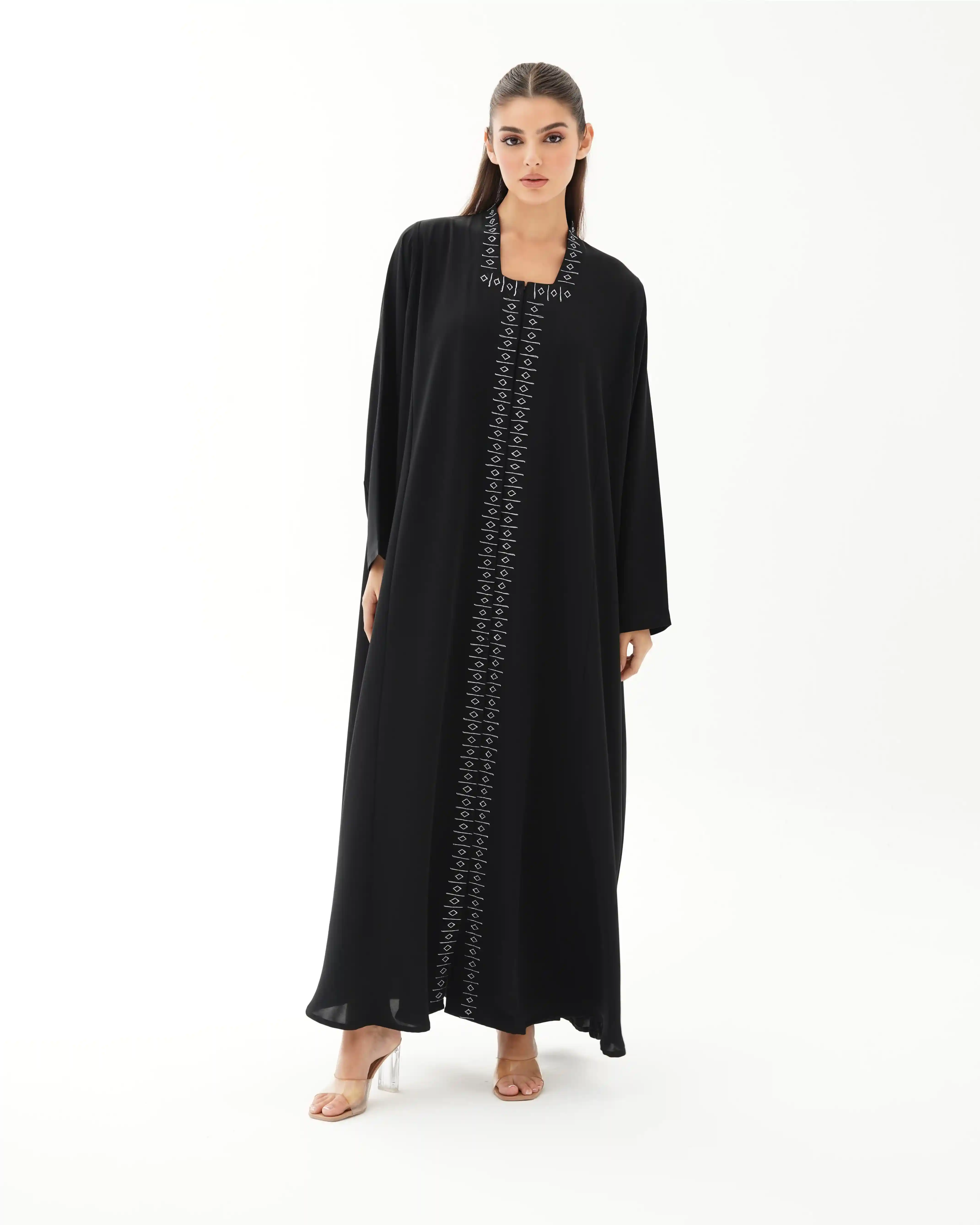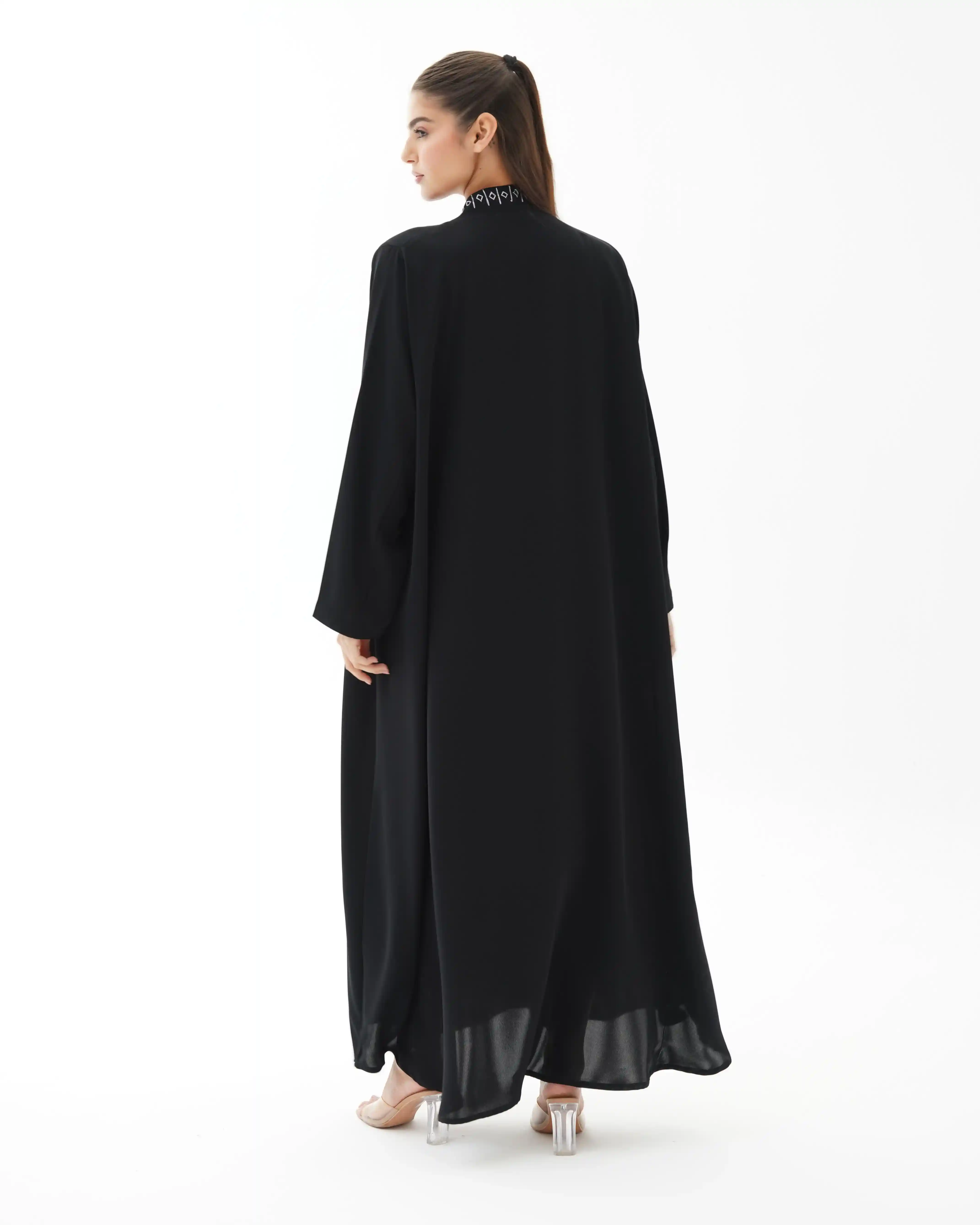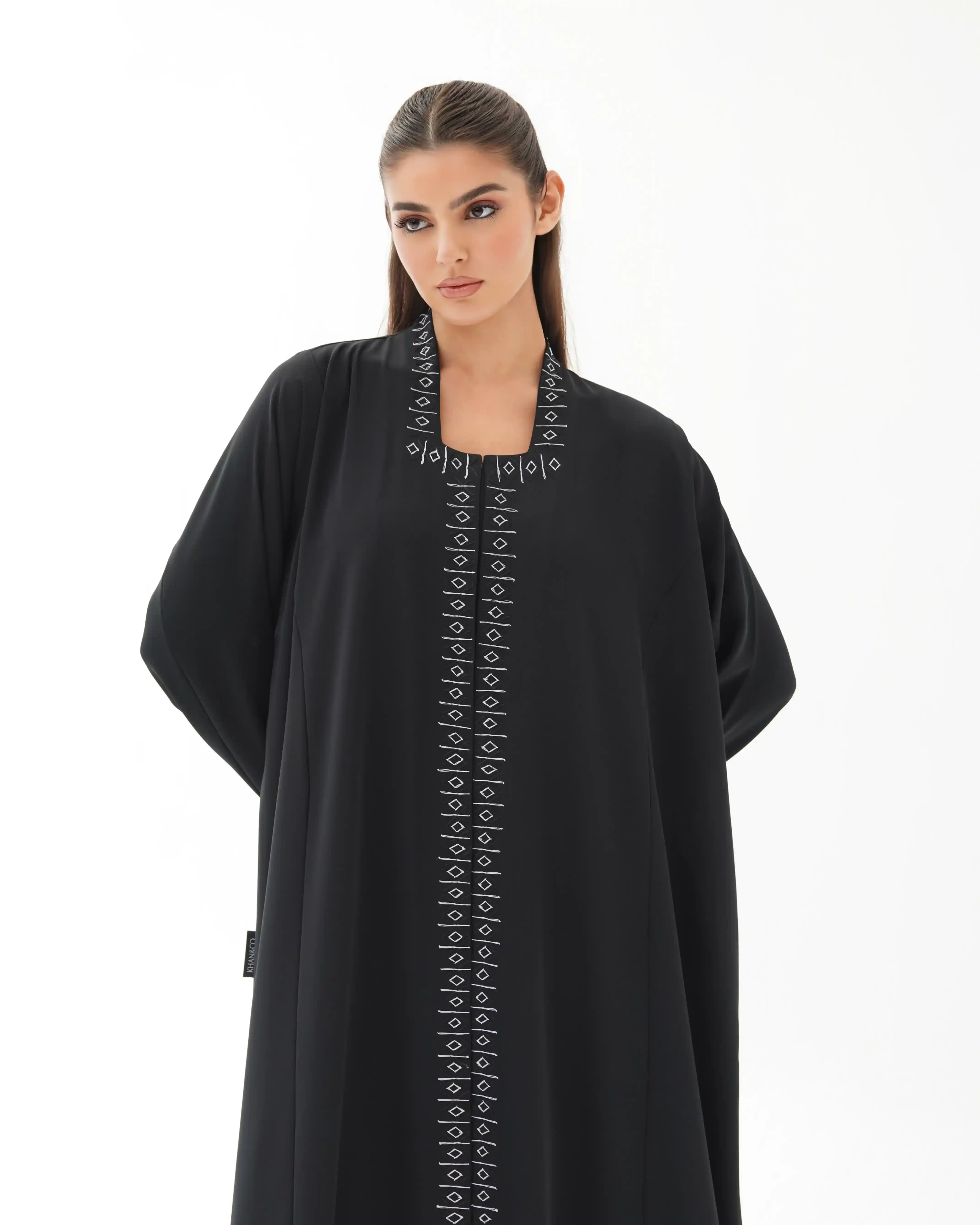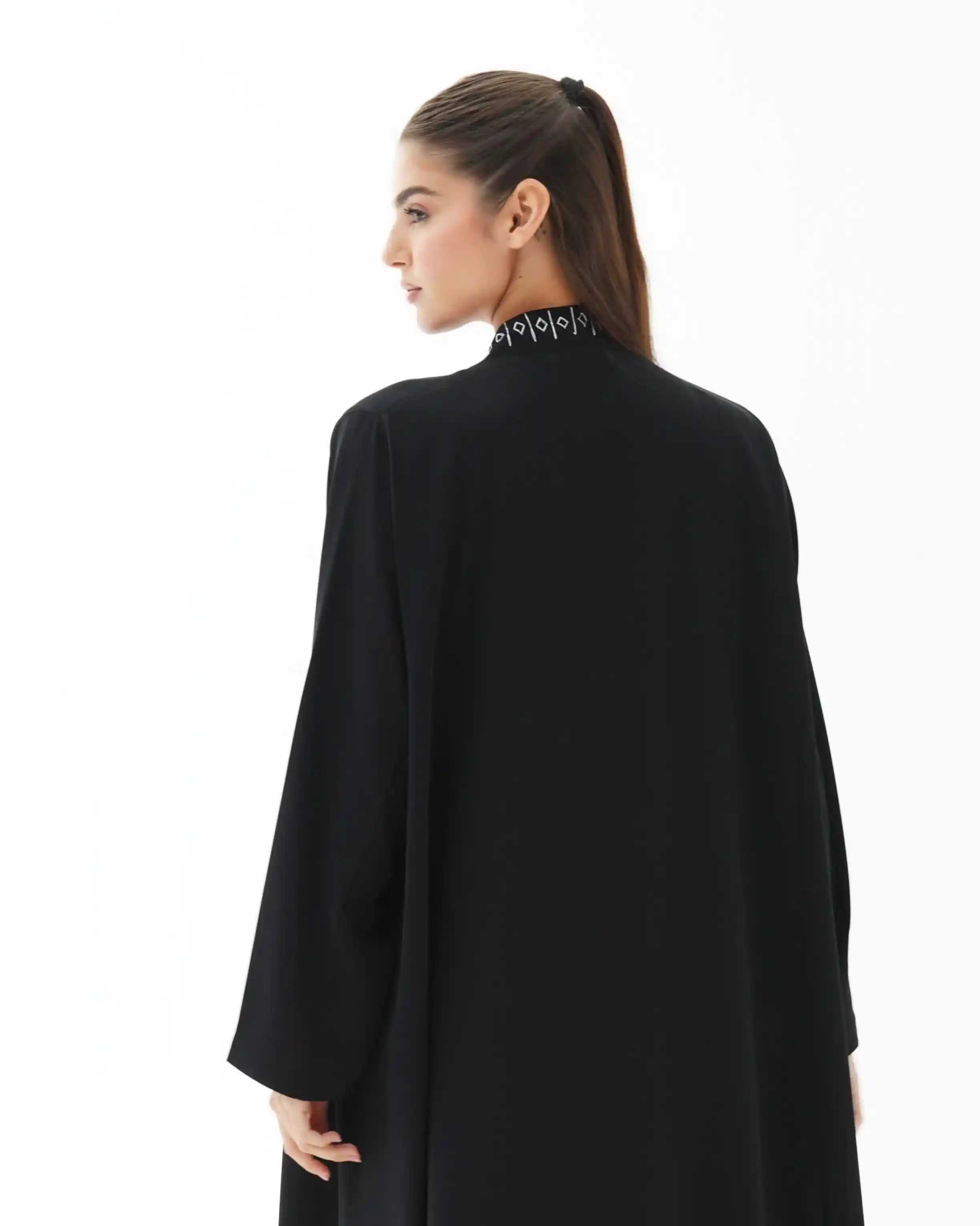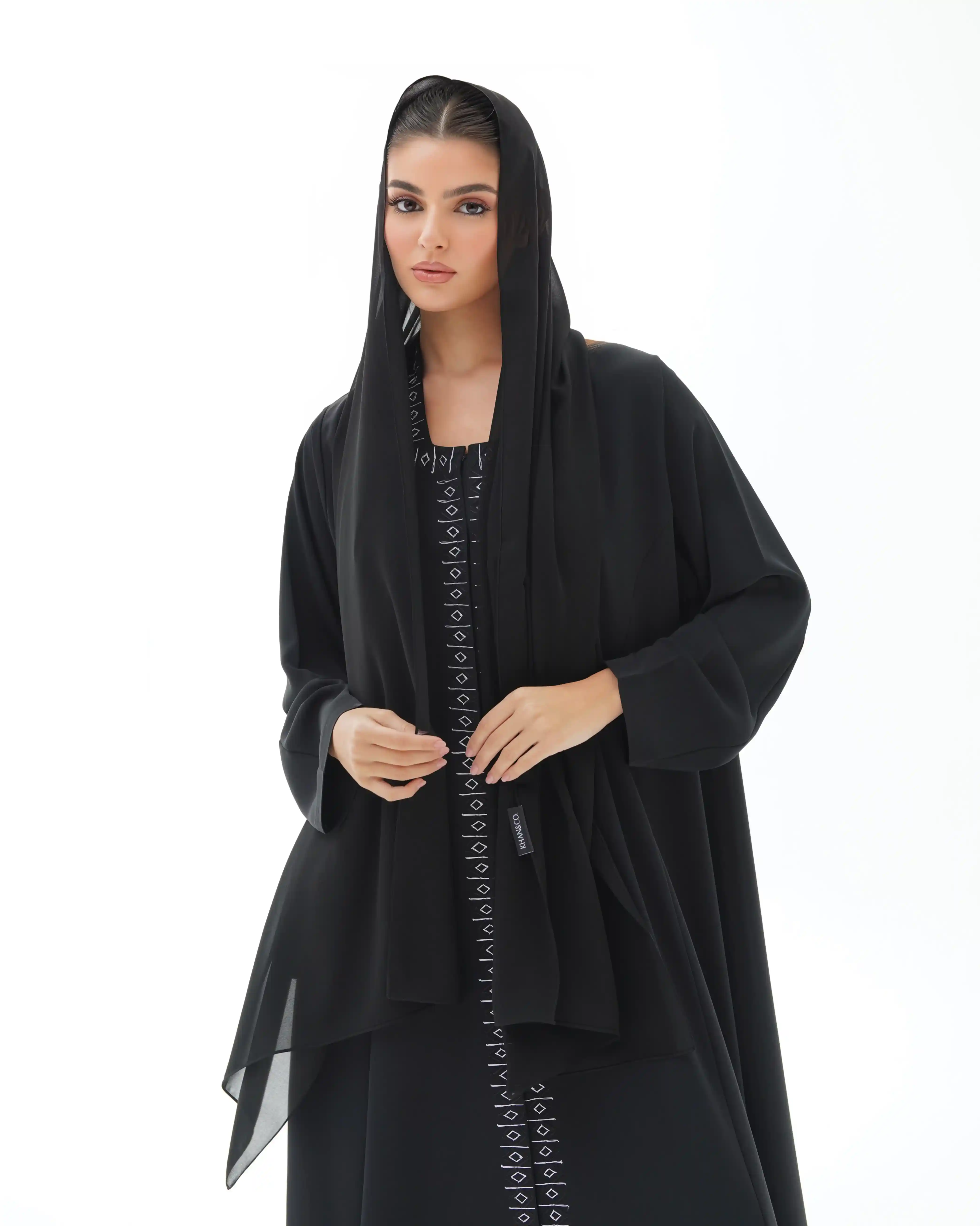 عباية فاخرة مستوحاة من جمال الفن الاسلامي تعيد إحياء روح الموازييك العربي الاسلامي في قالب معاصر. تتميز بقصة رقبة مربعة في شكل هندسي مطرزة بخيوط من الحرير تتشابك في انماط هندسية تحاكي نقوش الاراربيسك التاريخية وتلتف من خلف ياقة الرقبة وتنحدر بانسيابية من الاعلى الى اسفل العباية، صنعت من قماش كريب فاخر وناعم الملمس ينسدل بخفة ويبرز تفاصيل التطريز الحريري. تأتي واسعة من عند الصدر حتى الذيل بانسيابية راقية تمنح حرية في الحركة واناقة في الحضور كما انها مقفلة بالكامل بطقطق مخفي من الامام ليحافظ التصميم على الستر والعملية.