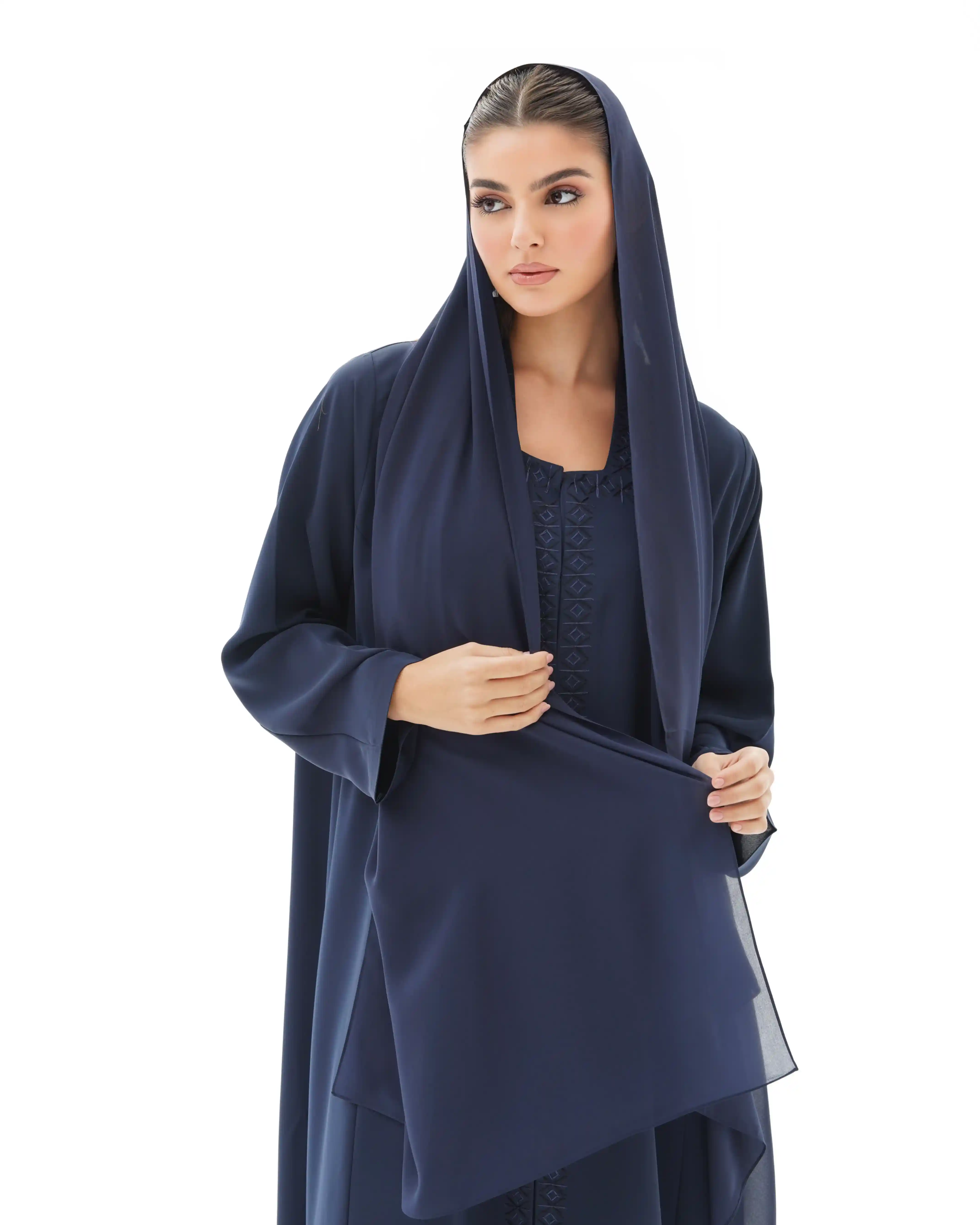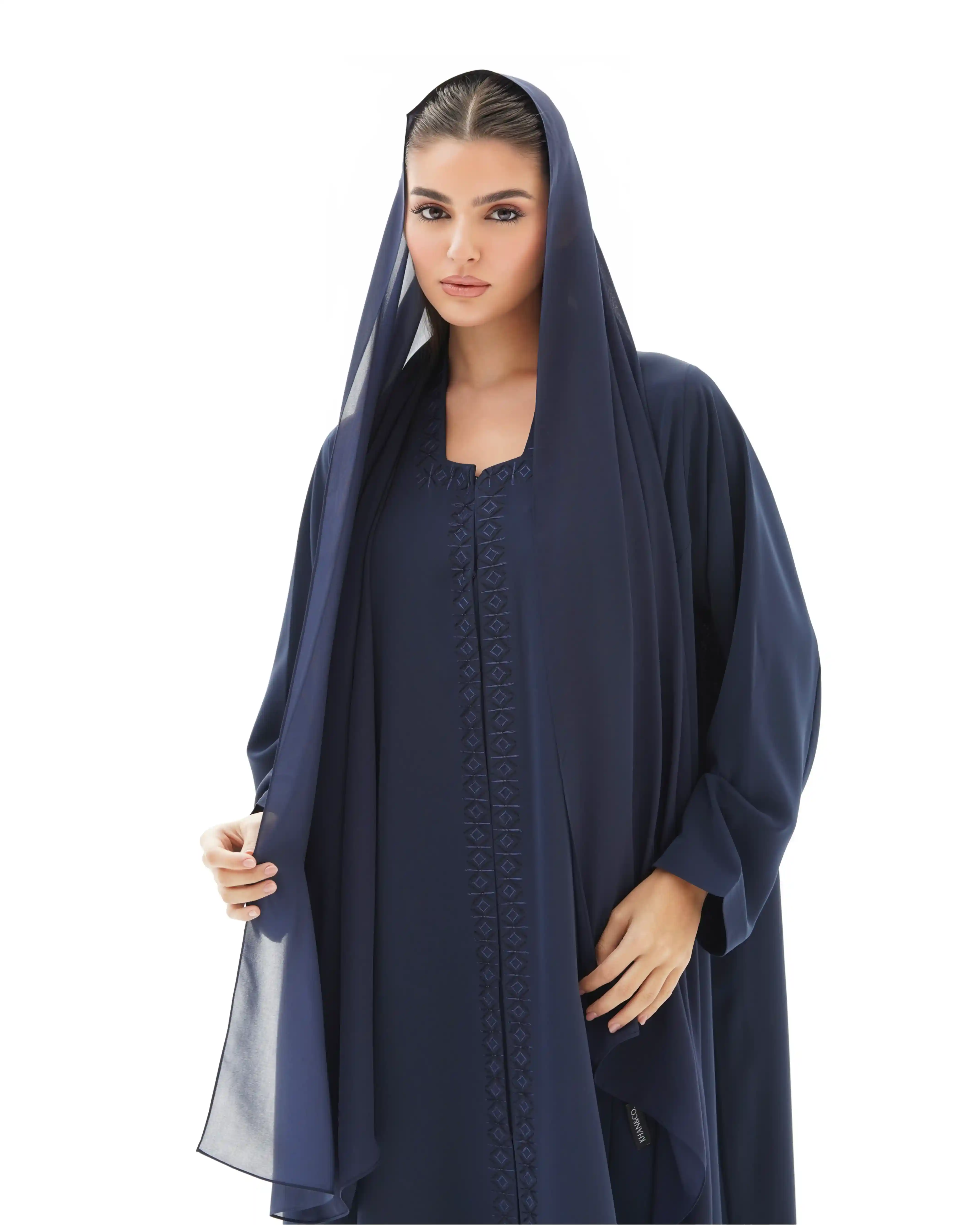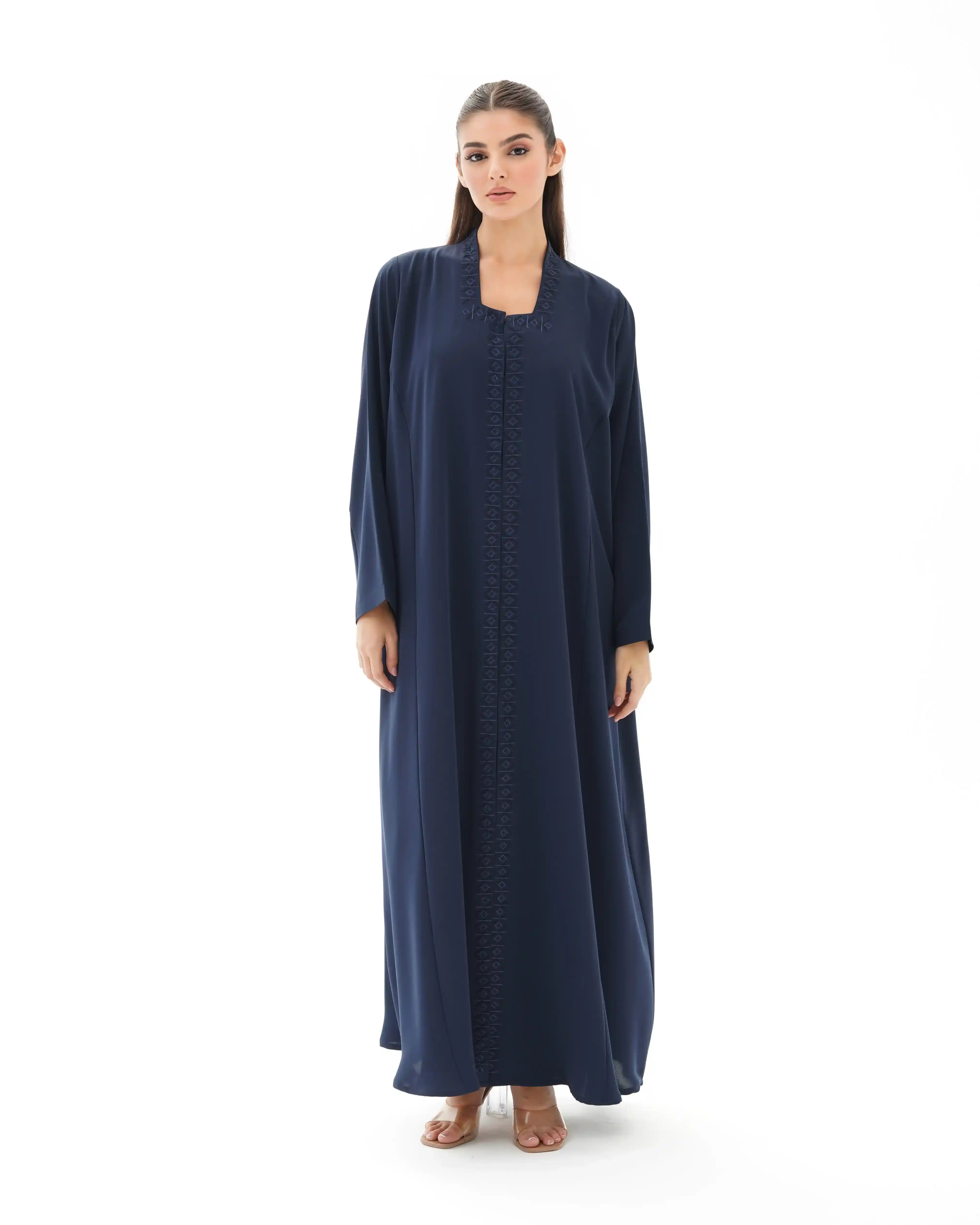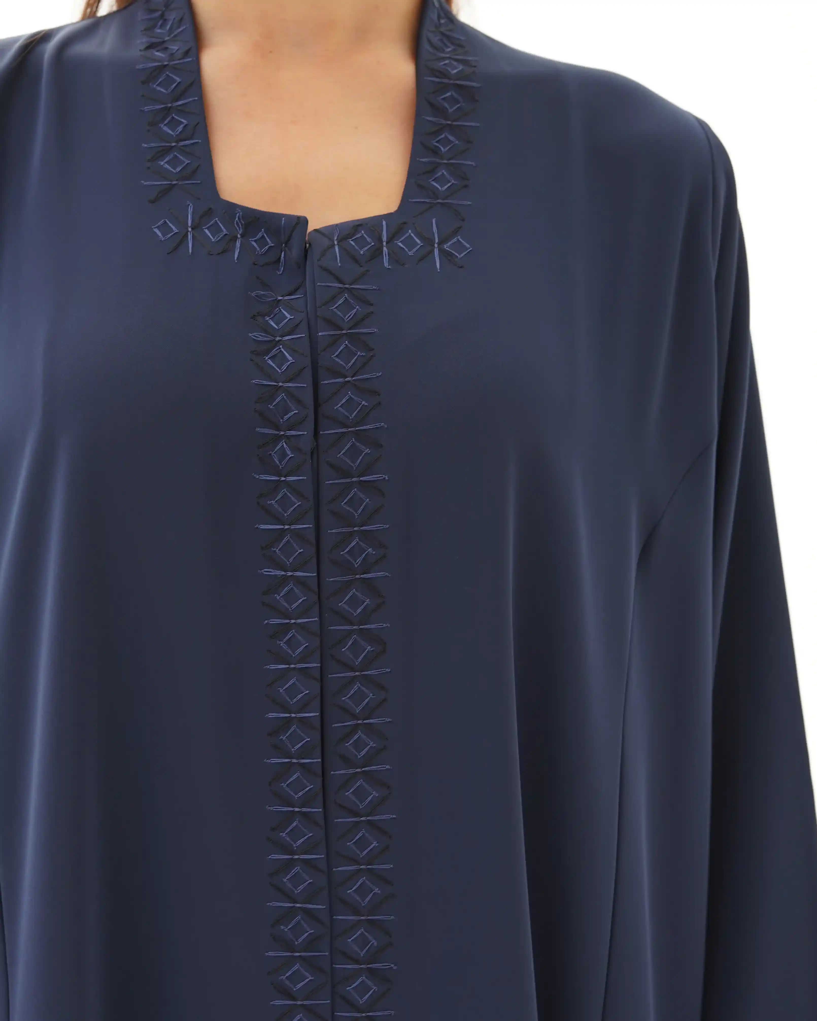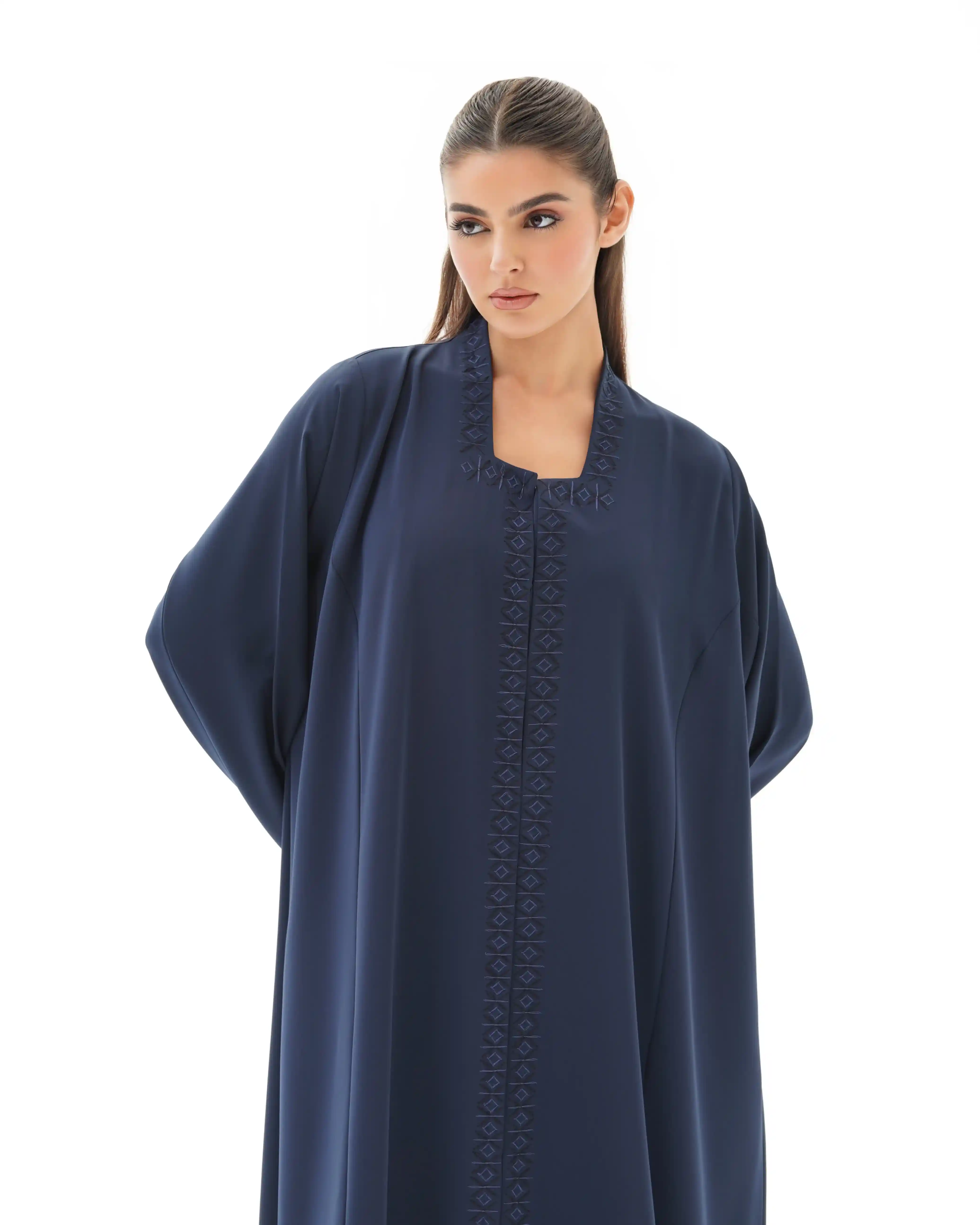 عباية فاخرة مستوحاة من جمال الفن الاسلامي تعيد إحياء روح الموازييك العربي الاسلامي في قالب معاصر. تتميز بقصة رقبة مربعة في شكل هندسي مطرزة بخيوط من الحرير تتشابك في انماط هندسية تحاكي نقوش الاراربيسك التاريخية وتلتف من خلف ياقة الرقبة وتنحدر بانسيابية من الاعلى الى اسفل العباية، صنعت من قماش كريب فاخر وناعم الملمس ينسدل بخفة ويبرز تفاصيل التطريز الحريري. تأتي واسعة من عند الصدر حتى الذيل بانسيابية راقية تمنح حرية في الحركة واناقة في الحضور كما انها مقفلة بالكامل بطقطق مخفي من الامام ليحافظ التصميم على الستر والعملية.