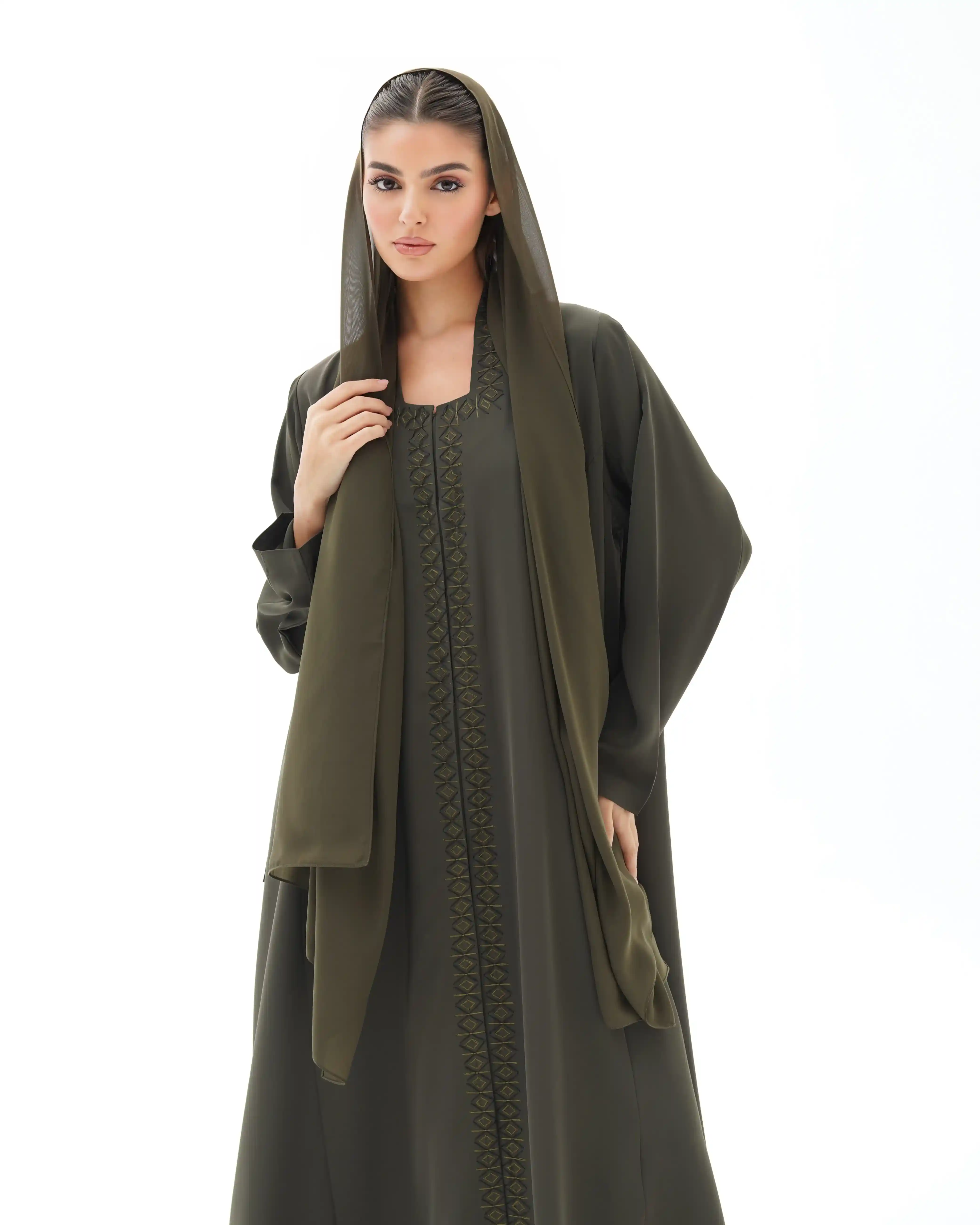 عباية فاخرة مستوحاة من جمال الفن الاسلامي تعيد إحياء روح الموازييك العربي الاسلامي في قالب معاصر. تتميز بقصة رقبة مربعة في شكل هندسي مطرزة بخيوط من الحرير تتشابك في انماط هندسية تحاكي نقوش الاراربيسك التاريخية وتلتف من خلف ياقة الرقبة وتنحدر بانسيابية من الاعلى الى اسفل العباية، صنعت من قماش كريب فاخر وناعم الملمس ينسدل بخفة ويبرز تفاصيل التطريز الحريري. تأتي واسعة من عند الصدر حتى الذيل بانسيابية راقية تمنح حرية في الحركة واناقة في الحضور كما انها مقفلة بالكامل بطقطق مخفي من الامام ليحافظ التصميم على الستر والعملية.