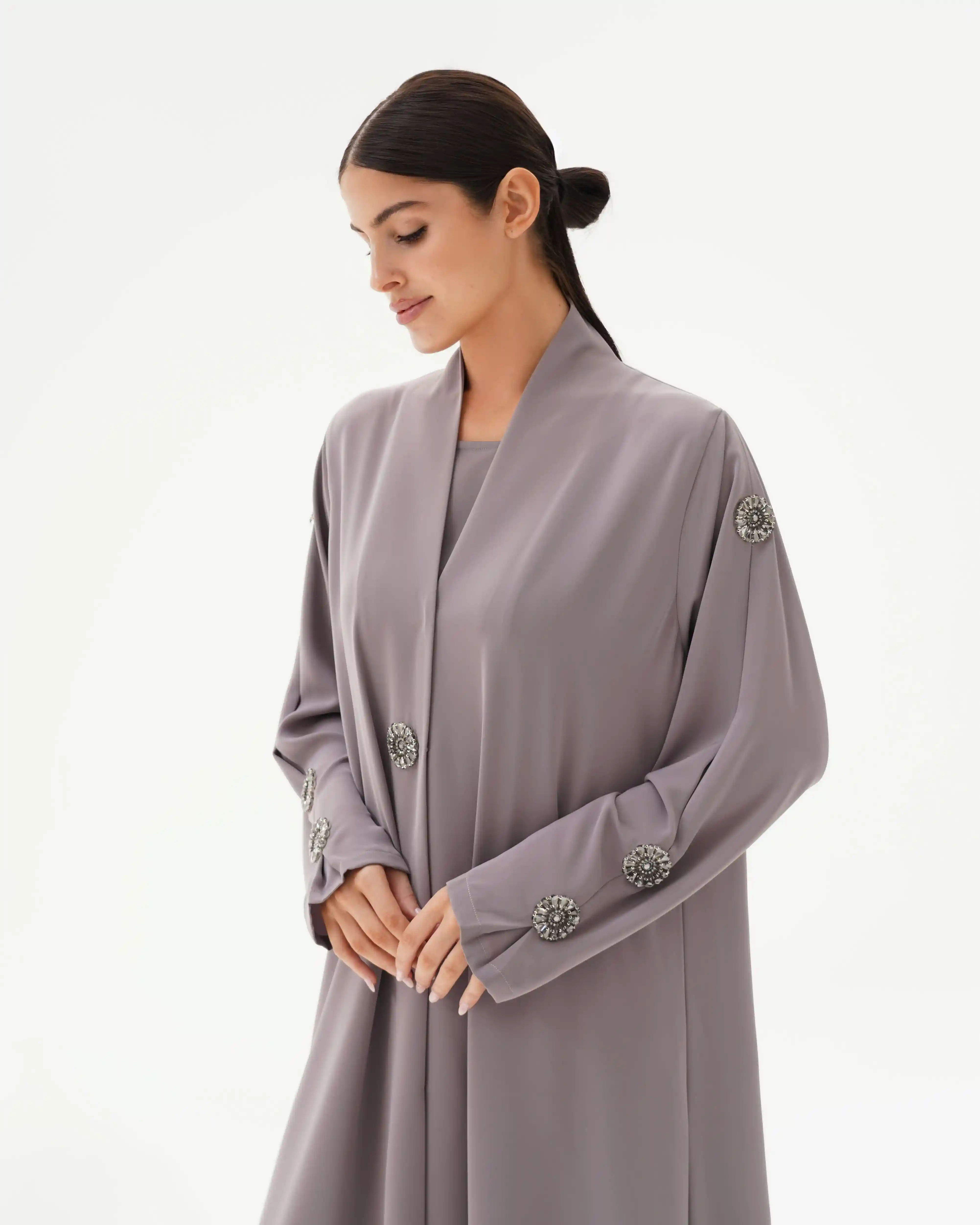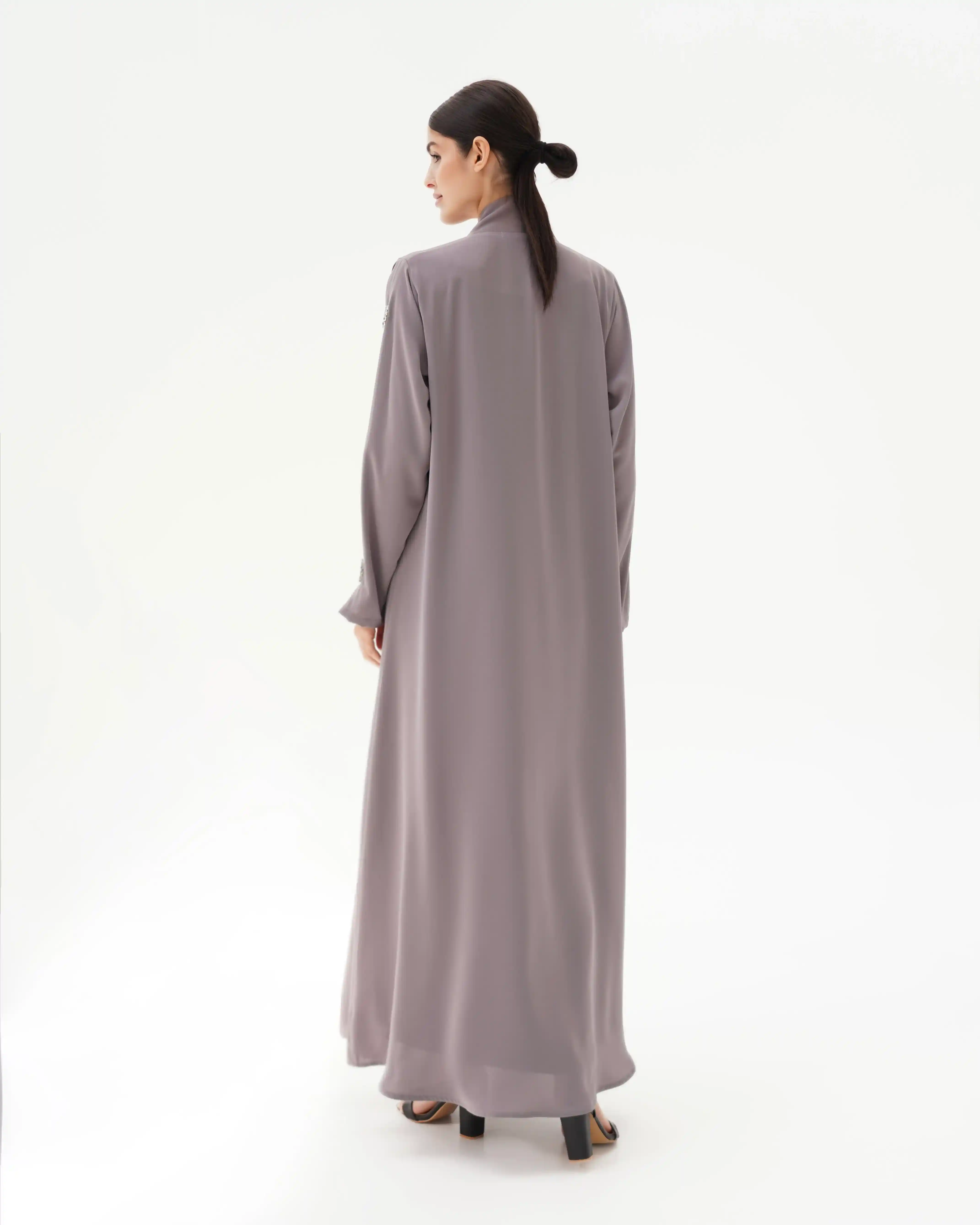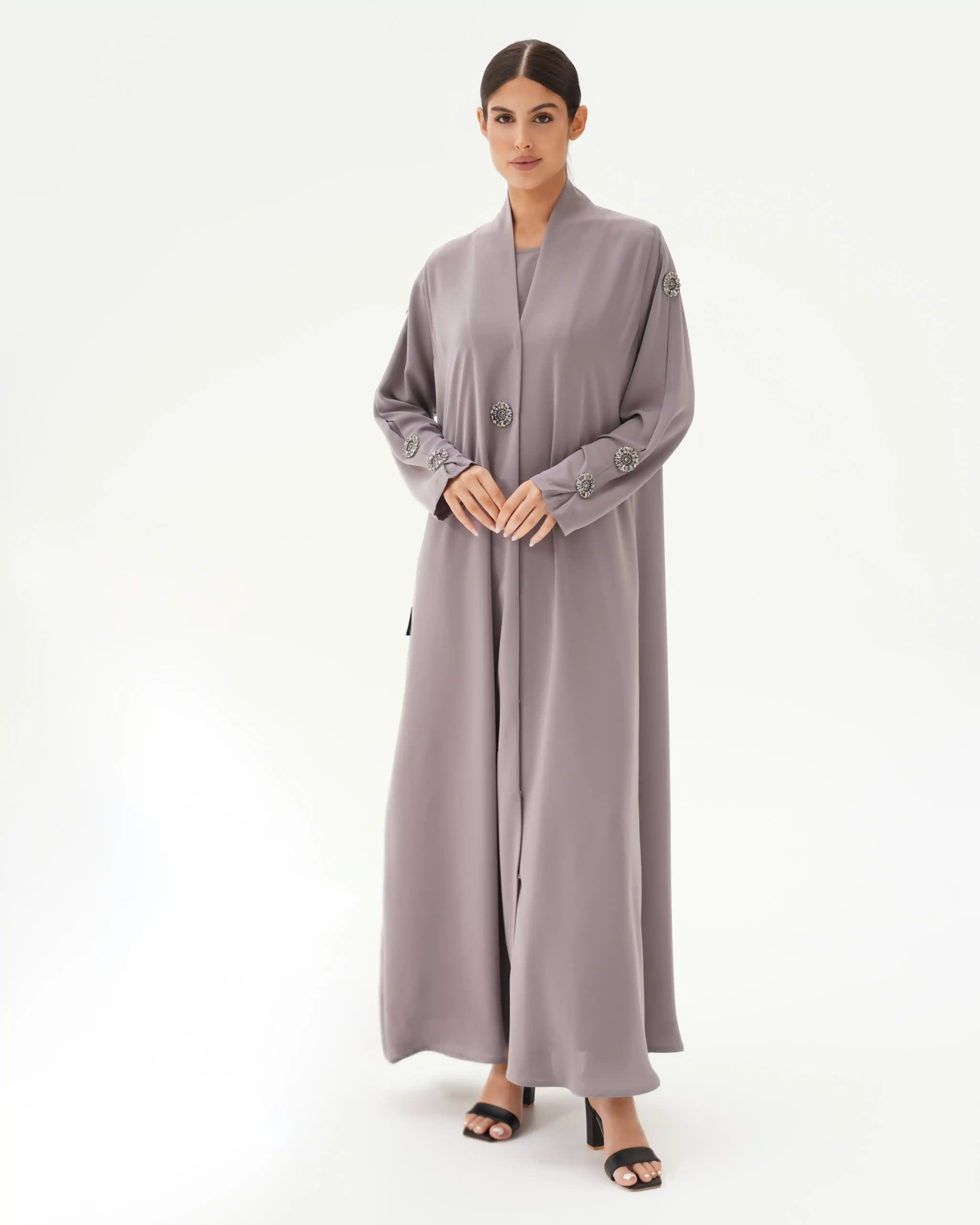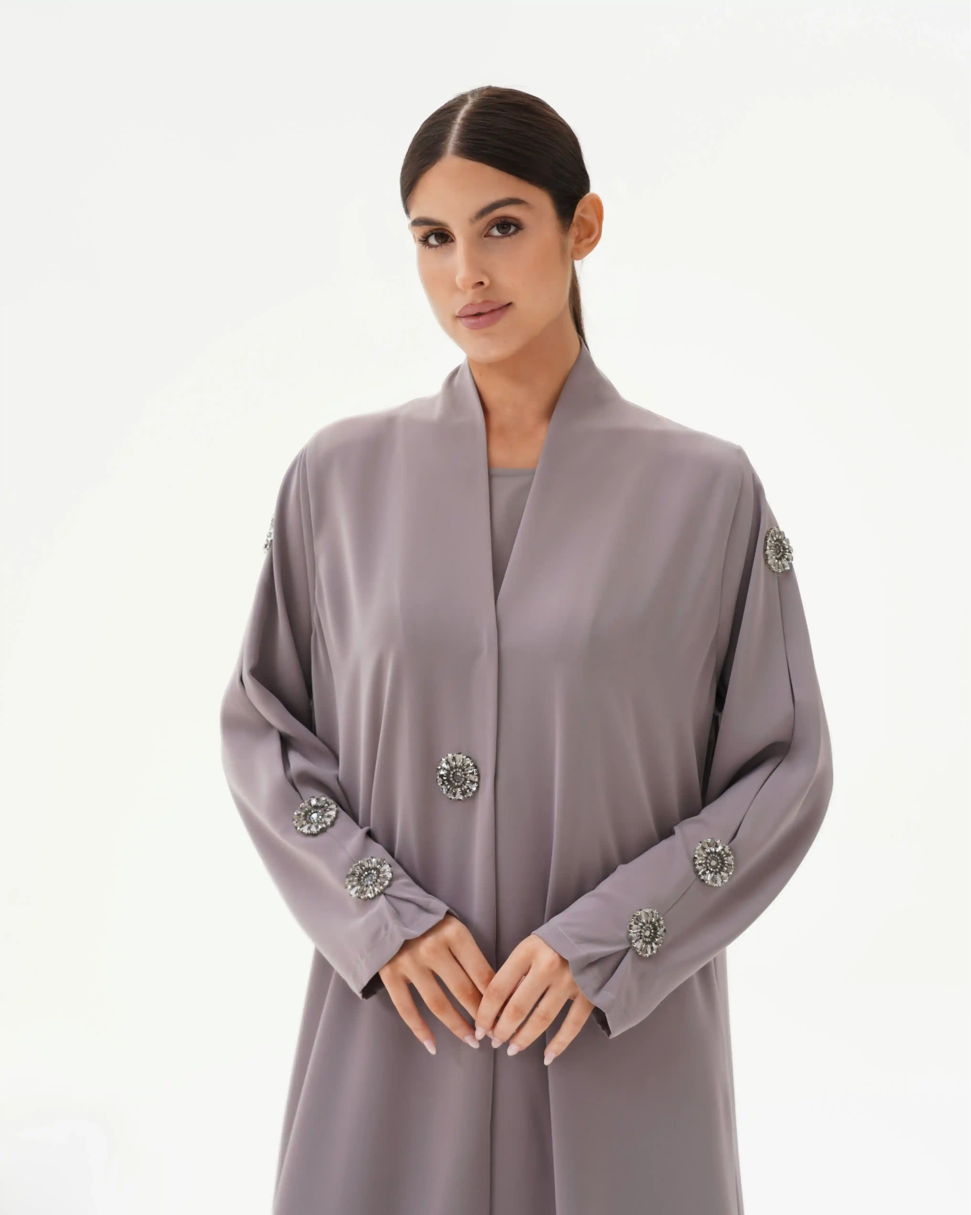 • لون سموكي جراي كامل العباية مع كرستال باللون سموكي جراي.