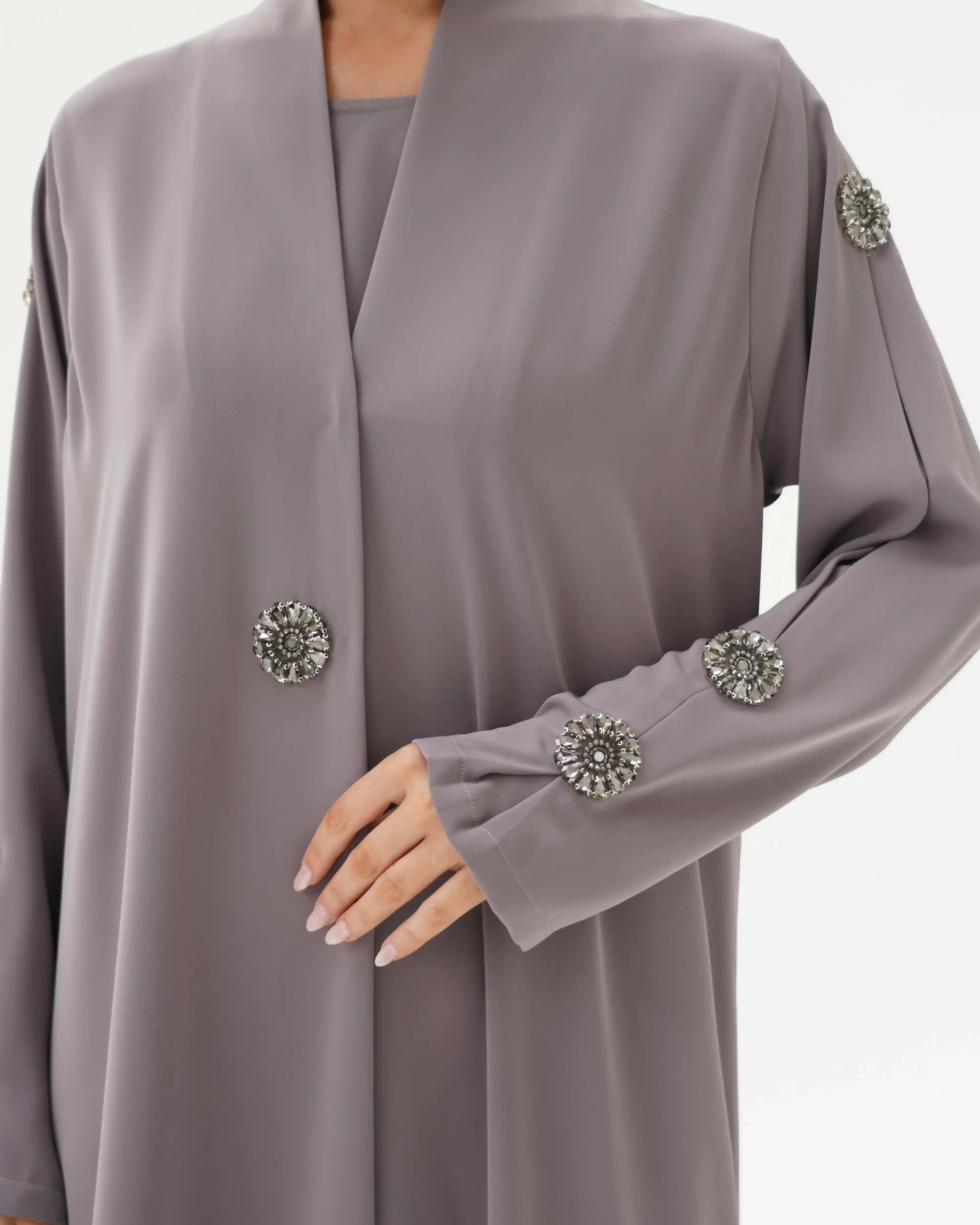 • الأكمام مزينة بكرستال معدني دائري بتصميم زهري أنيق، باللون سموكي جراي موزع بتناسق على الأكمام والصدر.