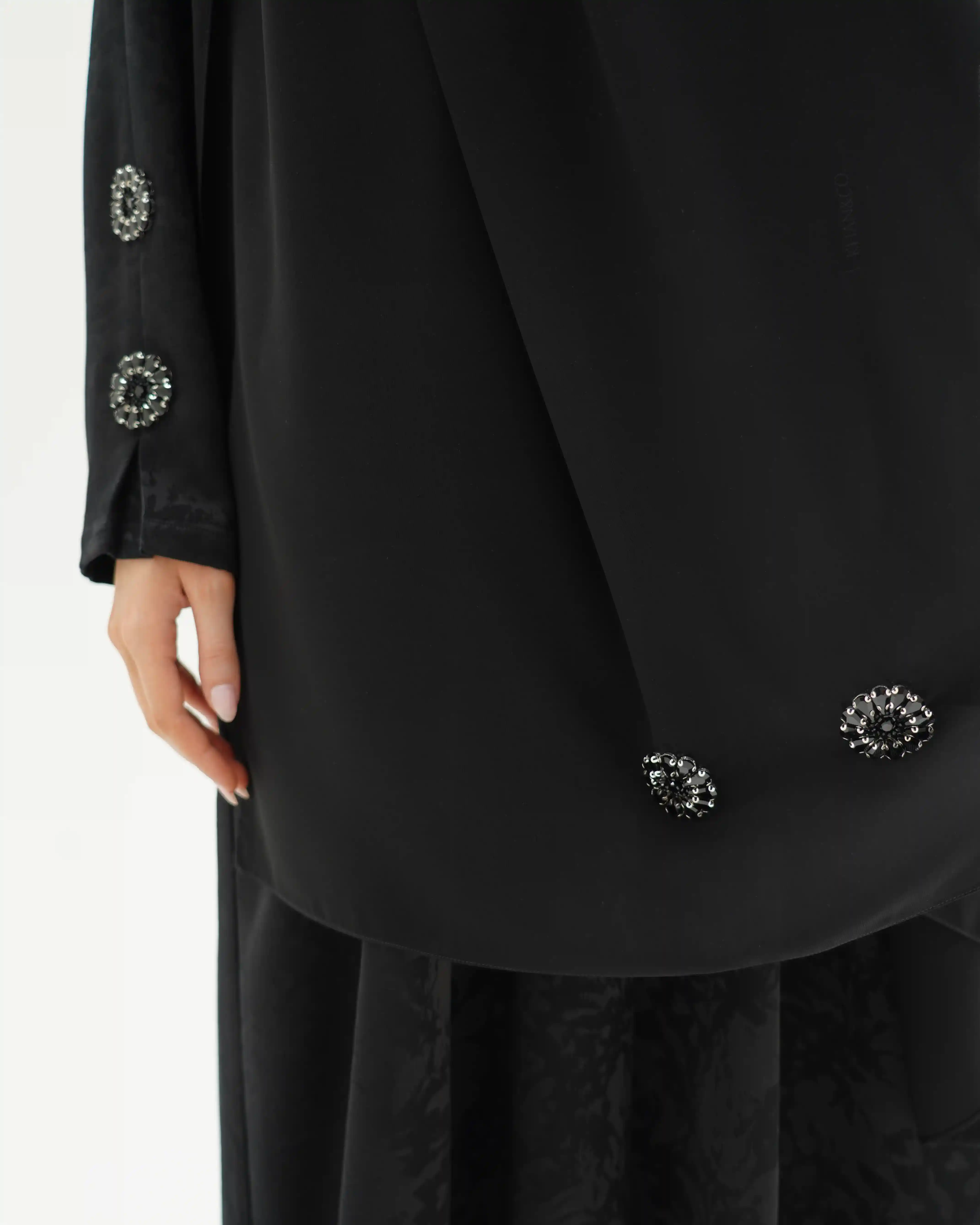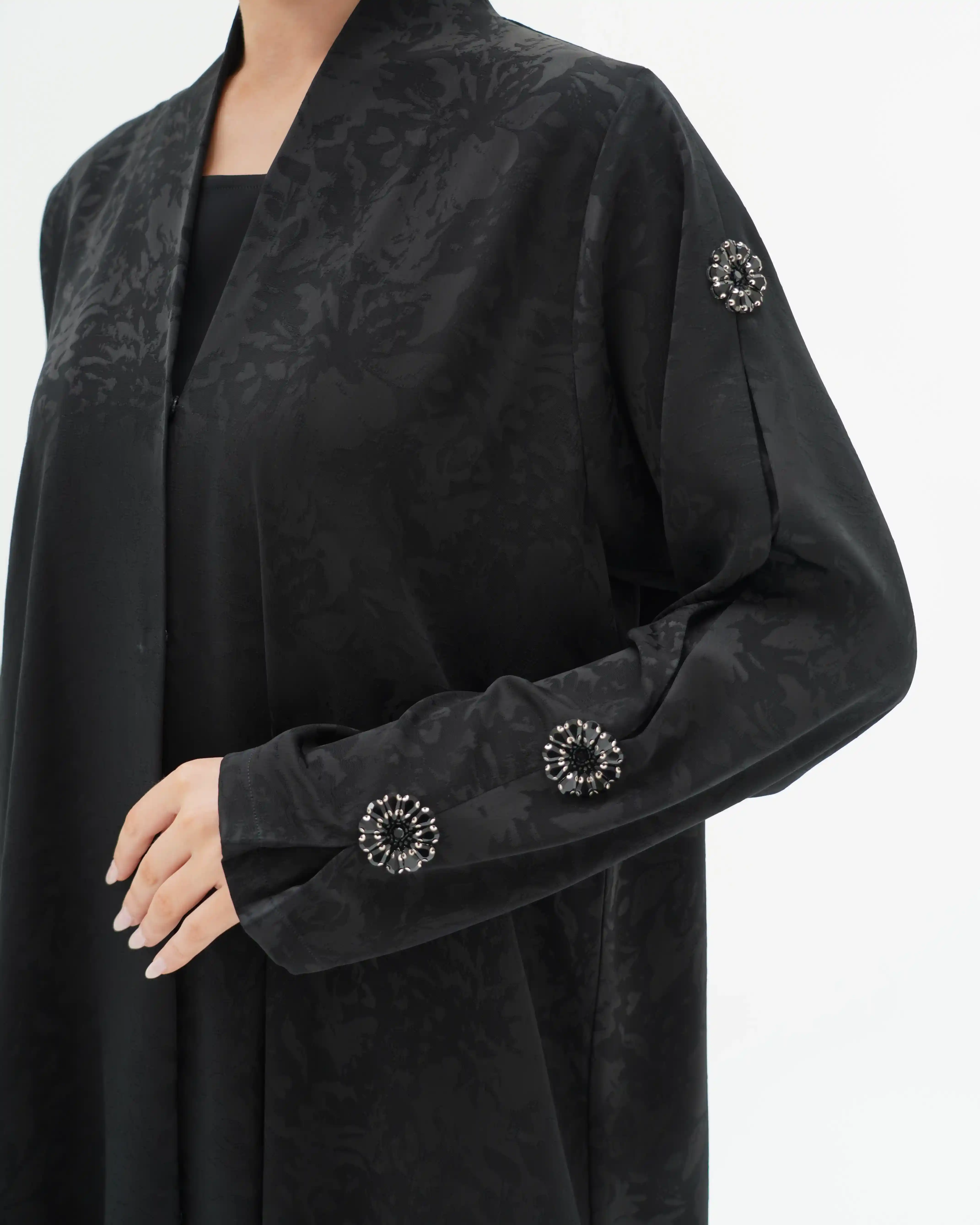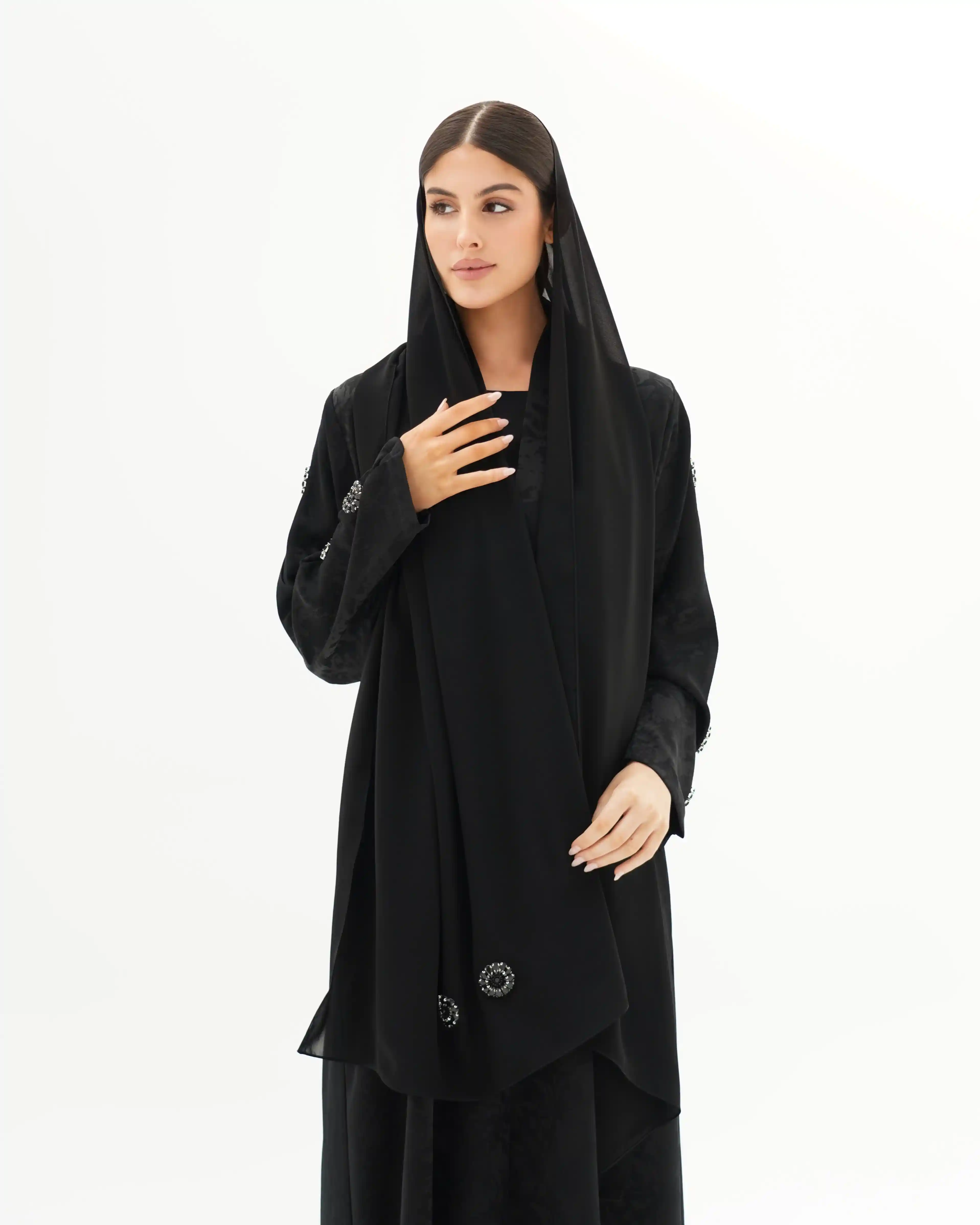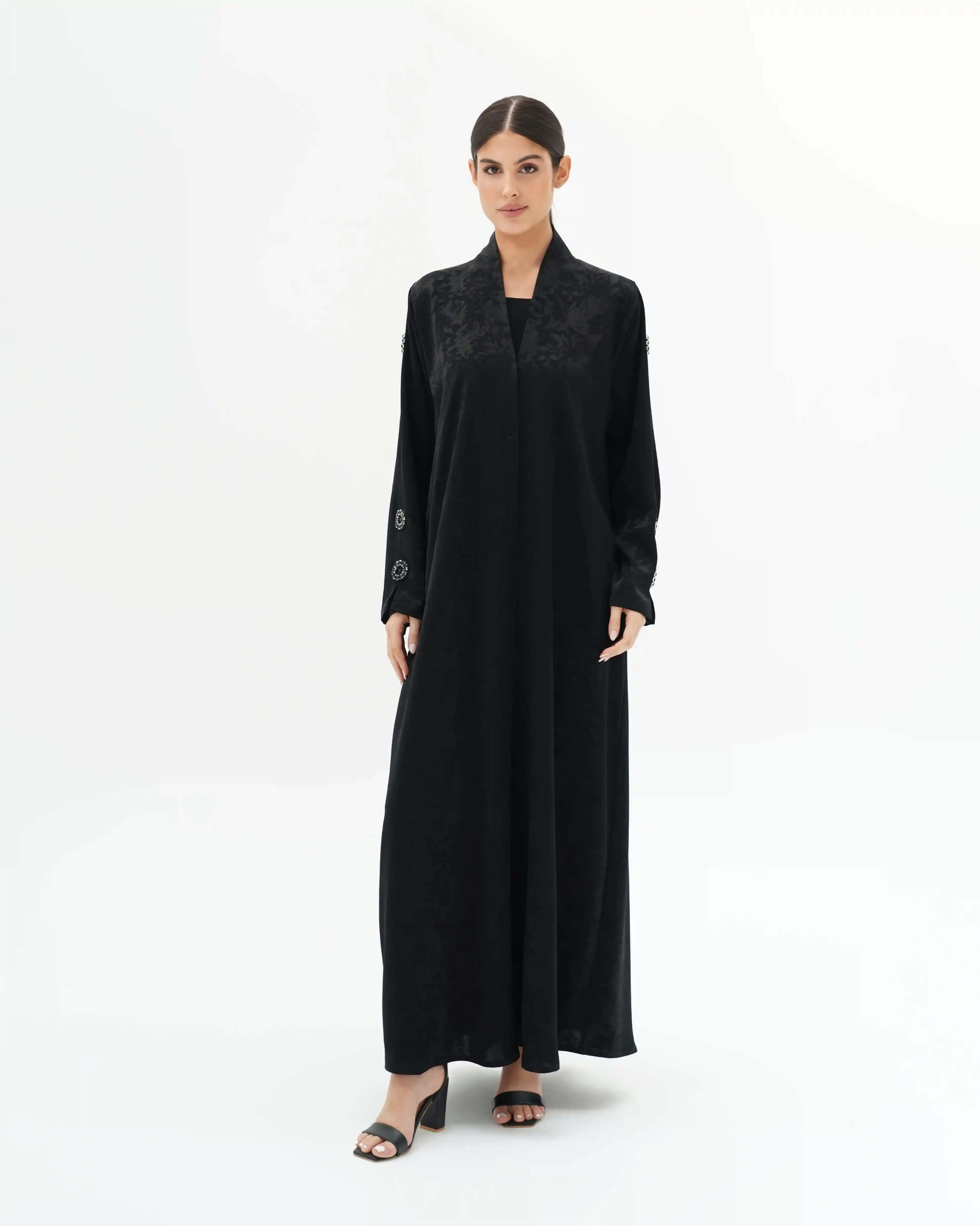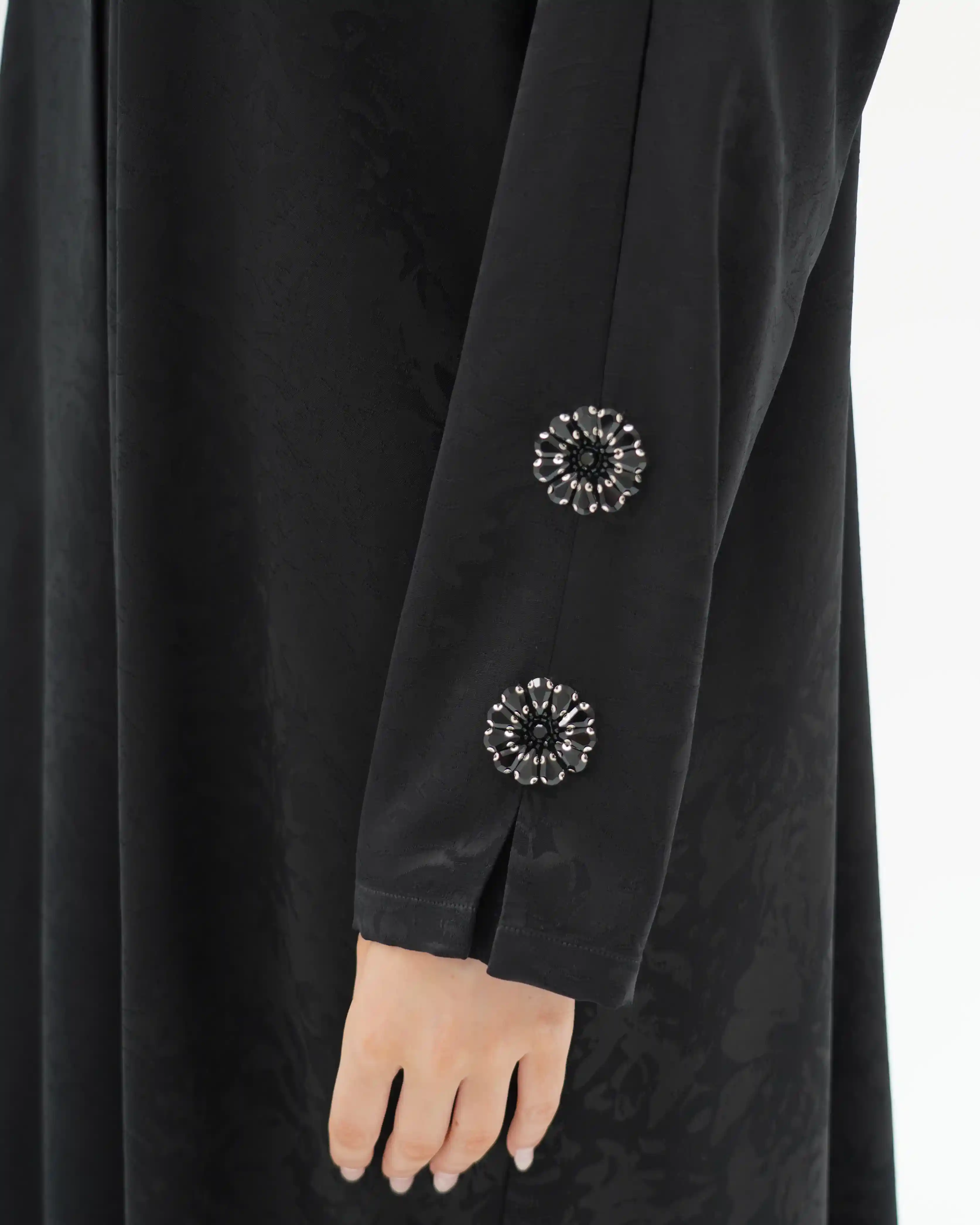 تصميم العباية يرتكز على البساطة الفاخرة بخطوط انسيابية وتفاصيل معدنية/كريستالية تضيف قيمة بصرية راقية دون مبالغة. صُنعت من قماش اسنشيل جاكارد بنقوش ناعمة غير لامعة تظهر وتختفي مع الحركة. الأكمام تأتي بخط مستقيم ناعم يتزيّن بكريستالات دائرية موزعة بدقة لتمنح توازناً بصرياً وتحوّلها إلى عنصر جمالي بارز. الكريستالات المعدنية الداكنة بلمعتها الراقية تشبه نجمة أو زهرة صغيرة، فتمنح التصميم لمسة أشبه بالمجوهرات وتعكس هوية واضحة للعباية. أما الياقة المستقيمة البسيطة فتضفي مظهراً أنيقاً وتوجّه التركيز نحو تفاصيل الأكمام.