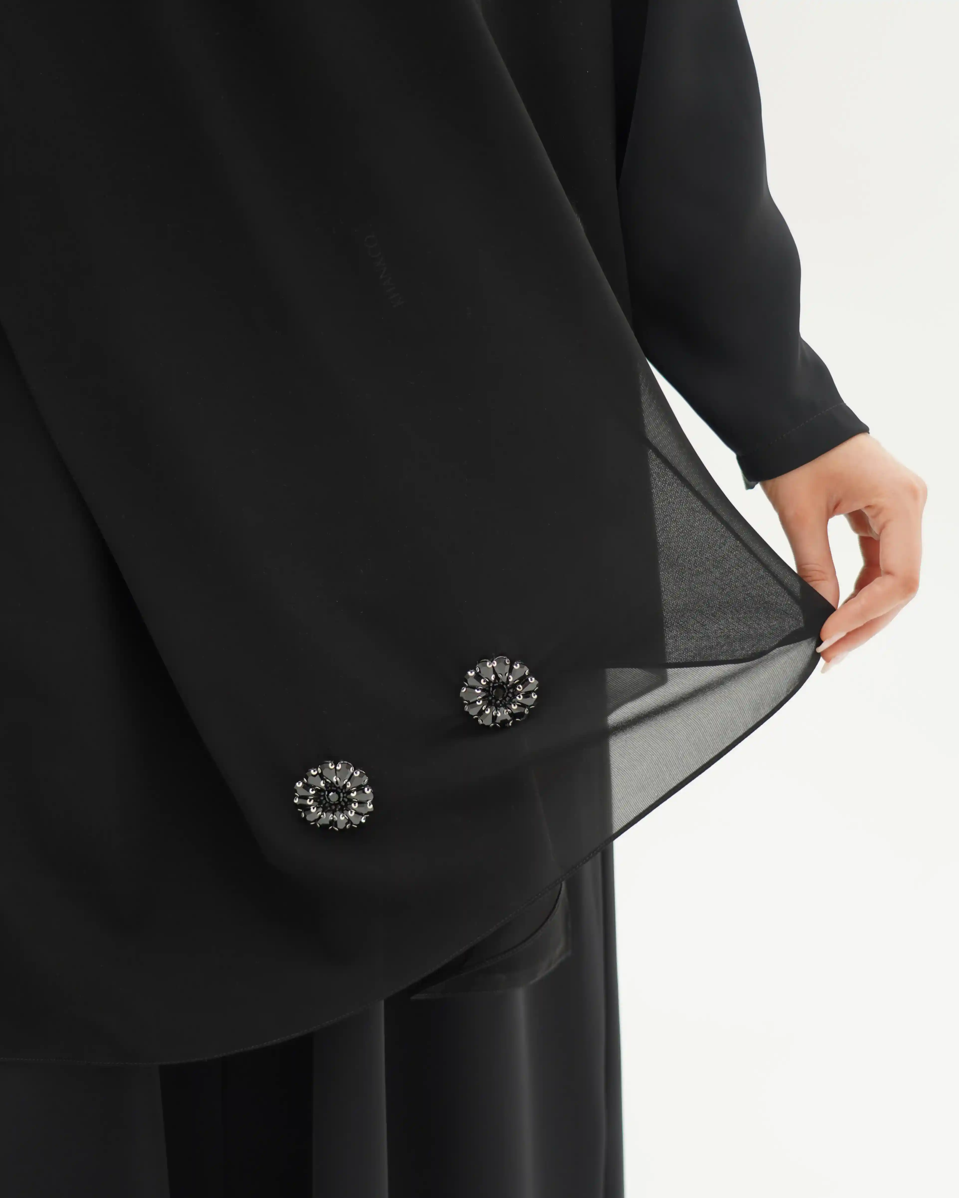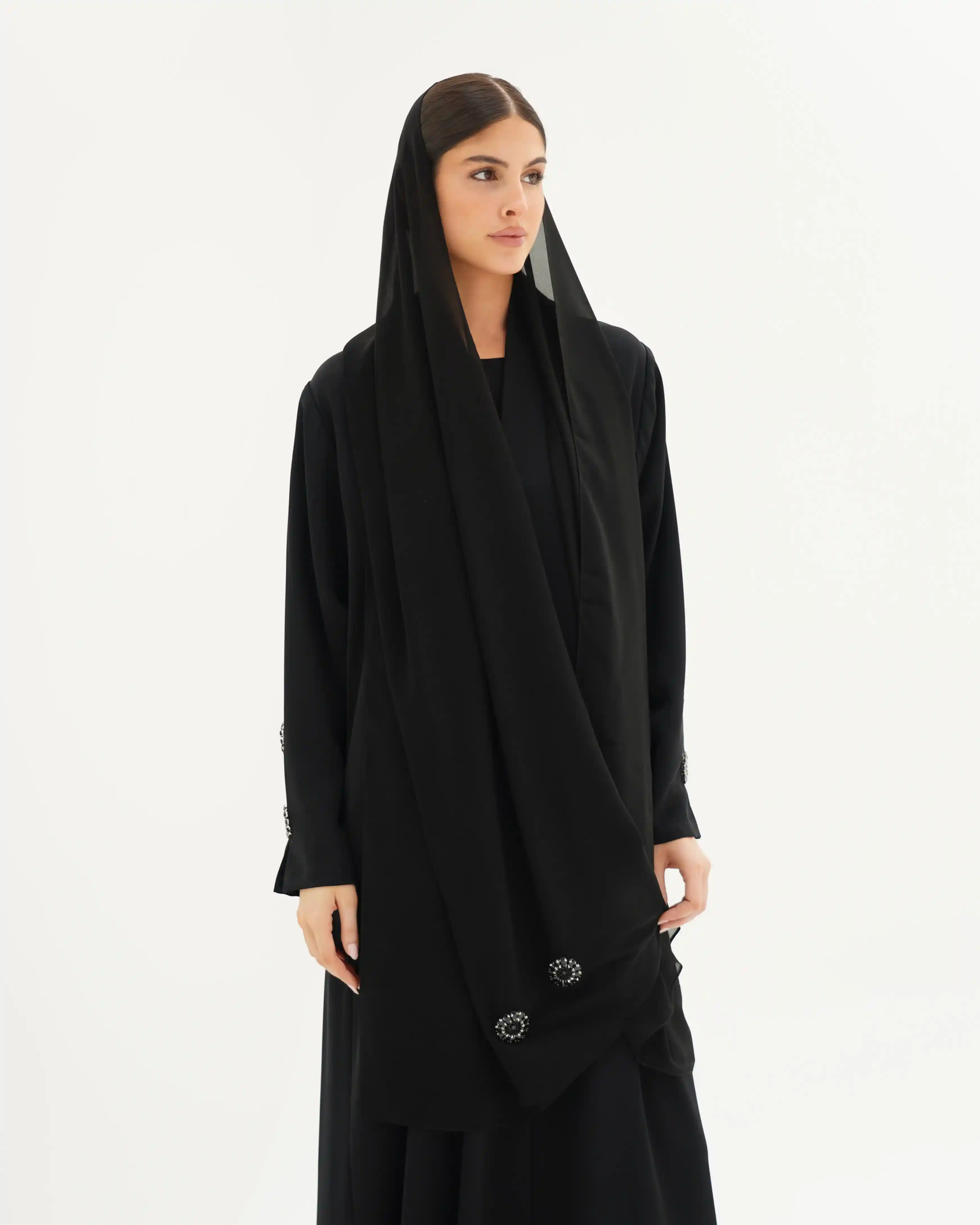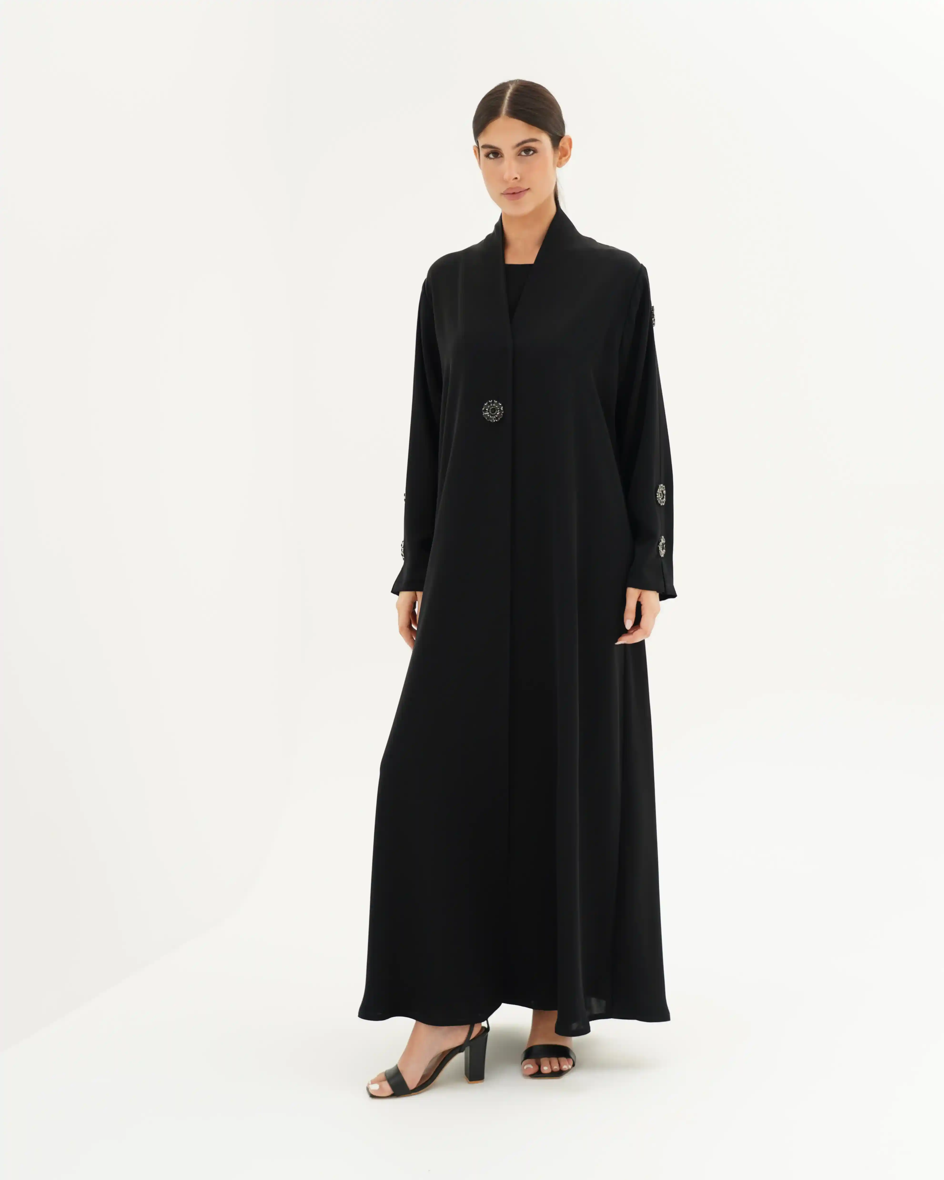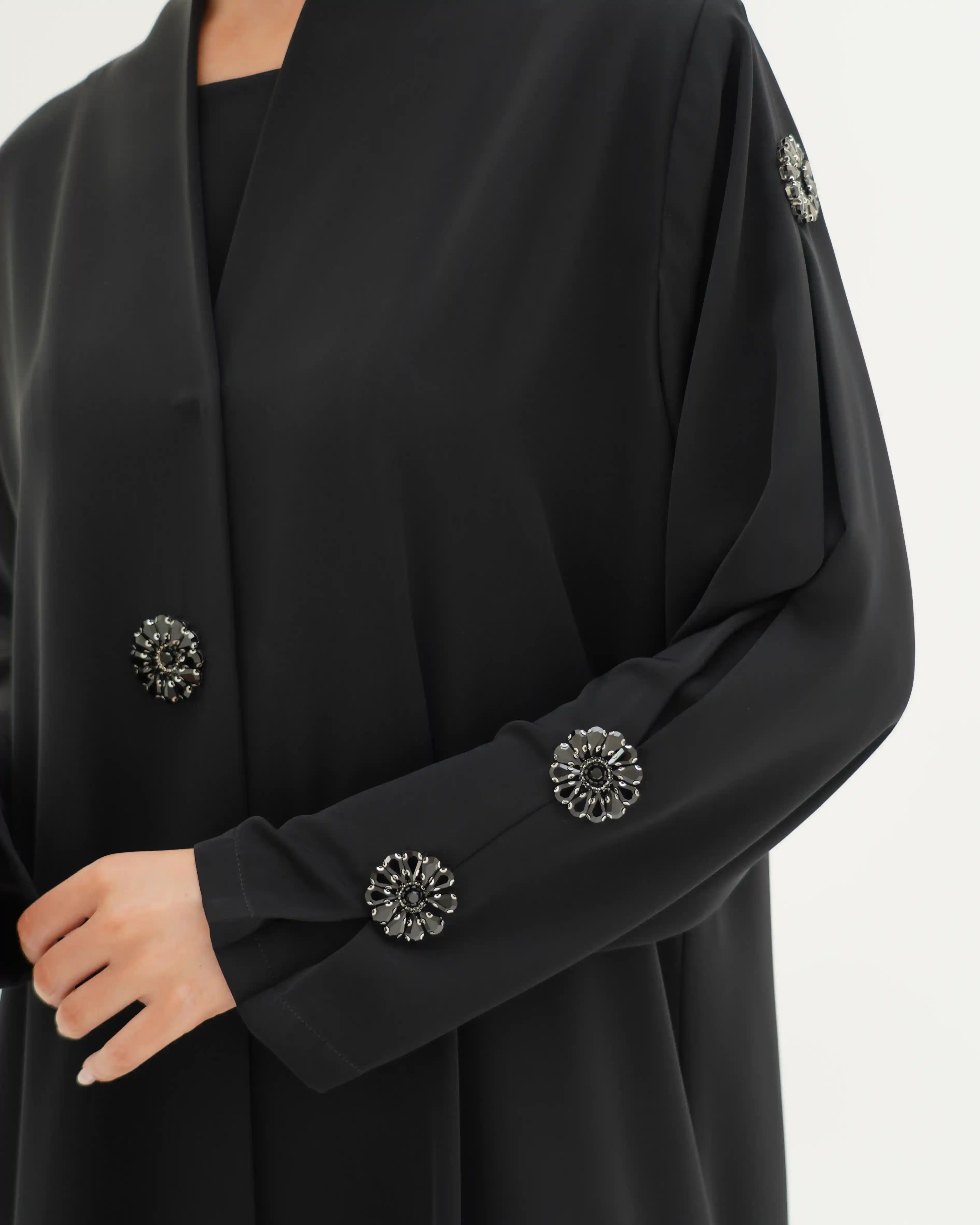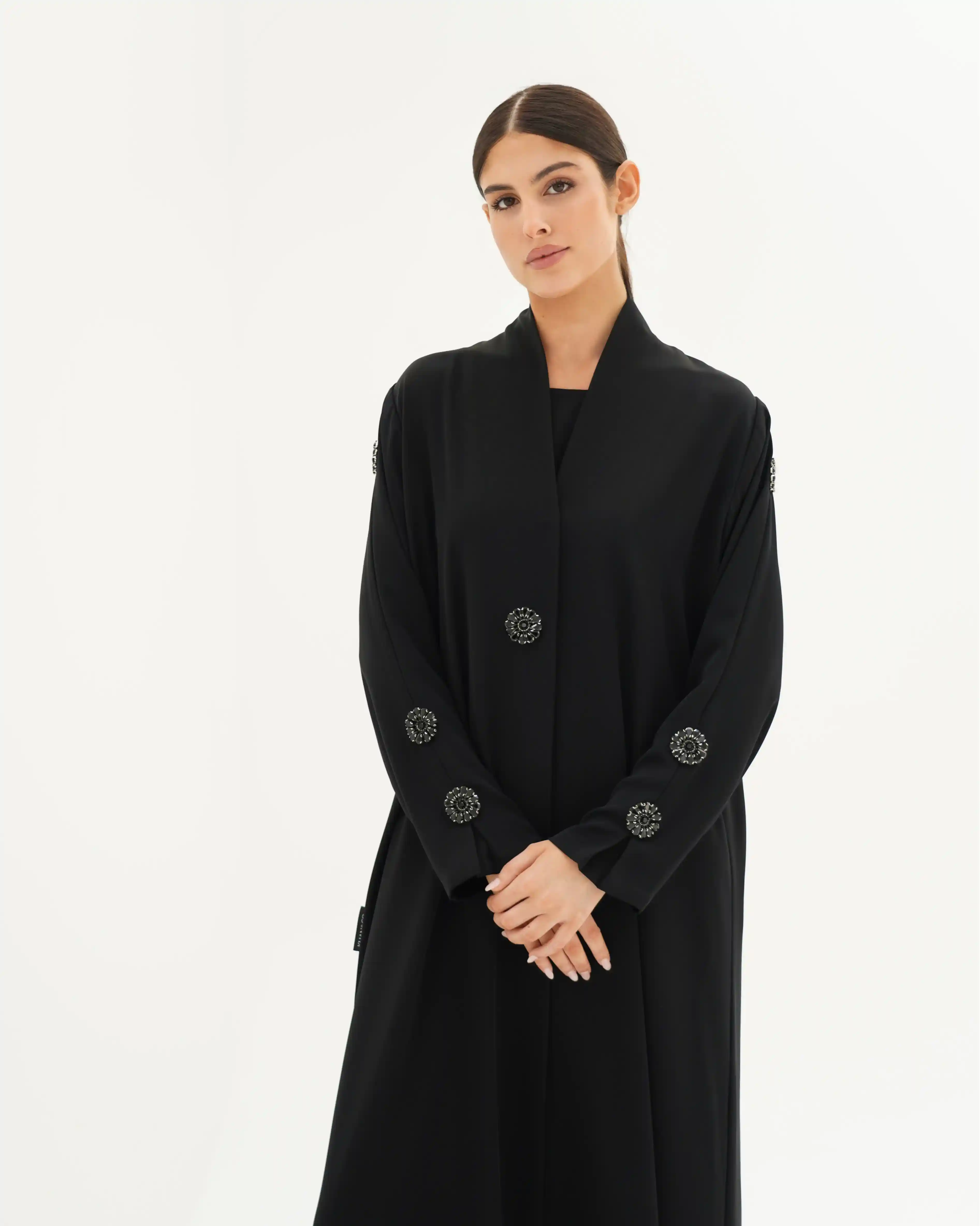 عباية بتصميم هادئ ينتمي إلى فخامة التفاصيل المدروسة، تنسدل بقصّة مستقيمة وانسيابية نقية توازن بين البساطة والرقي. الأكمام تأتي بخط نظيف مع ثنية ناعمة في منتصف الكم، مزدانة بعناصر معدنية/كريستالية دائرية داكنة تشبه زهرة أو نجمة صغيرة، موزعة بتوازن مدروس على الأكمام ذات الثنية الناعمة في منتصف الكم، وعلى الصدر والطرحة. لتمنح حضورًا بصريًا أشبه بالمجوهرات ، في انسجام متكامل يعكس هوية التصميم. ما الياقة المستقيمة البسيطة فتضفي مظهراً أنيقاً وتوجّه التركيز نحو تفاصيل الأكمام.