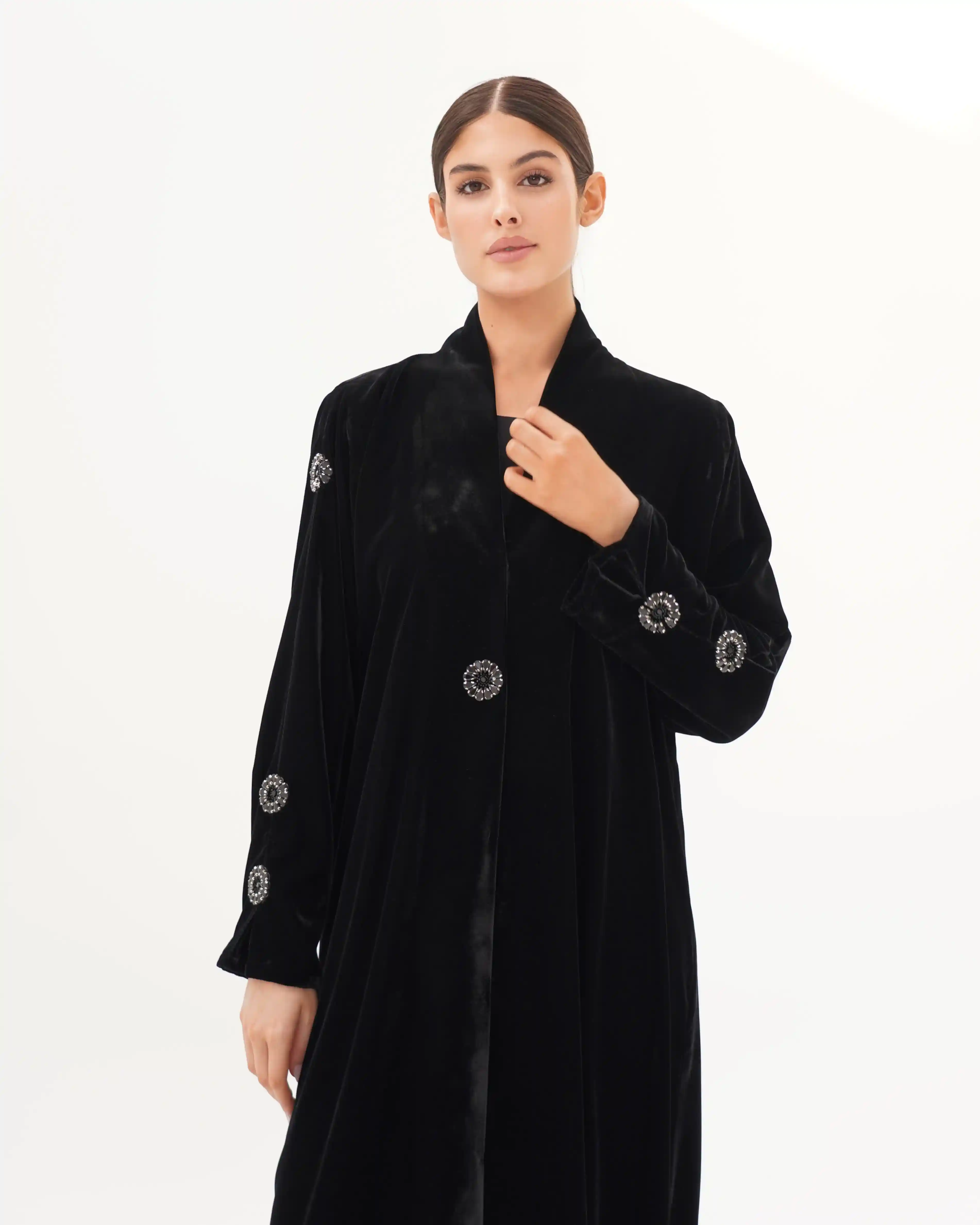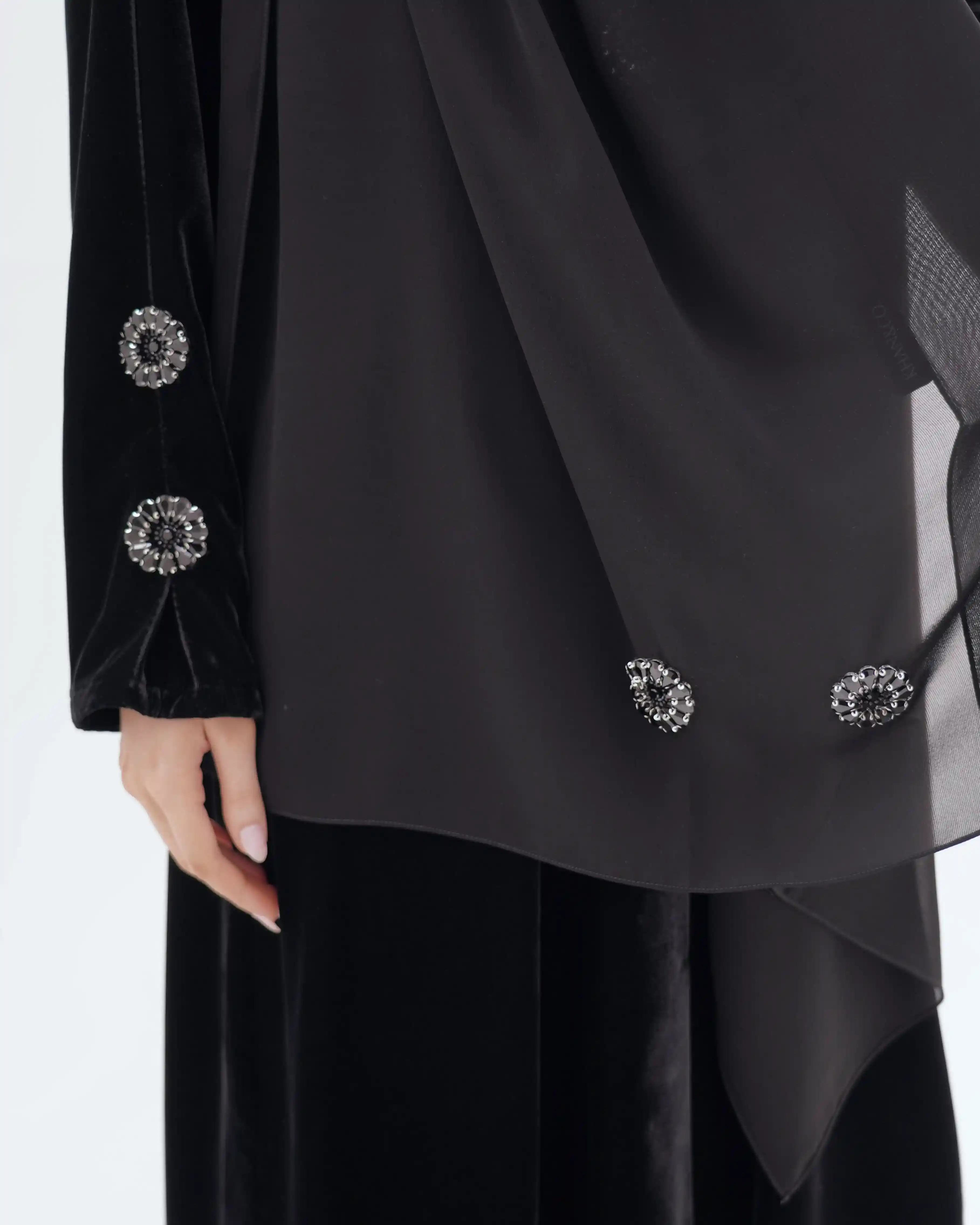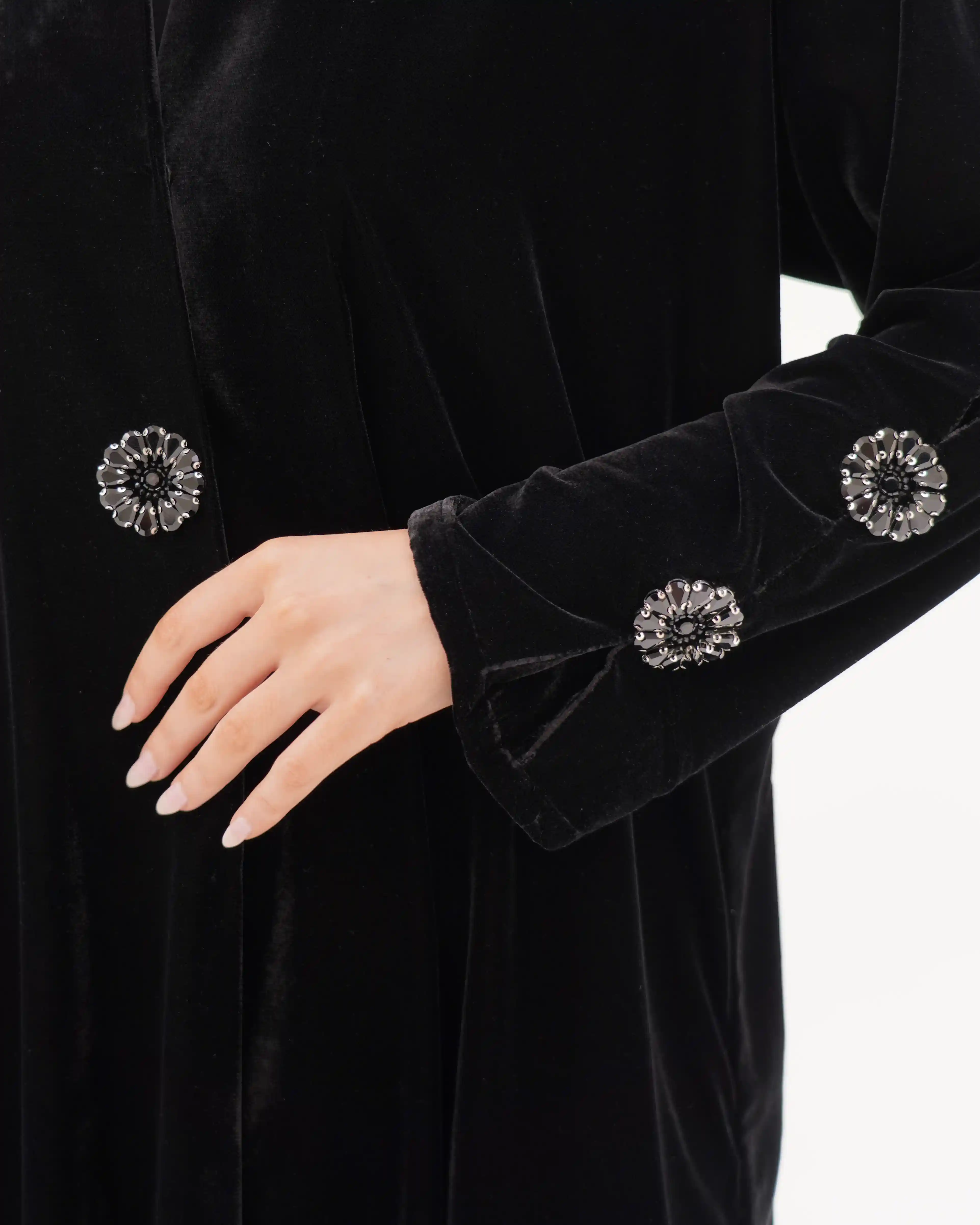 تصميم العباية يرتكز على البساطة الفاخرة بخطوط انسيابية وتفاصيل معدنية/كريستالية تضيف قيمة بصرية راقية دون مبالغة. صُنعت من قماش مخمل حرير بملمس مخملي ومتوسط الوزن. الأكمام تأتي بخط مستقيم ناعم يتزيّن بكريستالات دائرية موزعة بدقة لتمنح توازناً بصرياً وتحوّلها إلى عنصر جمالي بارز. الكريستالات المعدنية الداكنة بلمعتها الراقية تشبه نجمة أو زهرة صغيرة، فتمنح التصميم لمسة أشبه بالمجوهرات وتعكس هوية واضحة للعباية. أما الياقة المستقيمة البسيطة فتضفي مظهراً أنيقاً وتوجّه التركيز نحو تفاصيل الأكمام.