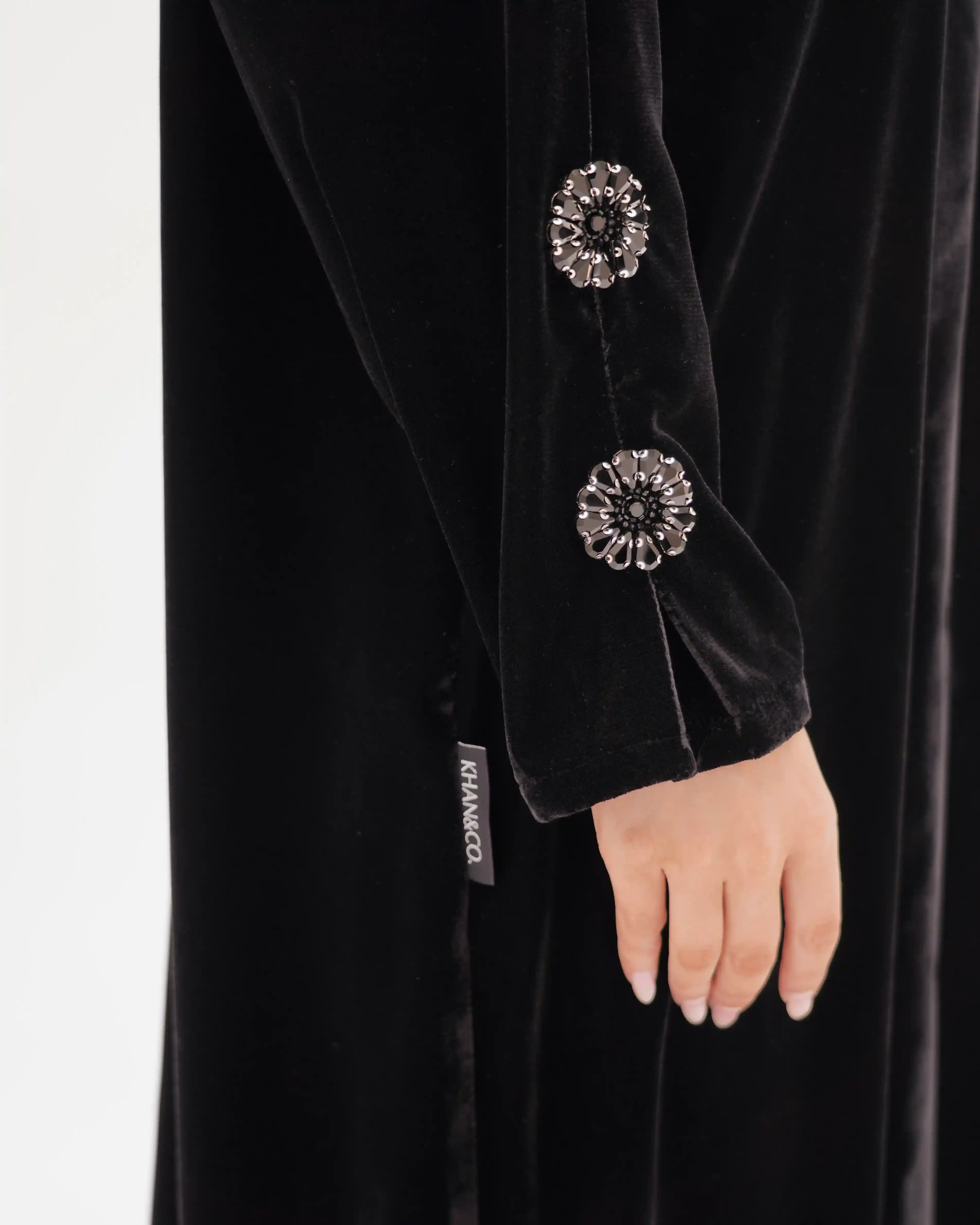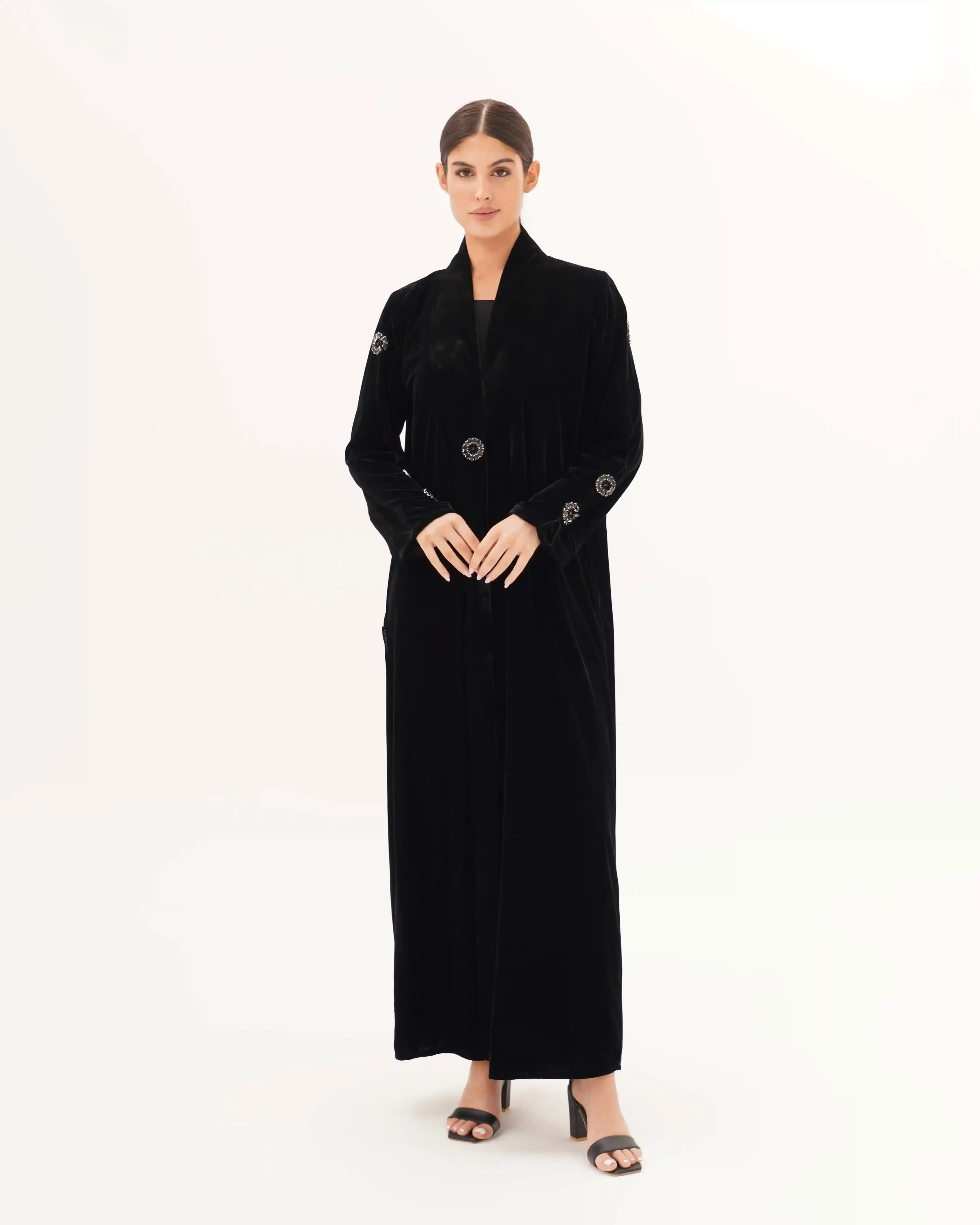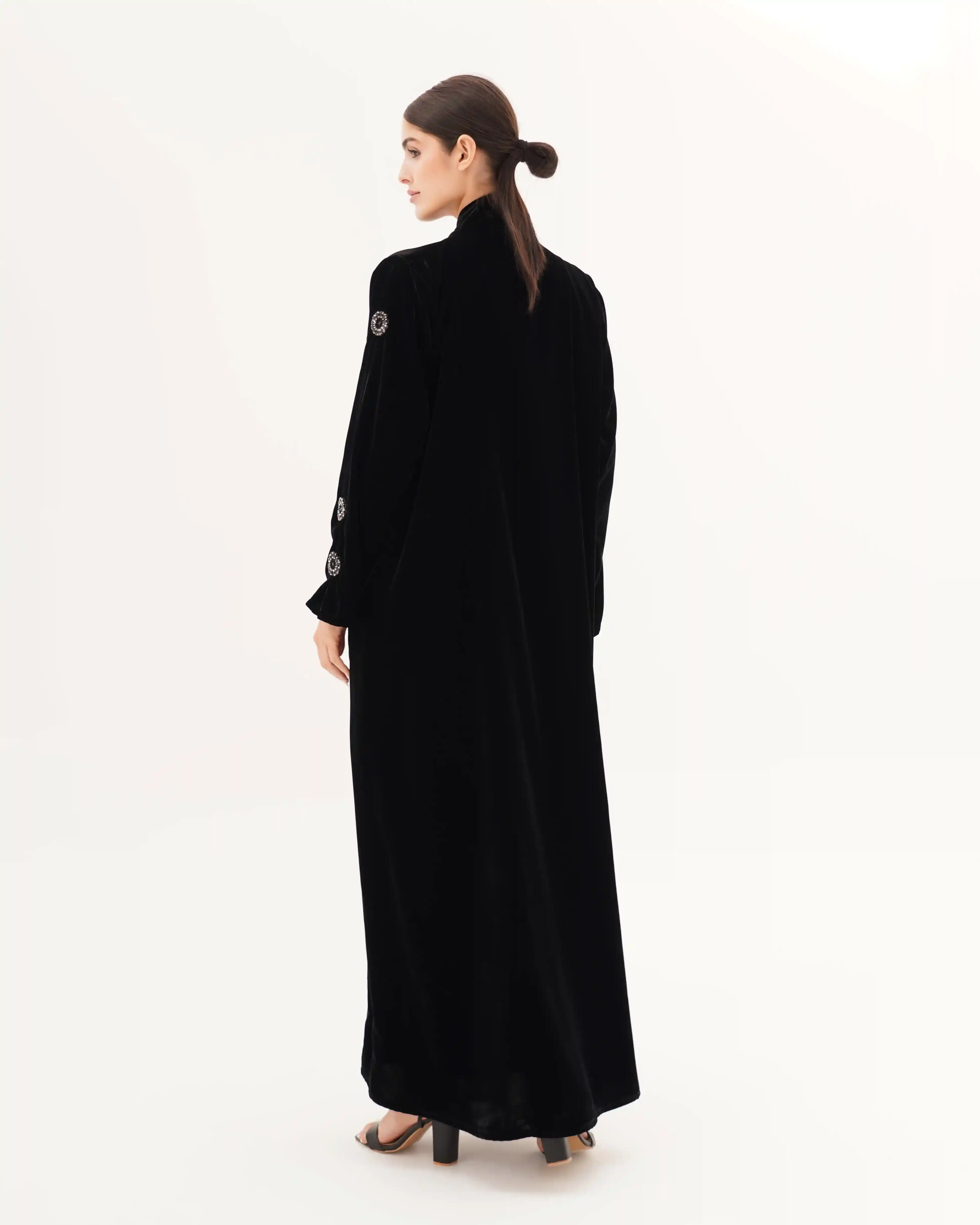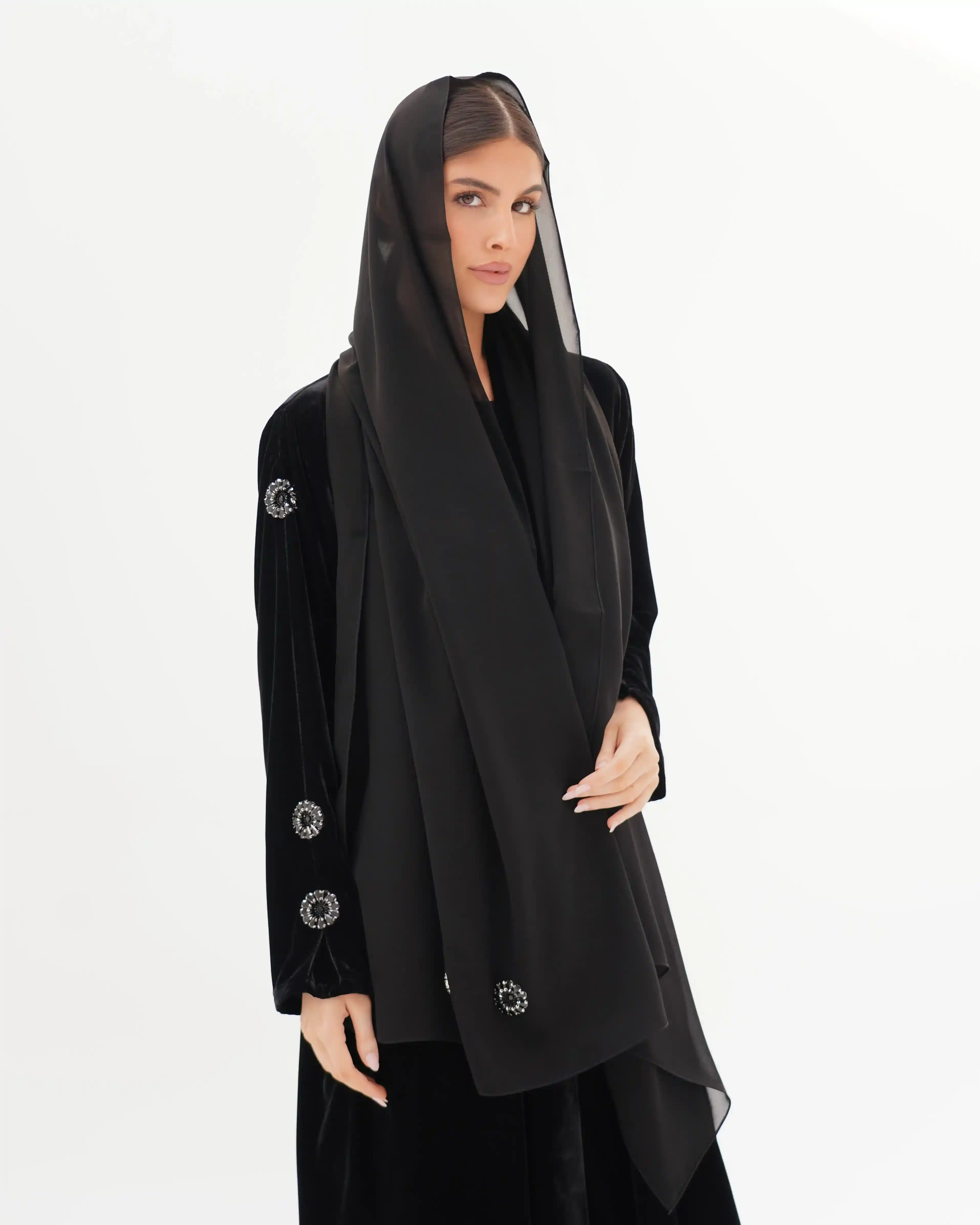 تصميم العباية يرتكز على البساطة الفاخرة بخطوط انسيابية وتفاصيل معدنية/كريستالية تضيف قيمة بصرية راقية دون مبالغة. صُنعت من قماش مخمل حرير بملمس مخملي ومتوسط الوزن. الأكمام تأتي بخط مستقيم ناعم يتزيّن بكريستالات دائرية موزعة بدقة لتمنح توازناً بصرياً وتحوّلها إلى عنصر جمالي بارز. الكريستالات المعدنية الداكنة بلمعتها الراقية تشبه نجمة أو زهرة صغيرة، فتمنح التصميم لمسة أشبه بالمجوهرات وتعكس هوية واضحة للعباية. أما الياقة المستقيمة البسيطة فتضفي مظهراً أنيقاً وتوجّه التركيز نحو تفاصيل الأكمام.
