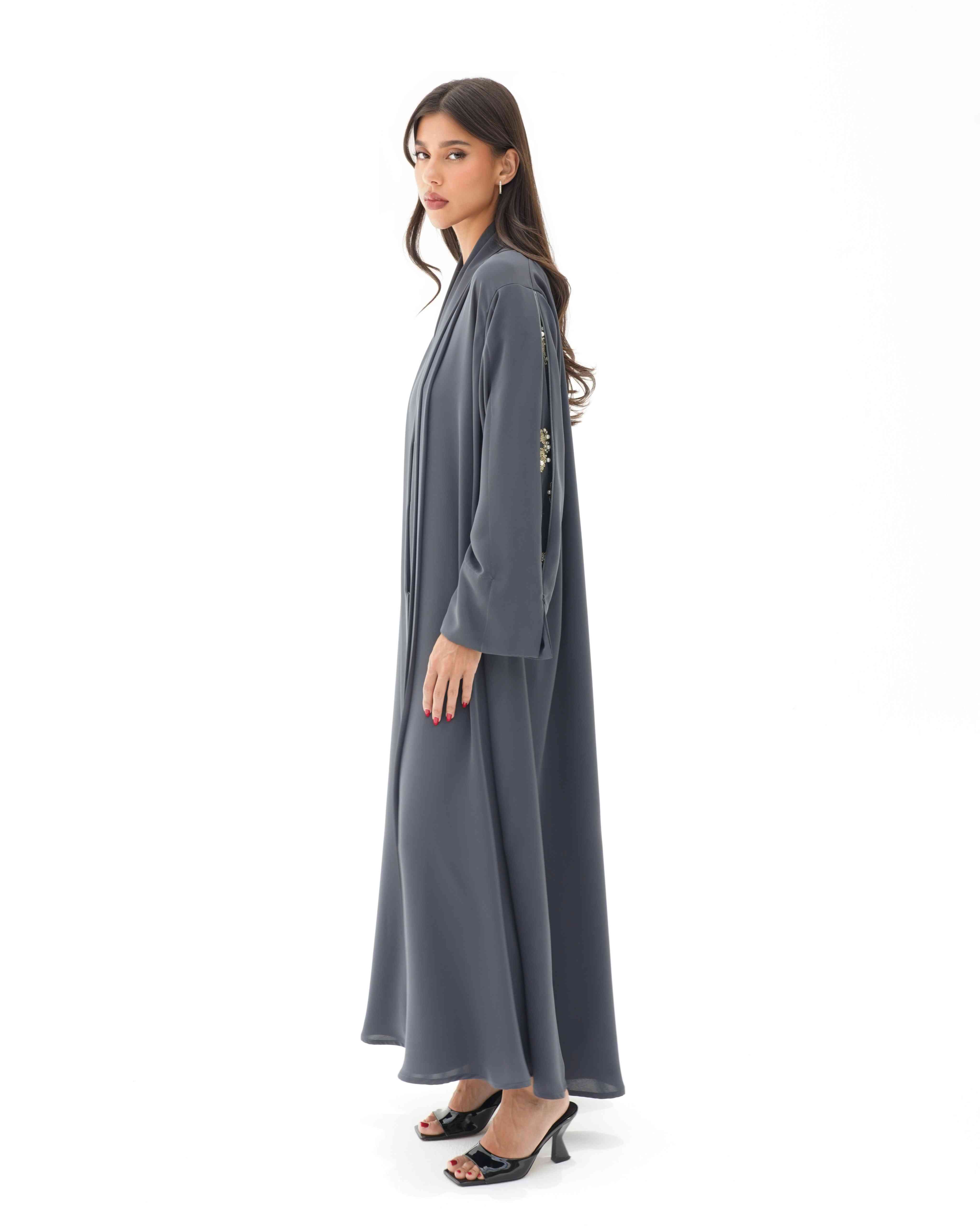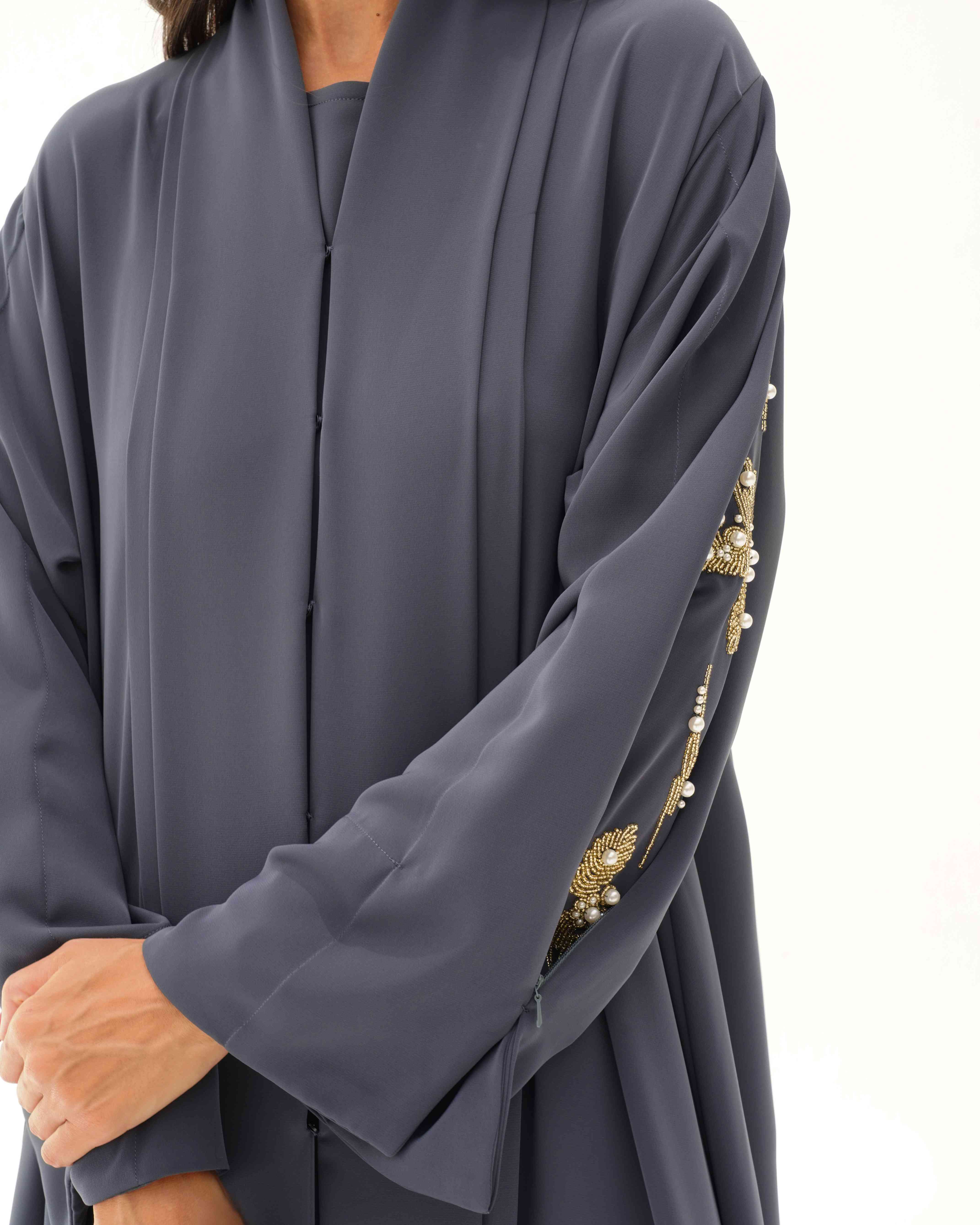 ستجذب هذه العباية الأنظار بفضل خامتها الفاخرة المصنوعة من نسيج الكريب الناعم والمنسدل، والذي جاء مصمما بطيات مزدوجة في شريط القماش الملتف من خلف الرقبة الى اسفل ذيل العباية، وصُنع الجزء الخاص بالكم بطيات طولية في تصميم غرافيكي بداخلها تطريز بالخرز الذهبي مدموج بشكل منثور وعشوائي بحبات من اللؤلؤ الابيض وسحاب لمظهر مزدوج لعباية سادة وانيقة لاطلالة يومية عند اغلاق السحاب ومظهر مسائي اخر انيق عند فتح السحاب.