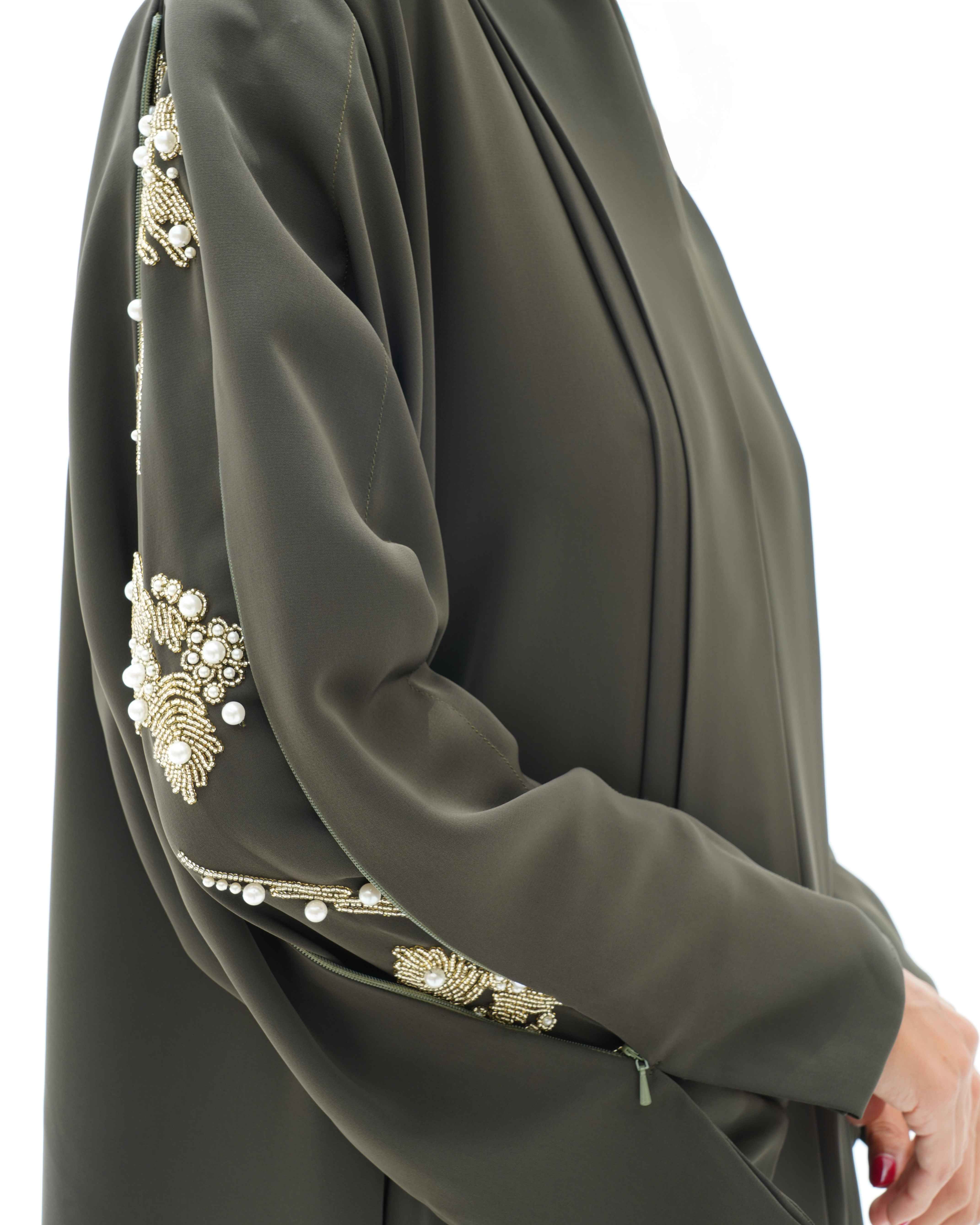 • عباية مشتغلة يدويا بالخرز الذهبي واللؤلؤ عند فتح السحاب من الاكتاف الى نهاية الاكمام.