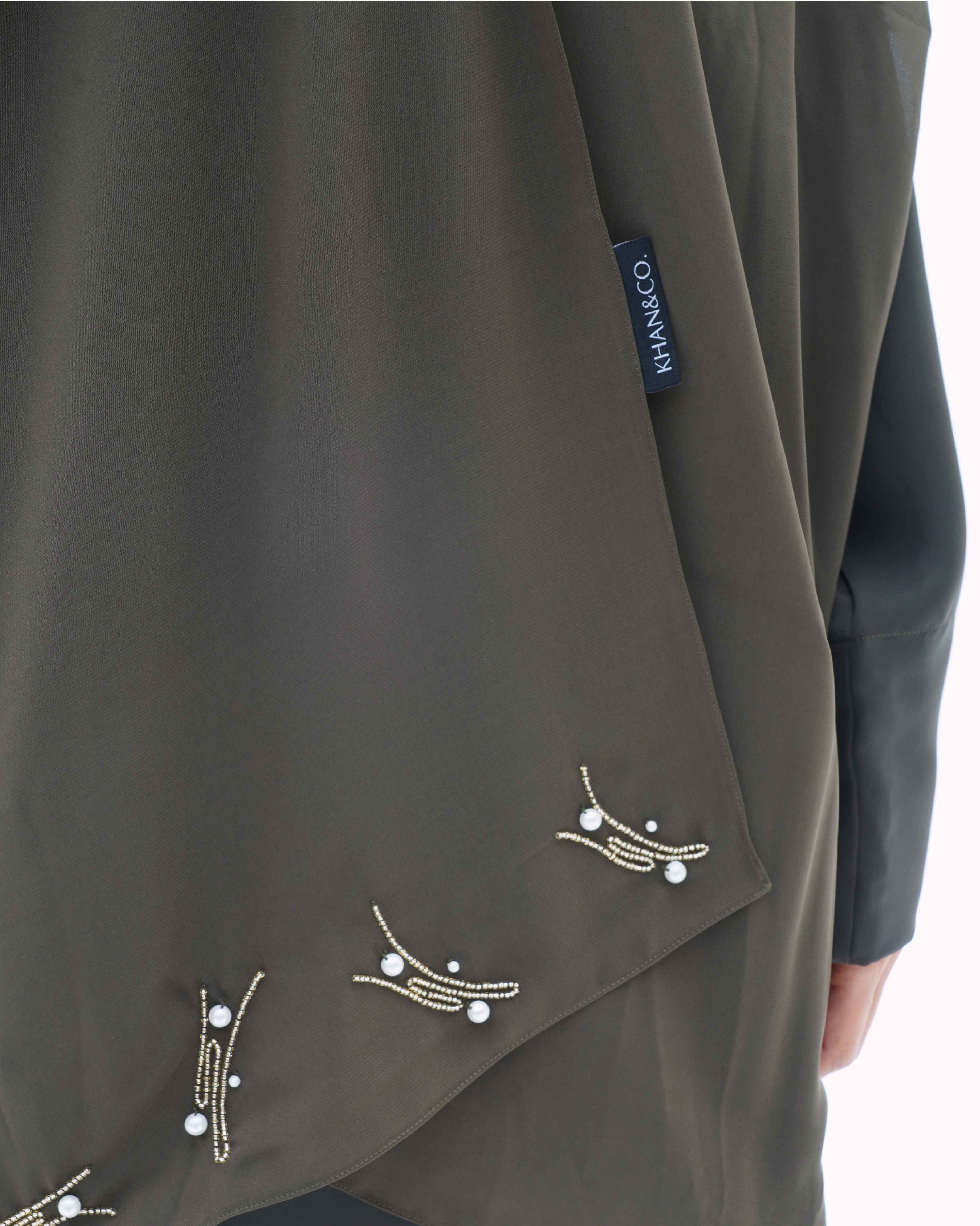 ستجذب هذه العباية الأنظار بفضل خامتها الفاخرة المصنوعة من نسيج الكريب الناعم والمنسدل، والذي جاء مصمما بطيات مزدوجة في شريط القماش الملتف من خلف الرقبة الى اسفل ذيل العباية، وصُنع الجزء الخاص بالكم بطيات طولية في تصميم غرافيكي بداخلها تطريز بالخرز الذهبي مدموج بشكل منثور وعشوائي بحبات من اللؤلؤ الابيض وسحاب لمظهر مزدوج لعباية سادة وانيقة لاطلالة يومية عند اغلاق السحاب ومظهر مسائي اخر انيق عند فتح السحاب.