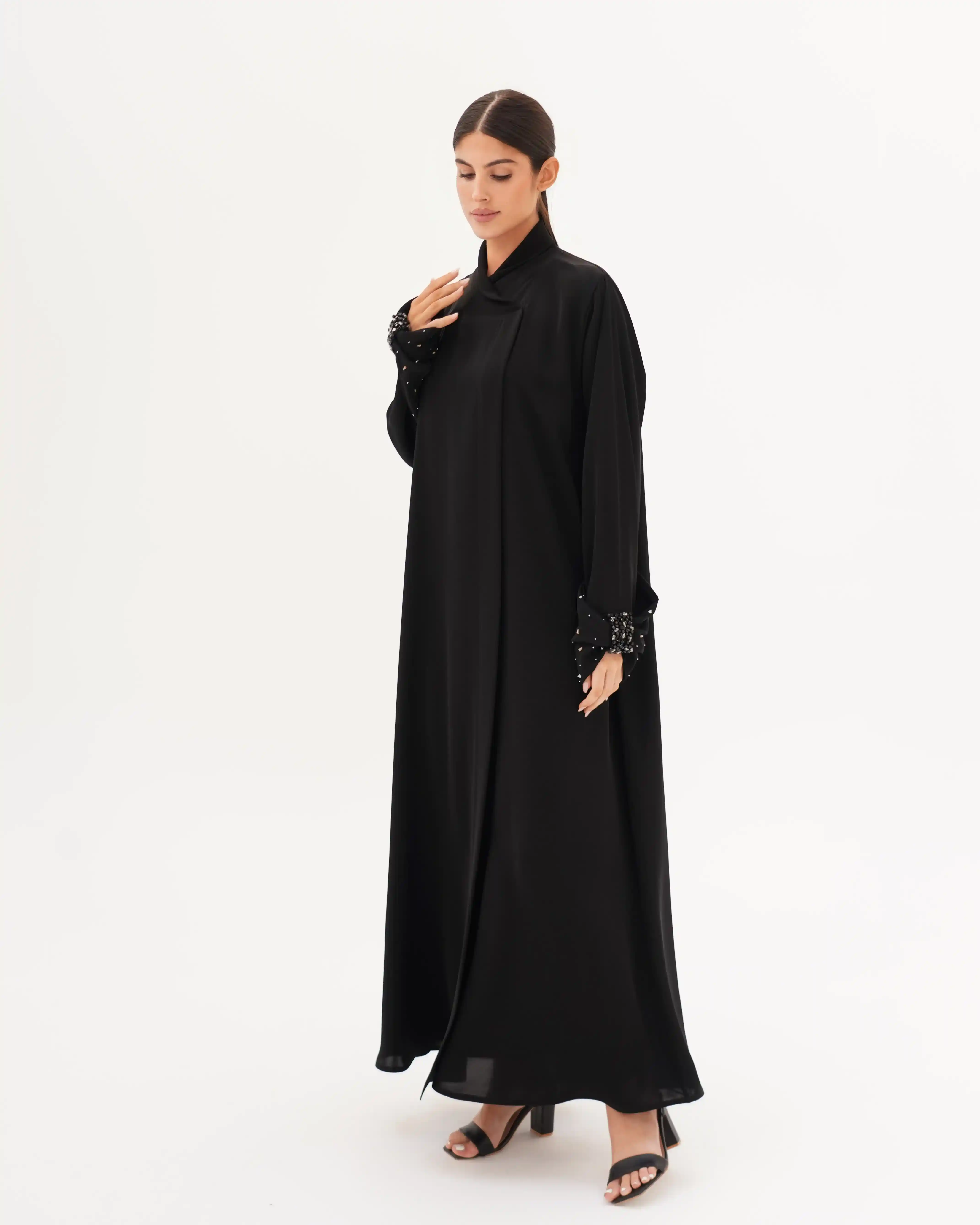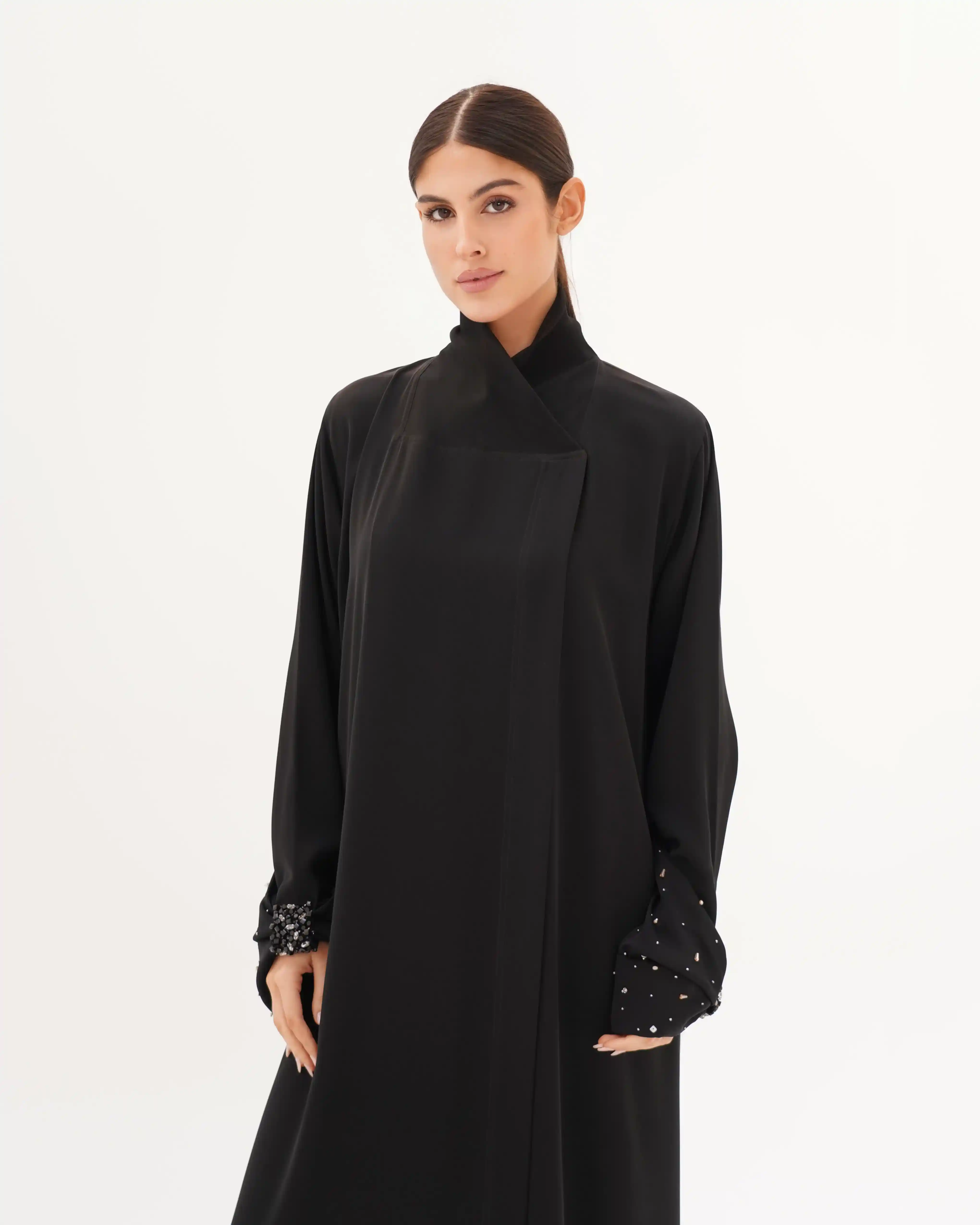 عباية بقصّة مستقيمة تنسدل بانسيابية متوازنة، مصنوعة من قماش البريميوم كريب بملمس ناعم وحركة طبيعية. تأتي بياقة هاي نيك أنيقة بخط نظيف يعزز توازن التصميم، بينما تبرز الأكمام بتكوين واسع ينتهي بتجميع ناعم عند المعصم، مزين بخرز أسود كثيف موزع بدقة يضفي عمقًا بصريًا راقيًا. تكتمل القطعة بطرحة من نفس القماش، مشتغلة بانتثار خفيف للخرز على الأطراف، لتجسّد وحدة التصميم وأناقة التفاصيل المدروسة.