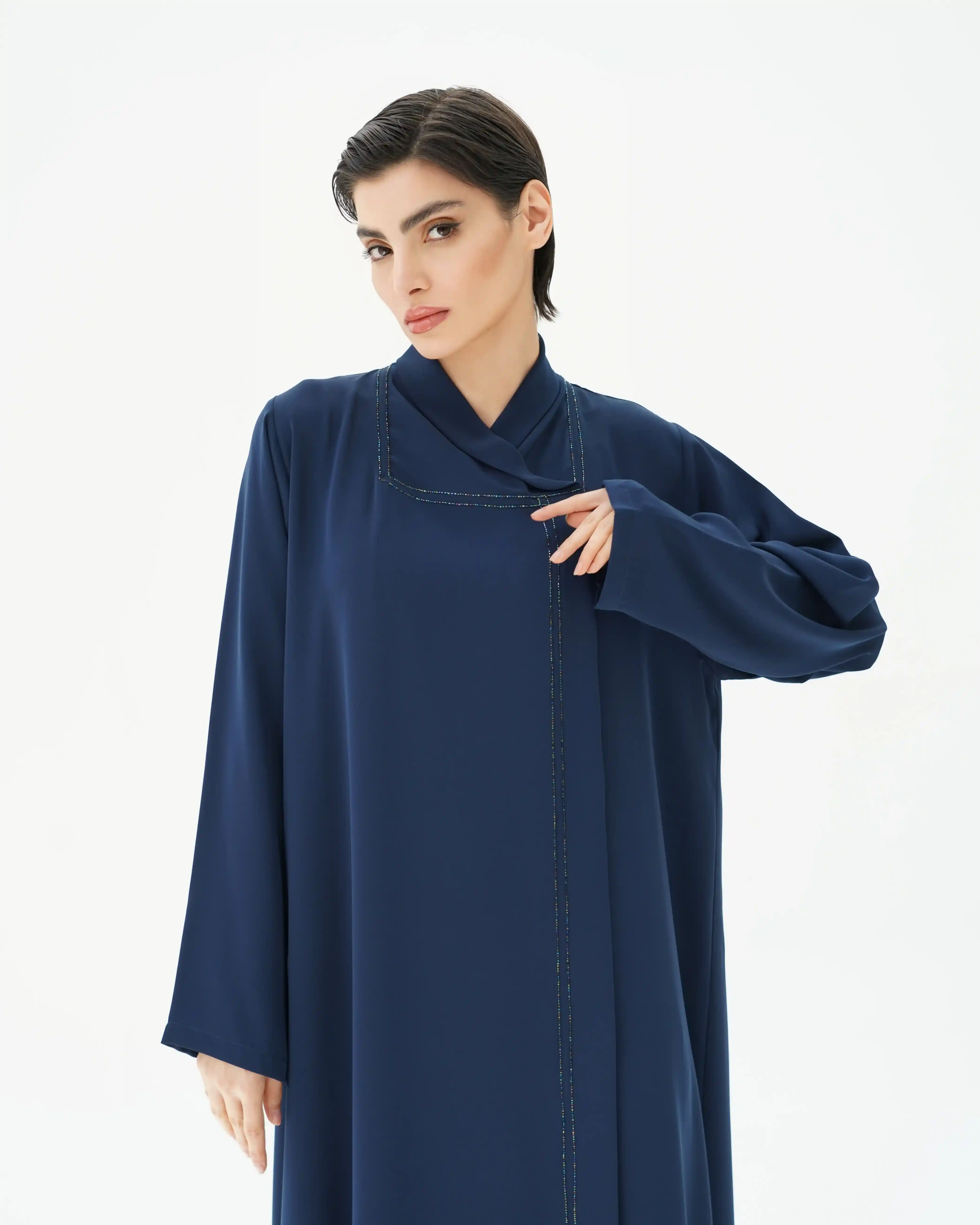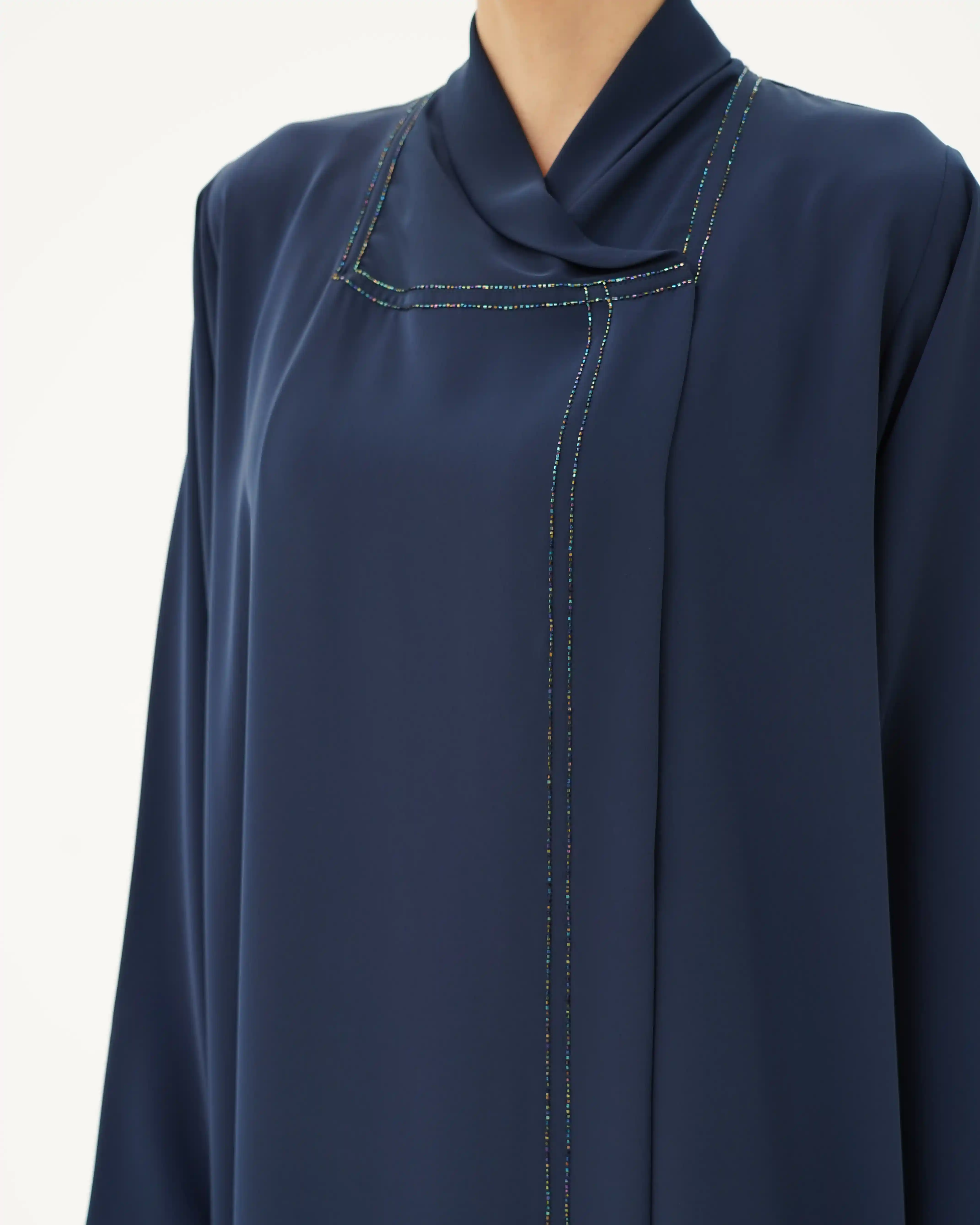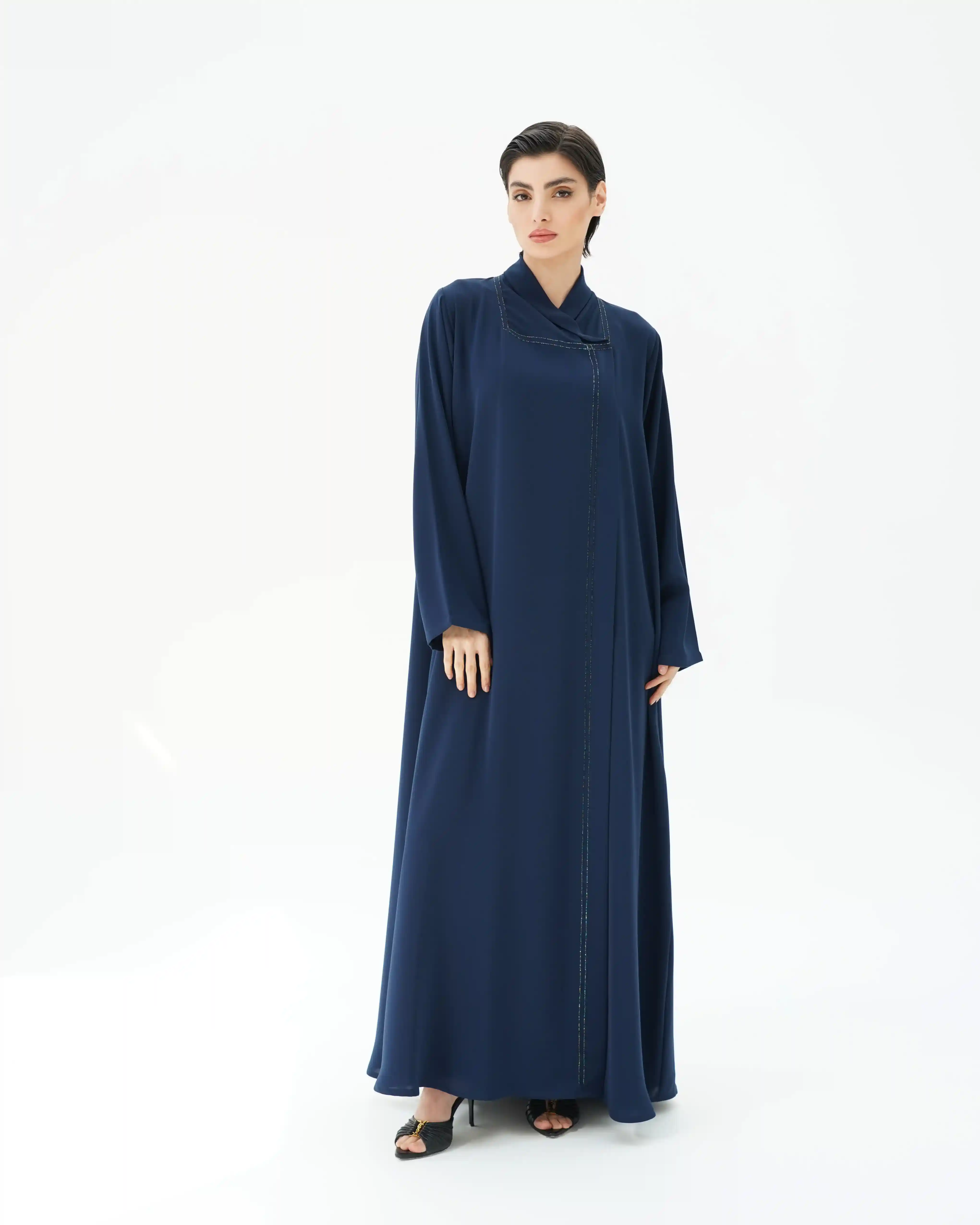 عباية بقصّة مستقيمة وانسيابية ناعمة، مصنوعة من قماش البريميوم كريب بملمس ناعم وحركة طبيعية. تتميّز بياقة هاي نيك متقاطعة تنسدل بخفة حول الرقبة، مع خطوط دقيقة من الخرز اللامع تمتد من خلف شريط الرقبة حتى ذيل العباية. الأكمام بتصميم نظيف دون خرز، والطرحة من نفس القماش، مع خرز رفيع على الأطراف, بتناغم هادئ يعكس أسلوب .KHAN&CO المعماري المختزل.