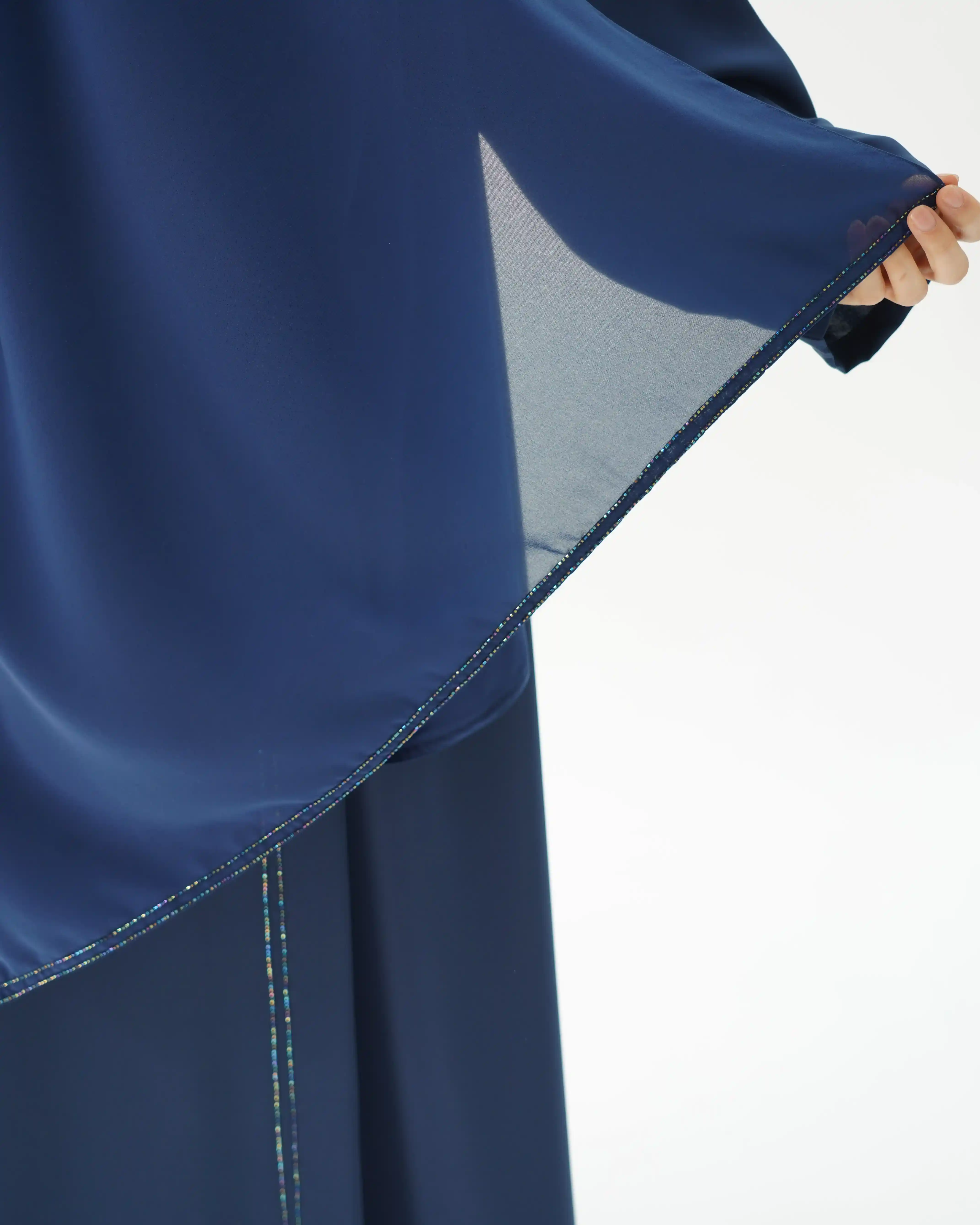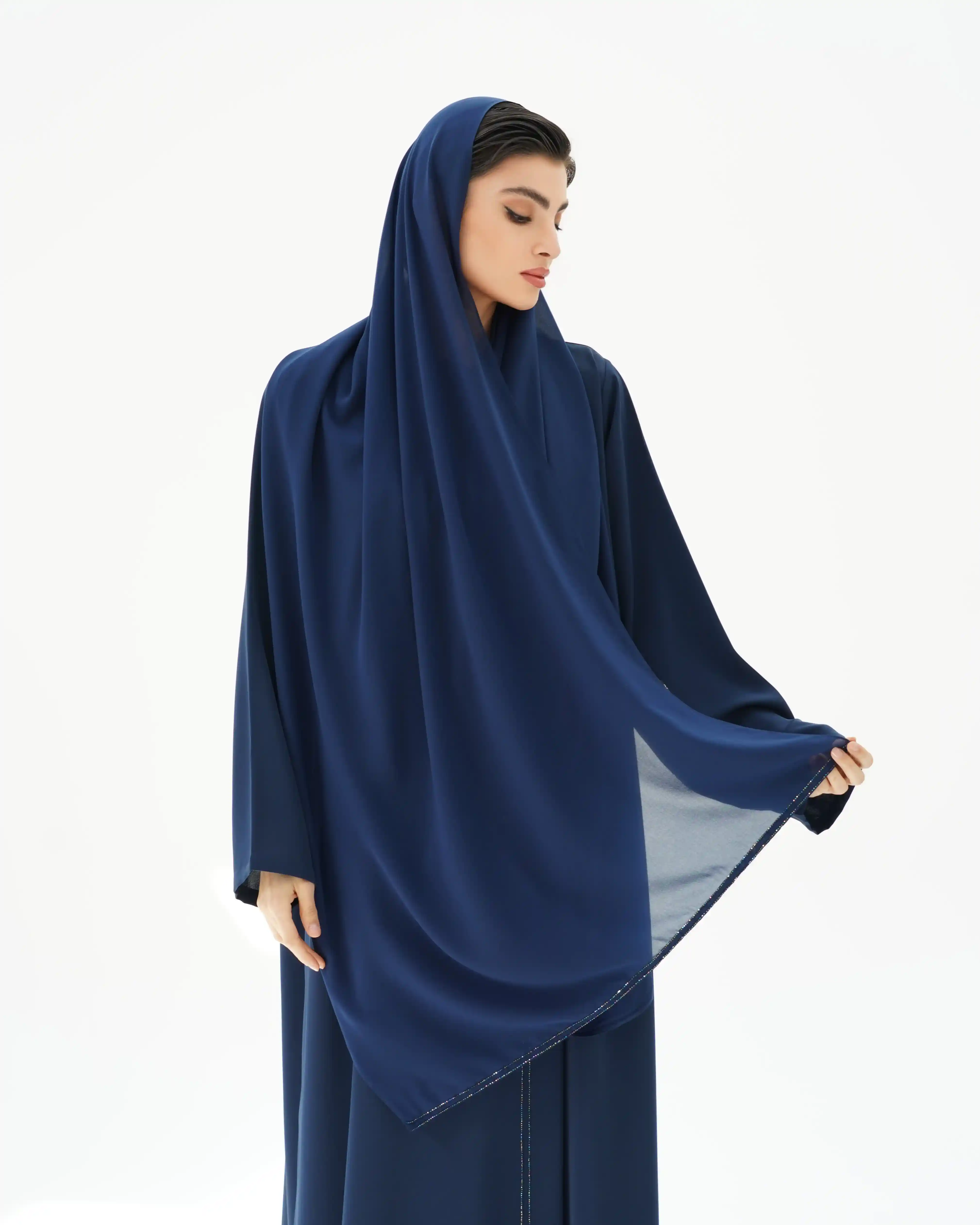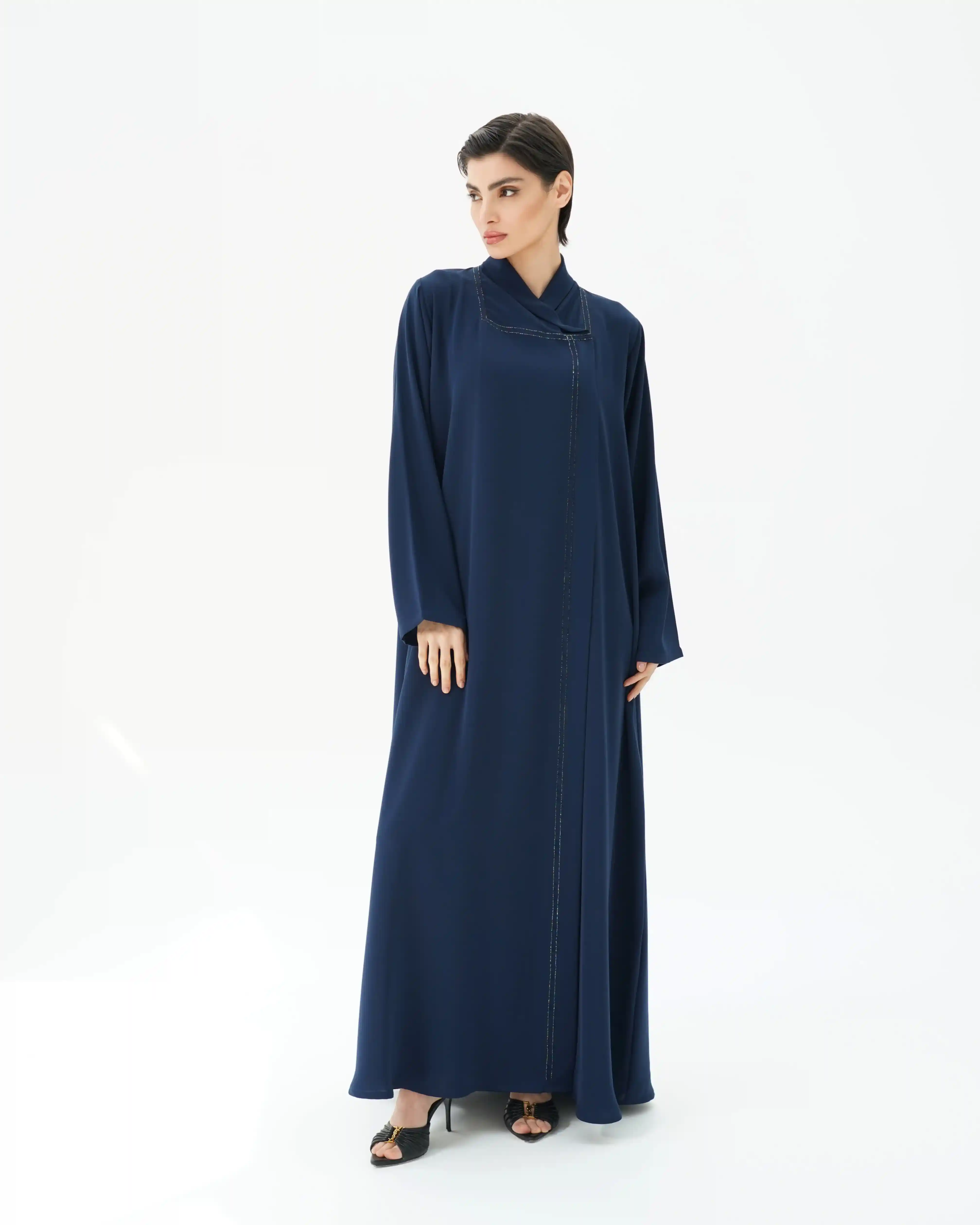 عباية بقصّة مستقيمة وانسيابية ناعمة، مصنوعة من قماش البريميوم كريب بملمس ناعم وحركة طبيعية. تتميّز بياقة هاي نيك متقاطعة تنسدل بخفة حول الرقبة، مع خطوط دقيقة من الخرز اللامع تمتد من خلف شريط الرقبة حتى ذيل العباية. الأكمام بتصميم نظيف دون خرز، والطرحة من نفس القماش، مع خرز رفيع على الأطراف, بتناغم هادئ يعكس أسلوب .KHAN&CO المعماري المختزل.