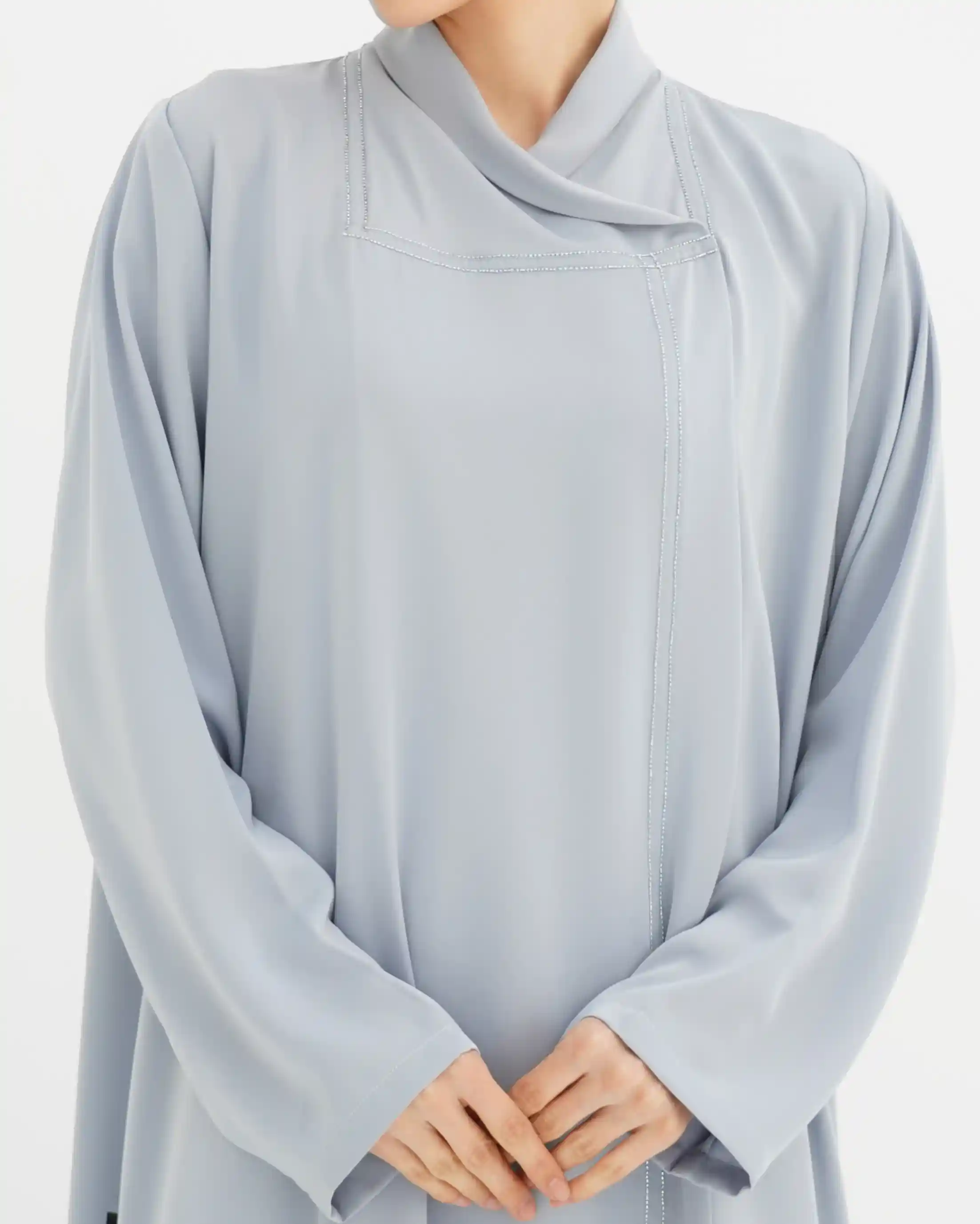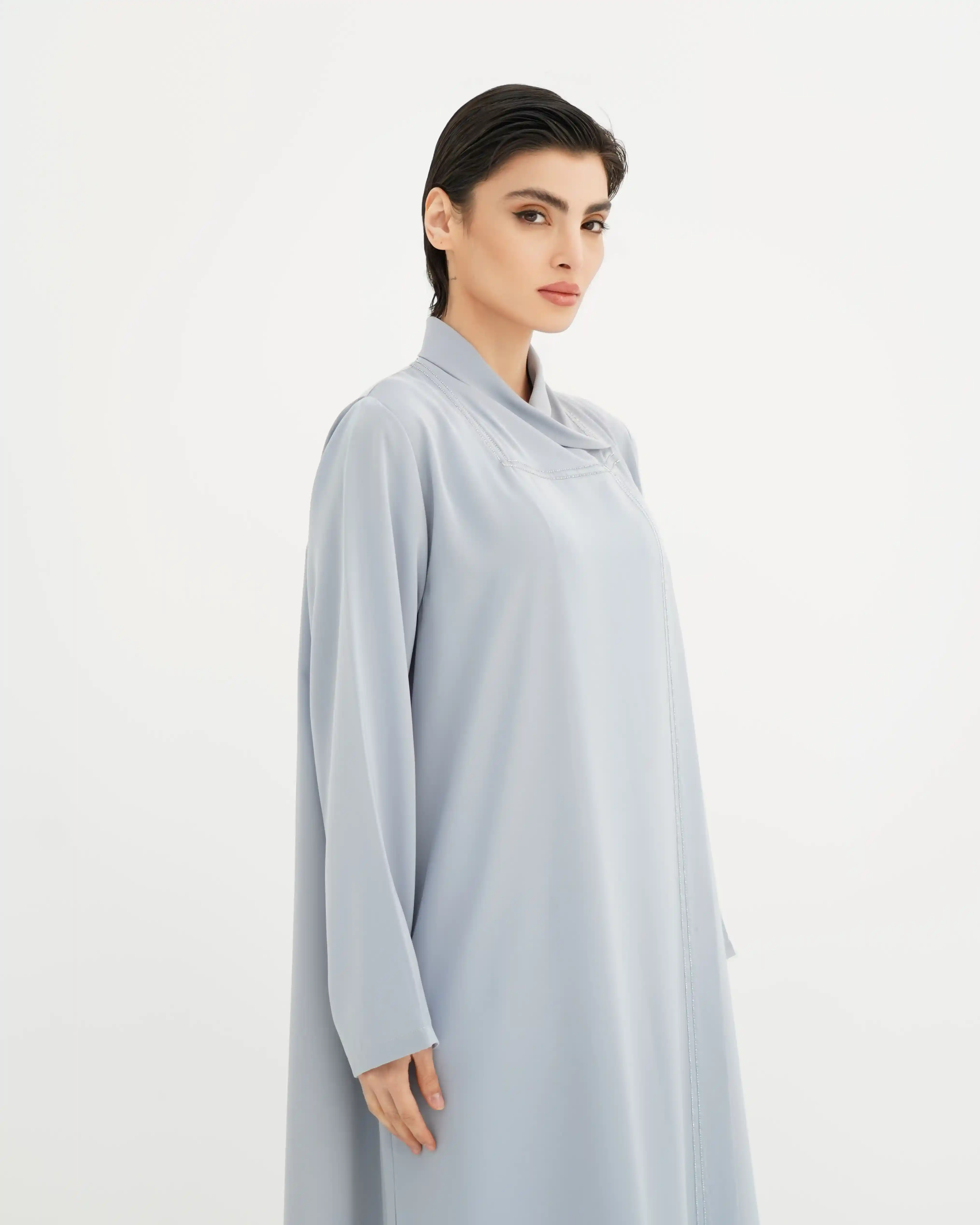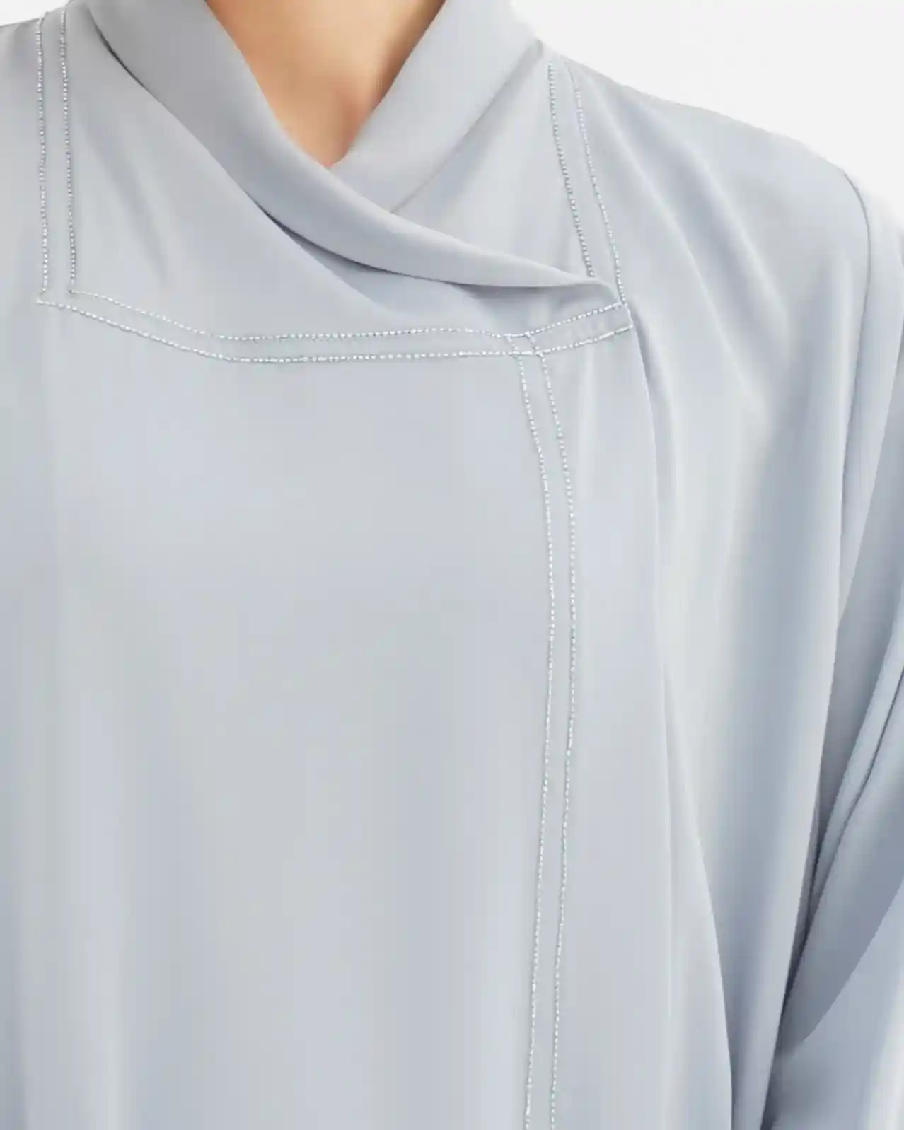 عباية بقصّة مستقيمة وانسيابية ناعمة، مصنوعة من قماش البريميوم كريب بملمس ناعم وحركة طبيعية. تتميّز بياقة هاي نيك متقاطعة تنسدل بخفة حول الرقبة، مع خطوط دقيقة من الخرز اللامع تمتد من خلف شريط الرقبة حتى ذيل العباية. الأكمام بتصميم نظيف دون خرز، والطرحة من نفس القماش، مع خرز رفيع على الأطراف, بتناغم هادئ يعكس أسلوب .KHAN&CO المعماري المختزل.