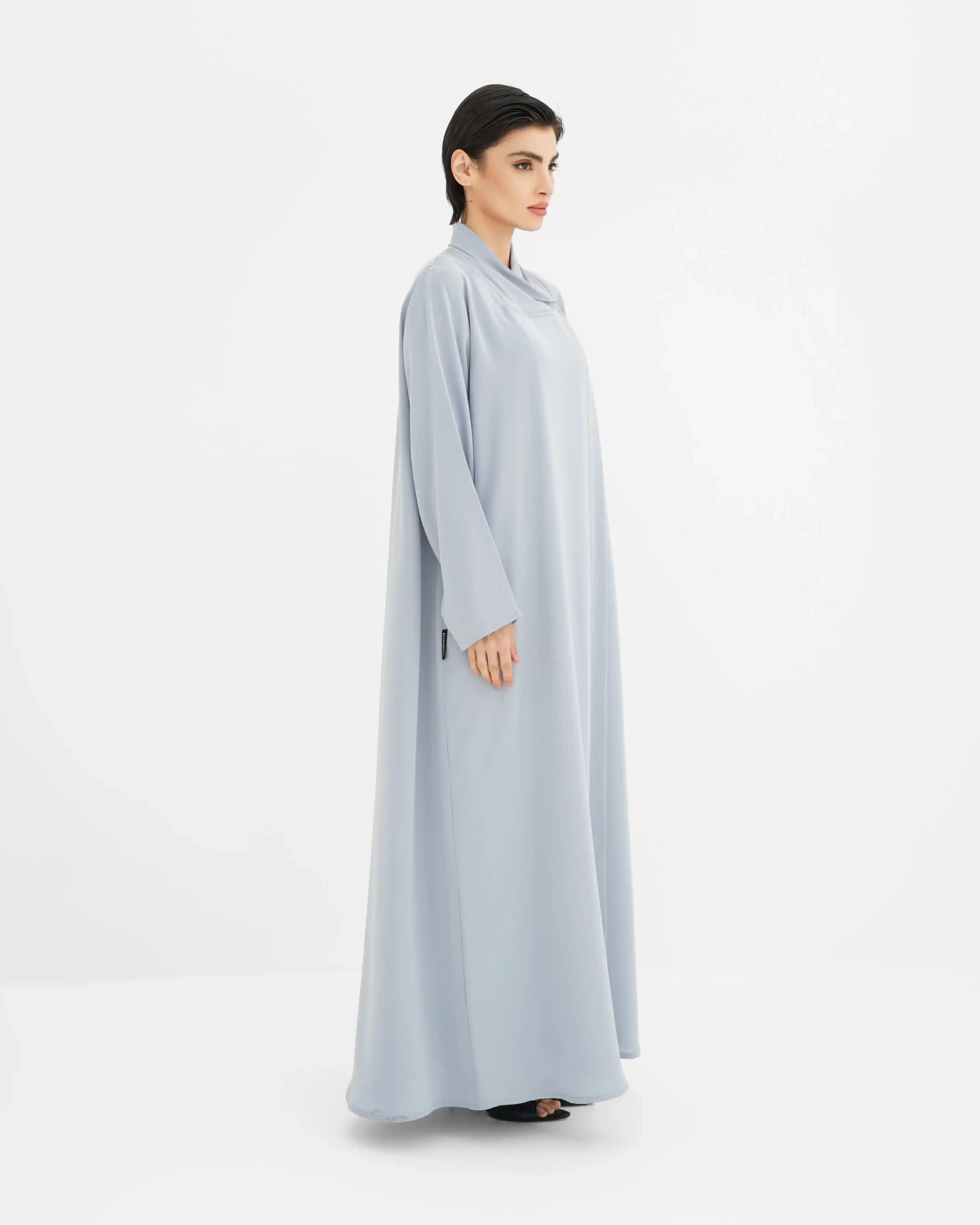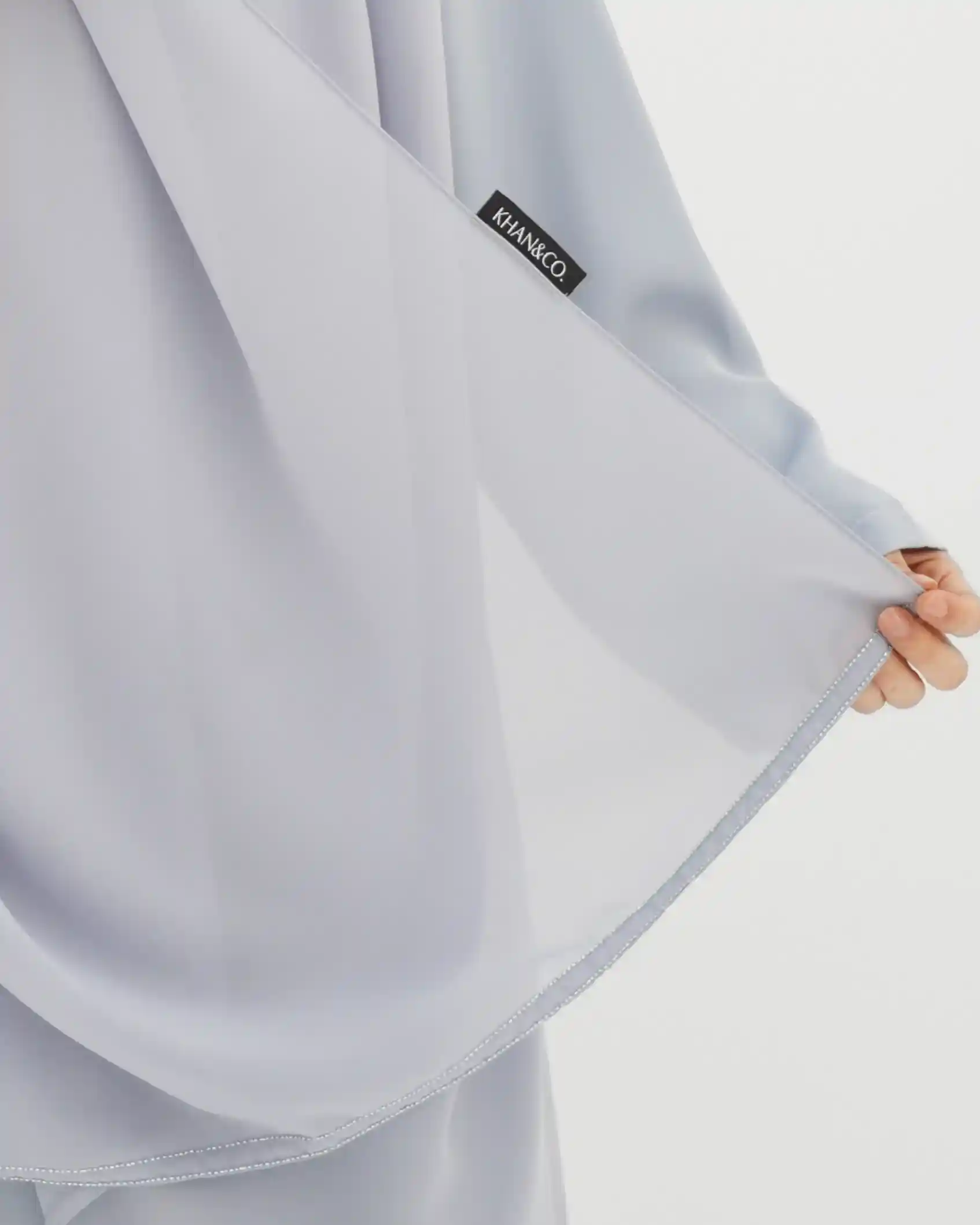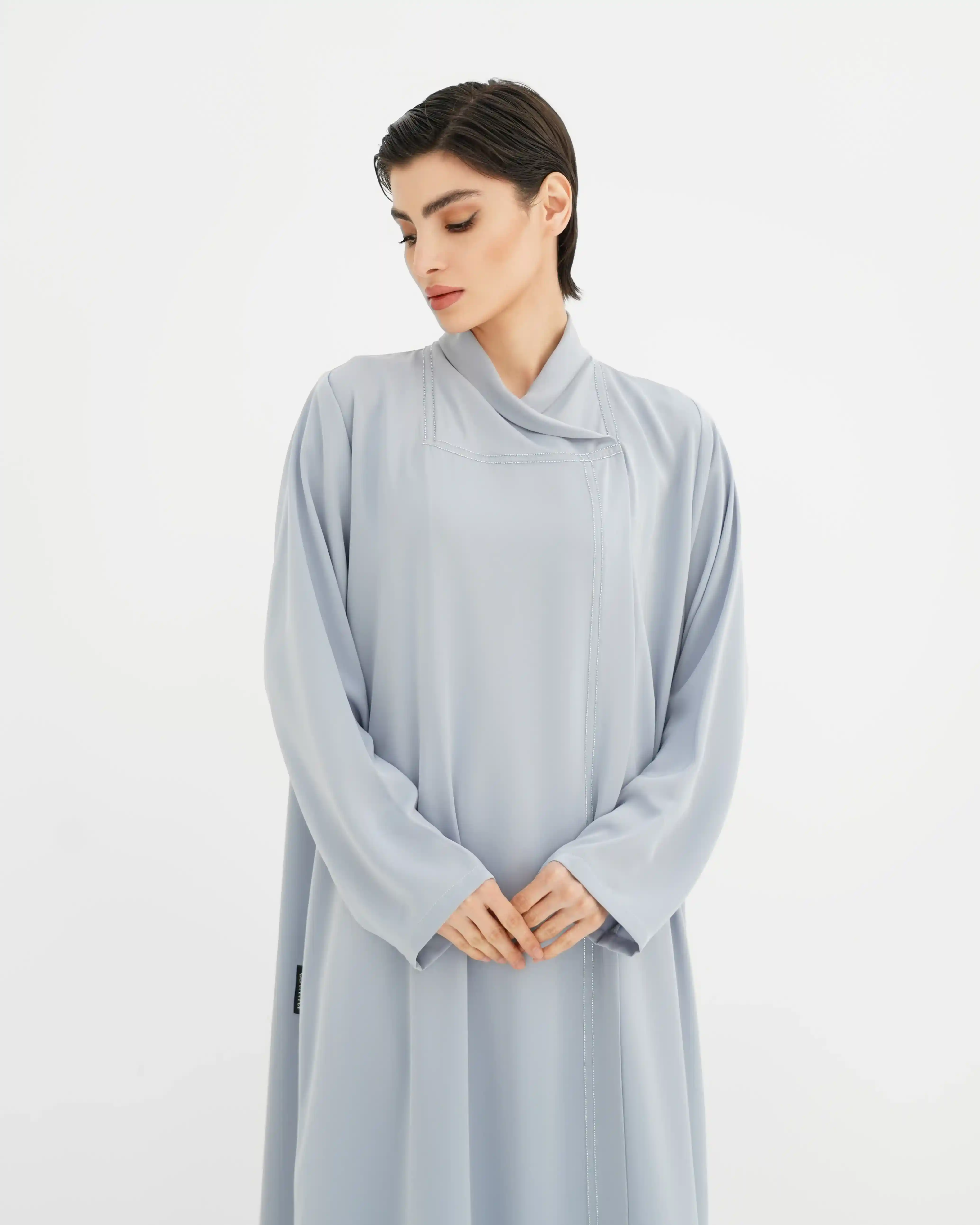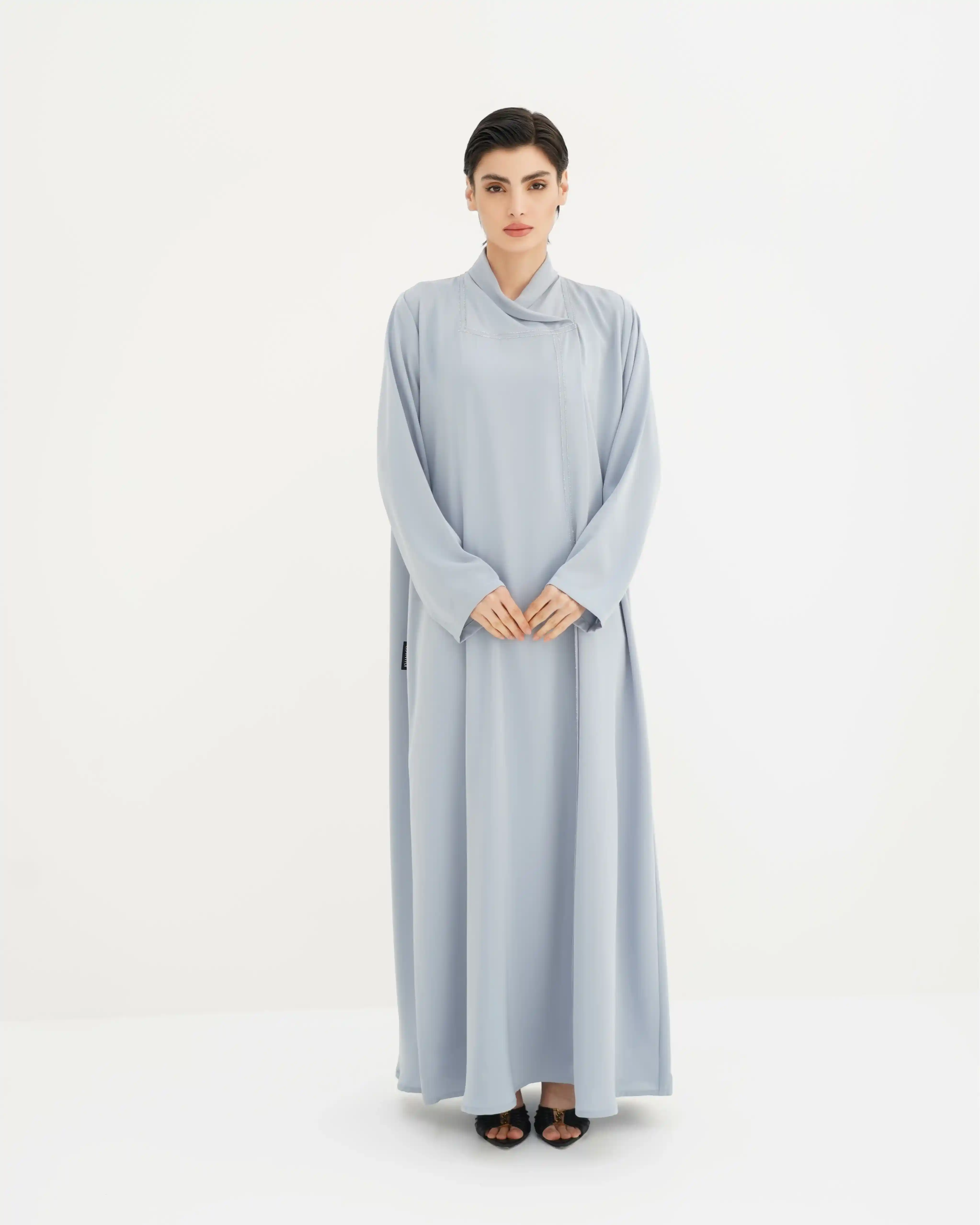 عباية بقصّة مستقيمة وانسيابية ناعمة، مصنوعة من قماش البريميوم كريب بملمس ناعم وحركة طبيعية. تتميّز بياقة هاي نيك متقاطعة تنسدل بخفة حول الرقبة، مع خطوط دقيقة من الخرز اللامع تمتد من خلف شريط الرقبة حتى ذيل العباية. الأكمام بتصميم نظيف دون خرز، والطرحة من نفس القماش، مع خرز رفيع على الأطراف, بتناغم هادئ يعكس أسلوب .KHAN&CO المعماري المختزل.
