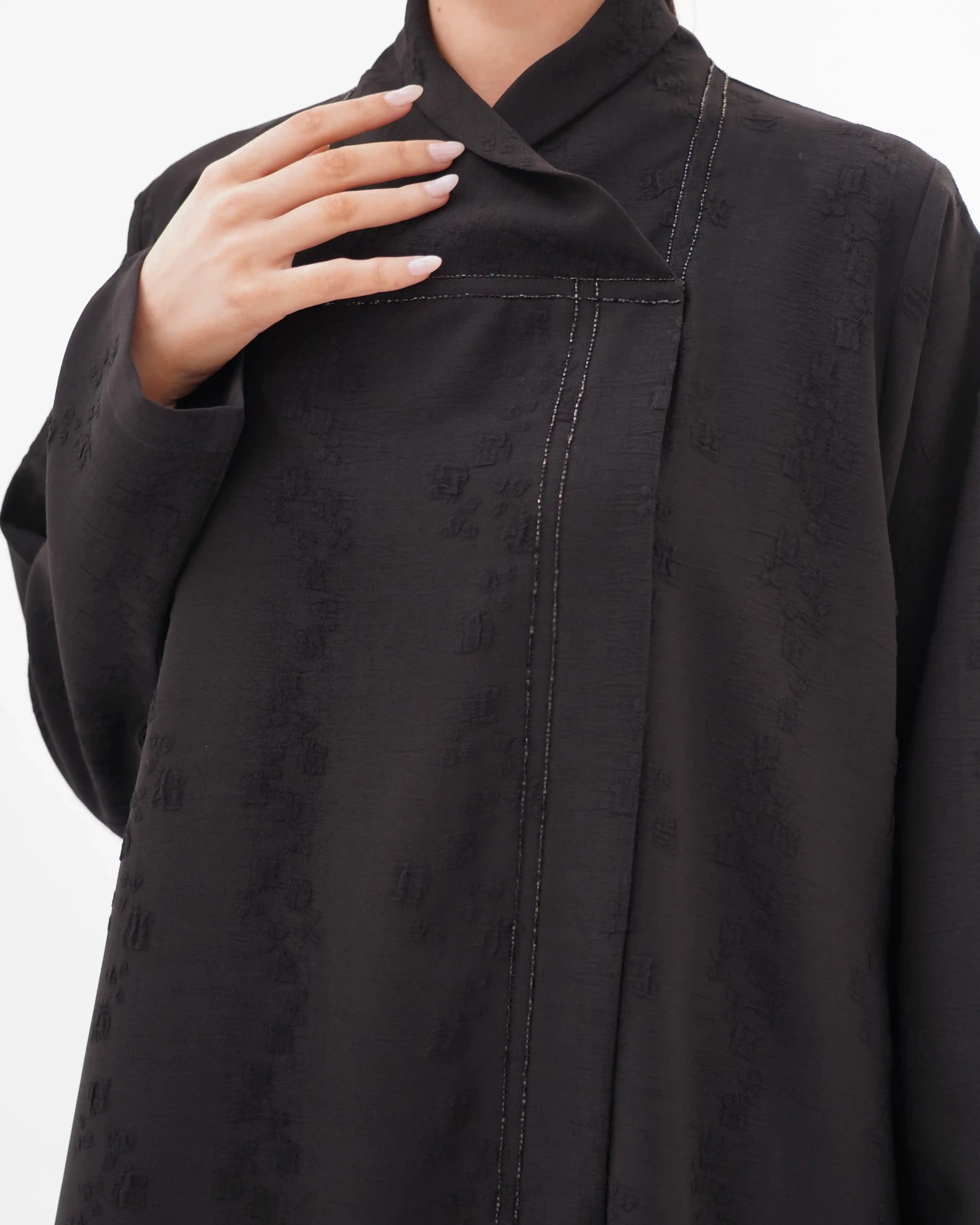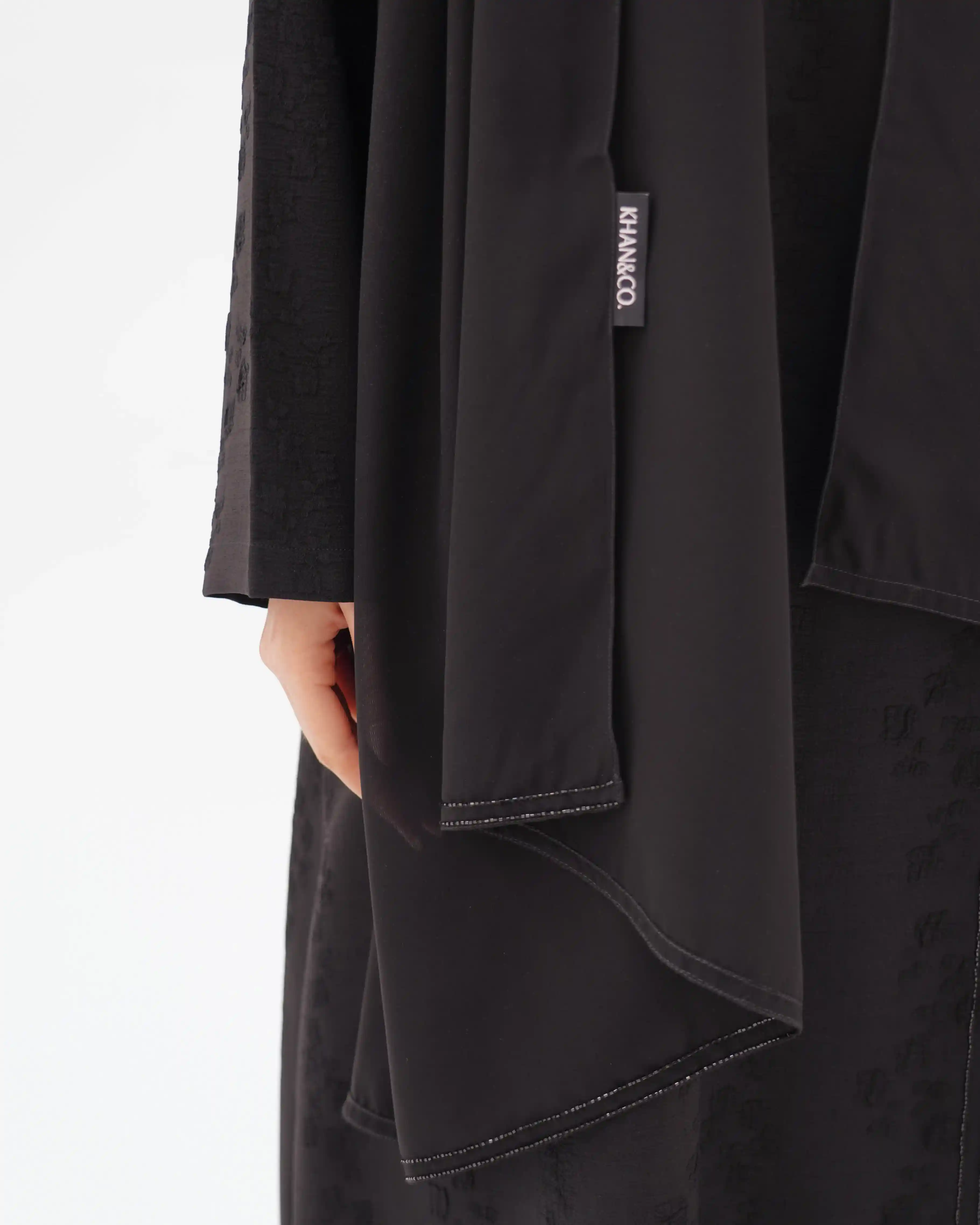 عباية بقصّة مستقيمة وانسيابية ناعمة، مصنوعة من قماش سوفت فوكورو الأسود بتدلي أنيق. تتميّز بياقة هاي نيك متقاطعة تنسدل بخفة حول الرقبة، مع خطوط دقيقة من الخرز الأسود اللامع تمتد من خلف شريط الرقبة حتى ذيل العباية. الأكمام بتصميم نظيف دون خرز، والطرحة من نفس القماش مع خرز رفيع على الأطراف، بتناغم هادئ يعكس أسلوب .KHAN&CO المعماري المختزل.