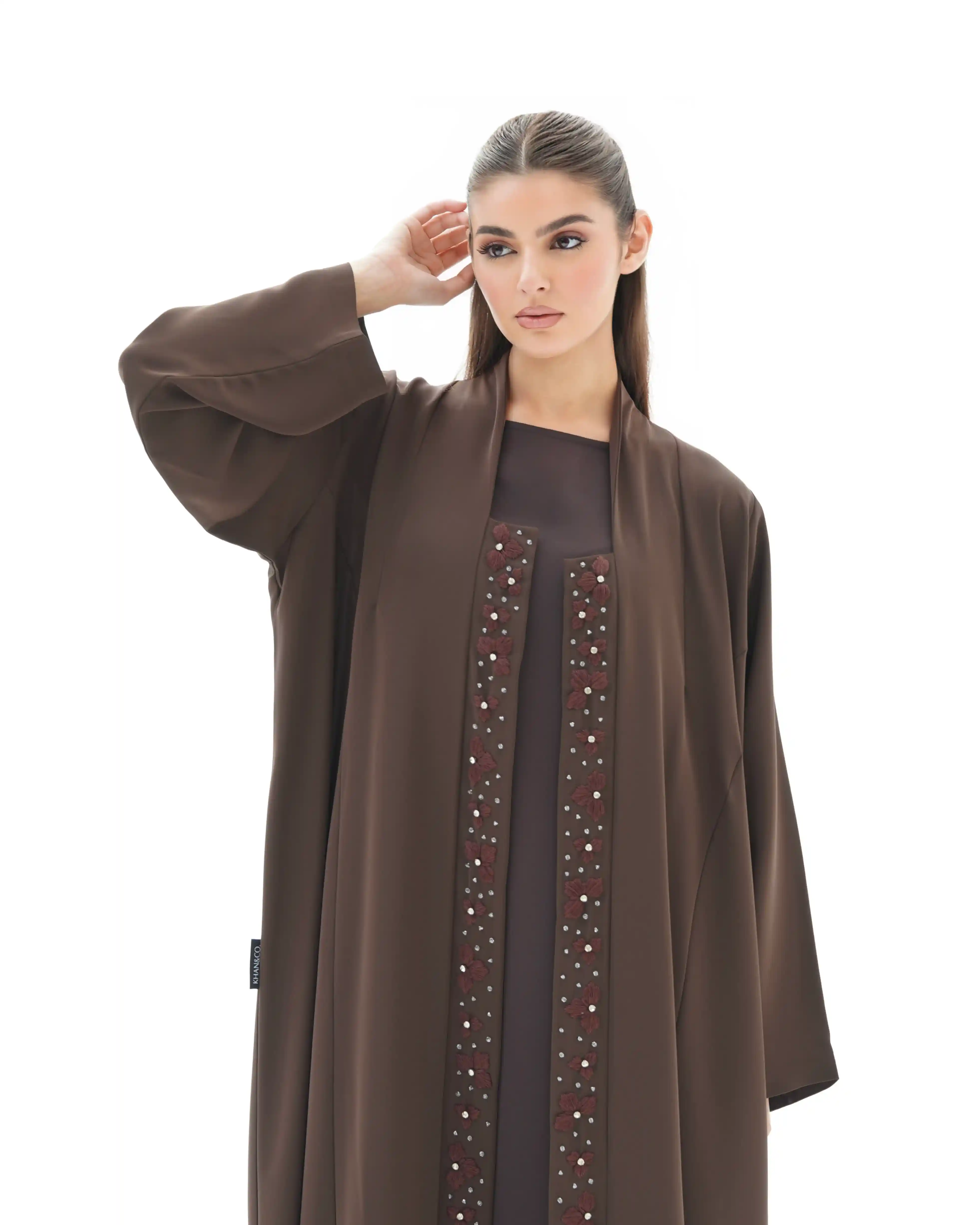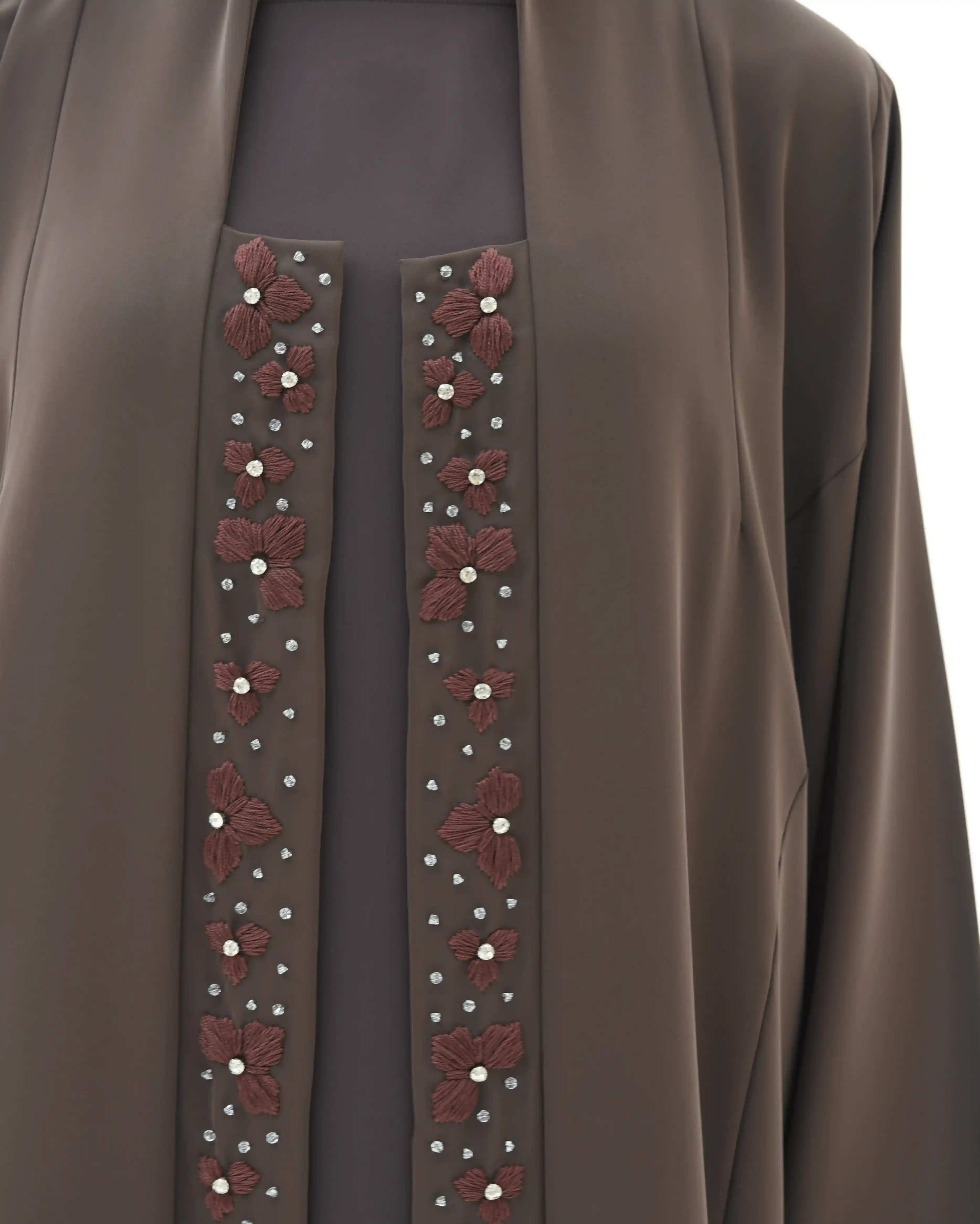 • تطريز يدوي أنيق بزهور حريرية بلون بني، مزدانة بخرز فضي لامع ينساب عمودياً.