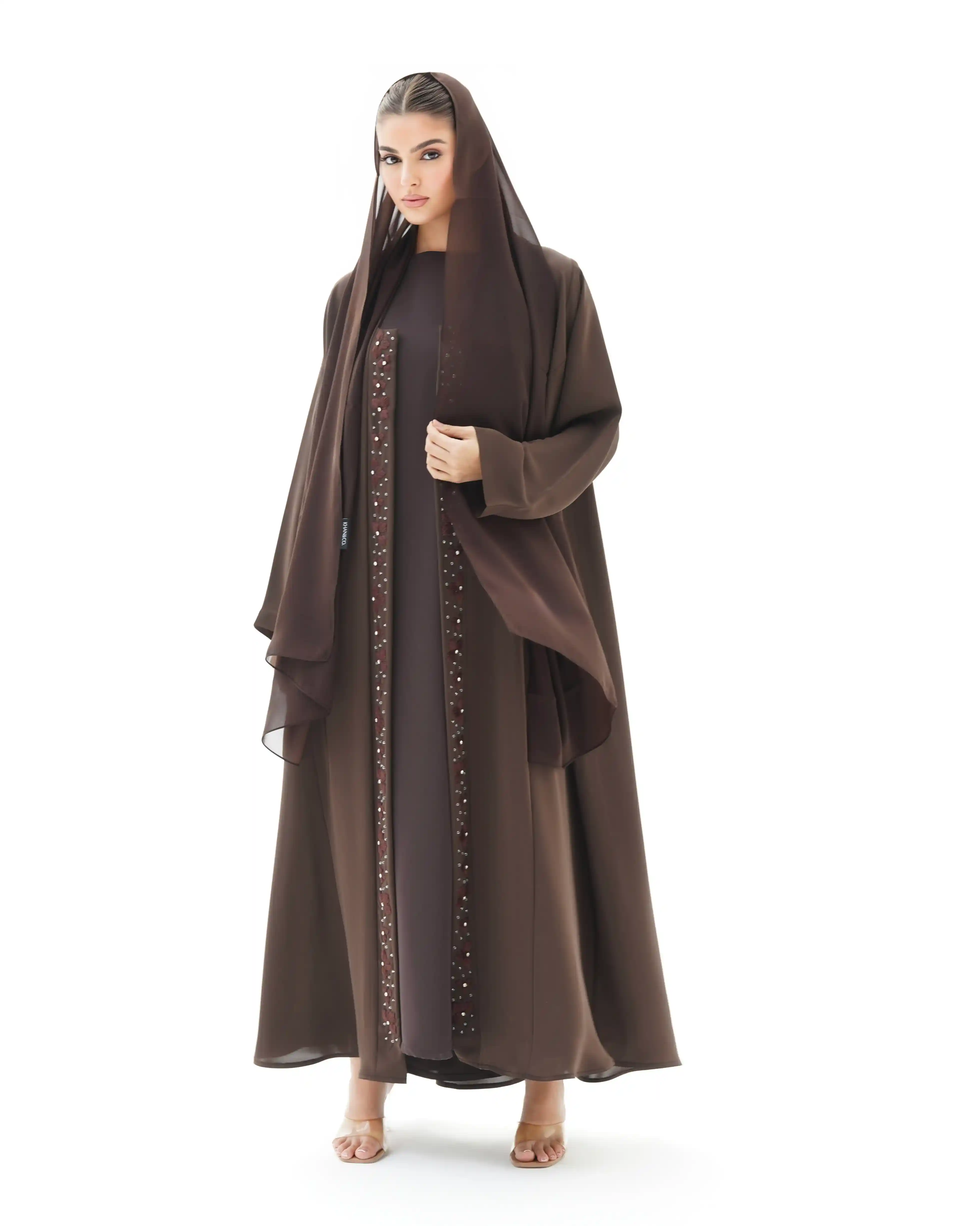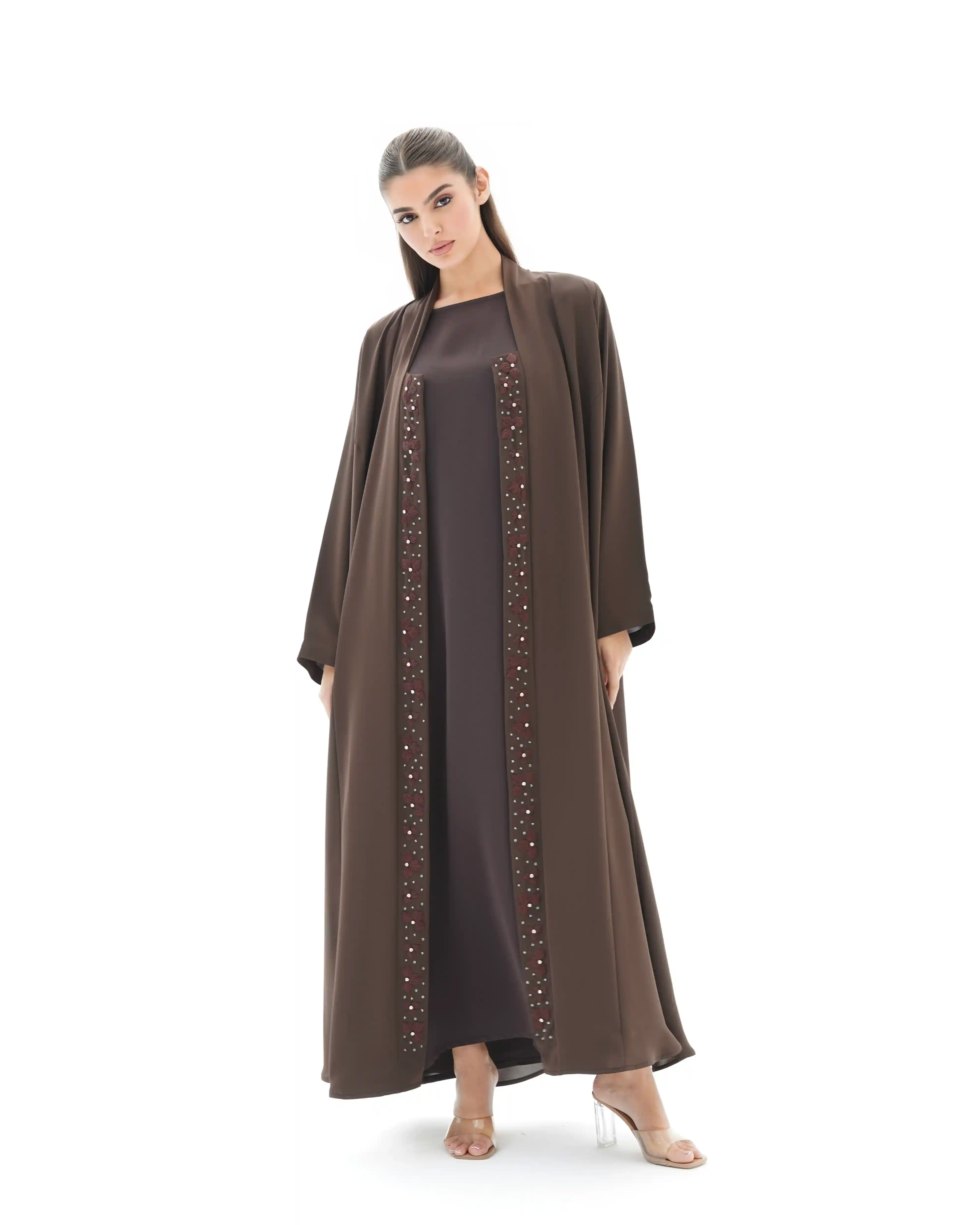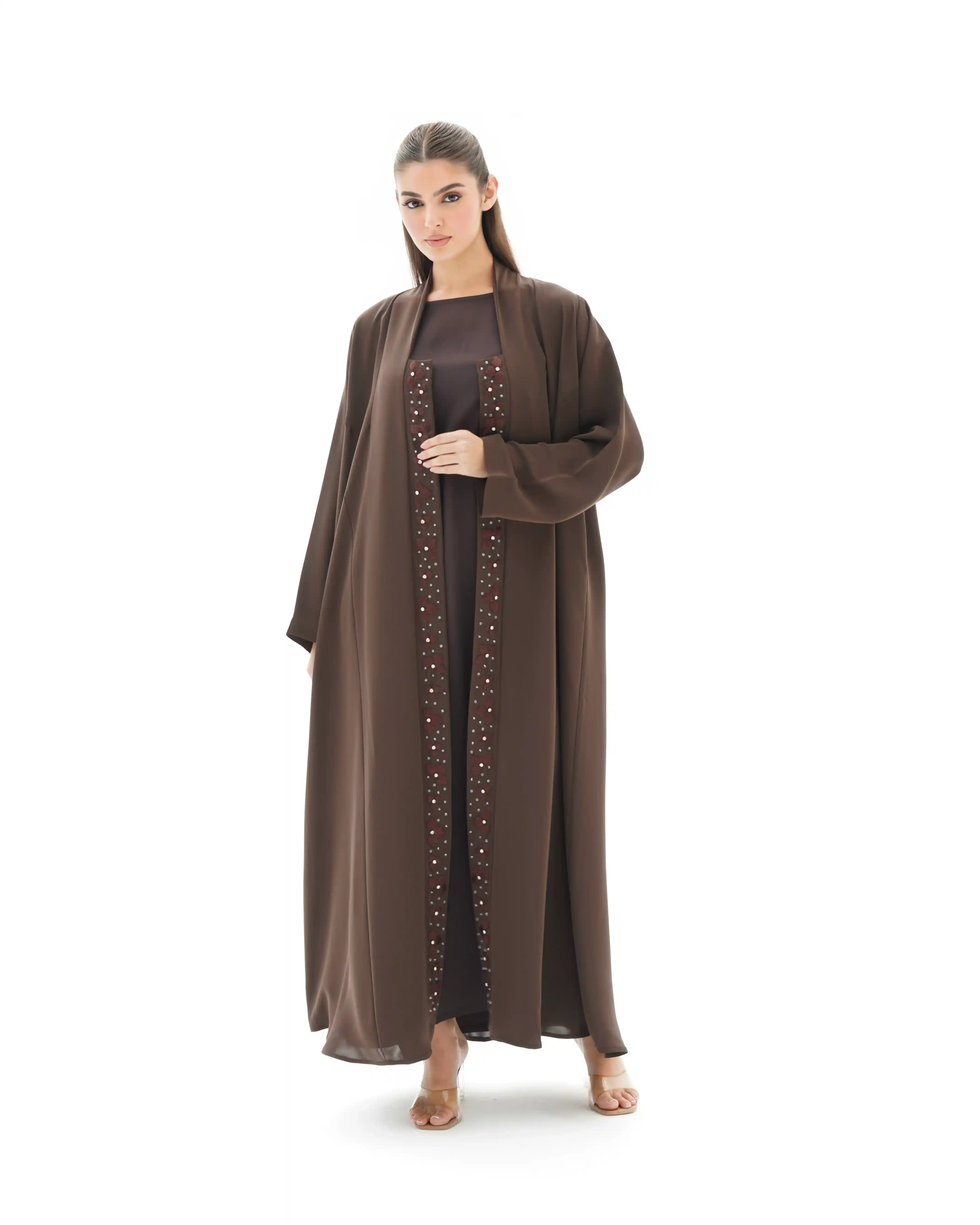 • اللون بني كامل قماش العباية.