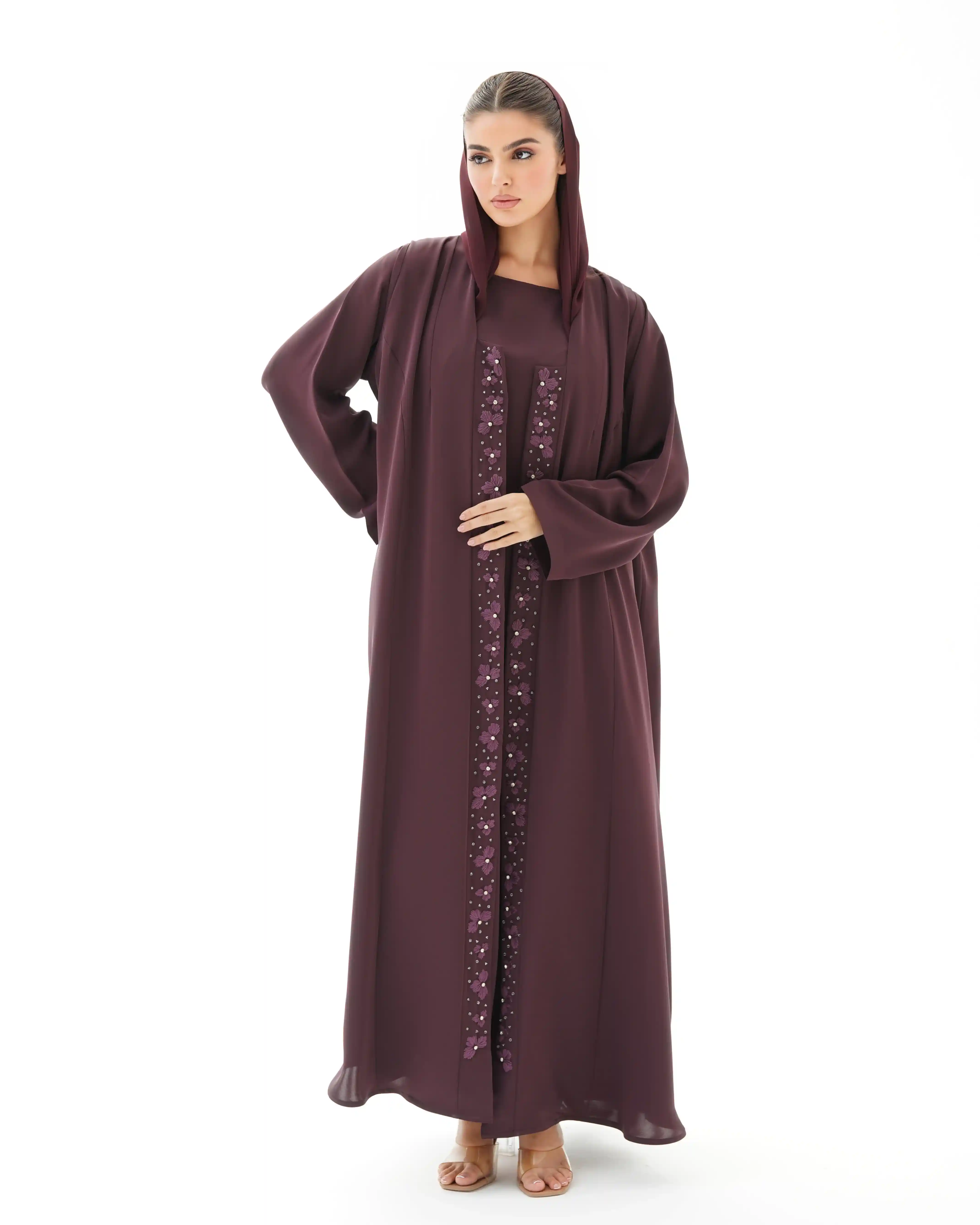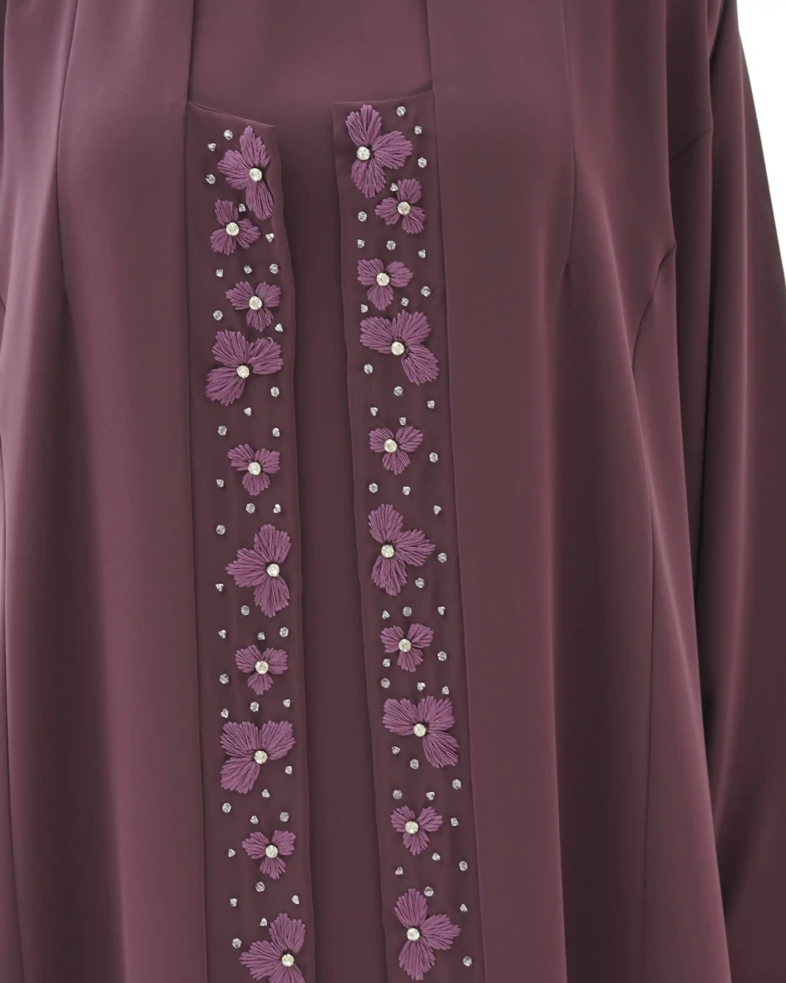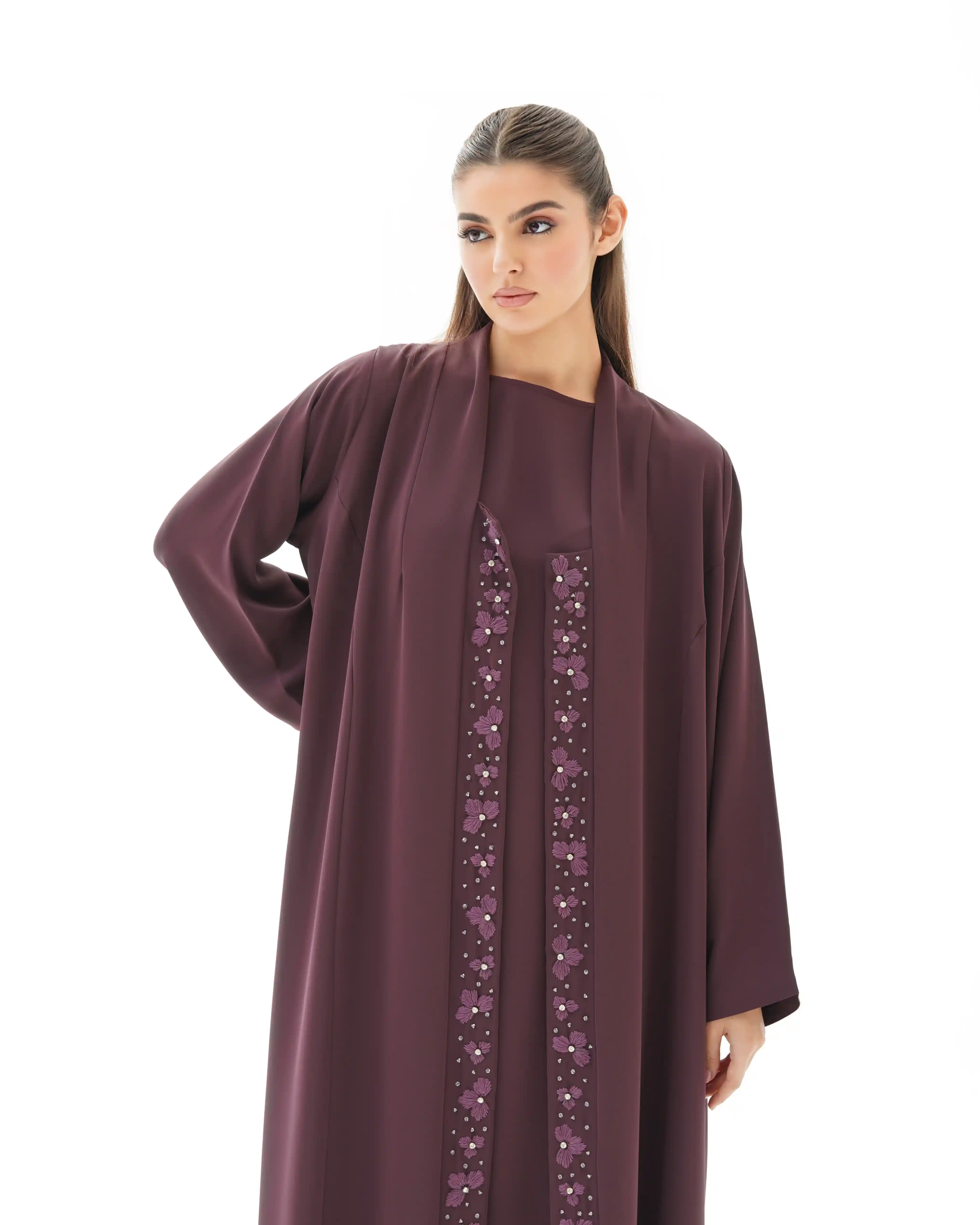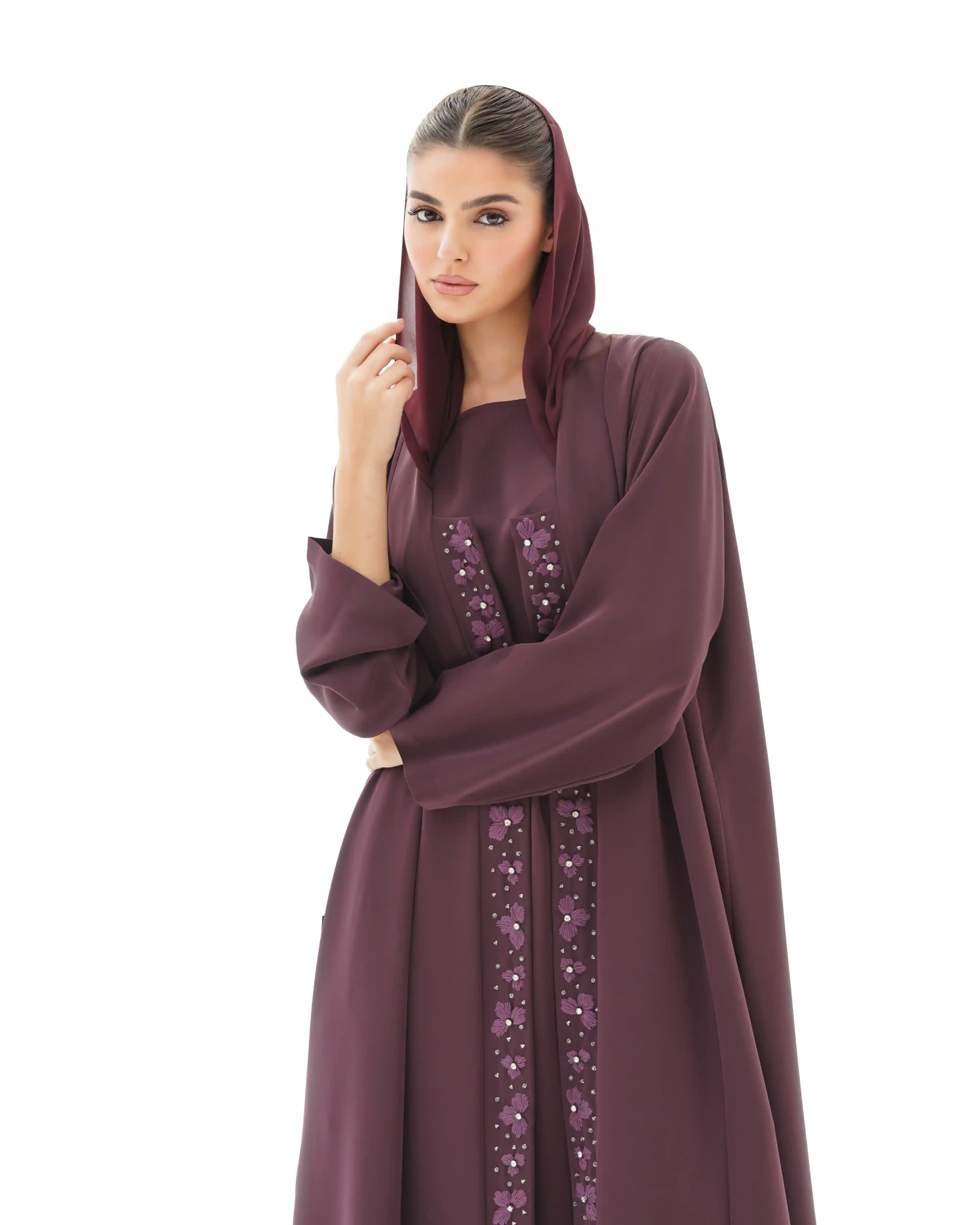 صنعت هذه العباية بهدوء وفخامة، ينساب قماش البريميوم كريب الناعم. تزدان بشريط طويل من الورود المطرزة بعناية ومنسوجة بخيوط حرير فاخر. وكل زهرة تم نسجها بخيوط حريرية رفيعة بدقة عالية تحتضن في قلبها خرزة فضية تضفي بريقاً محسوبًا, والخط العمودي مطرز ينساب على طول العباية.