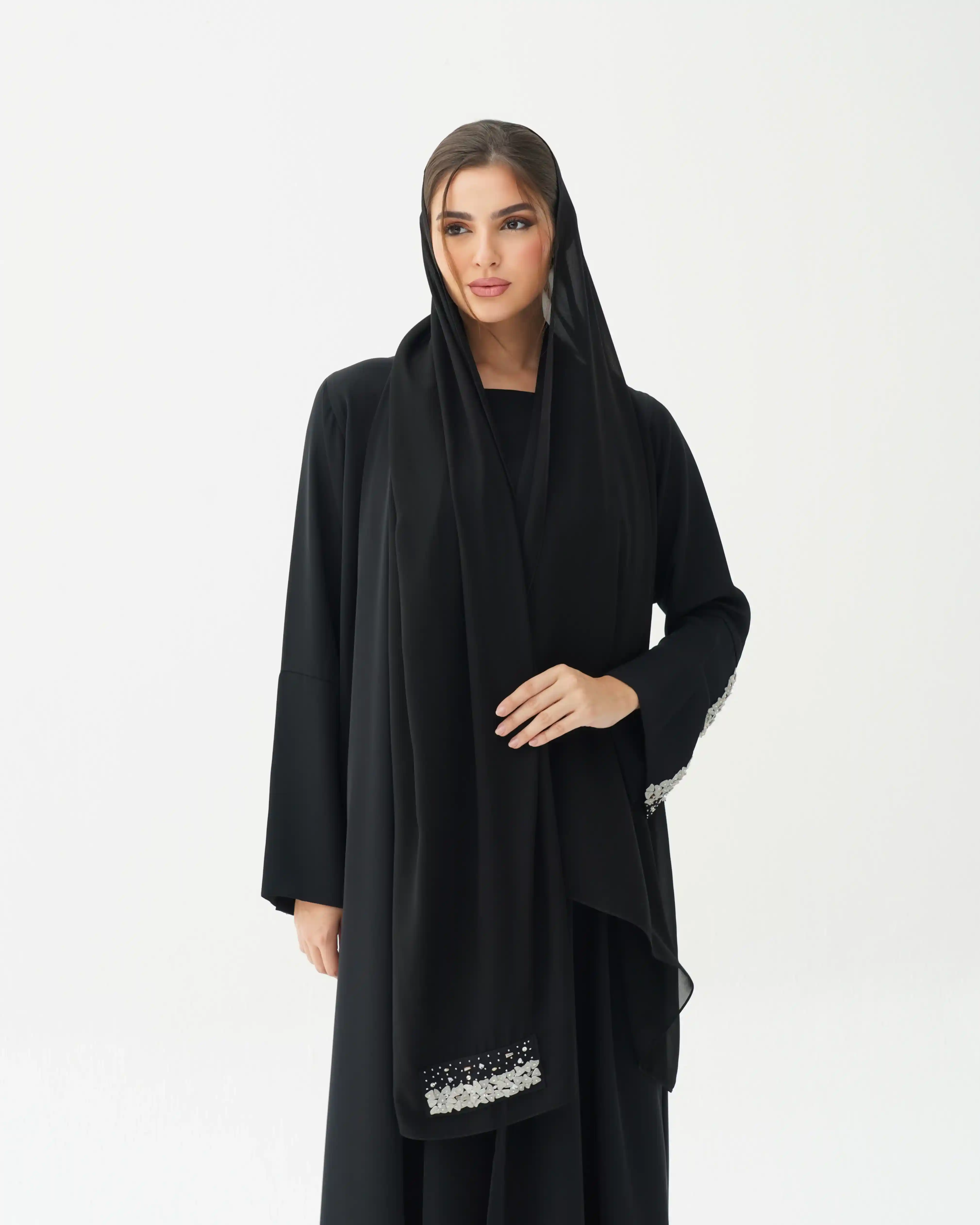 • طرحة مع العباية مطرزة بالقلتر والخزر والكريستال بطرف الطرحة.
