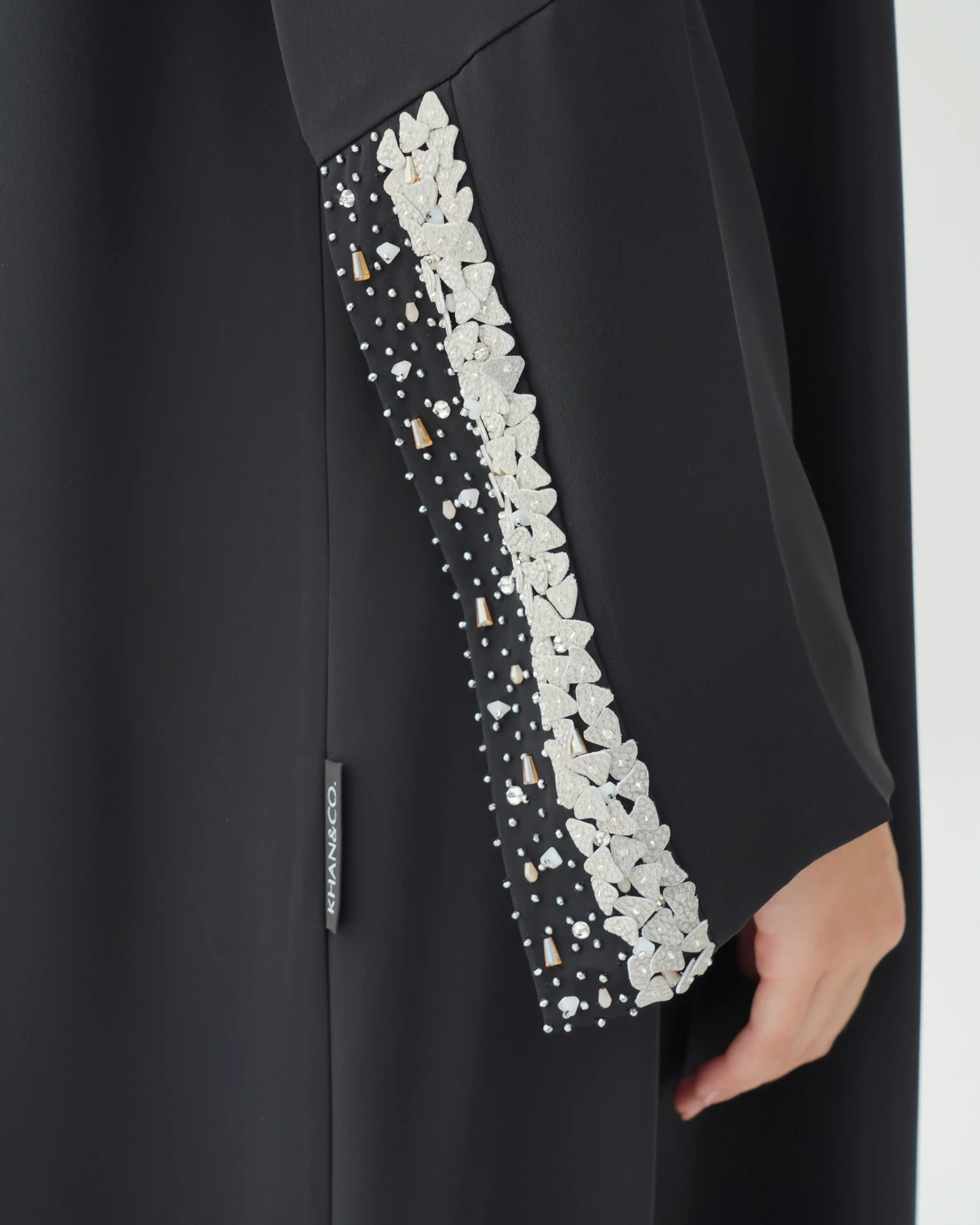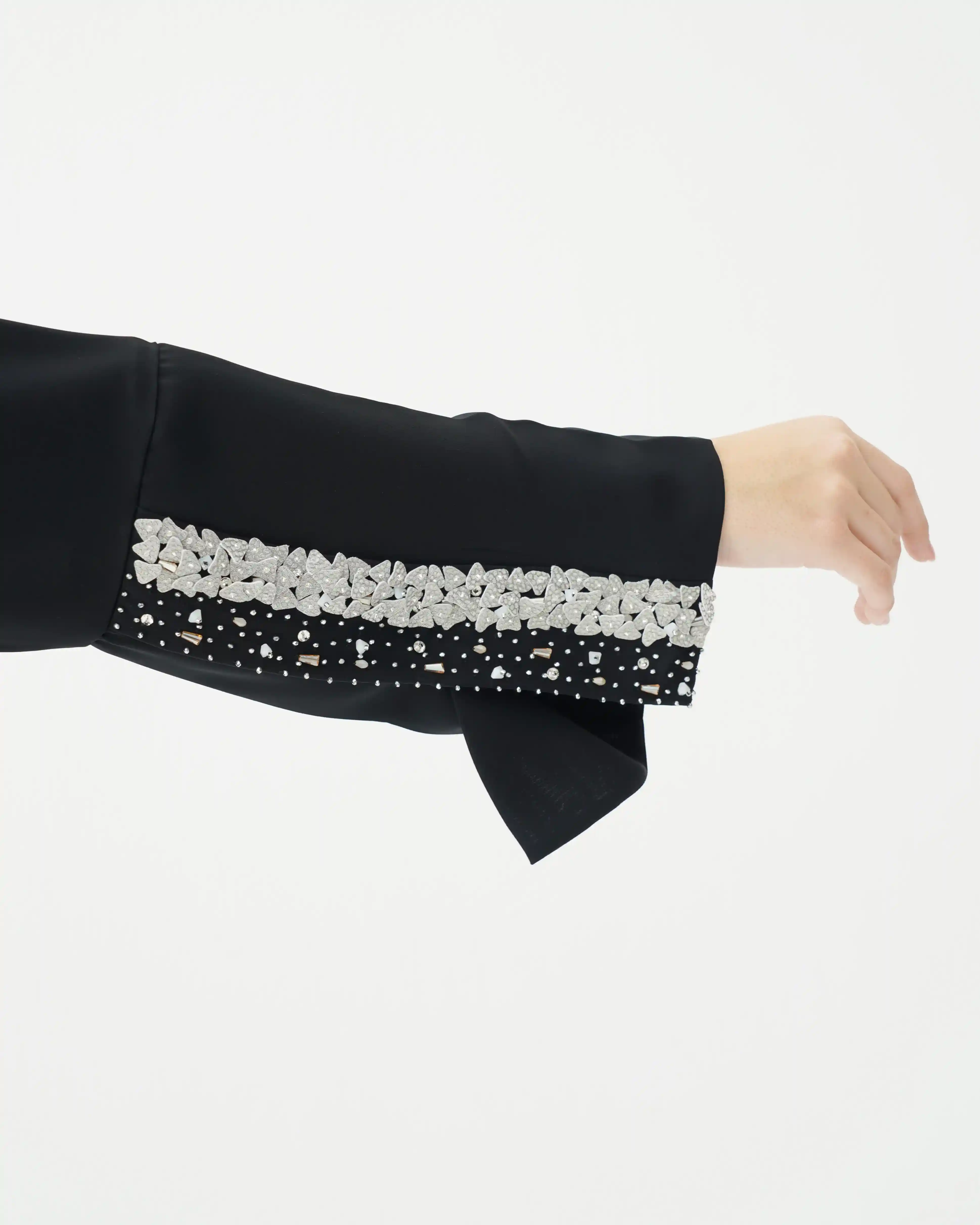 • تطريز بالقلتر بلون الماسي مدموج بالكريستال بشكل يبدأ مصفوف ويتناثر تدريجيا في طرف الكم.