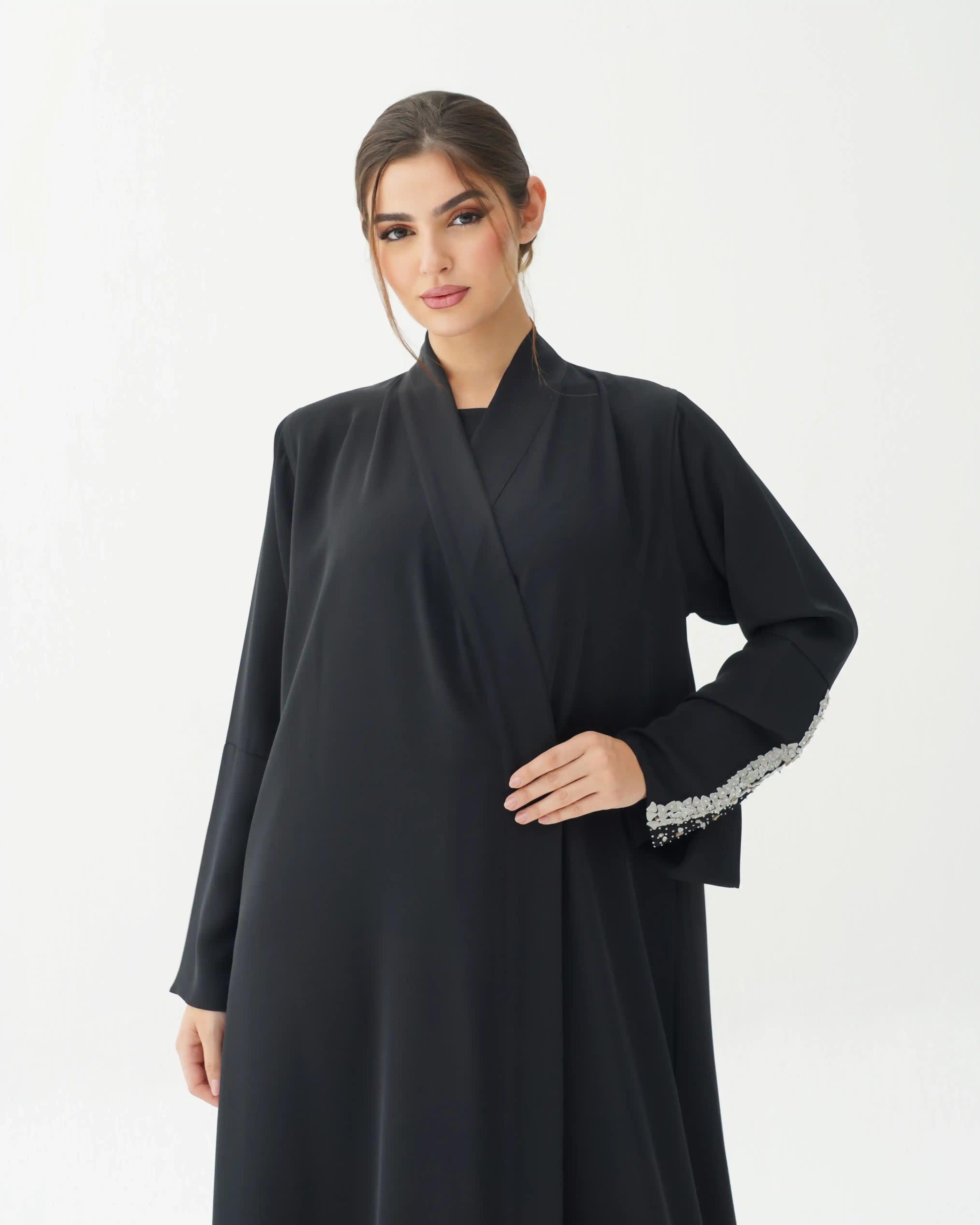 اطلالة انيقة بدون عناء لوجود قطعة فستان داخلي معها، فهذه العباية بالقصة اللف المبتكرة تأتي بنمط متداخل على شكل حرف x تلتف من خلف الرقبة بشريط ياقة الى اخر ذيل العباية وتزدان الاكمام بالقلتر بلون الماس مشتغلة يدويا ومدموجدة مع كريستال وخرز لتضفي لمسة اهتمامنا بالتفاصيل الدقيقة التي من خلالها اكتسبت العلامة شهرتها الواسعة في المملكة العربية السعودية كما تتميز العباية بقماش خفيف الوزن منسدل يضفي الانسيابية المطلوبة للتصميم. ويمكن ارتداؤها مفتوحة مع الفستان الداخلي او بطريقة اللف.