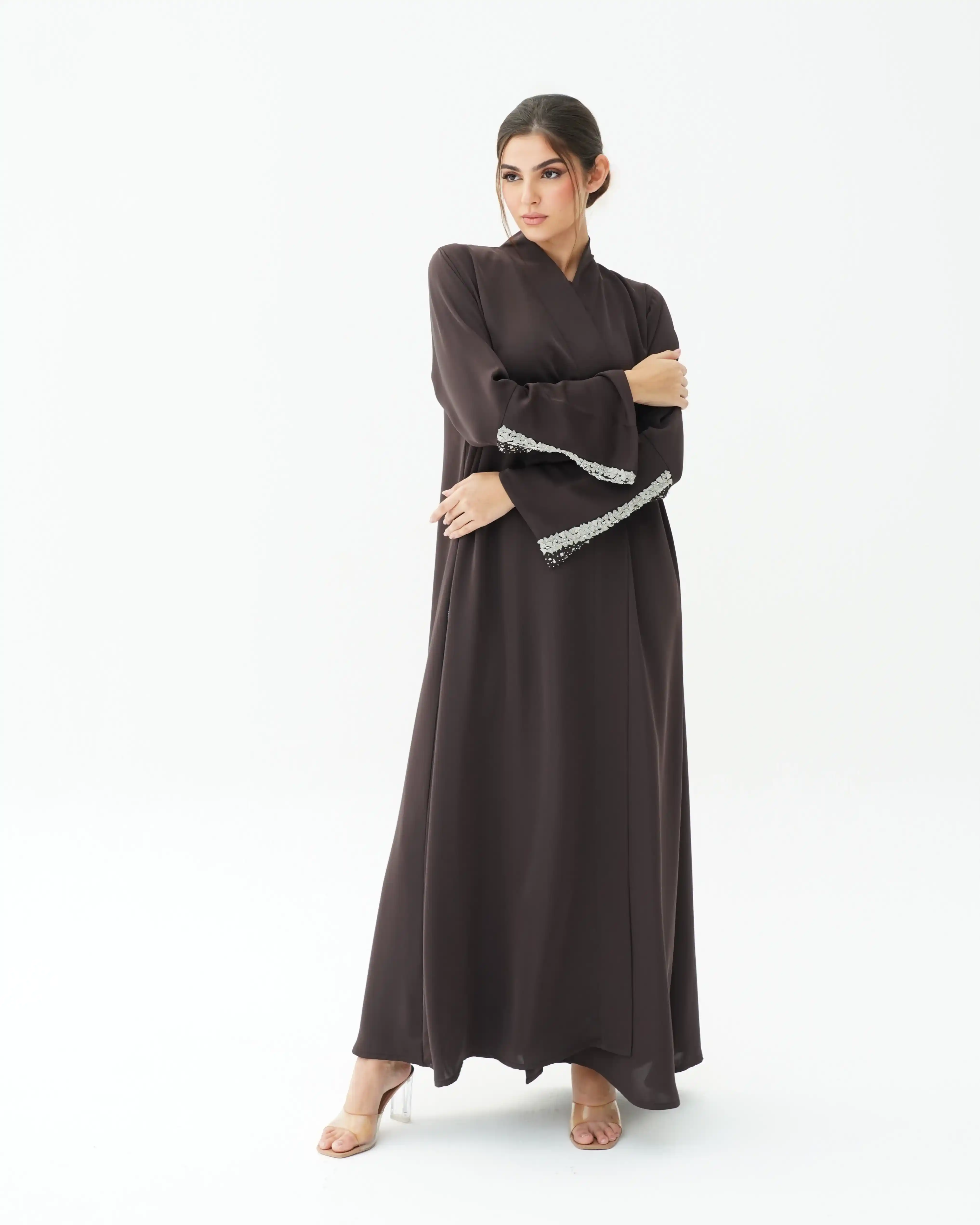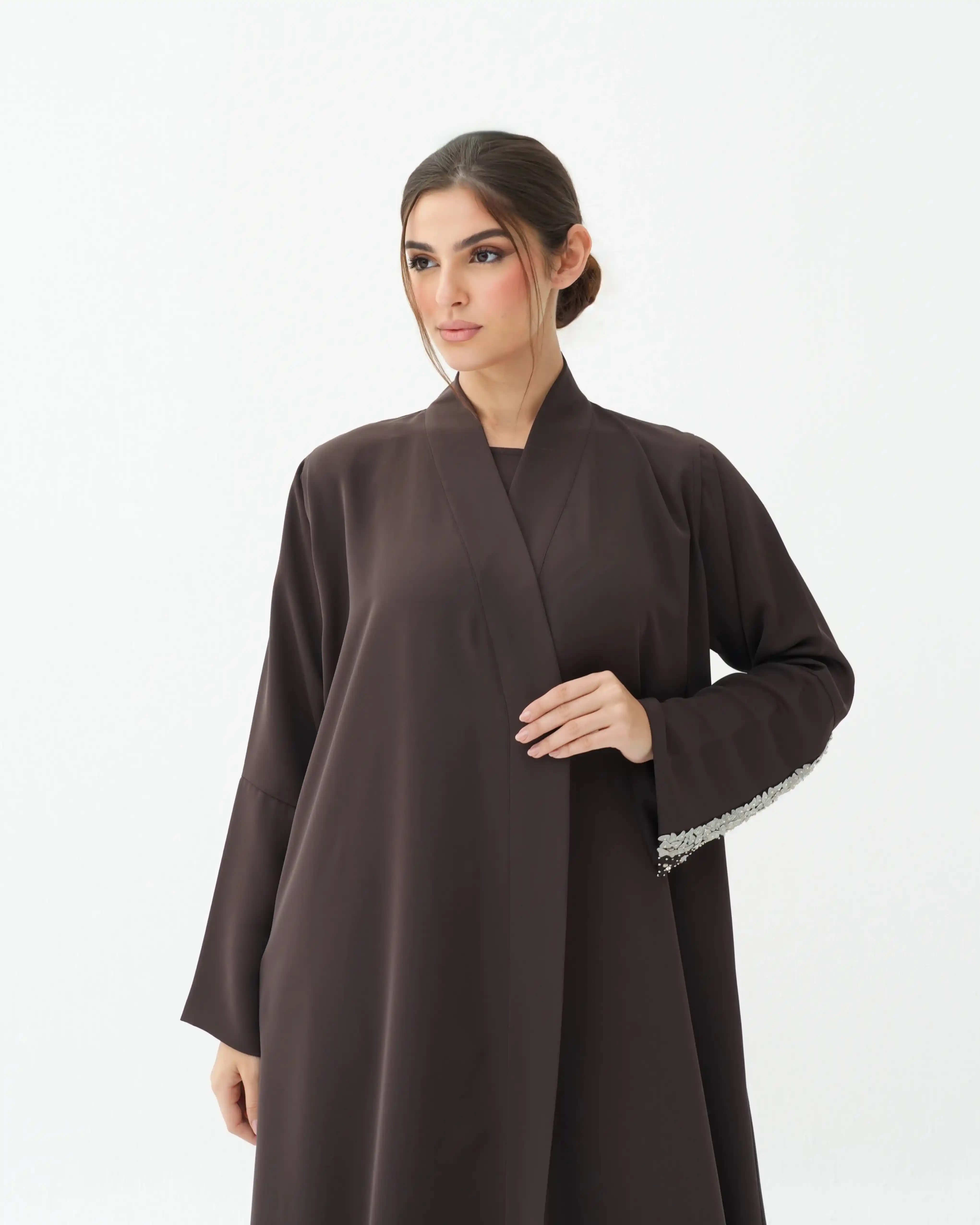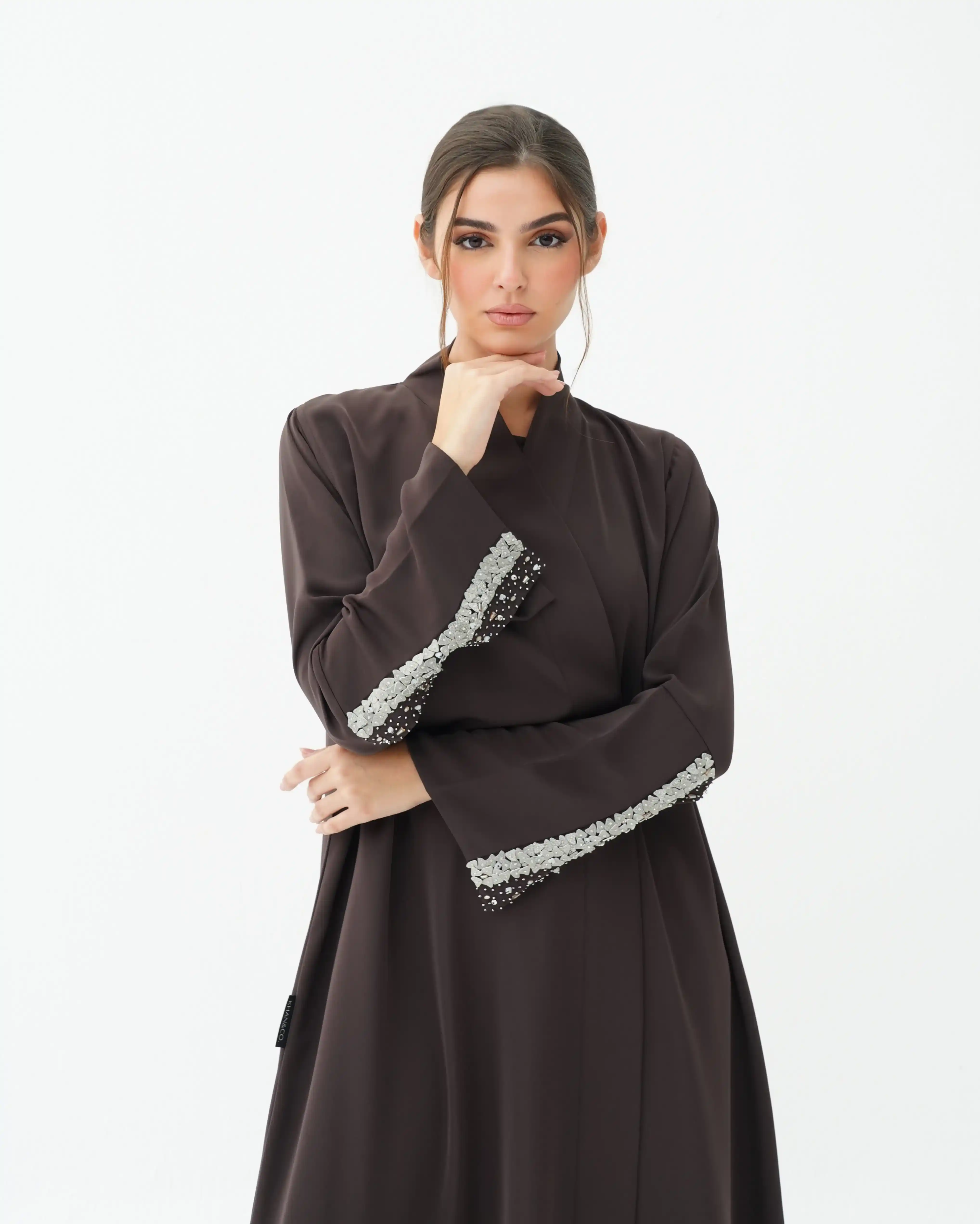 اطلالة انيقة بدون عناء لوجود قطعة فستان داخلي معها، فهذه العباية بالقصة اللف المبتكرة تأتي بنمط متداخل على شكل حرف x تلتف من خلف الرقبة بشريط ياقة الى اخر ذيل العباية وتزدان الاكمام بالقلتر بلون الماس مشتغلة يدويا ومدموجدة مع كريستال وخرز لتضفي لمسة اهتمامنا بالتفاصيل الدقيقة التي من خلالها اكتسبت العلامة شهرتها الواسعة في المملكة العربية السعودية كما تتميز العباية بقماش خفيف الوزن منسدل يضفي الانسيابية المطلوبة للتصميم. ويمكن ارتداؤها مفتوحة مع الفستان الداخلي او بطريقة اللف.