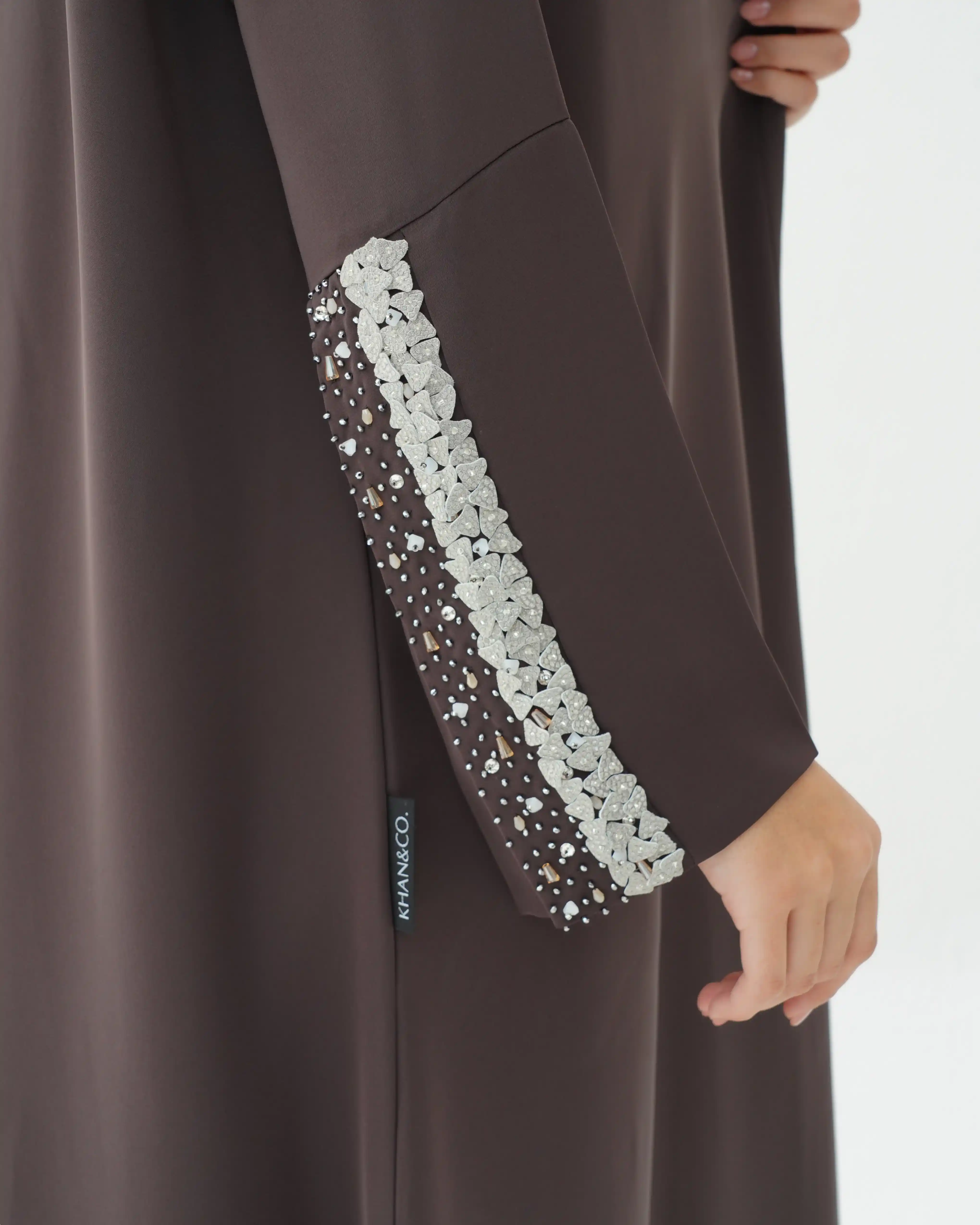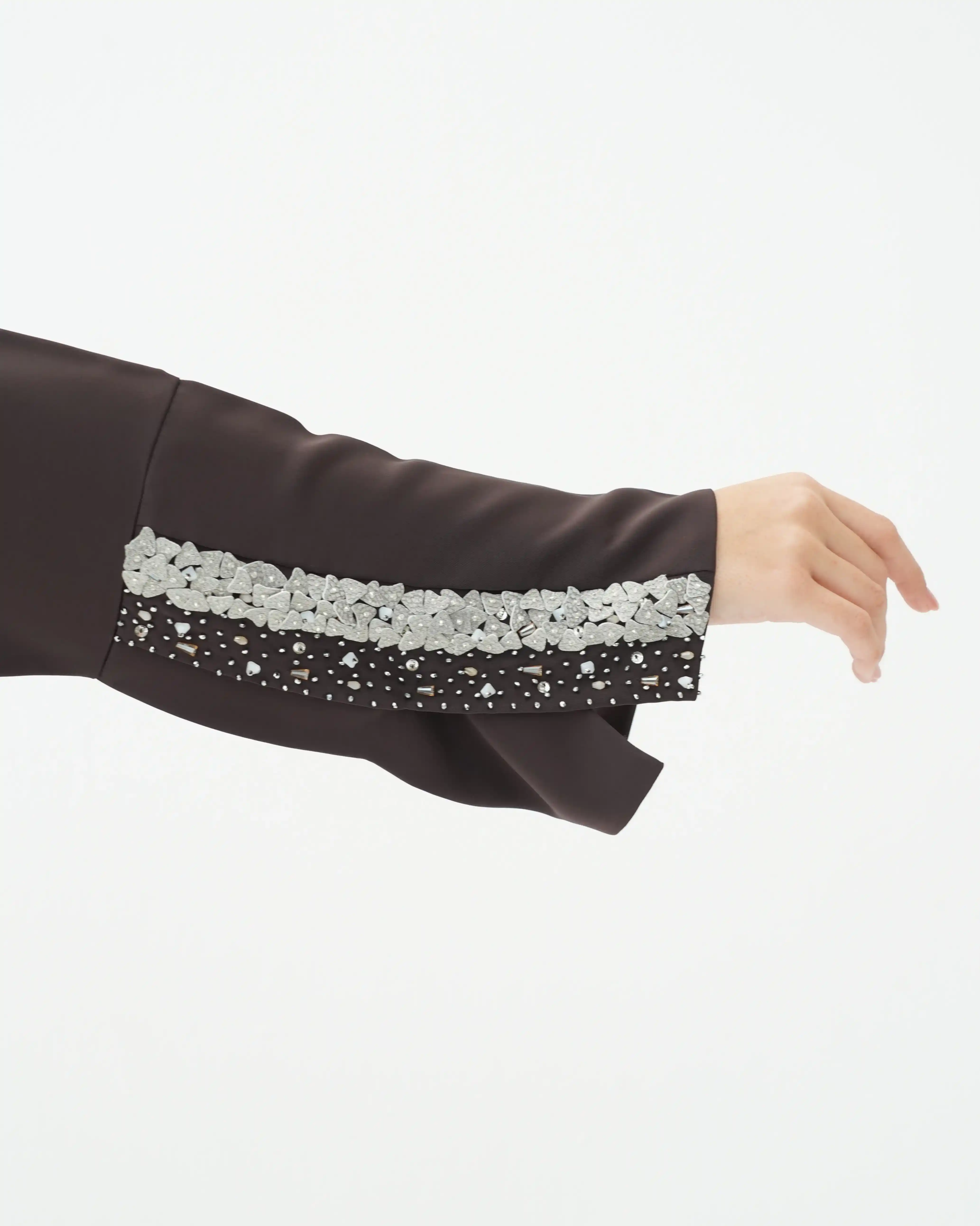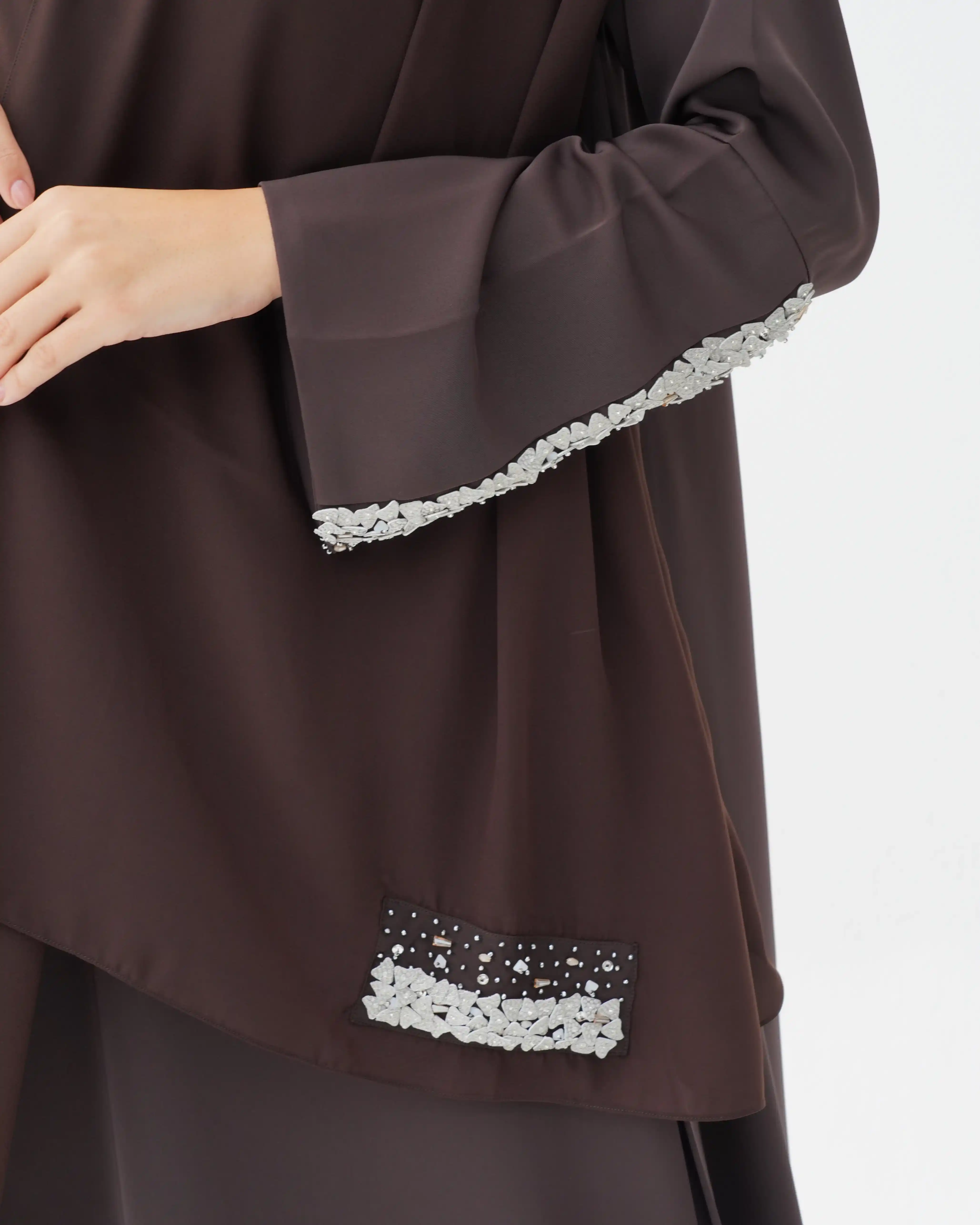 • تطريز بالقلتر بلون الماسي مدموج بالكريستال بشكل يبدأ مصفوف ويتناثر تدريجيا في طرف الكم.