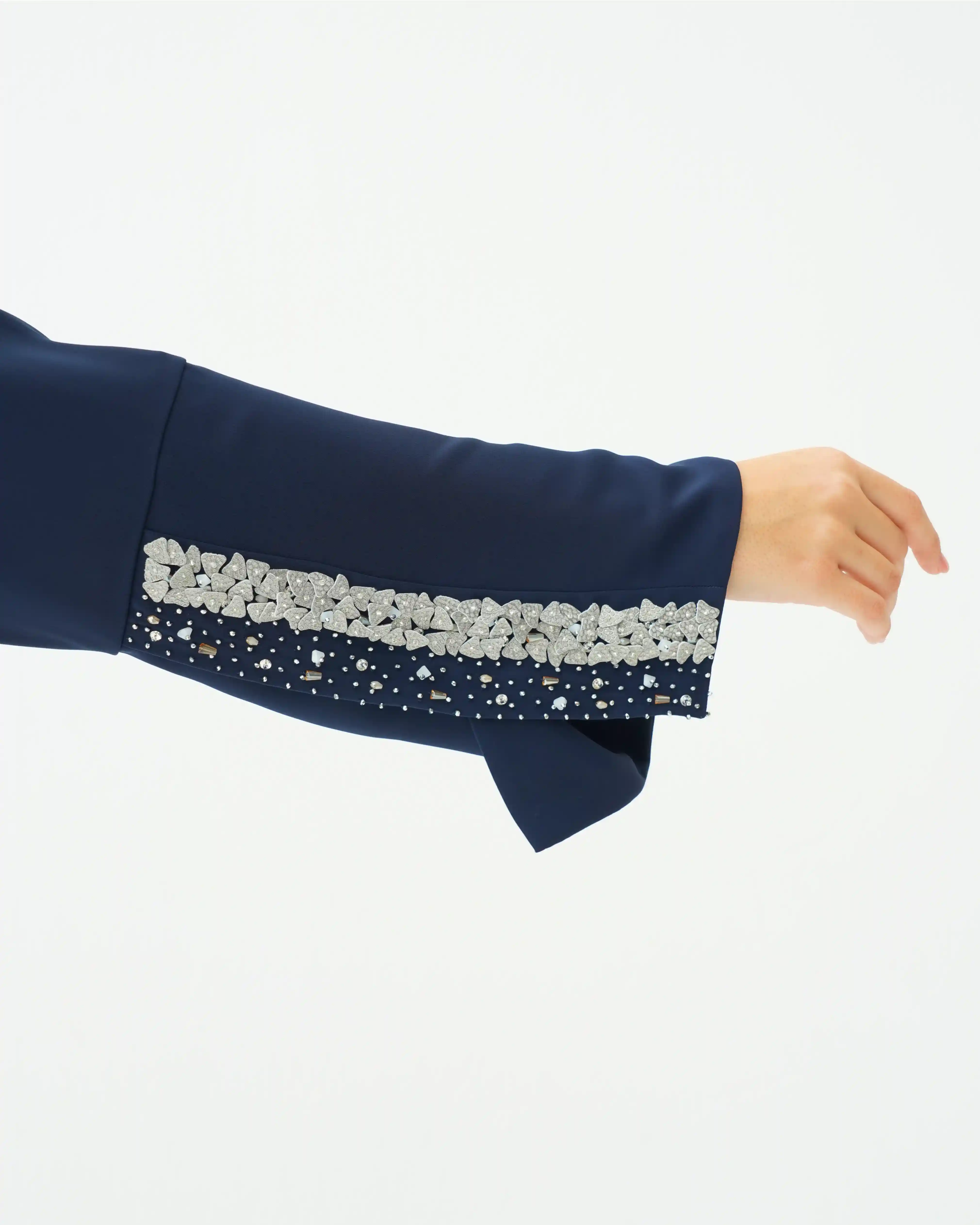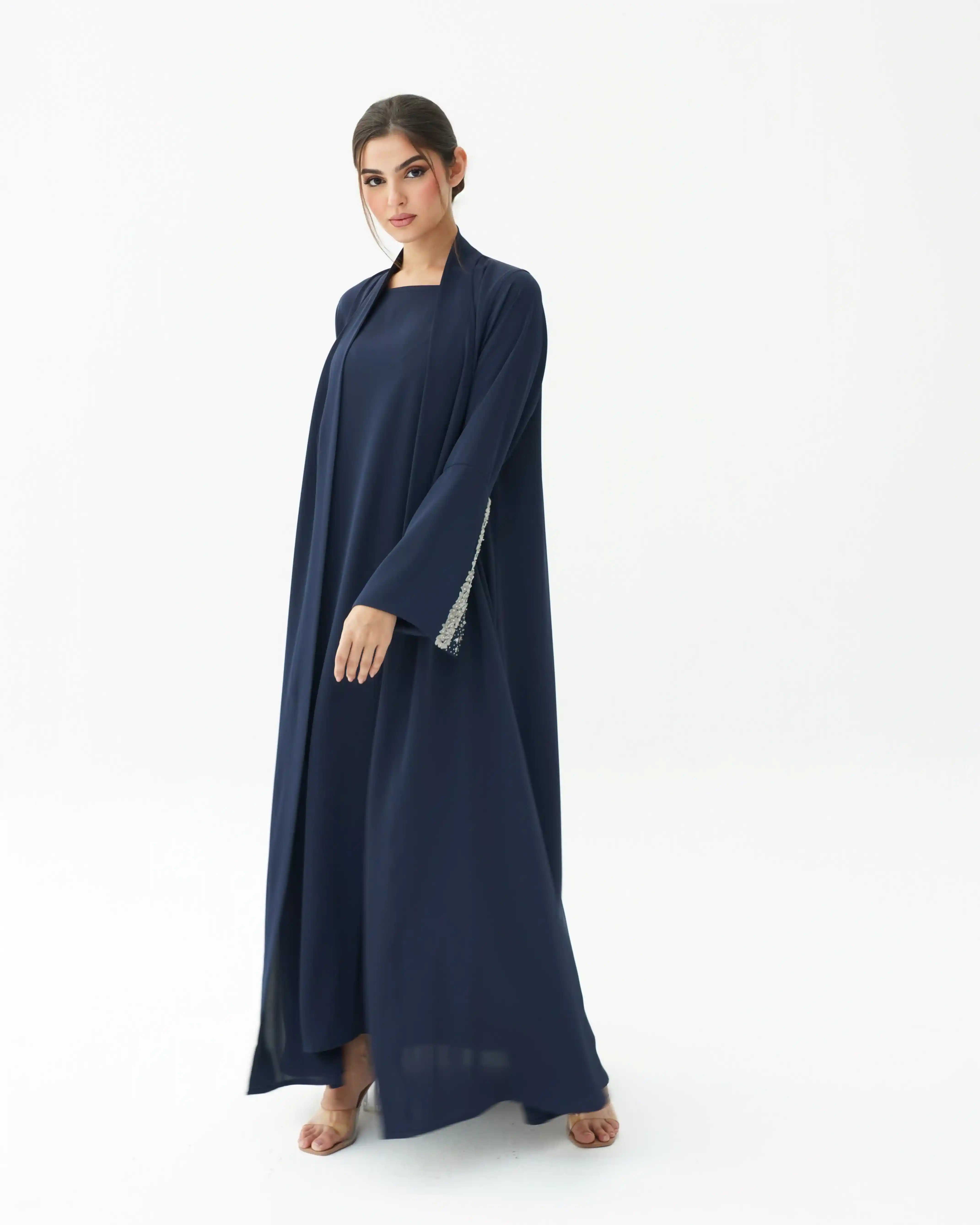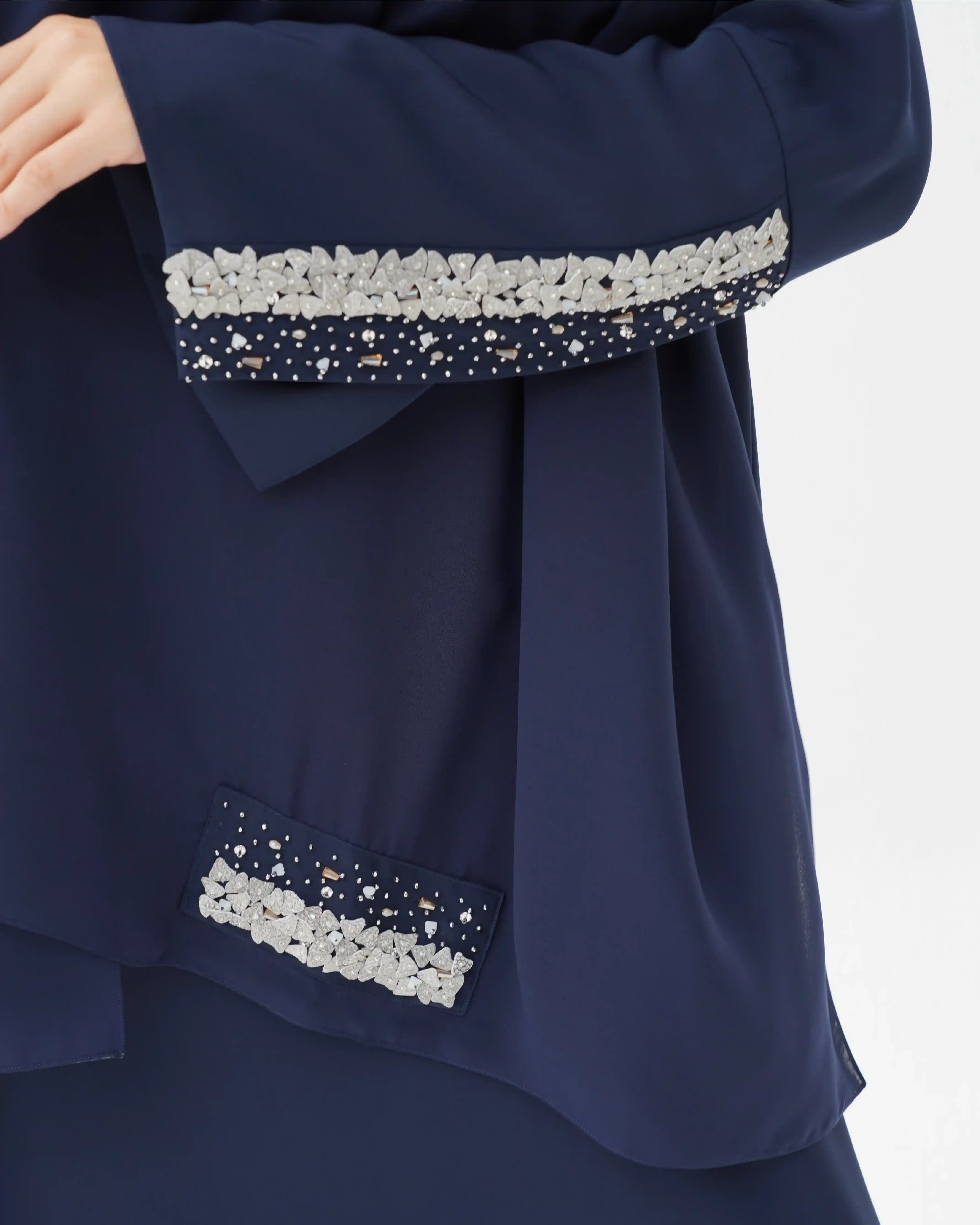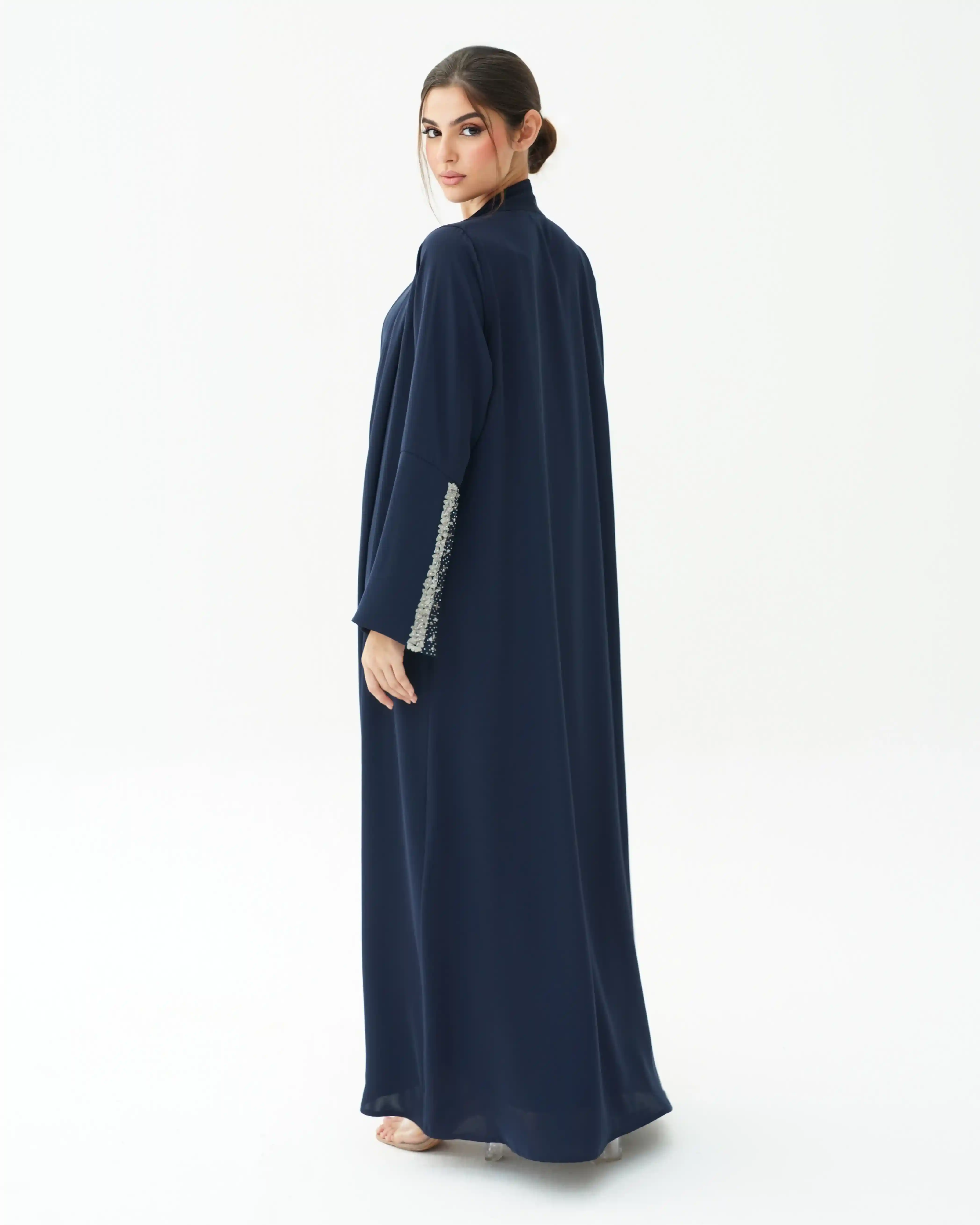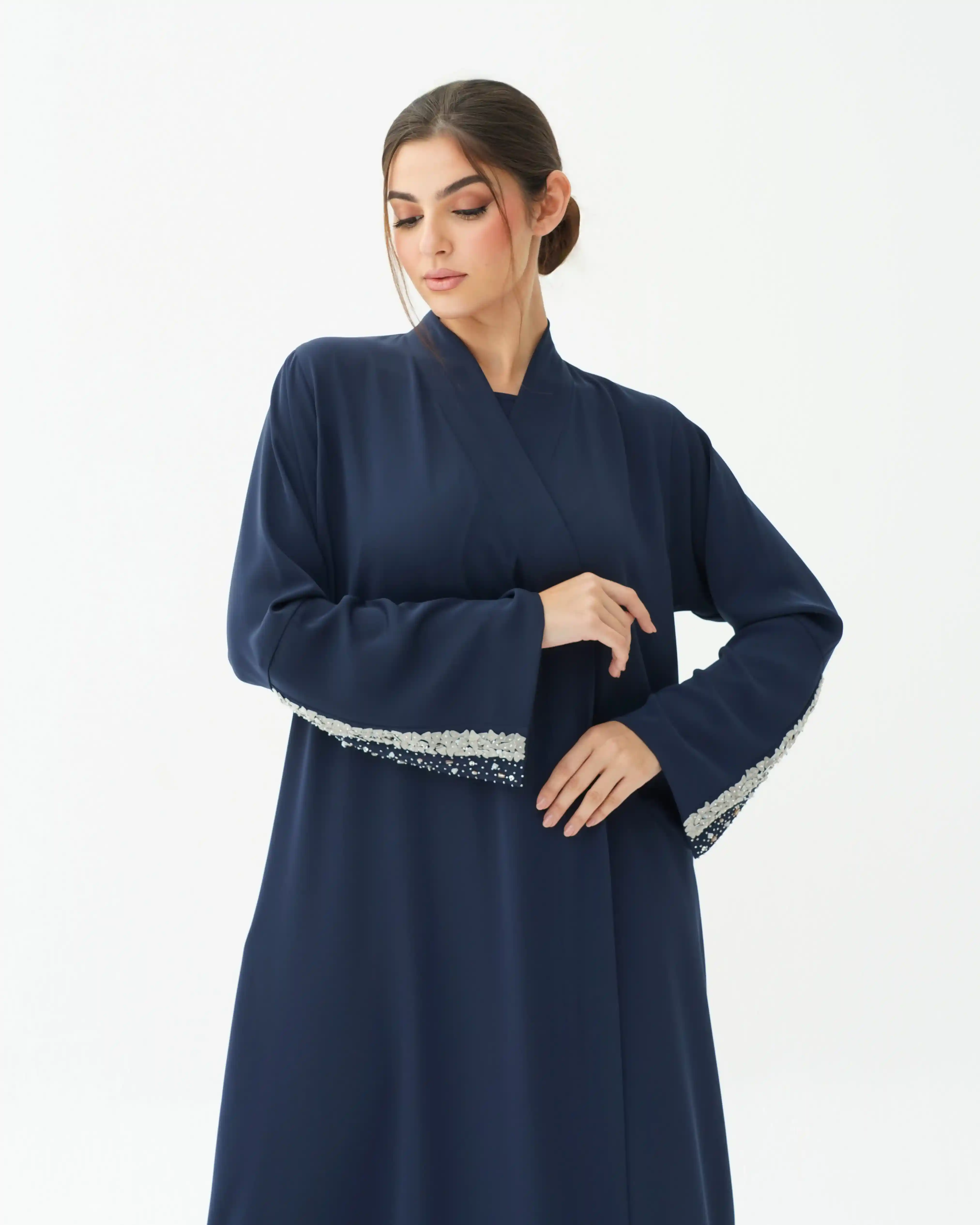 اطلالة انيقة بدون عناء لوجود قطعة فستان داخلي معها، فهذه العباية بالقصة اللف المبتكرة تأتي بنمط متداخل على شكل حرف x تلتف من خلف الرقبة بشريط ياقة الى اخر ذيل العباية وتزدان الاكمام بالقلتر بلون الماس مشتغلة يدويا ومدموجدة مع كريستال وخرز لتضفي لمسة اهتمامنا بالتفاصيل الدقيقة التي من خلالها اكتسبت العلامة شهرتها الواسعة في المملكة العربية السعودية كما تتميز العباية بقماش خفيف الوزن منسدل يضفي الانسيابية المطلوبة للتصميم. ويمكن ارتداؤها مفتوحة مع الفستان الداخلي او بطريقة اللف.