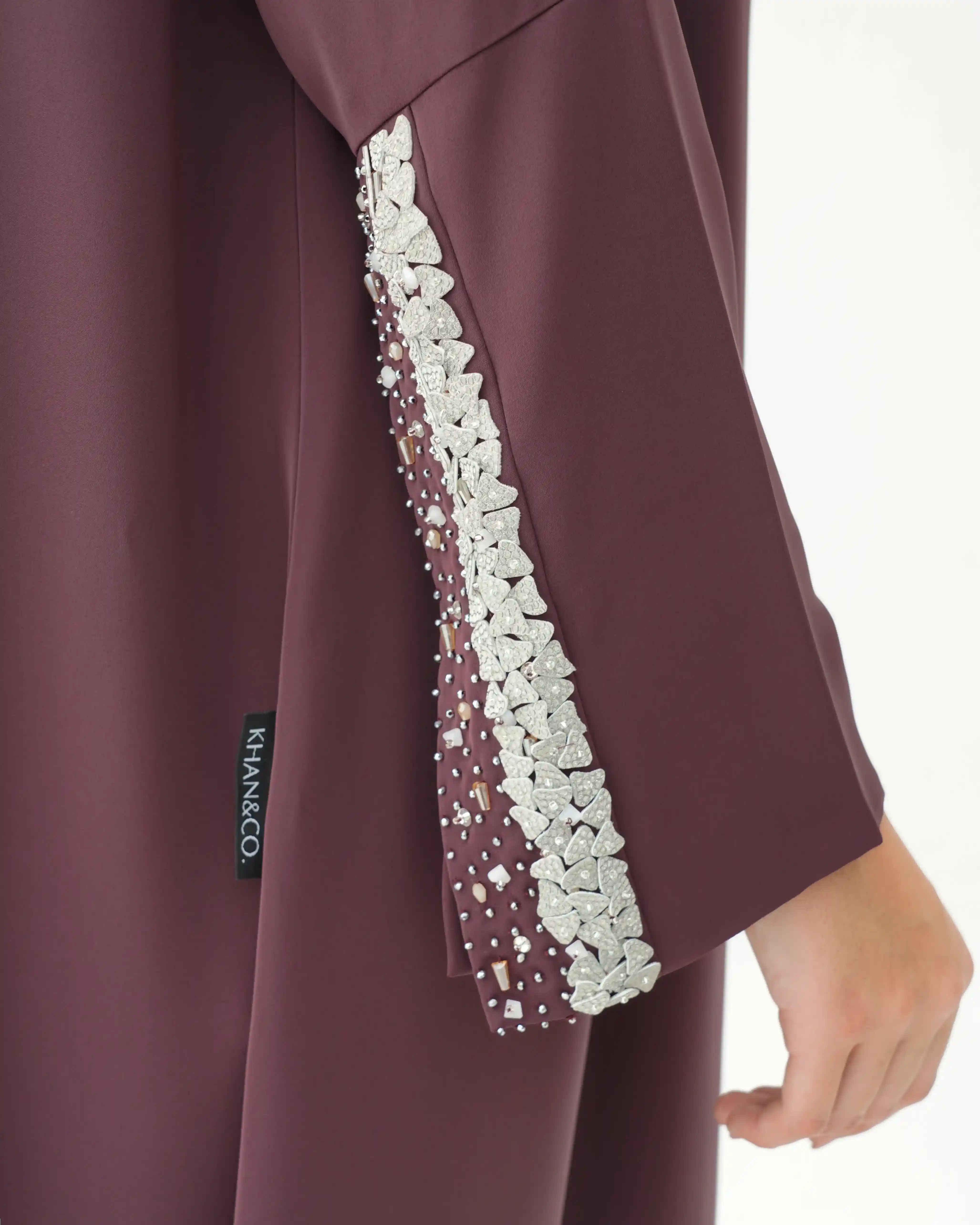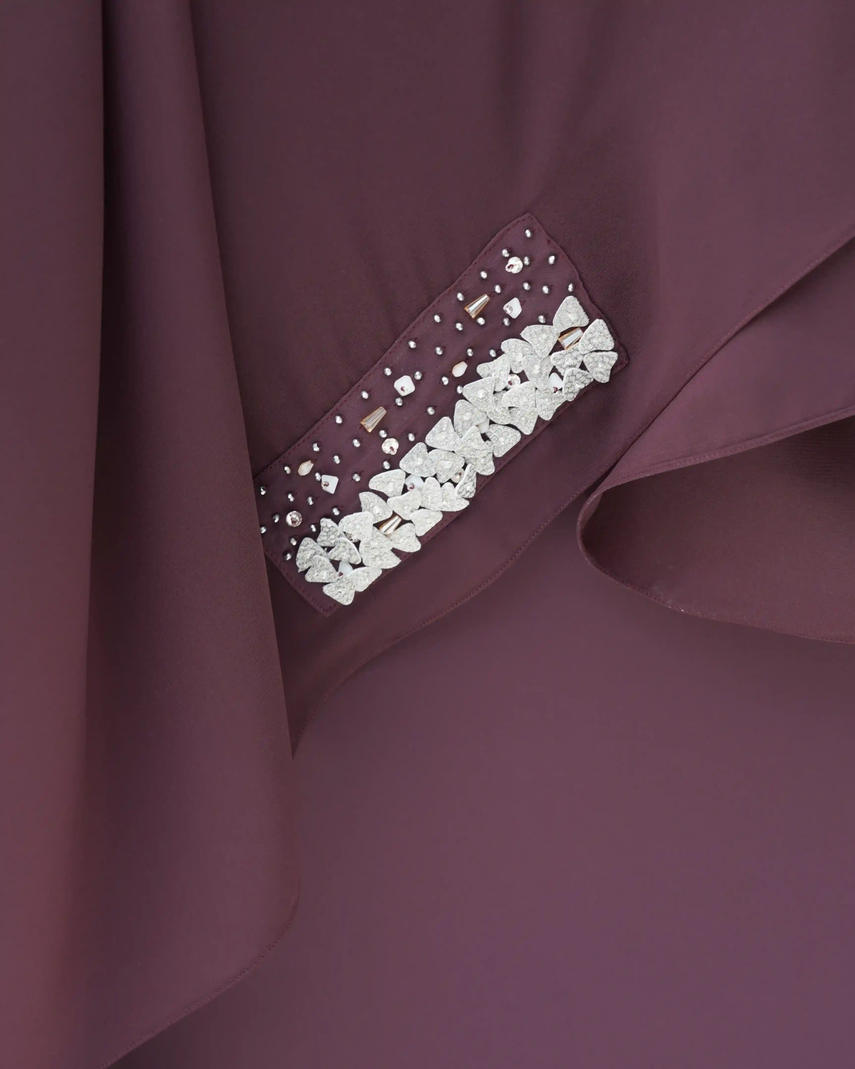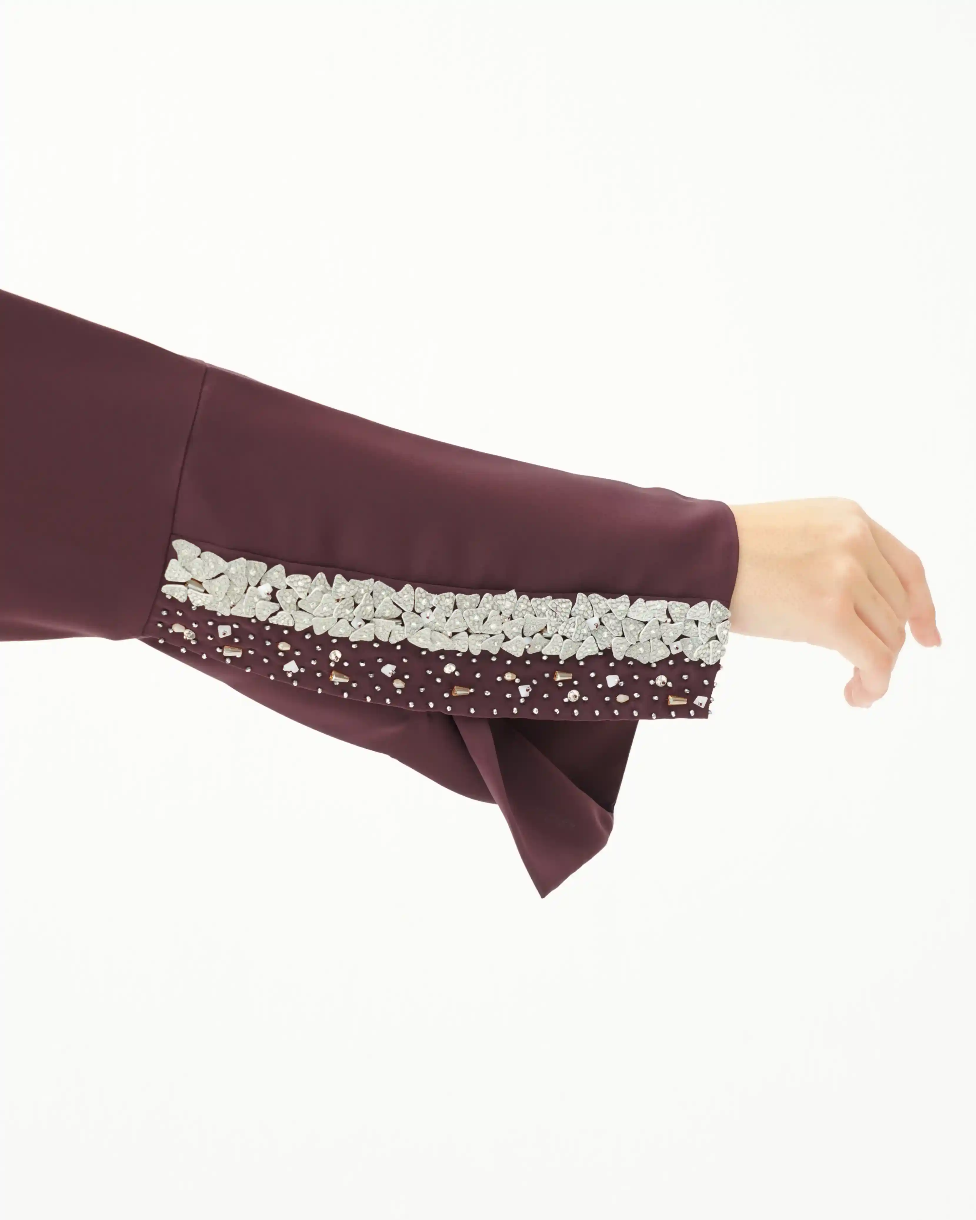 • تطريز بالقلتر بلون الماسي مدموج بالكريستال بشكل يبدأ مصفوف ويتناثر تدريجيا في طرف الكم.