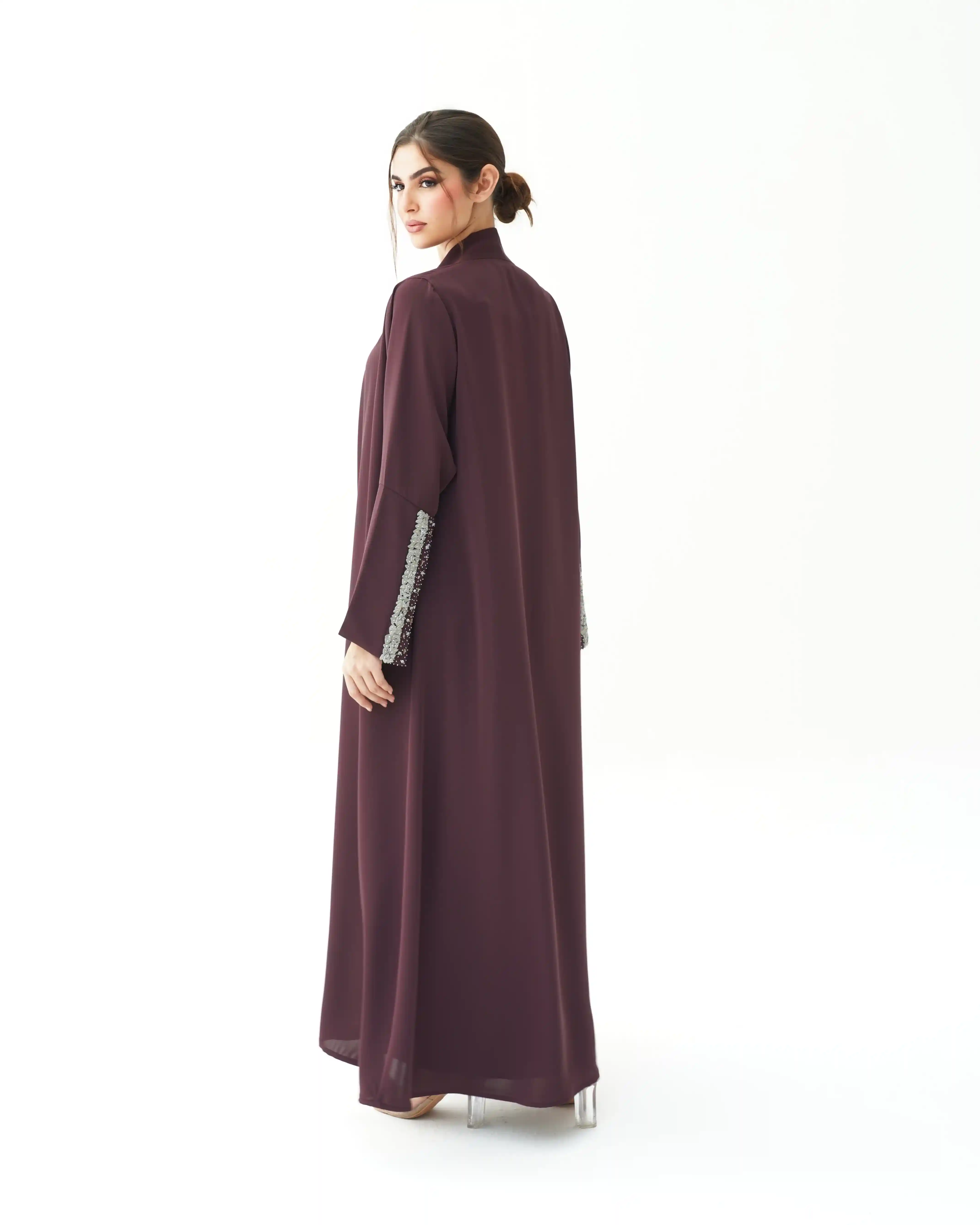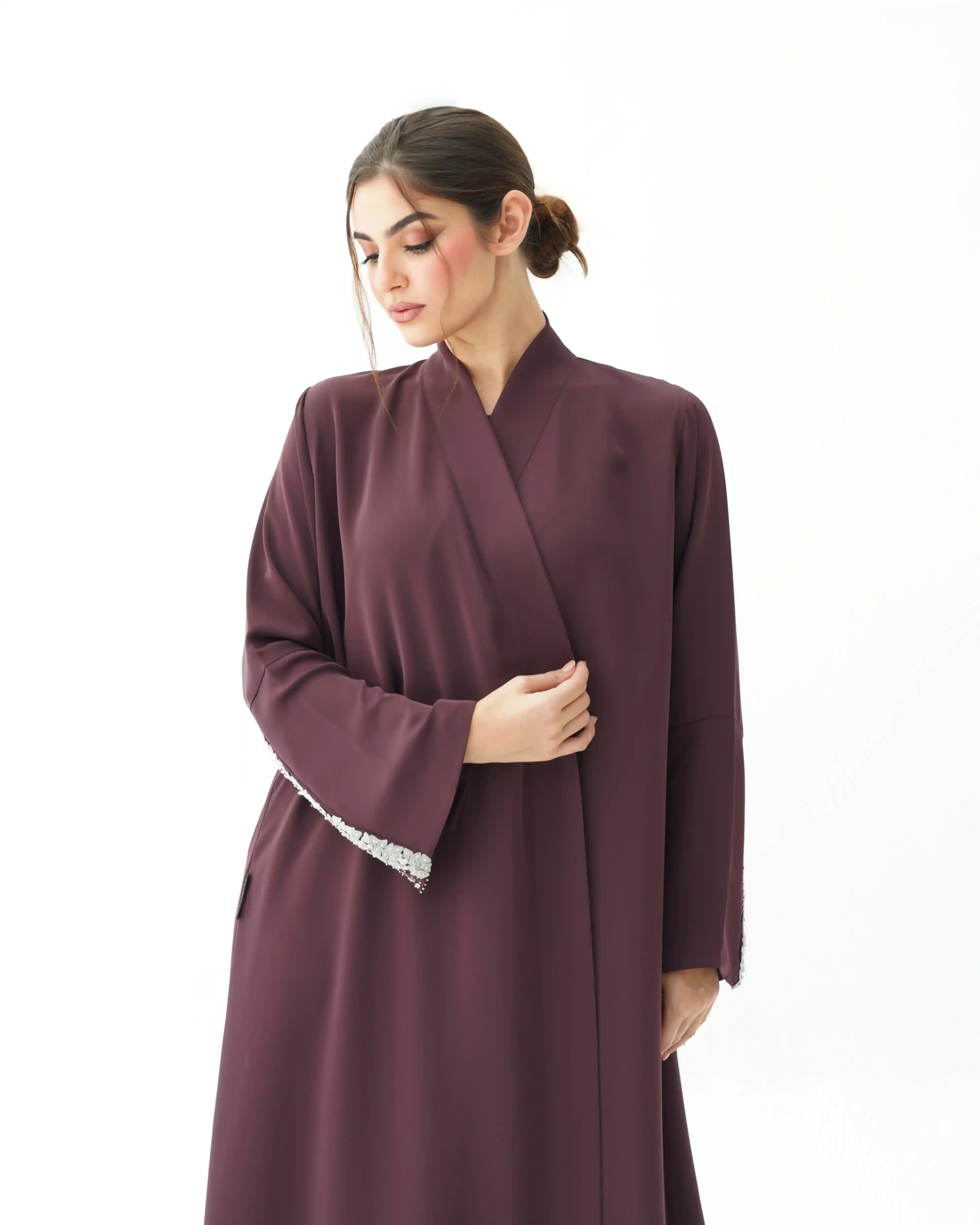اطلالة انيقة بدون عناء لوجود قطعة فستان داخلي معها، فهذه العباية بالقصة اللف المبتكرة تأتي بنمط متداخل على شكل حرف x تلتف من خلف الرقبة بشريط ياقة الى اخر ذيل العباية وتزدان الاكمام بالقلتر بلون الماس مشتغلة يدويا ومدموجدة مع كريستال وخرز لتضفي لمسة اهتمامنا بالتفاصيل الدقيقة التي من خلالها اكتسبت العلامة شهرتها الواسعة في المملكة العربية السعودية كما تتميز العباية بقماش خفيف الوزن منسدل يضفي الانسيابية المطلوبة للتصميم. ويمكن ارتداؤها مفتوحة مع الفستان الداخلي او بطريقة اللف.