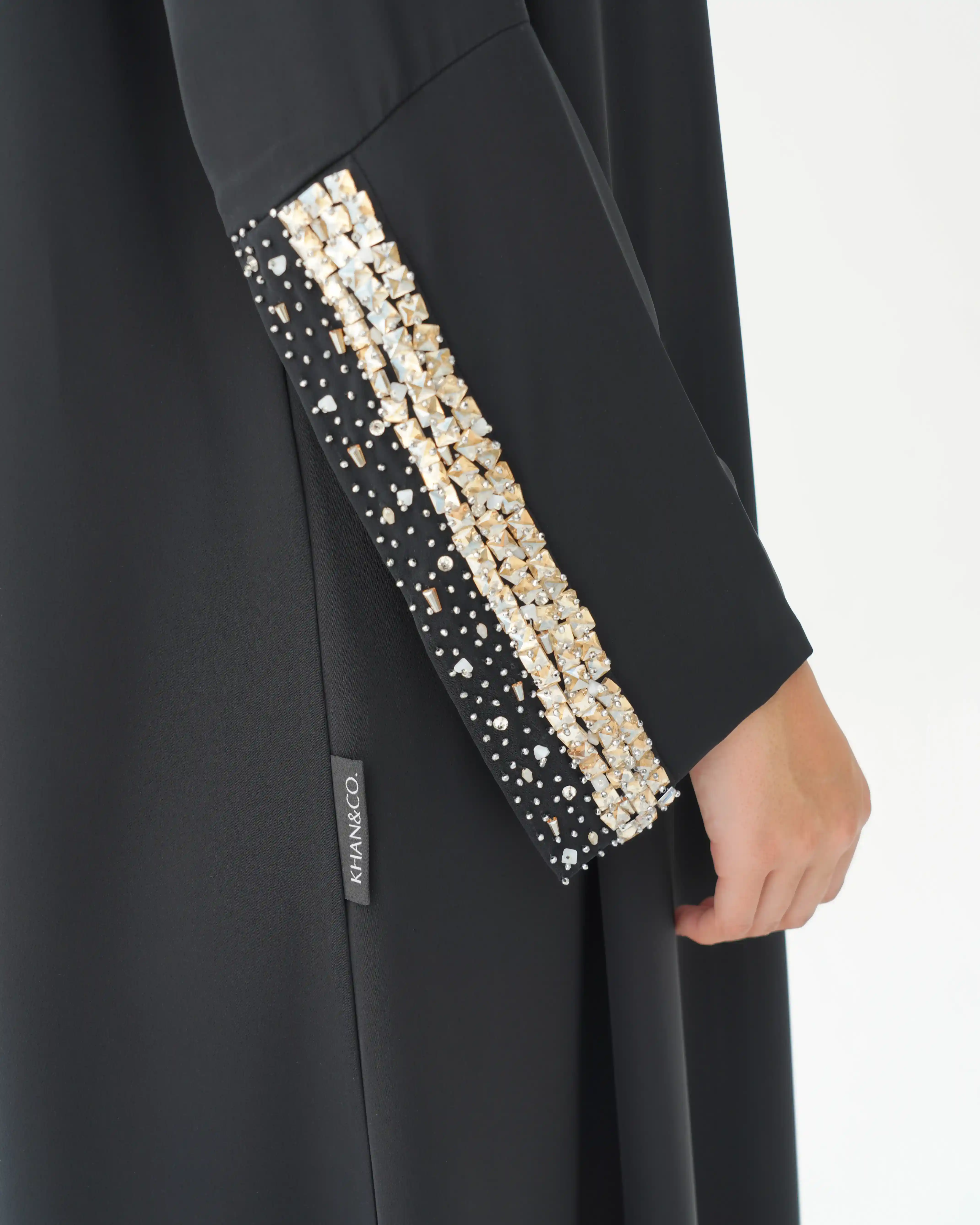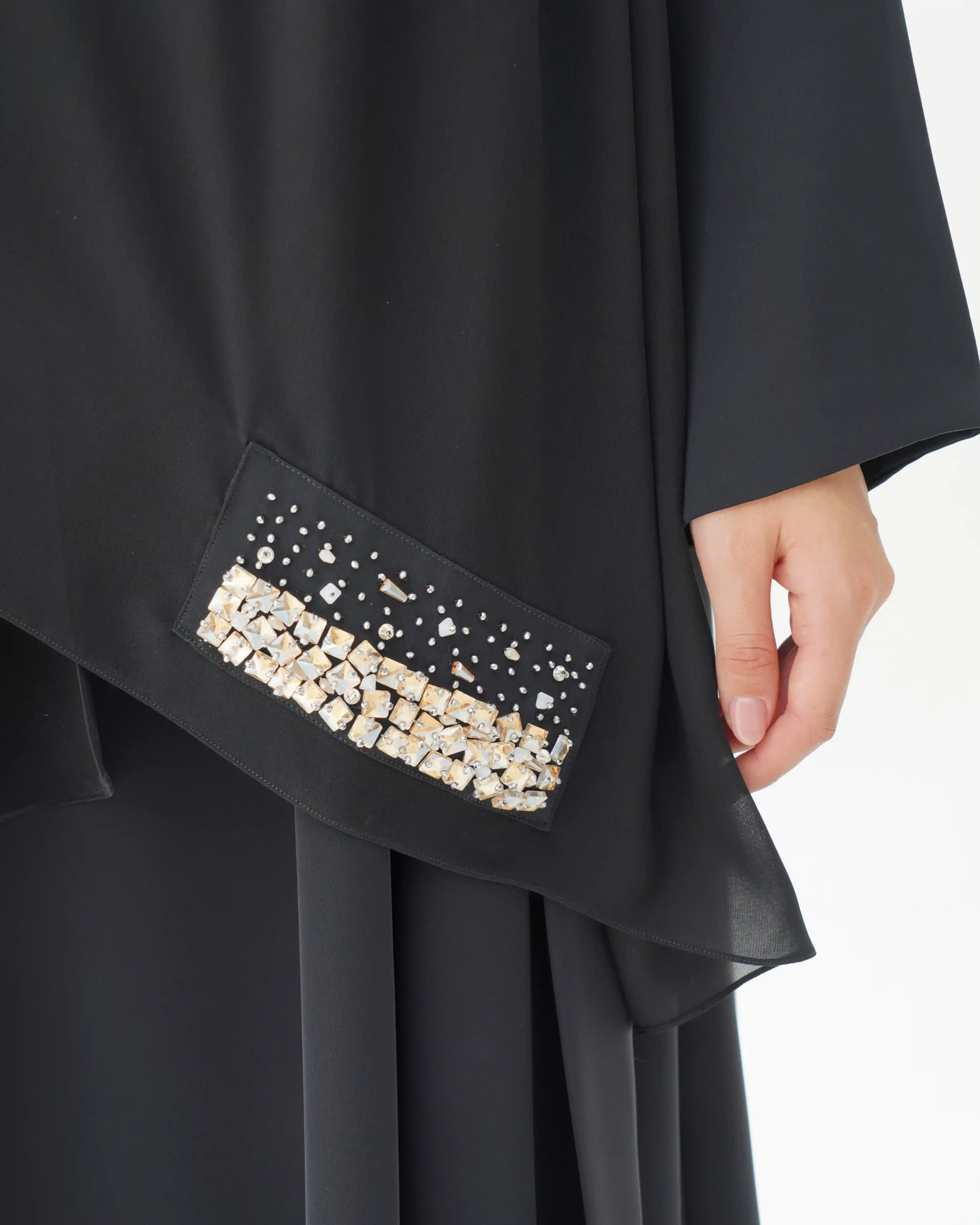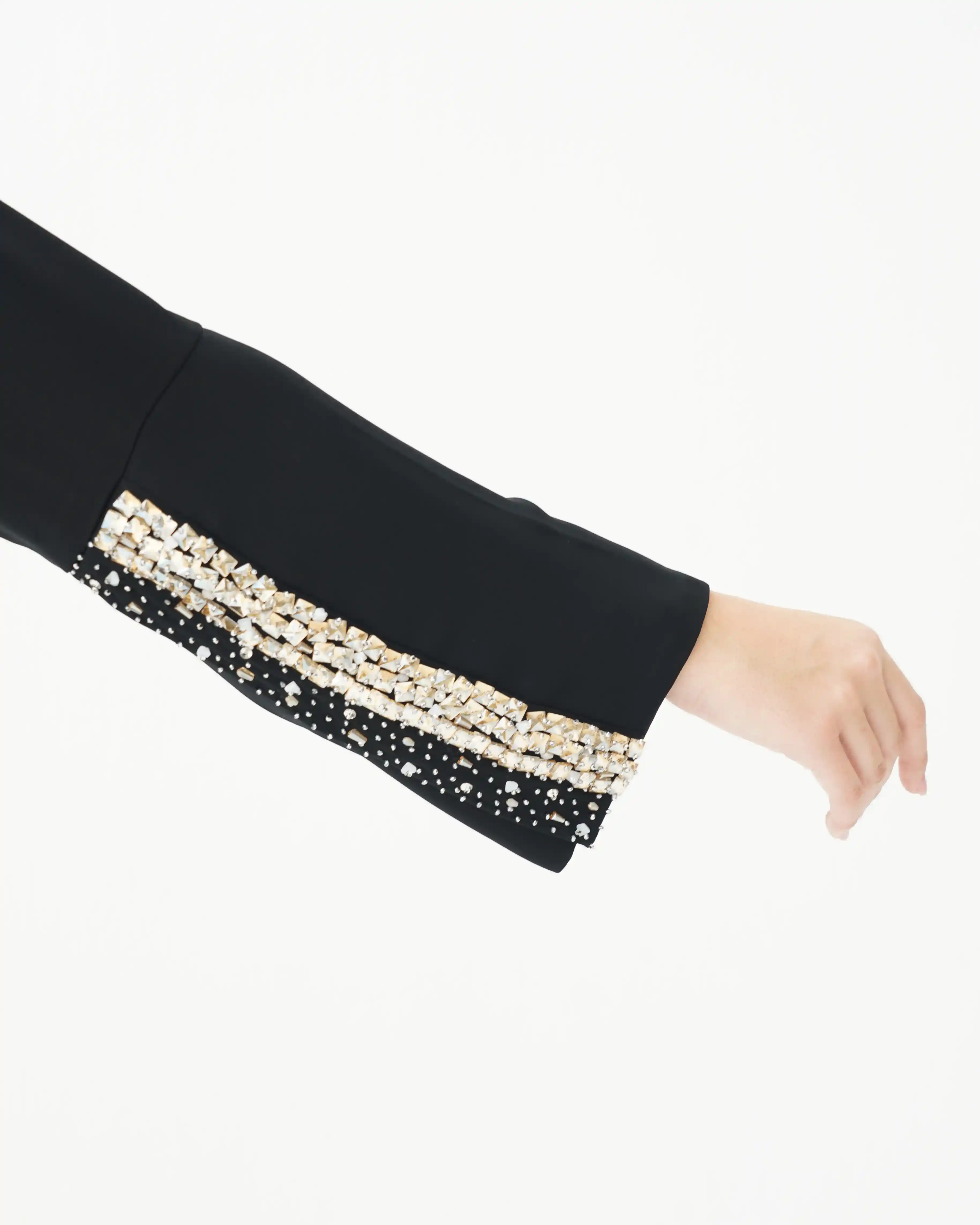 • تطريز بالكريستال بلون الذهبي مدموج بالخرز بشكل يبدأ مصفوف ويتناثر تدريجيا في طرف الكم.