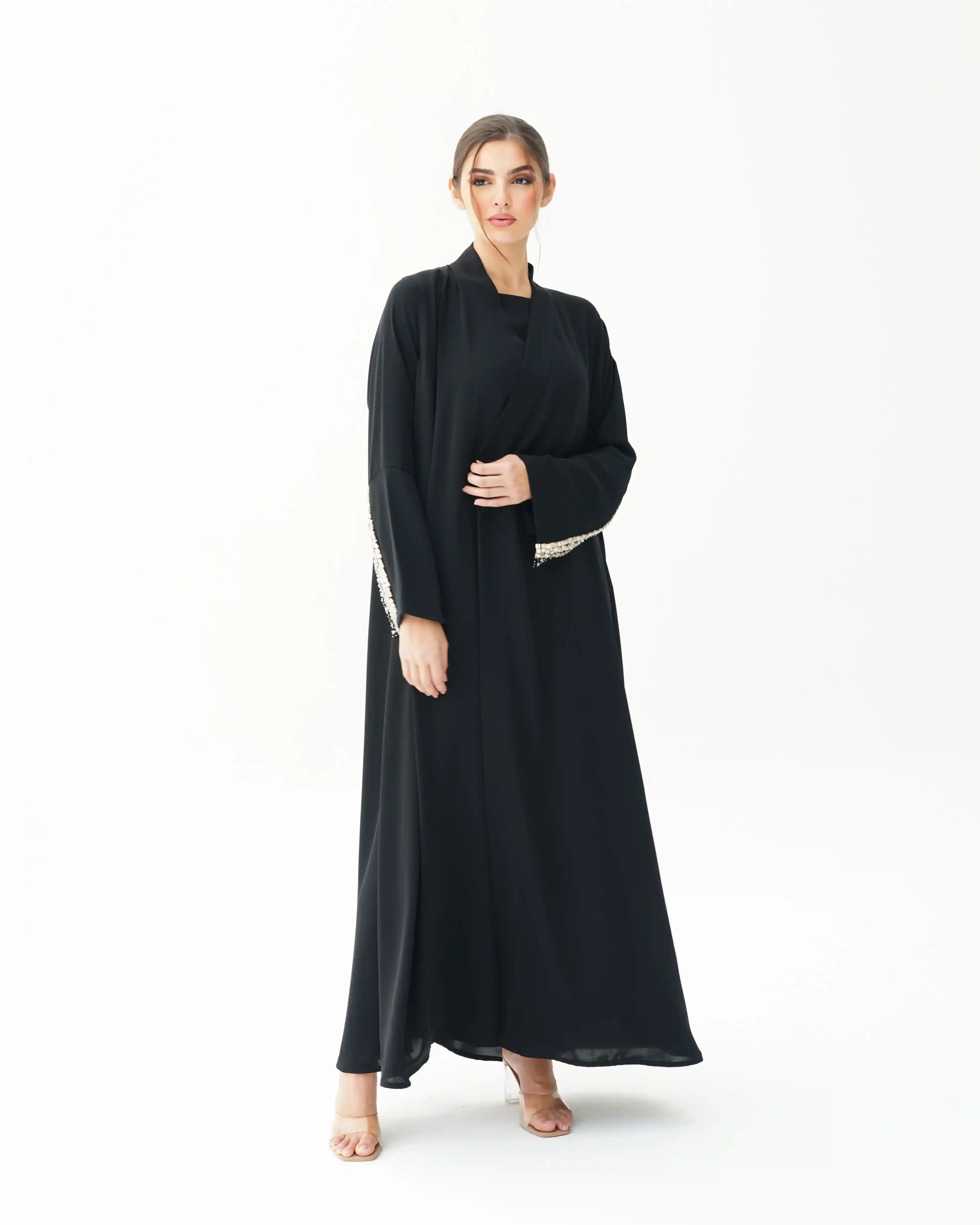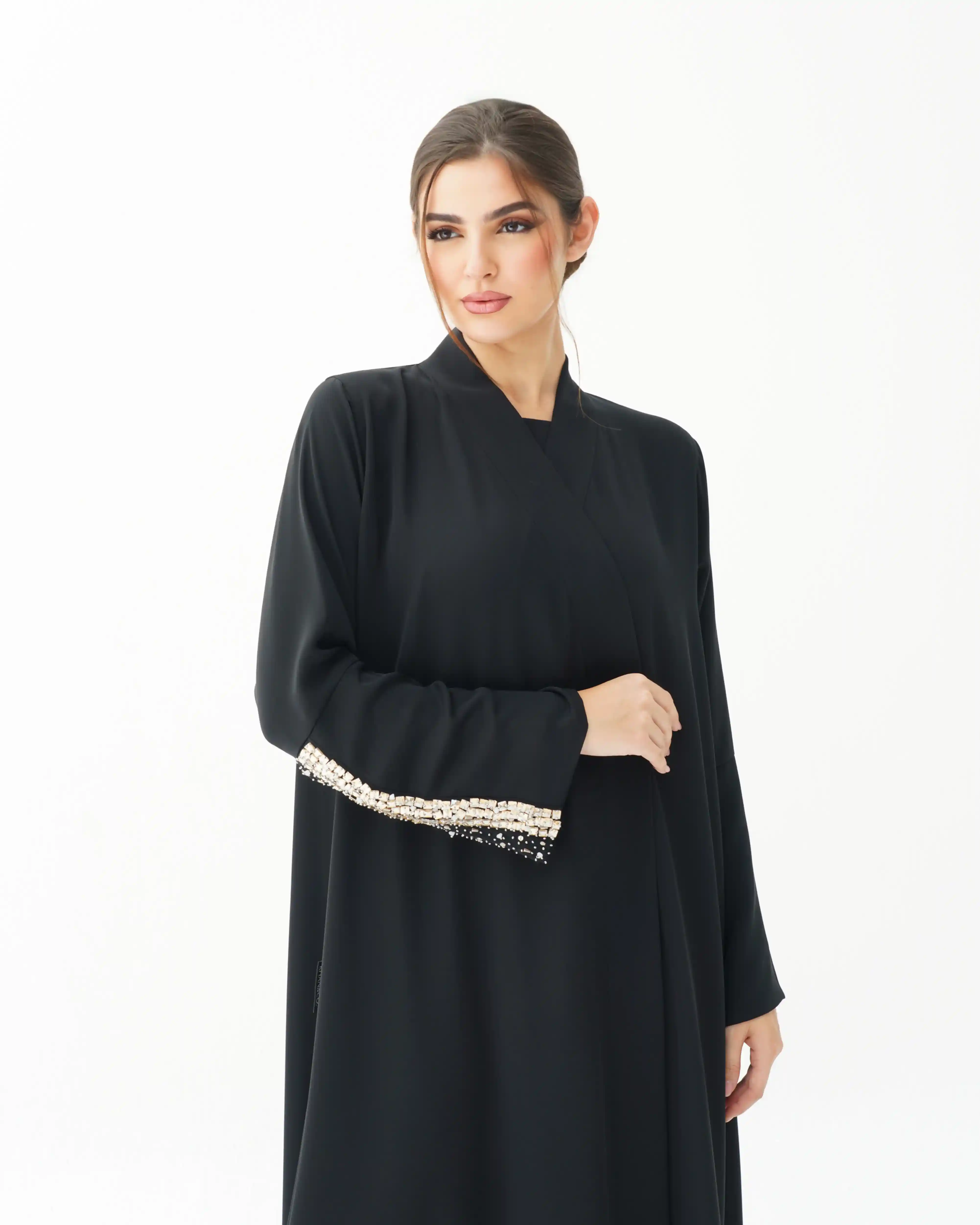 اطلالة انيقة بدون عناء لوجود قطعة فستان داخلي معها، فهذه العباية بالقصة اللف المبتكرة تأتي بنمط متداخل على شكل حرف x تلتف من خلف الرقبة بشريط ياقة الى اخر ذيل العباية وتزدان الاكمام بكريستال بلون الذهبي مشتغلة يدويا ومدموجدة مع خرز لتضفي لمسة اهتمامنا بالتفاصيل الدقيقة التي من خلالها اكتسبت العلامة شهرتها الواسعة في المملكة العربية السعودية كما تتميز العباية بقماش خفيف الوزن منسدل يضفي الانسيابية المطلوبة للتصميم. ويمكن ارتداؤها مفتوحة مع الفستان الداخلي او بطريقة اللف.